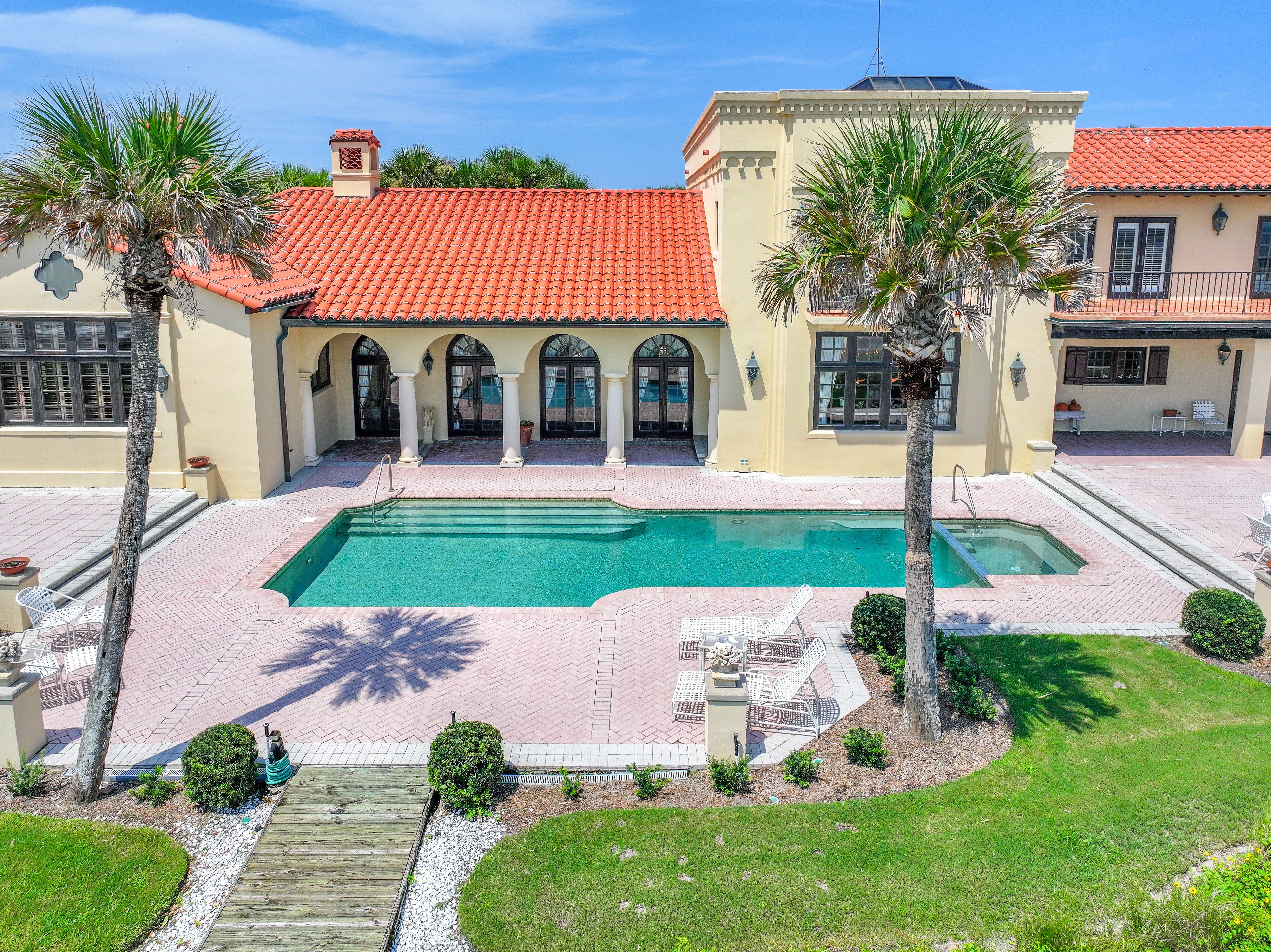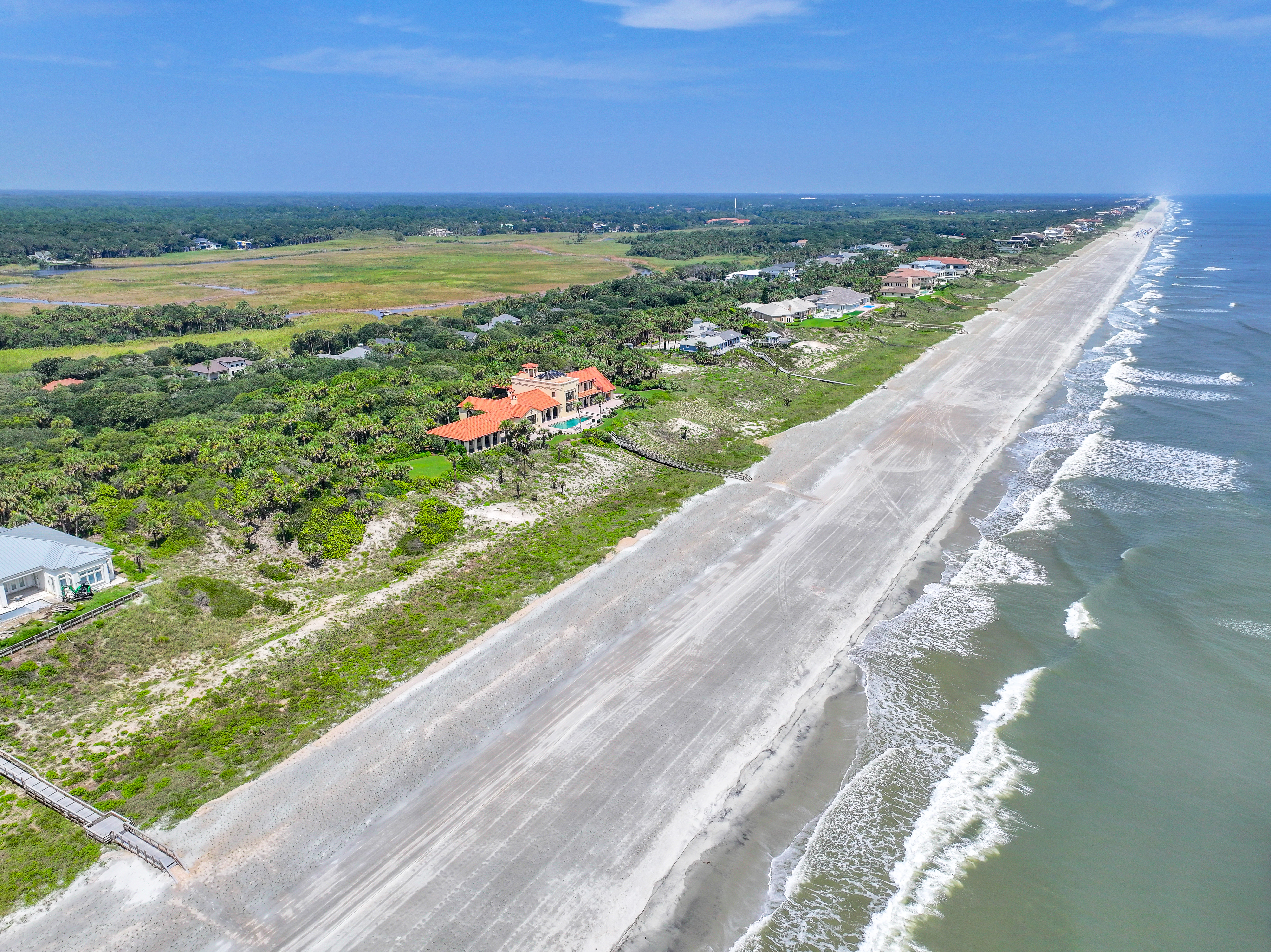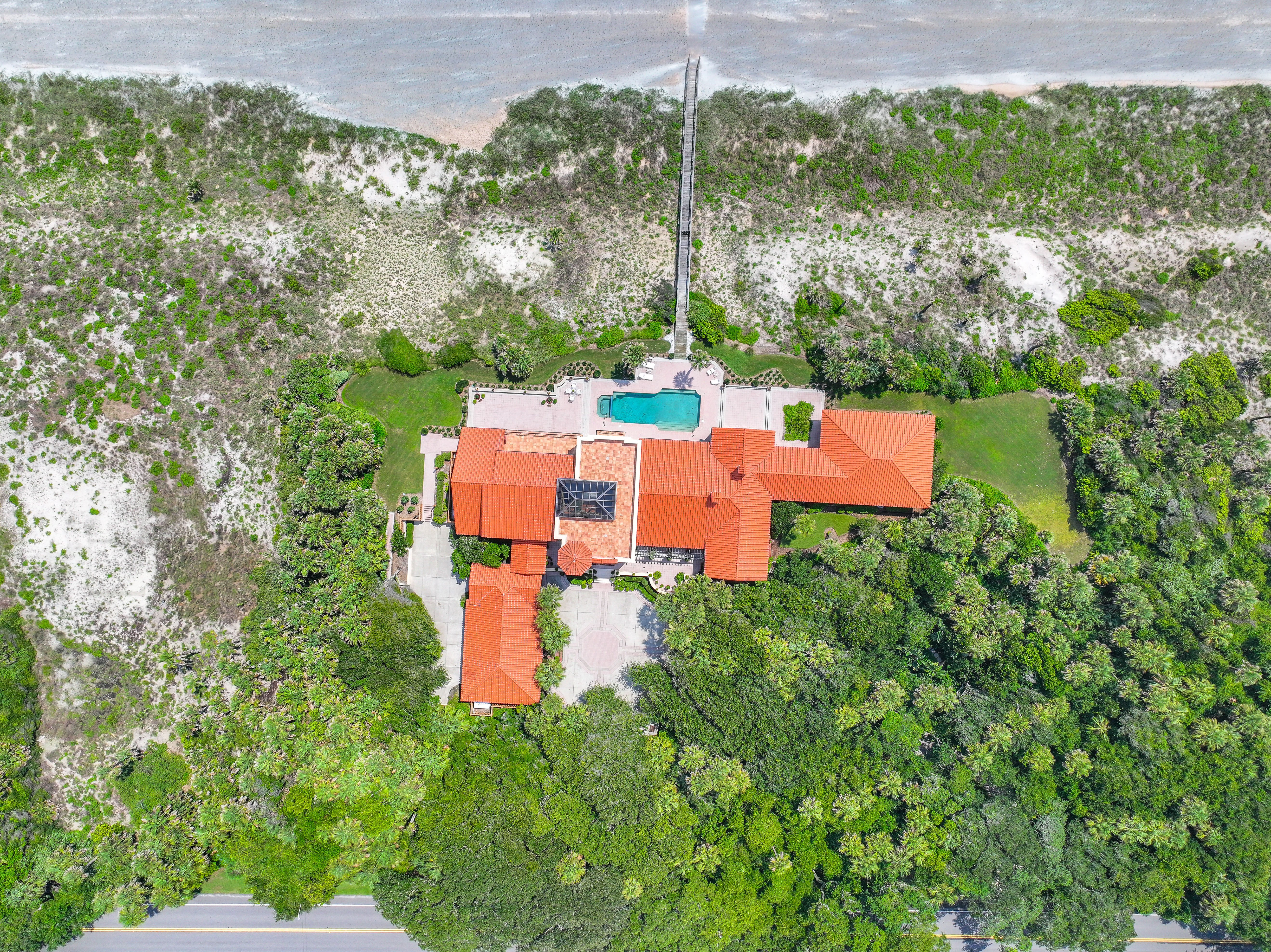 Estates of the quality and uniqueness come along once in a lifetime. This extraordinary oceanfront property is a truly outstanding offering, not only for northeast Florida but for the entire East Coast of the state. It consists of a 10,000 square foot Spanish Colonial style house placed in the center of four contiguous individually platted 160 foot wide lots. Each of the two 160 foot lots at both ends of the property is undeveloped and ready to be used for expansion of the main house or to be developed separately. All 640 feet of this oceanfront property is situated on one of the highest dunes in Northeast Florida at 25 feet above sea level. It is surrounded by lush, jungle-like landscaping. As a result it offers unparalleled views and unmatched privacy. It is truly a one of a kind secluded estate.