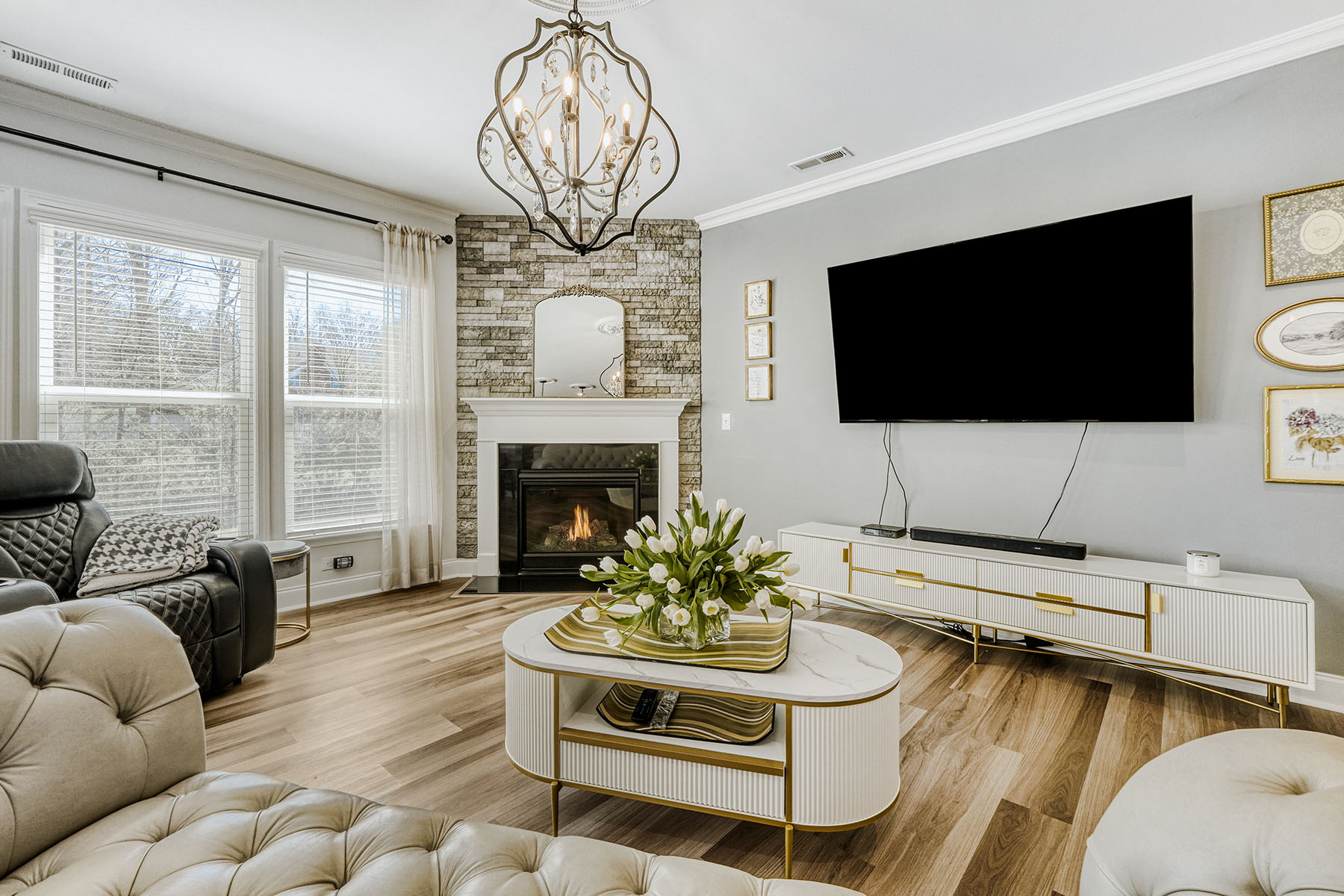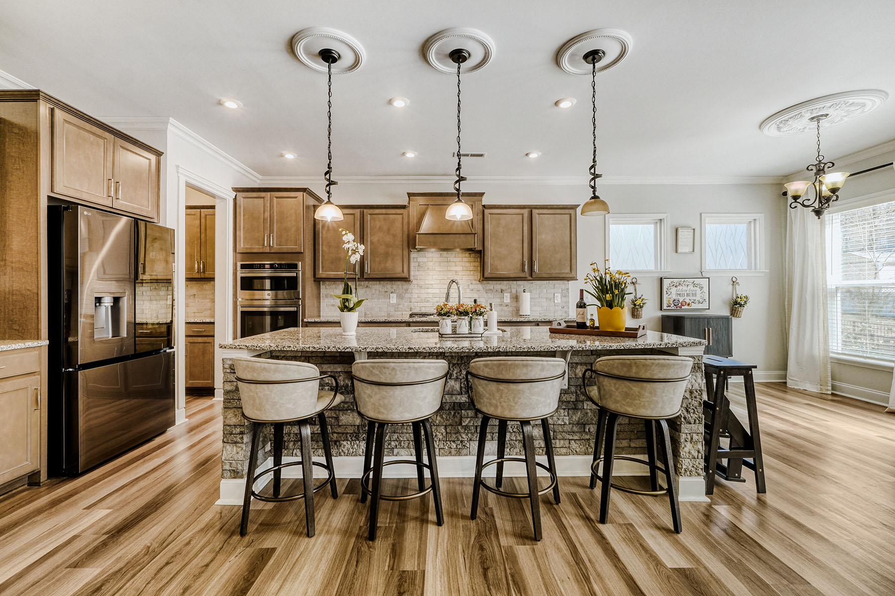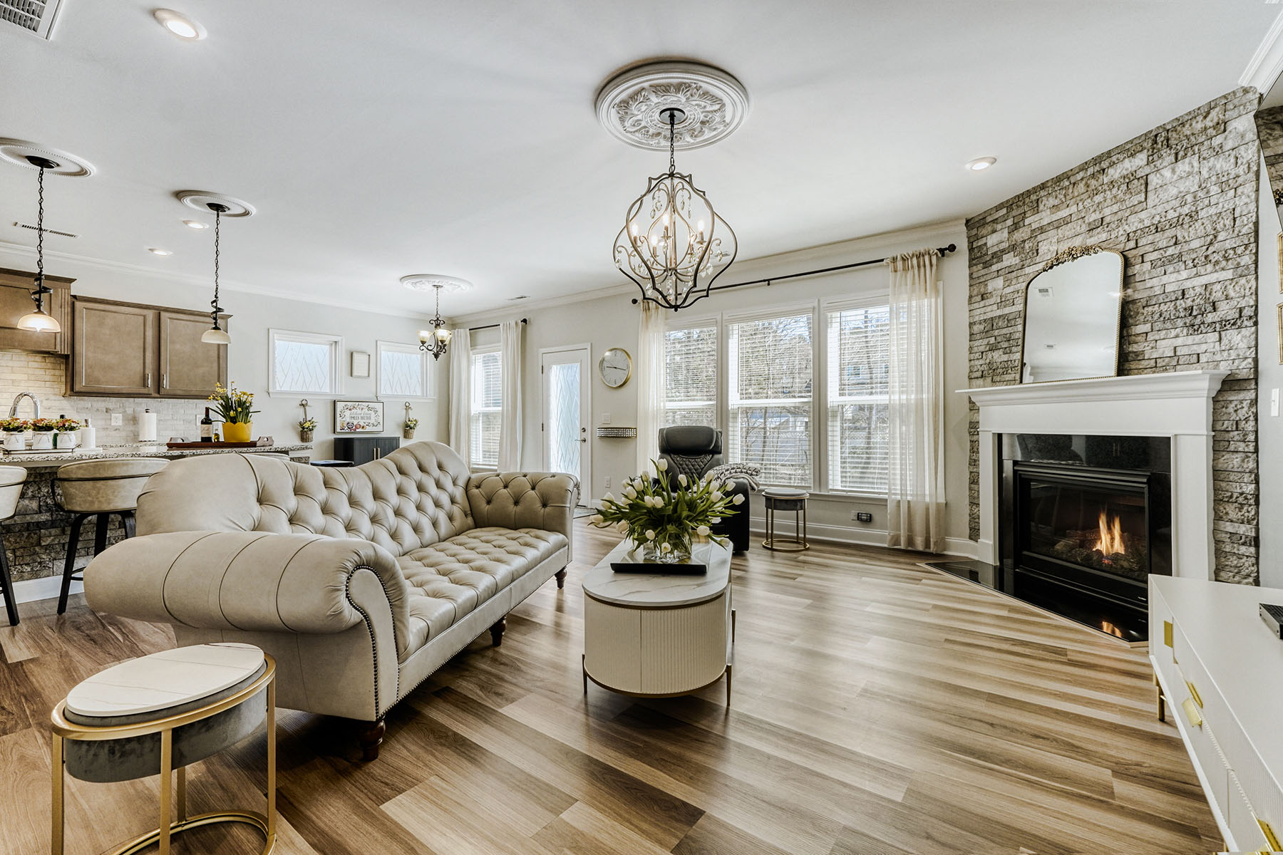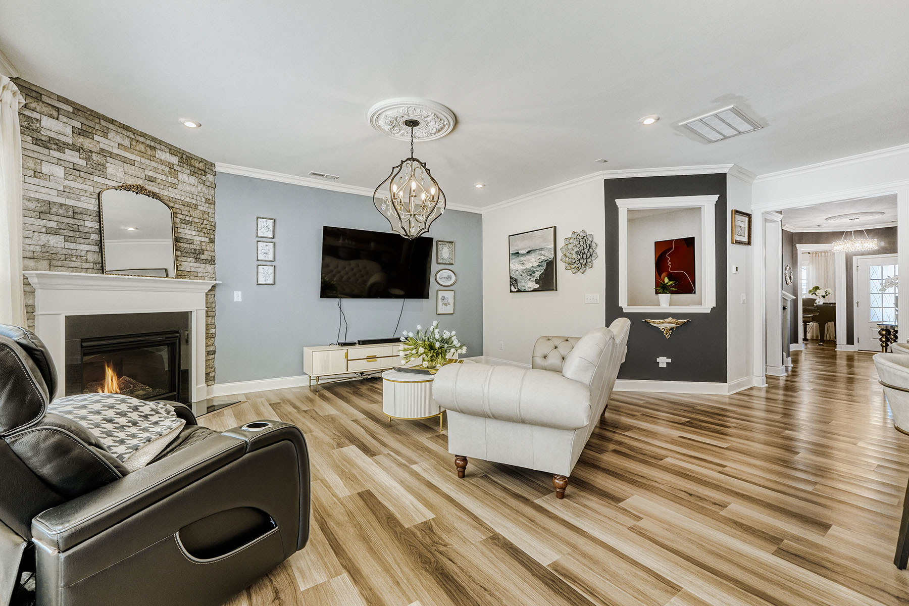 A charming front porch and attractive stone accents set the tone, while inside, luxury vinyl flooring flows throughout the home (no carpet), creating a seamless and sophisticated feel. Elegant lighting, decorative ceiling details, and generously scaled rooms elevate the interiors. The main level is designed for both gracious entertaining and comfortable daily living, featuring a formal dining room, a cozy formal living room (piano), and an expansive open-concept living area anchored by a warm corner fireplace.