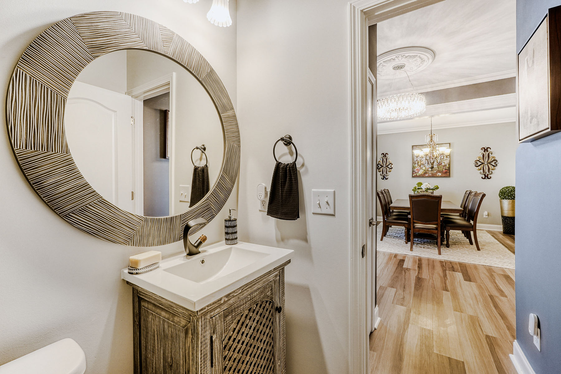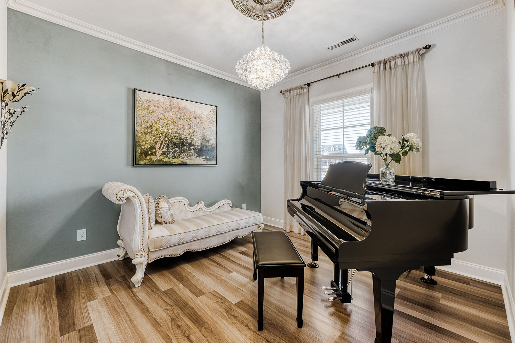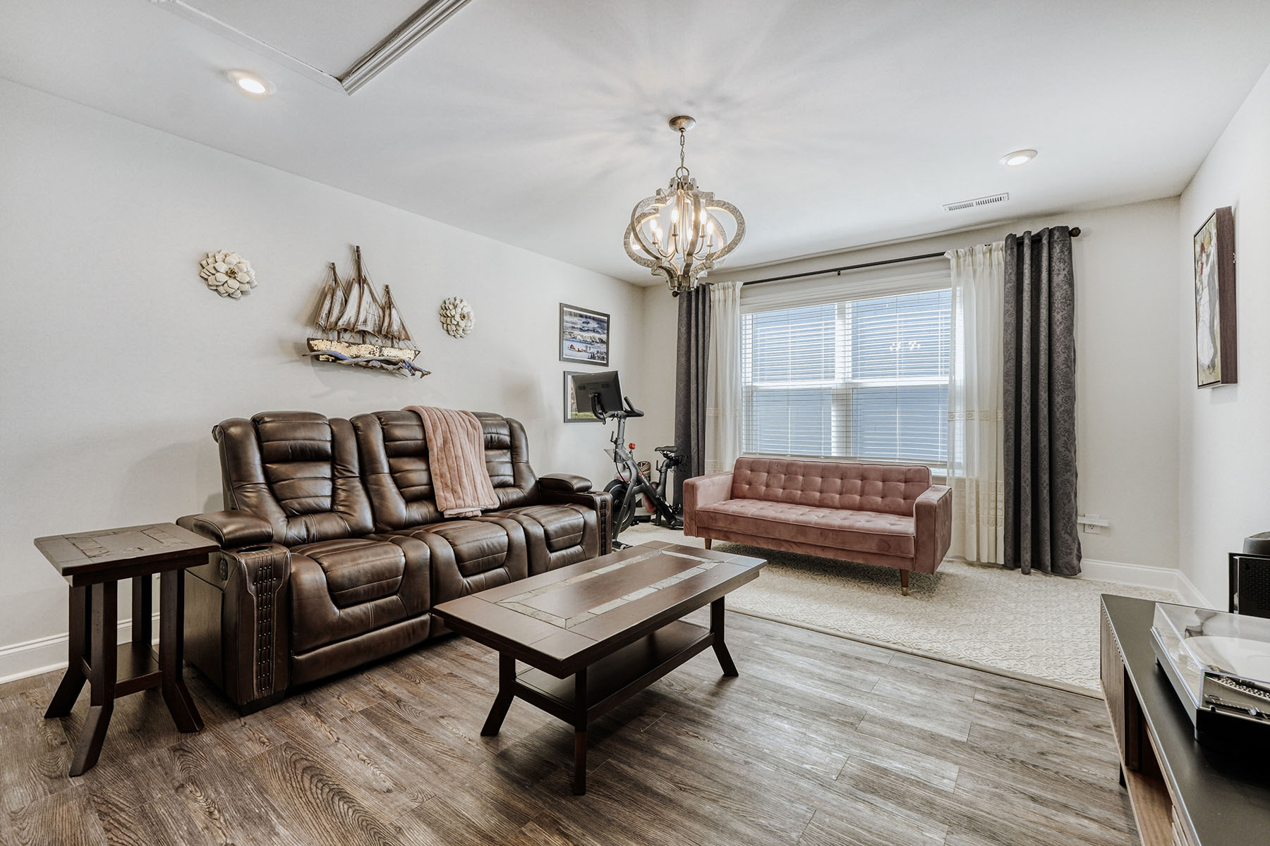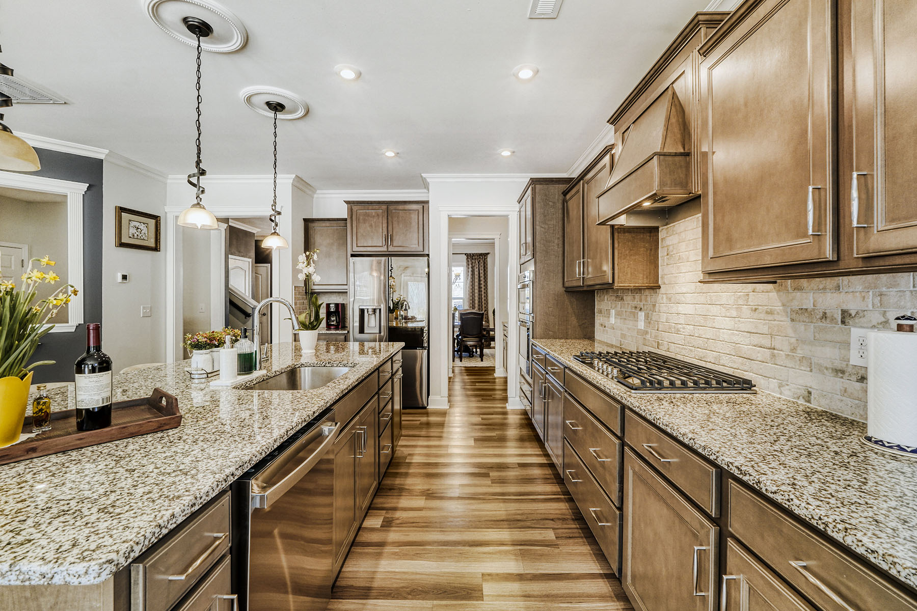A charming front porch and attractive stone accents set the tone, while inside, luxury vinyl flooring flows throughout the home (no carpet), creating a seamless and sophisticated feel. Elegant lighting, decorative ceiling details, and generously scaled rooms elevate the interiors. The main level is designed for both gracious entertaining and comfortable daily living, featuring a formal dining room, a cozy formal living room (piano), and an expansive open-concept living area anchored by a warm corner fireplace.