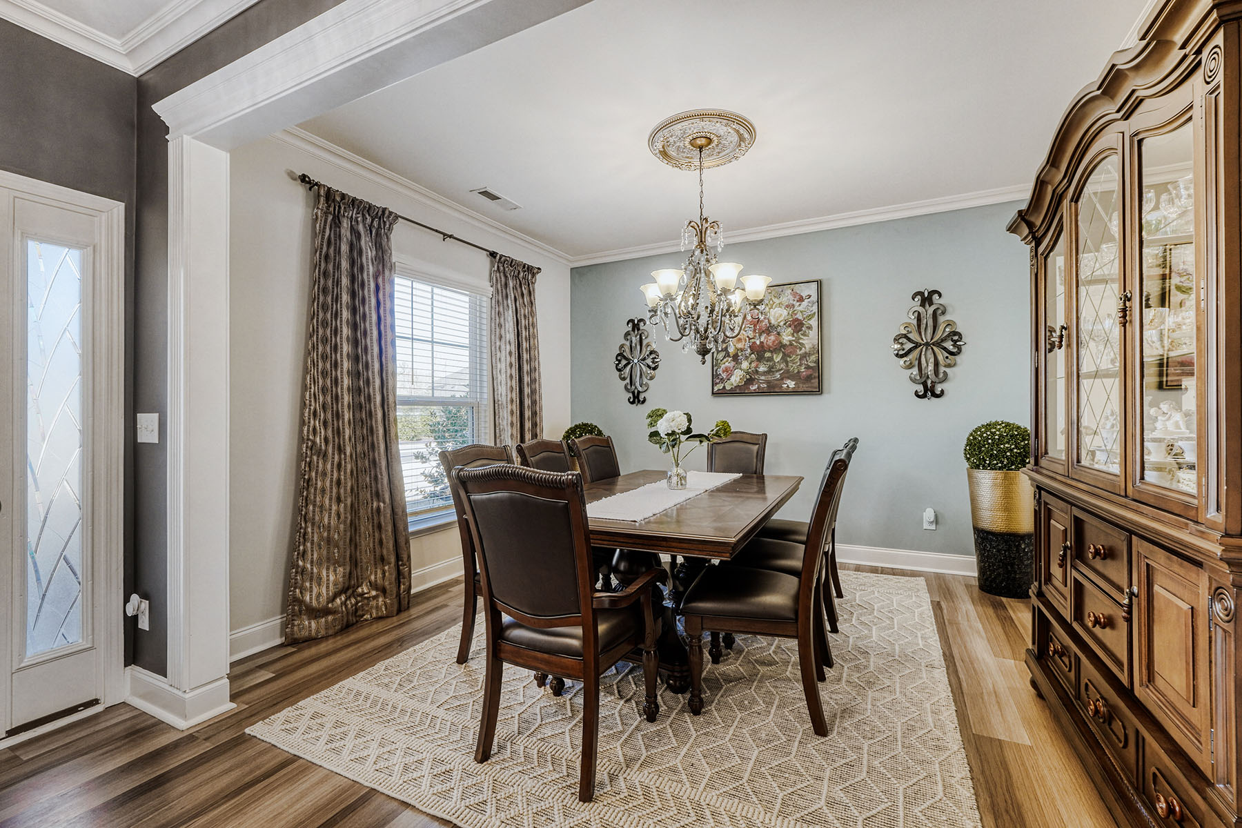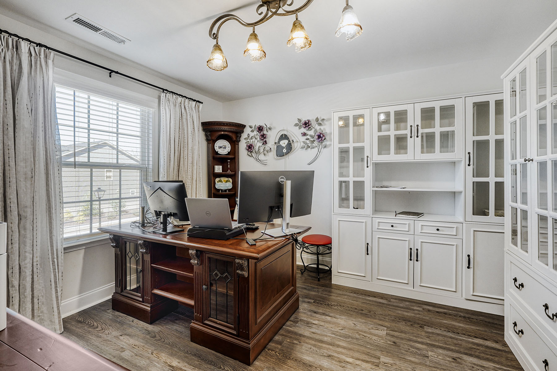 At the heart of the home, the gourmet kitchen impresses with rich cabinetry, an oversized granite island, new appliances, a gas cooktop, double ovens, a beautifully designed range hood, and a well-appointed butler's pantry. Just beyond, the breakfast area opens naturally to the living spaces and rear patio, creating an inviting flow for casual gatherings and indoor-outdoor living. A thoughtfully designed drop zone with a built-in office adds convenience for modern routines, while a main-level powder room completes the first floor.