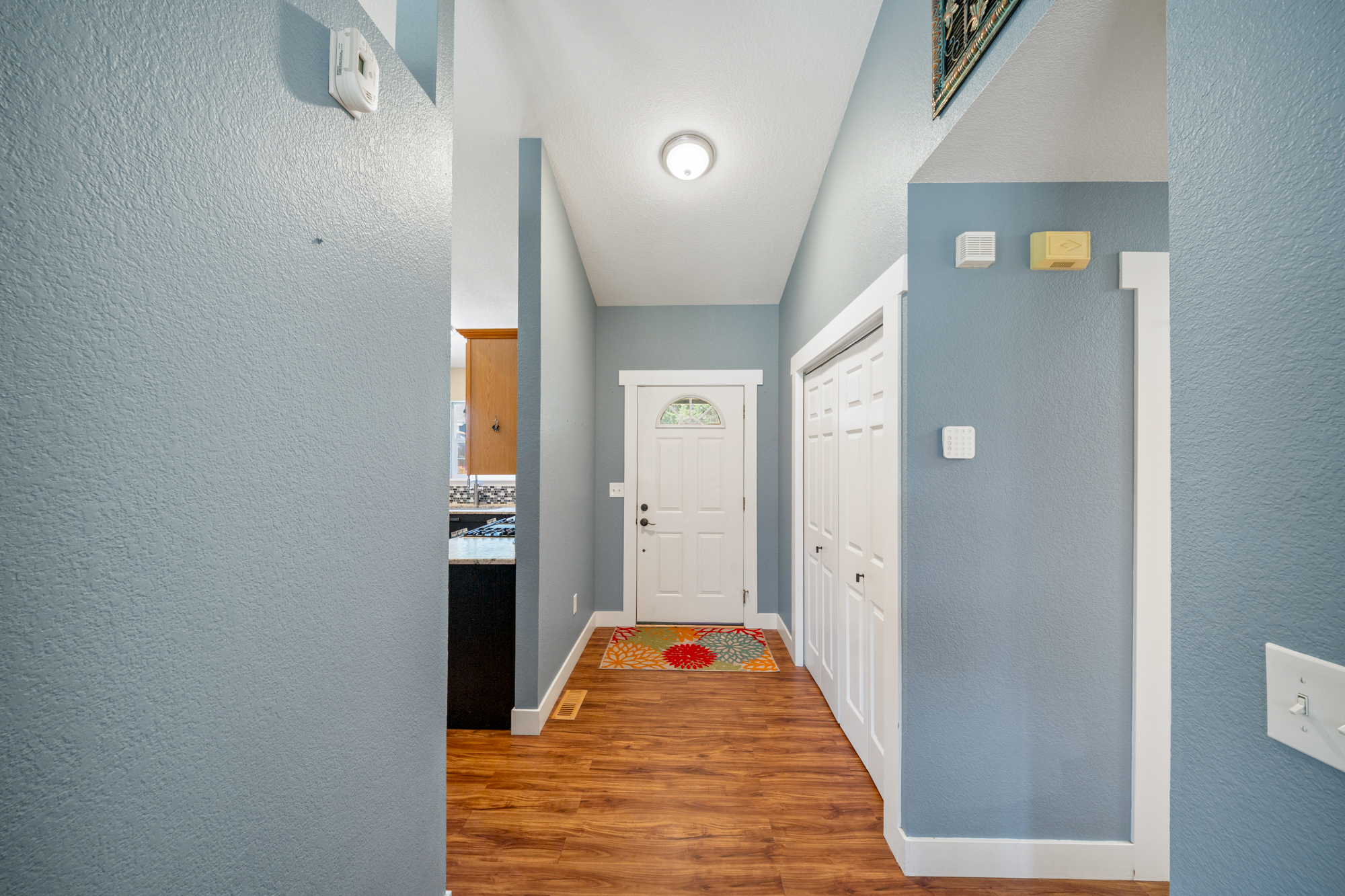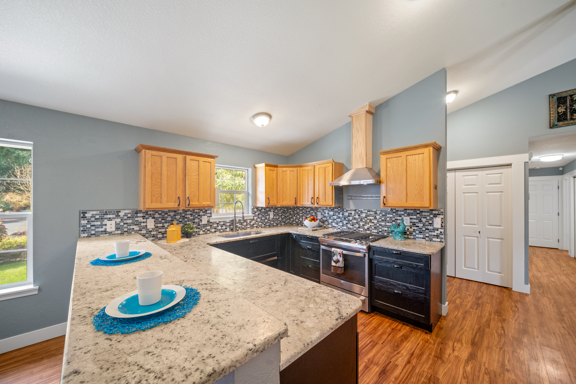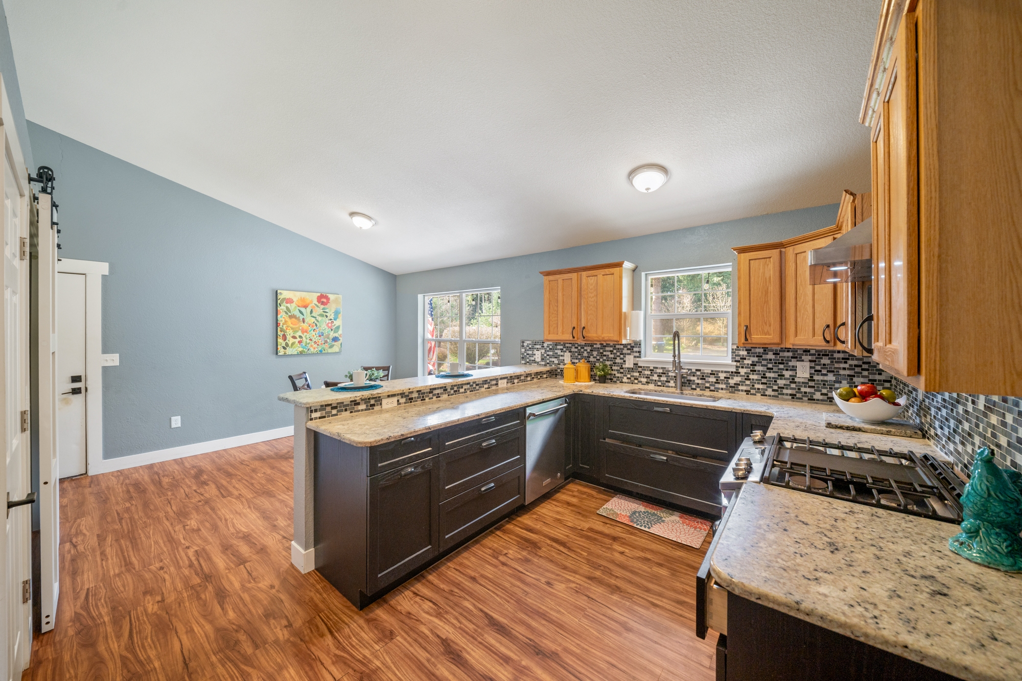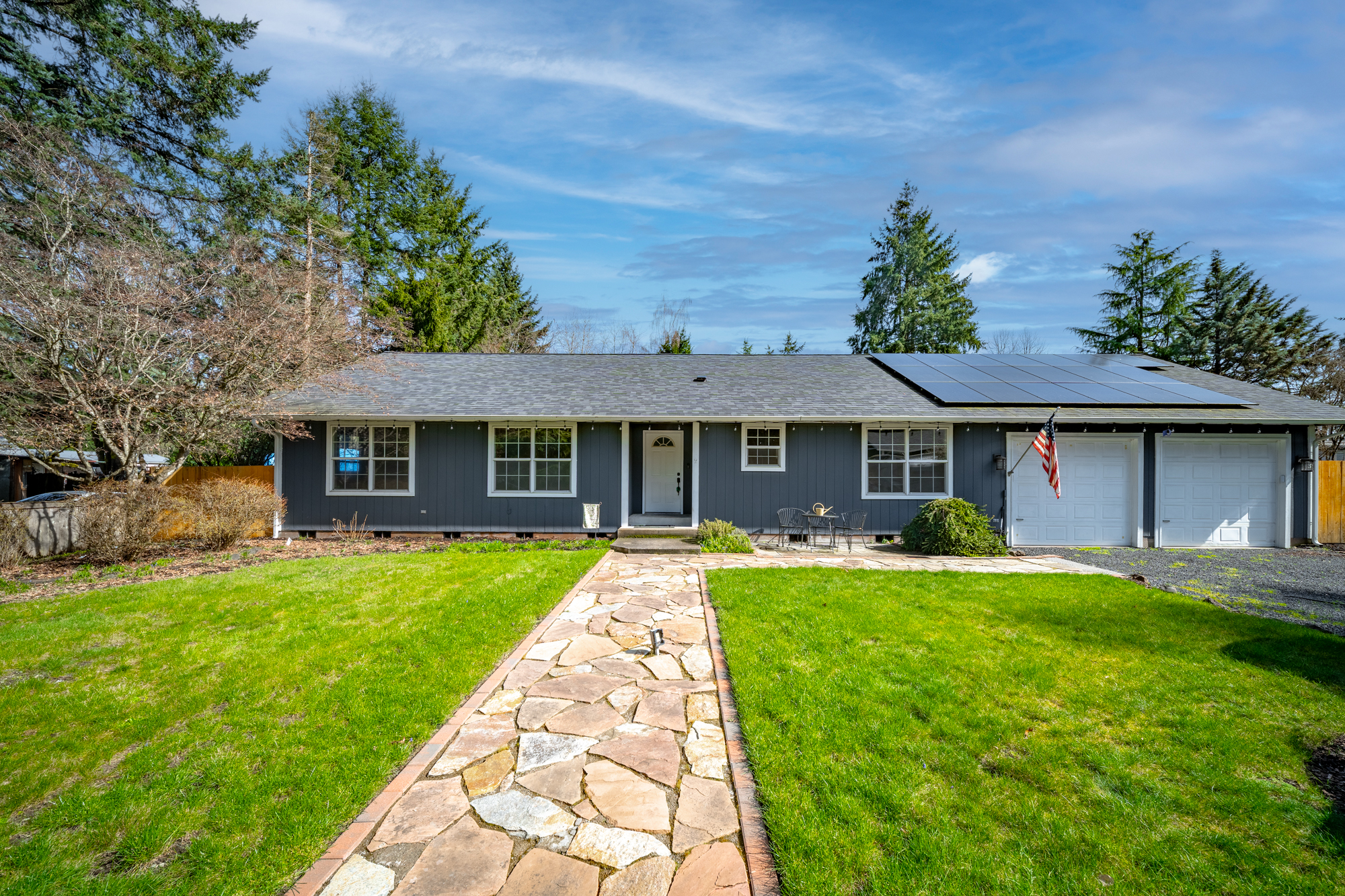 Charming well-maintained rambler on .93 +/- acres! Updated kitchen with granite counters, tile backsplash, stainless appliances, breakfast bar, and dining area. Vaulted ceilings create an open feel through the kitchen and living room, with hard-surface flooring throughout. Spacious primary bedroom with French doors leading to the deck. Comfort features include ceiling fans, central A/C, propane freestanding stove, and solar panels. Enjoy the huge fully fenced backyard with mature trees, above-ground pool, and plenty of space to garden. Extra-large 2-car garage plus 24×36 shop and RV parking—room for all your toys!