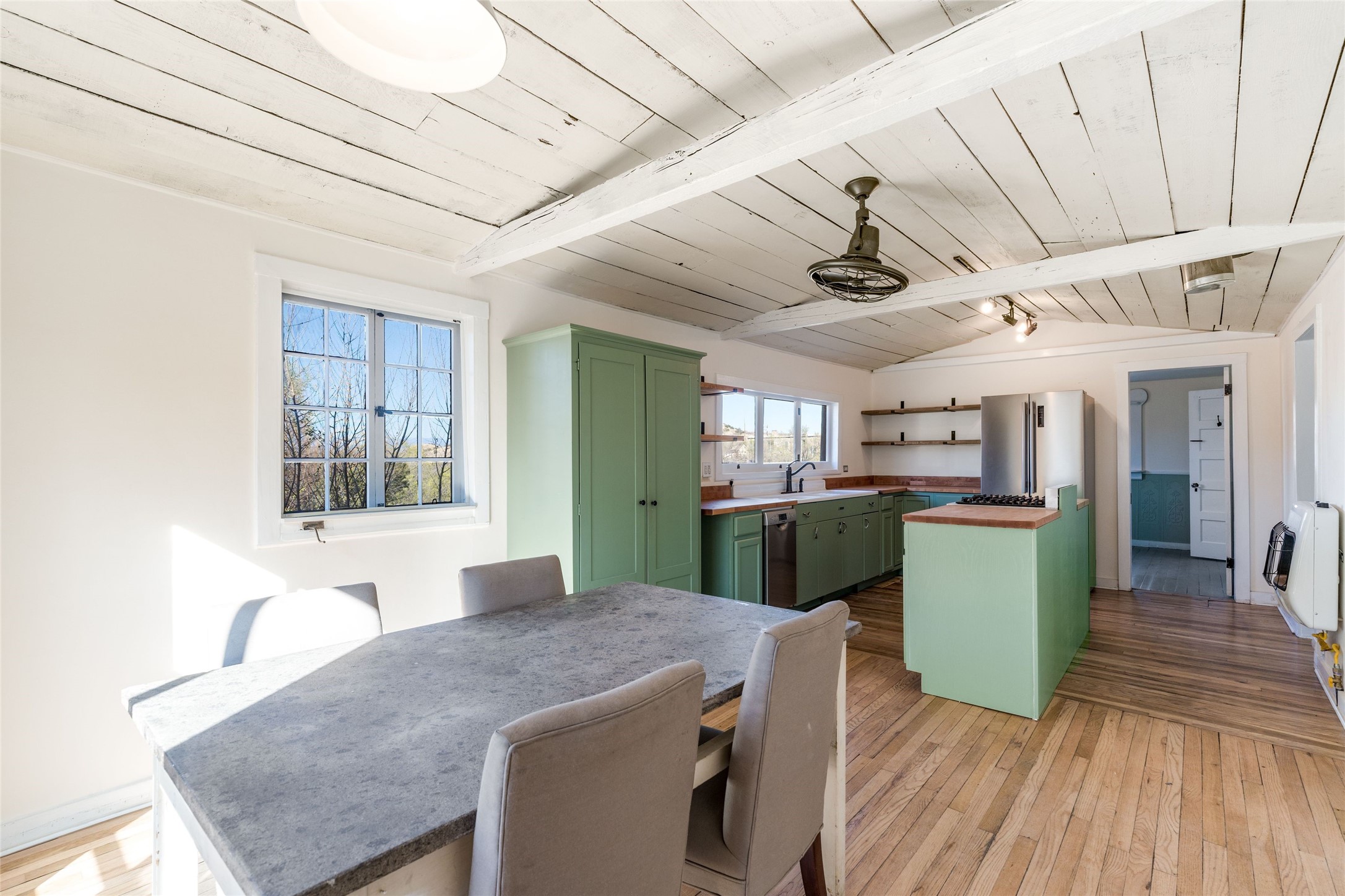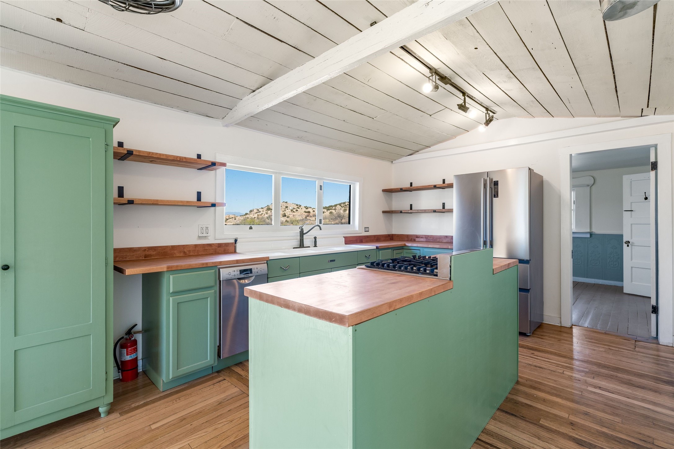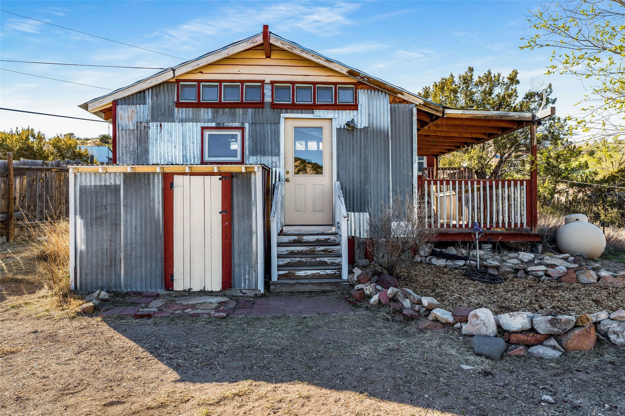Nestled on an oversized lot bordering the town greenbelt, this beautifully updated Madrid cabin blends historic character with thoughtful modern enhancements. The expanded country kitchen is a true centerpiece, featuring open shelving, butcher-block counters, and a generous center island ideal for gourmet cooking and entertaining. The updated bathroom offers a luxurious soaking tub, and much of the home’s original hardwood flooring has been lovingly preserved. A heated sunroom provides a bright, welcoming living space, while one of the bedrooms showcases classic English wainscoting that adds to the home’s timeless charm. The main bedroom opens onto a private porch overlooking the greenbelt—an ideal spot for morning coffee or evening relaxation. The property also includes a versatile detached studio complete with a sink, woodstove, private porch, and an additional bathroom ready for activation. Perfect for artists, guests, or a home office. Outside, enjoy views of the Sangre de Cristo Mountains from the landscaped yard, with direct access to the greenbelt leading to a 40-acre county open space—perfect for hiking and exploring. Residents of Madrid also share ownership of the historic Madrid Ballpark, the first lighted ballpark in North America and still a vibrant hub for community events and tournaments. Located within easy walking distance of Madrid’s general store, restaurants, coffee shop, and galleries, this home offers a rare blend of privacy, character, and walkable village living. Convenient access to both Albuquerque and Santa Fe completes the package, making this a truly special opportunity in the heart of Madrid.