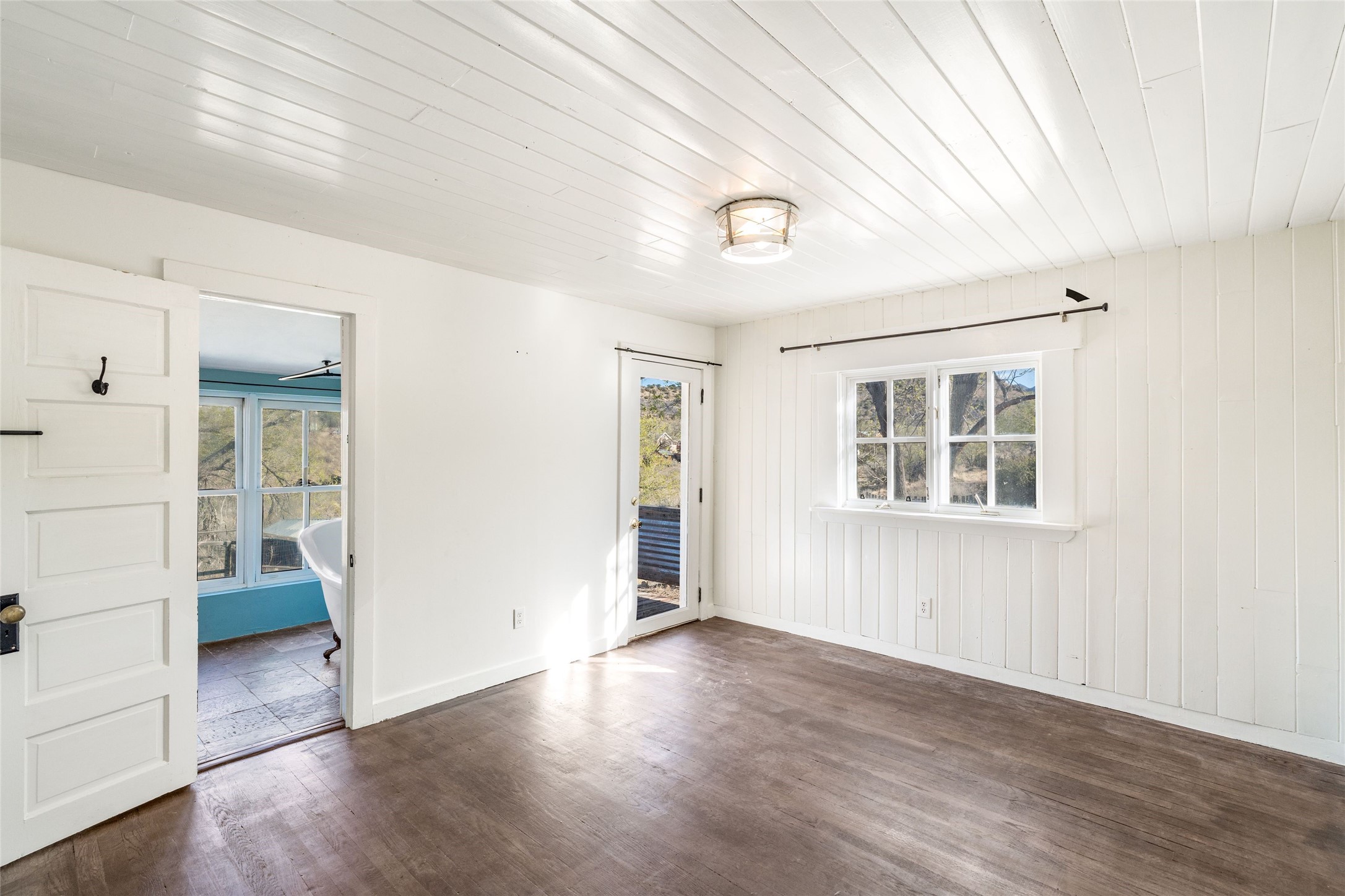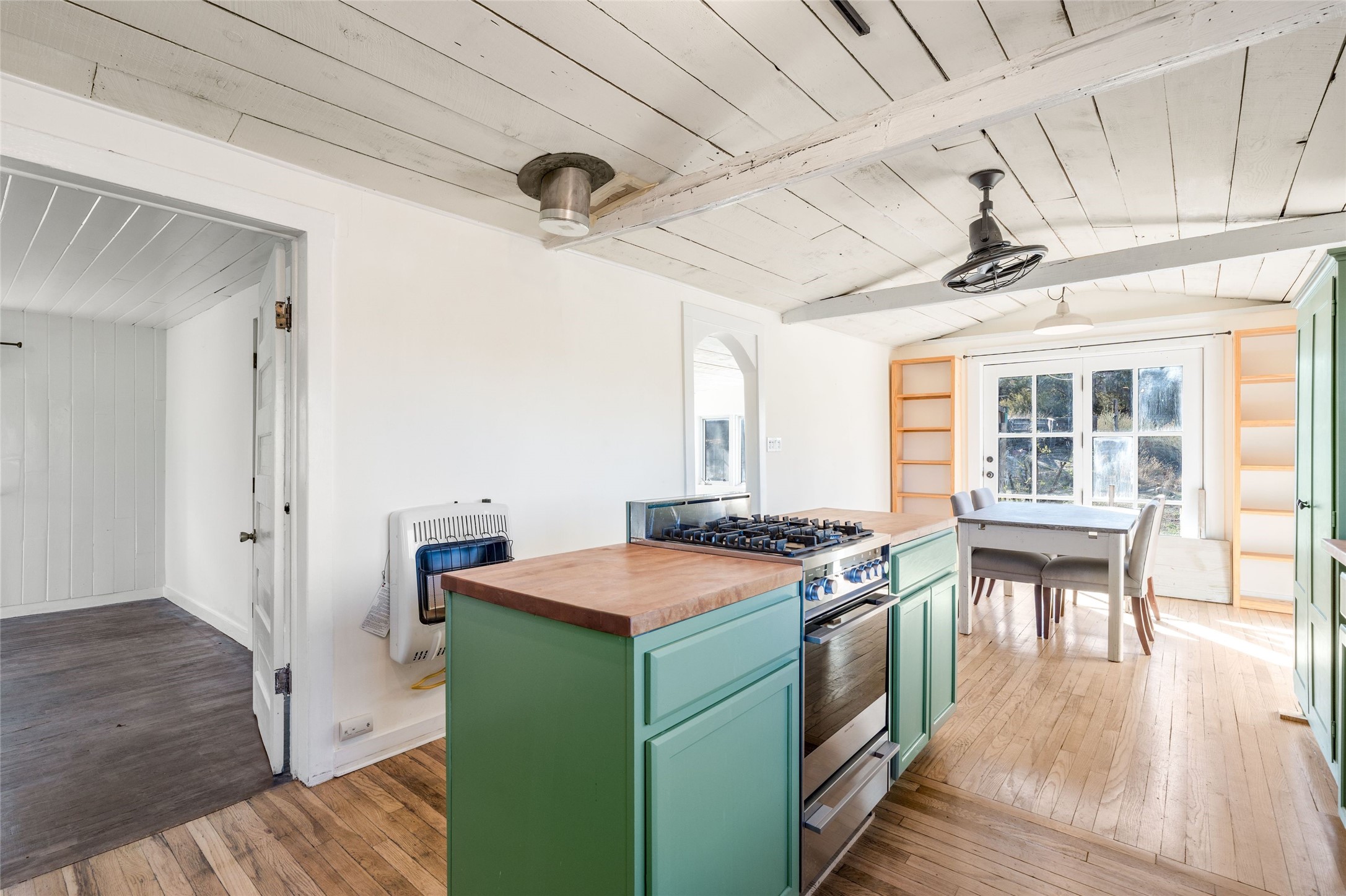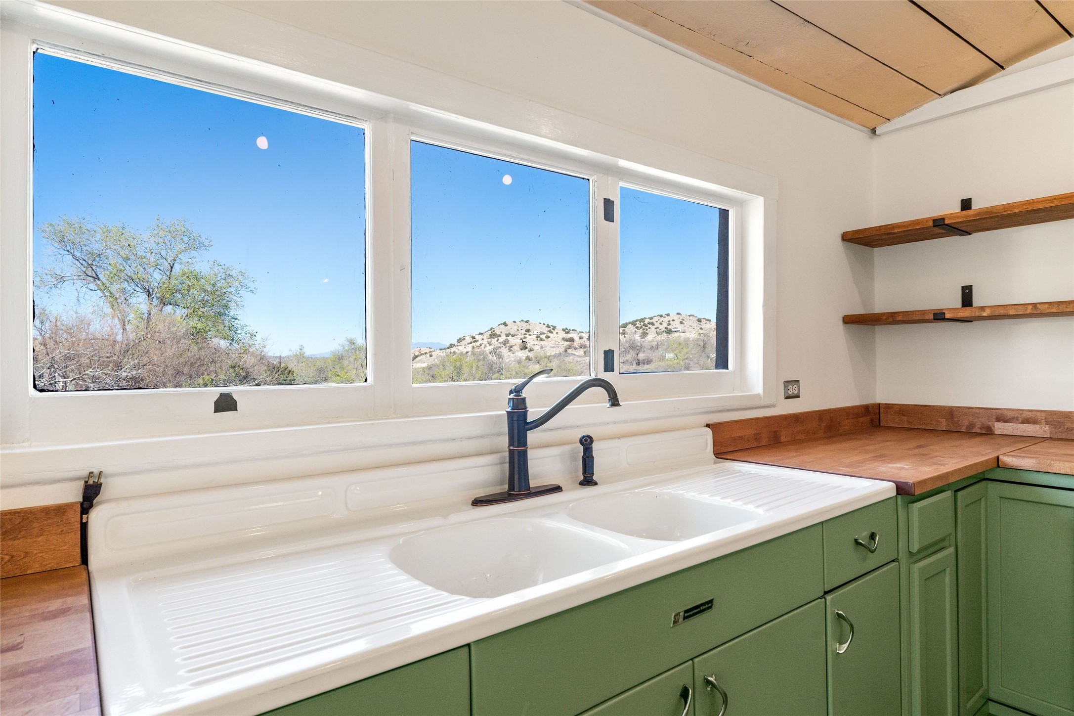 Nestled on an oversized lot bordering the town greenbelt, this beautifully updated Madrid cabin blends historic character with thoughtful modern enhancements. The expanded country kitchen is a true centerpiece, featuring open shelving, butcher-block counters, and a generous center island ideal for gourmet cooking and entertaining. The updated bathroom offers a luxurious soaking tub, and much of the home’s original hardwood flooring has been lovingly preserved. A heated sunroom provides a bright, welcoming living space, while one of the bedrooms showcases classic English wainscoting that adds to the home’s timeless charm. The main bedroom opens onto a private porch overlooking the greenbelt—an ideal spot for morning coffee or evening relaxation. The property also includes a versatile detached studio complete with a sink, woodstove, private porch, and an additional bathroom ready for activation. Perfect for artists, guests, or a home office. Outside, enjoy views of the Sangre de Cristo Mountains from the landscaped yard, with direct access to the greenbelt leading to a 40-acre county open space—perfect for hiking and exploring. Residents of Madrid also share ownership of the historic Madrid Ballpark, the first lighted ballpark in North America and still a vibrant hub for community events and tournaments. Located within easy walking distance of Madrid’s general store, restaurants, coffee shop, and galleries, this home offers a rare blend of privacy, character, and walkable village living. Convenient access to both Albuquerque and Santa Fe completes the package, making this a truly special opportunity in the heart of Madrid.