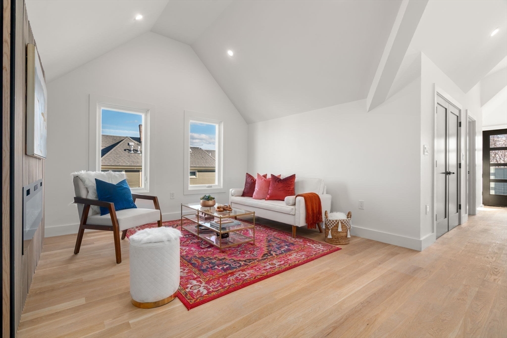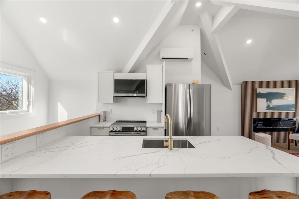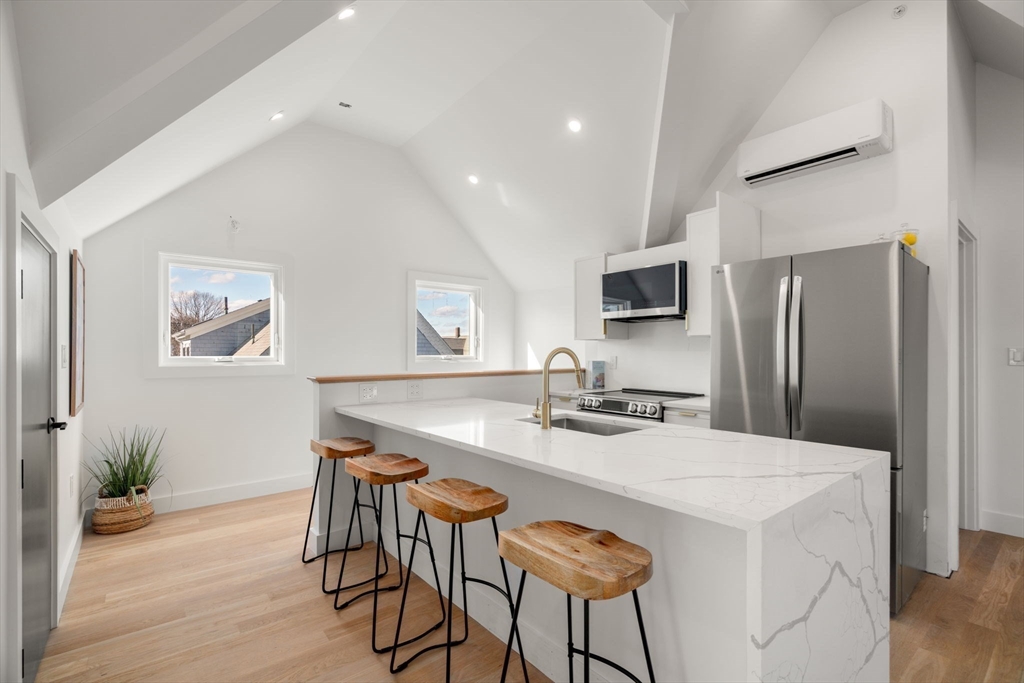 Last Unit Left in this Luxurious, brand new condo ideally located in Davis Square, just steps to vibrant shops, acclaimed restaurants, and the Red Line MBTA. This sun-filled top floor, 2-bedroom, 2-bath home offers modern living at its finest, featuring soaring vaulted ceilings and a spacious open-concept layout with a cozy fireplace.The sleek designer kitchen is beautifully appointed with quartz countertops, a center island, and stainless steel appliances,perfect for everyday living and entertaining. The primary bedroom includes a spa-like bath showcasing custom tile work and a curbless shower. Additional highlights include 2nd custom tiled full bath, in-unit laundry and a Ring doorbell for added security and peace of mind. A rare opportunity to own a turnkey home in one of Somerville's most sought-after neighborhoods