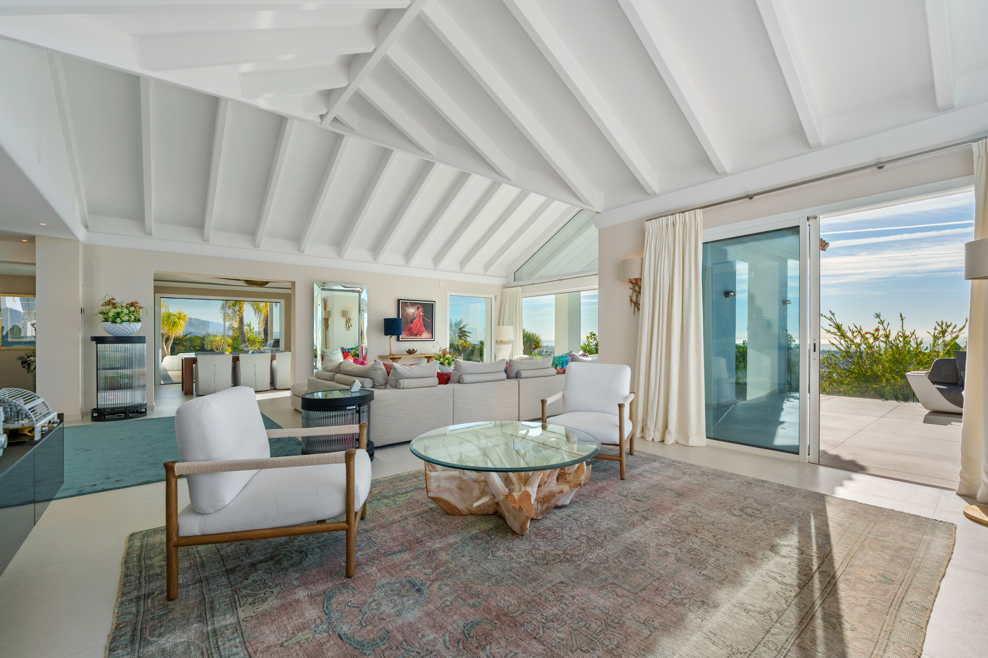 Occupying an elevated and privileged hillside position, this remarkable south-facing residence offers an exceptional sense of space, privacy and natural light, with sweeping views across the Mediterranean coastline and surrounding mountains. The property unfolds across an expansive plot of over 7,800 m², where landscaped gardens, mature vegetation and carefully designed outdoor areas create a serene environment that feels both secluded and effortlessly connected to the lifestyle of the Costa del Sol.The architecture reflects a refined Mediterranean style with contemporary influences, combining clean lines, generous volumes and extensive glazing that enhances the connection between indoor and outdoor living. Interiors are bathed in natural light, with elegant open-plan living areas framed by large windows that capture the panoramic scenery. High ceilings with exposed beams, soft neutral tones and carefully selected materials create a warm yet sophisticated atmosphere throughout the home.Designed to accommodate both comfortable daily living and entertaining on a grand scale, the residence offers an impressive number of bedrooms, all with en-suite bathrooms, ensuring privacy and convenience for residents and guests alike. A separate guest house provides additional independence, making it ideal for extended family, visitors or staff. The distribution of spaces allows for a seamless balance between shared living areas and more intimate, private retreats.The outdoor experience is equally captivating, featuring two swimming pools positioned to serve different areas of the estate, expansive terraces for lounging and dining, and beautifully maintained gardens that invite relaxation at every turn. Whether enjoying sun-soaked afternoons by the pool, hosting gatherings under covered terraces, or simply taking in the far-reaching views, every corner of the property has been designed to enhance the connection with its natural surroundings.Leisure and wellness are thoughtfully integrated, with dedicated spaces including a cinema room, a fully equipped gym and a wine cellar, offering a lifestyle that blends comfort with entertainment. Practical aspects have also been carefully considered, with extensive parking capacity and easy access via a private driveway, ensuring both convenience and discretion.Located in a well-established residential area known for its tranquillity and proximity to key destinations, the property enjoys easy access to Marbella, Puerto Banús, golf courses, international schools and everyday amenities. This combination of scale, privacy and accessibility makes it a rare opportunity for those seeking a refined residence that truly enhances everyday living.