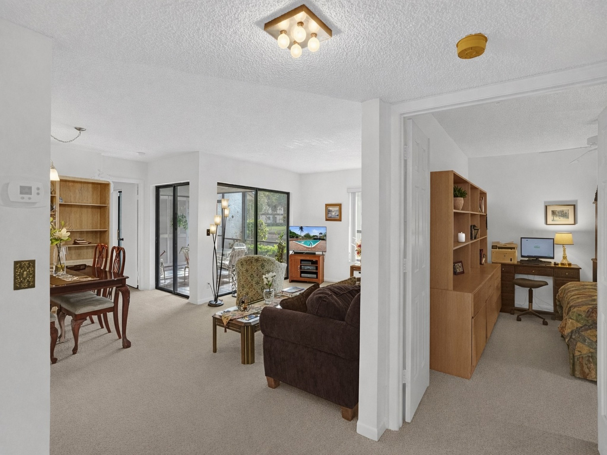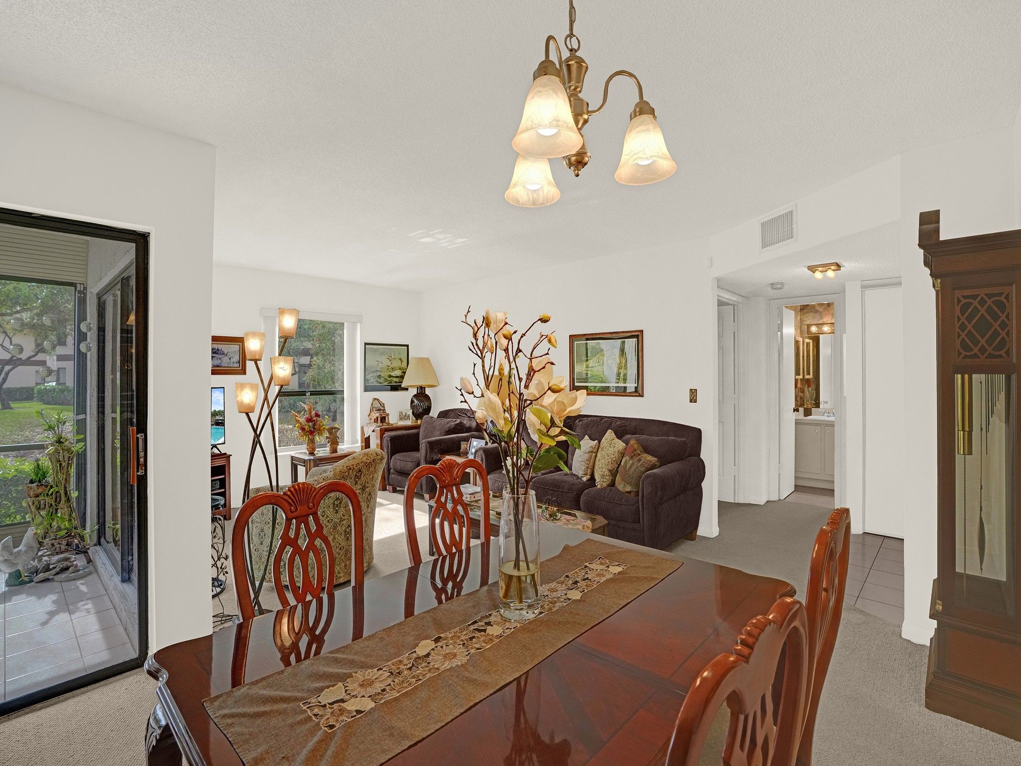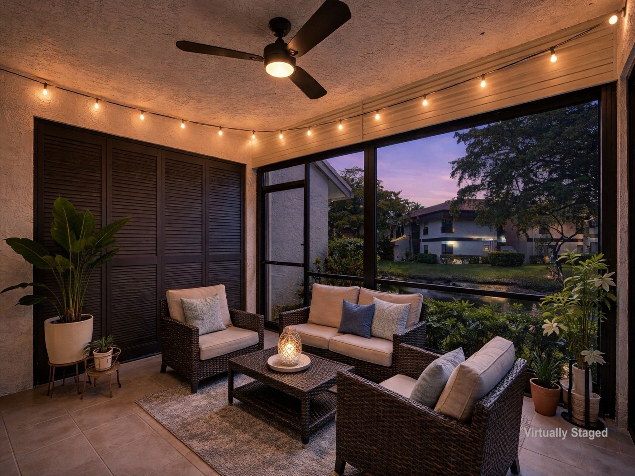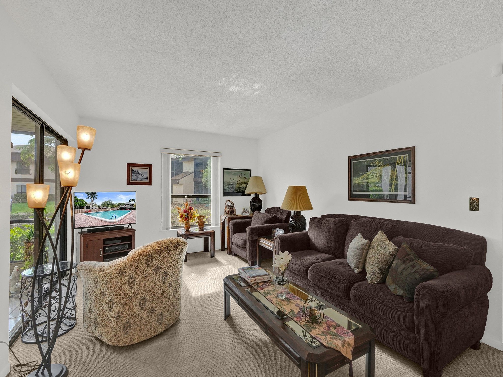 Spacious first floor corner residence overlooking a peaceful pond. This bright home is filled with natural light from numerous windows and features an open living and dining area that flows seamlessly to a screened patio, perfect for enjoying the water views. The primary bedroom offers a large walk in closet, and the unit includes a convenient in unit washer and dryer. The condo has been impeccably maintained in its original condition, giving a new owner the opportunity to update and design the space to their personal style. This condo community is part of the The Township at Coconut Creek, offering many amenities, including a clubhouse, performing arts theater, fitness center, aquatic center, olympic style pool, sports park, tennis courts, racquetball courts, billiards, and scenic walking paths. Conveniently located near shopping, dining, parks, and major roadways.