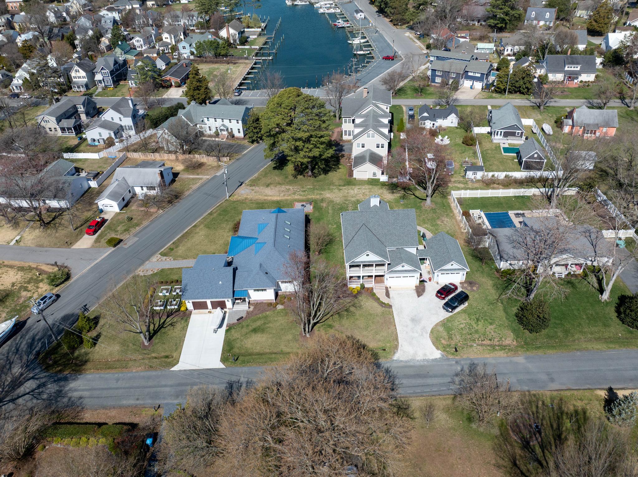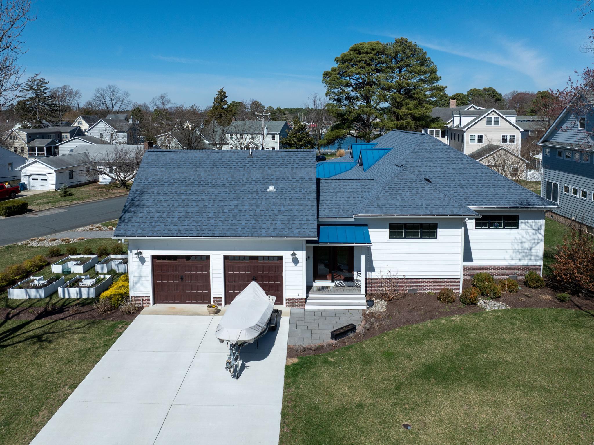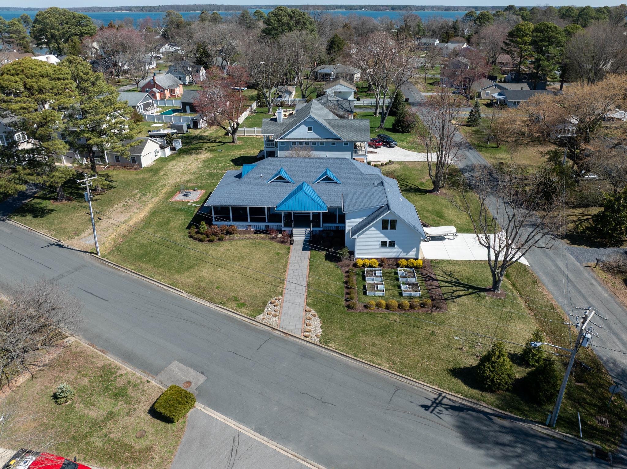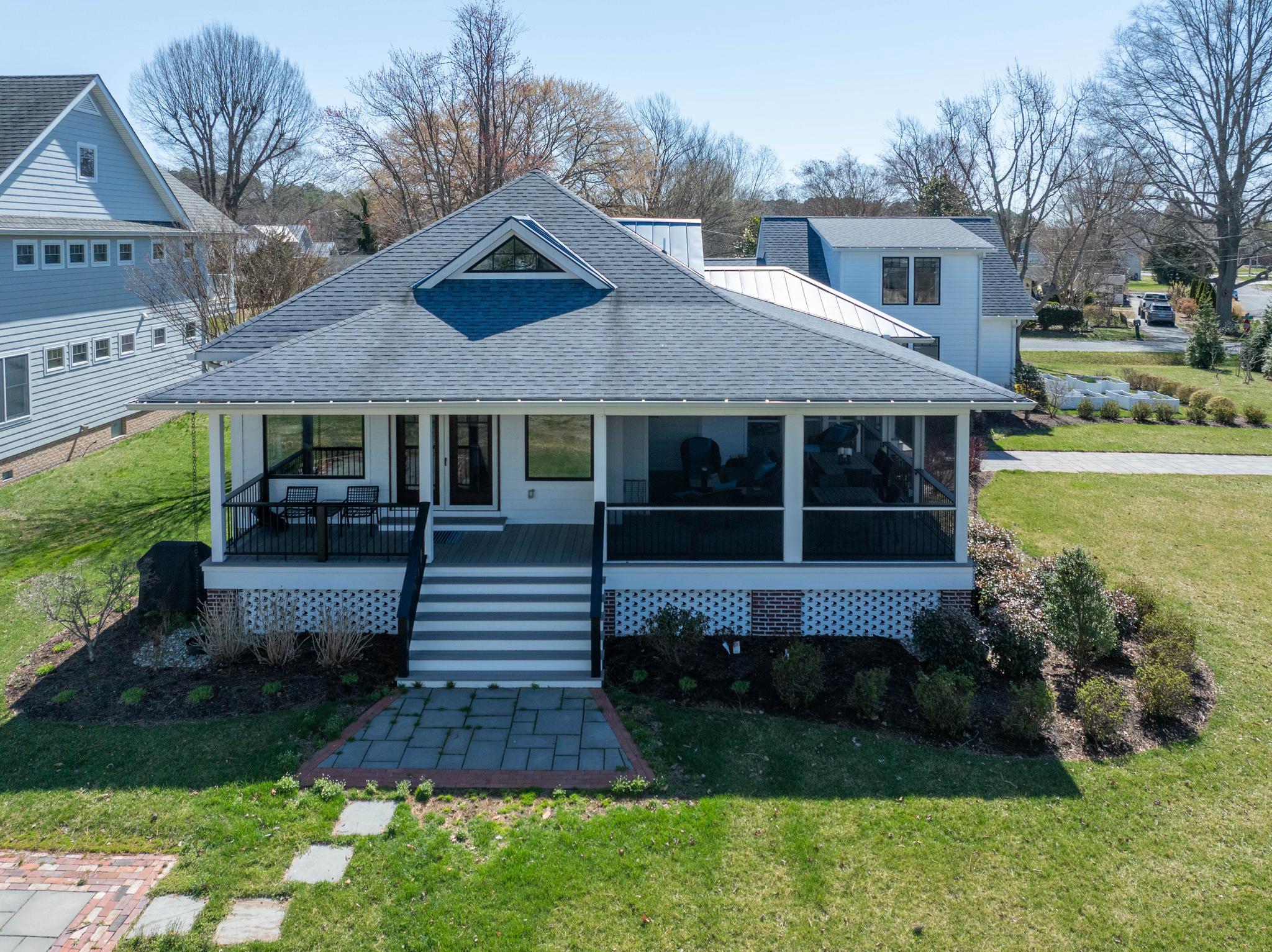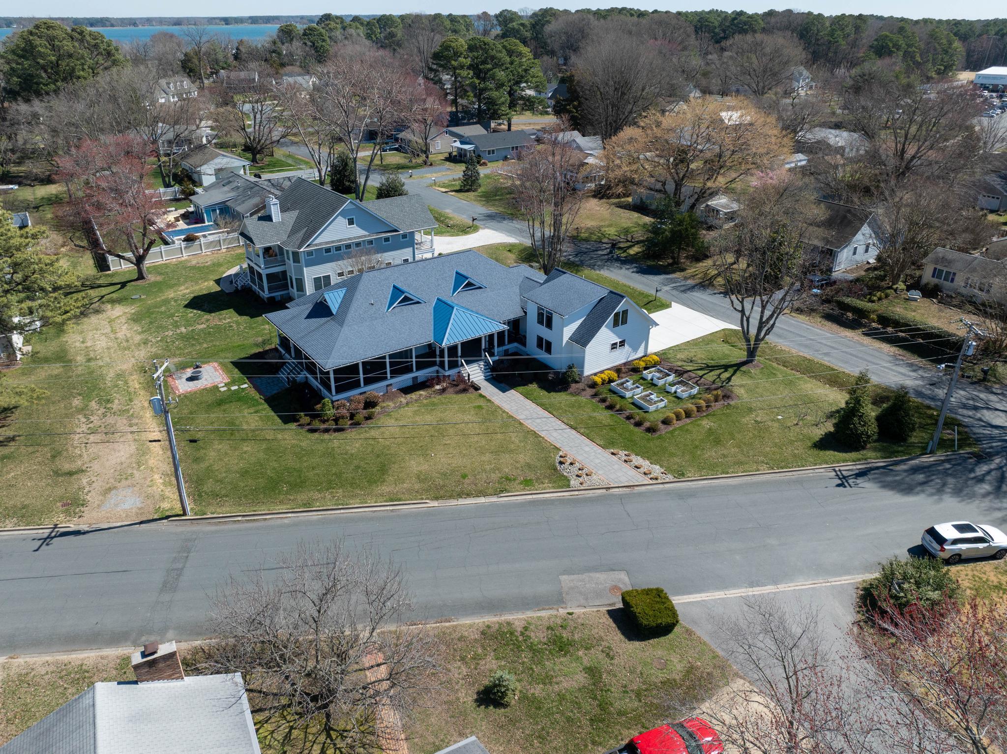 Welcome to "Porches" an exceptional coastal retreat with captivating views of the harbor, perfectly situated on a spacious .41 acre corner lot just around the corner from the shops and restaurants of St. Michaels. Built in 2018 with virtually maintenance-free construction, this beautifully designed home offers the ideal blend of comfort, style, and convenience in a rare St. Michaels setting.Inside the floor plan is filled with an abundance of natural light and enhanced by soaring cathedral ceilings, creating an airy and inviting atmosphere ideal for both every day living and perfect for entertaining. The main living area incorporates the living, dining and kitchen and offers easy access to the extensive porches the home features, including the screened-in porch with a gas fireplace and views of the harbor. In the great room there is also a "hidden" pantry along the dining area wall with plenty of shelving and storage. Custom built-in bookcases line the living area wall to the left of the propane fireplace which incorporates a built-in 90 lb per day nugget ice-maker. The gourmet kitchen is centered around a large island and features SS Thermador appliances including a duel fuel range with a six burner gas cooktop and electric oven, and an under counter wine fridge and under counter beverage fridge in the island. The contemporary design features the primary suite, 2nd bedroom, office/den, full bath and utility closet all on the main level. A standout out feature of this property is the 2nd level private guest suite, which is a licensed income-producing vacation rental, offering flexibility for guest or the opportunity for supplemental income. This private enclave includes a small sitting area, private bath and kitchenette with under counter refrigerator drawer, under counter freezer drawer, Keurig coffee maker, counter top microwave, and free standing shelves. The property also includes an attached 2 car garage, fire pit, raised garden beds with drip irrigation, and full irrigation system in the yard plus an oversized attached 2 car garage.With its desirable location close to all St. Michaels has to offer, exceptional amenities, and low-maintenance design, this is a rare opportunity to own one of the town's newer build homes with water views and income producing opportunity.