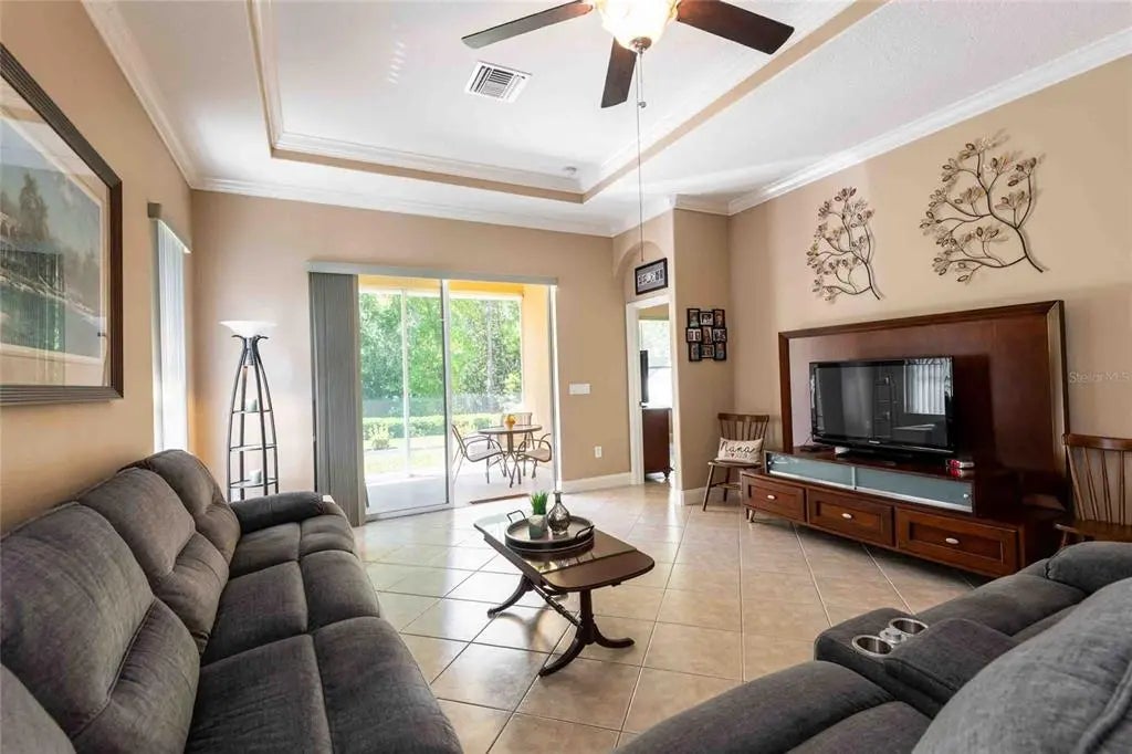 Welcome to this beautifully maintained 3-bedroom + den, 2-bath home located in the sought-after gated community of Devonwood in Land O' Lakes. Offering the perfect blend of comfort, style, and low-maintenance living, this elegant residence is surrounded by lush landscaping and peaceful private conservation views. Step inside to discover warm earth-toned ceramic tile flooring throughout, complemented by thoughtful architectural touches such as arched entryways and coffered ceilings that add charm and sophistication. The spacious dining area and oversized living room provide the perfect setting for both everyday living and entertaining, with sliding glass doors that open to a covered and screened-in lanai-ideal for relaxing and enjoying Florida's beautiful weather. The backyard features a fully fenced yard with mature landscaping and peaceful conservation views, offering serene privacy. This home has been thoughtfully upgraded with over $30,000 in improvements, including hurricane shutters ($10K), window tinting, automatic shades, vinyl fencing, Ring doorbell, Nest thermostat, and striking exterior stacked stone accents. Additional features include home security wiring, an oversized two-car garage, and a functional laundry room complete with a utility sink, extra cabinetry, and a storage closet. Residents of Devonwood enjoy the ease of maintenance-free living, with community amenities that include lawn care, grounds maintenance, bulk cable and internet, roof repair, and access to a resort-style pool and gazebo. Conveniently located near shopping, restaurants, Tampa International Airport, and Florida's beautiful Gulf beaches, this home offers the perfect opportunity to enjoy the Florida lifestyle with comfort, convenience, and peace of mind.
