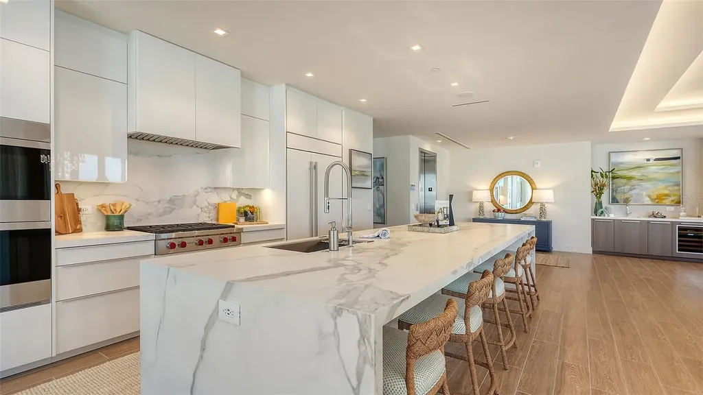 Experience the pinnacle of coastal luxury in the highly sought-after Armand building at The St. Regis Longboat Key, where breathtaking Gulf of Mexico views set the stage for an extraordinary living experience. This residence is absolutely breathtaking and is a must see. Designed for both grand entertaining and effortless everyday living, the expansive great room showcases a sophisticated wet bar and wine refrigerator, all enhanced by striking designer light fixtures and elegant sheers that create a soft, ethereal ambiance. Accordion glass doors seamlessly extend the space onto a sprawling wraparound terrace-complete with a private gas grill and unforgettable sunset vistas. Thoughtfully designed, this gracious room transitions beautifully between formal gatherings and relaxed coastal living. The chef's kitchen is a true centerpiece, featuring premium Poggenpohl cabinetry, a Sub-Zero refrigerator, Wolf double ovens and gas cooktop, dual dishwashers, and a separate breakfast area with bar and microwave. A large island offers additional seating, making it as functional as it is elegant. Or just order room service! The owner's suite is a private sanctuary, offering stunning Gulf views and a wet bar perfect for morning coffee or evening unwinding. Dual spa-inspired bathrooms provide two luxurious and private retreats-one with custom closets, an oversized vanity, seamless glass shower, and private water closet; the other with a large vanity, dedicated makeup area, custom closets, seamless shower, and private water closet. A spacious and comfortable club room creates an additional venue for entertaining, complete with a wet bar and beverage refrigerator. Two additional guest bedrooms are equally well-appointed, each opening onto a private terrace. One offers Gulf views, custom closets, and a luxurious bath with a large vanity, makeup area, seamless glass shower, and private water closet. The third bedroom is thoughtfully designed for comfort and privacy, featuring accordion doors to the terrace and a beautifully finished bathroom with a large vanity and makeup area, freestanding soaking tub, seamless glass shower, and private water closet. An elegant powder room adds convenience for guests. Additional highlights include a large laundry room with sink, built-in cabinetry, and hanging rack. The residence is offered fully turnkey, with exquisite furnishings curated by the renowned Marc-Michaels Interior Design-featuring designer-selected finishes, statement lighting, refined furniture pieces, and custom window treatments that create a cohesive, sophisticated aesthetic throughout. Modern living is elevated by fully integrated smart home technology, including iPad-controlled systems, electronic sheers, and blackout shades-delivering both convenience and ambiance at the touch of a button. Nestled within the first branded residential community and ultra-luxe 5 star resort on the Gulf of Mexico. The Residences at The St. Regis Longboat Key blend legendary service with the allure of a seaside getaway. Spanning over 17 acres with 800 feet of direct beachfront, this community offers unparalleled amenities, including the signature St. Regis Butler and Concierge services, a world-renowned St. Regis Spa, in residence dining. Resident only amenities include a clubhouse, fitness center, pool/spa and beach area. Enjoy your private resident only amenities, while having access to all the resort has to offer. Live like you are on vacation all year round!