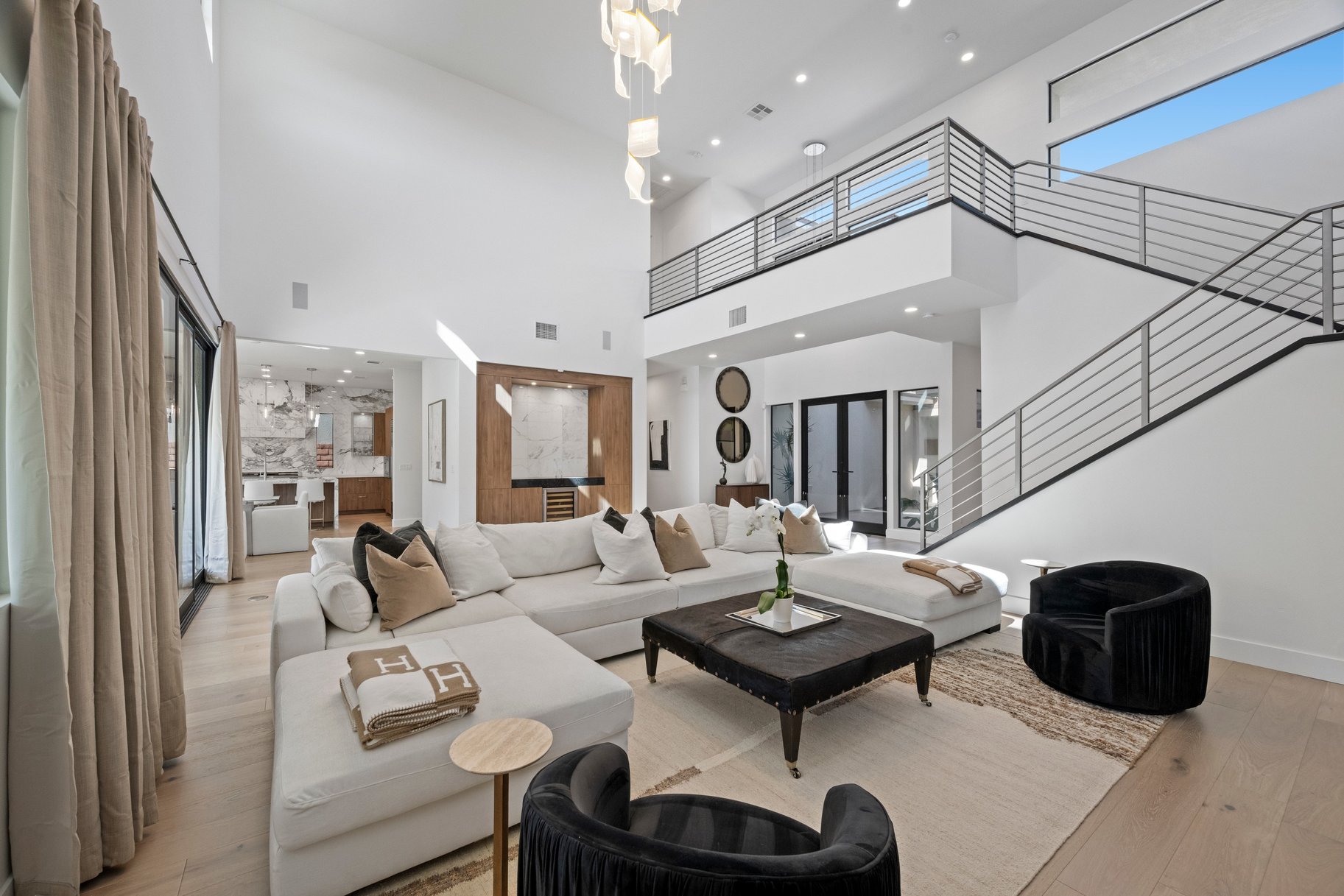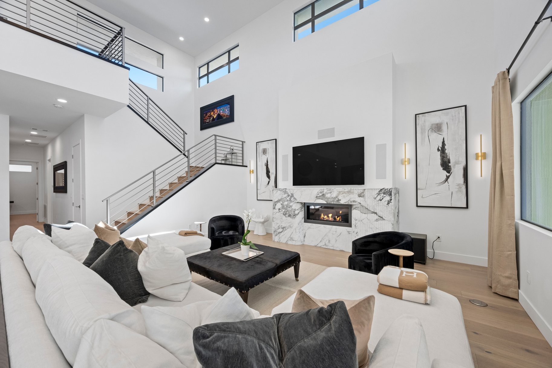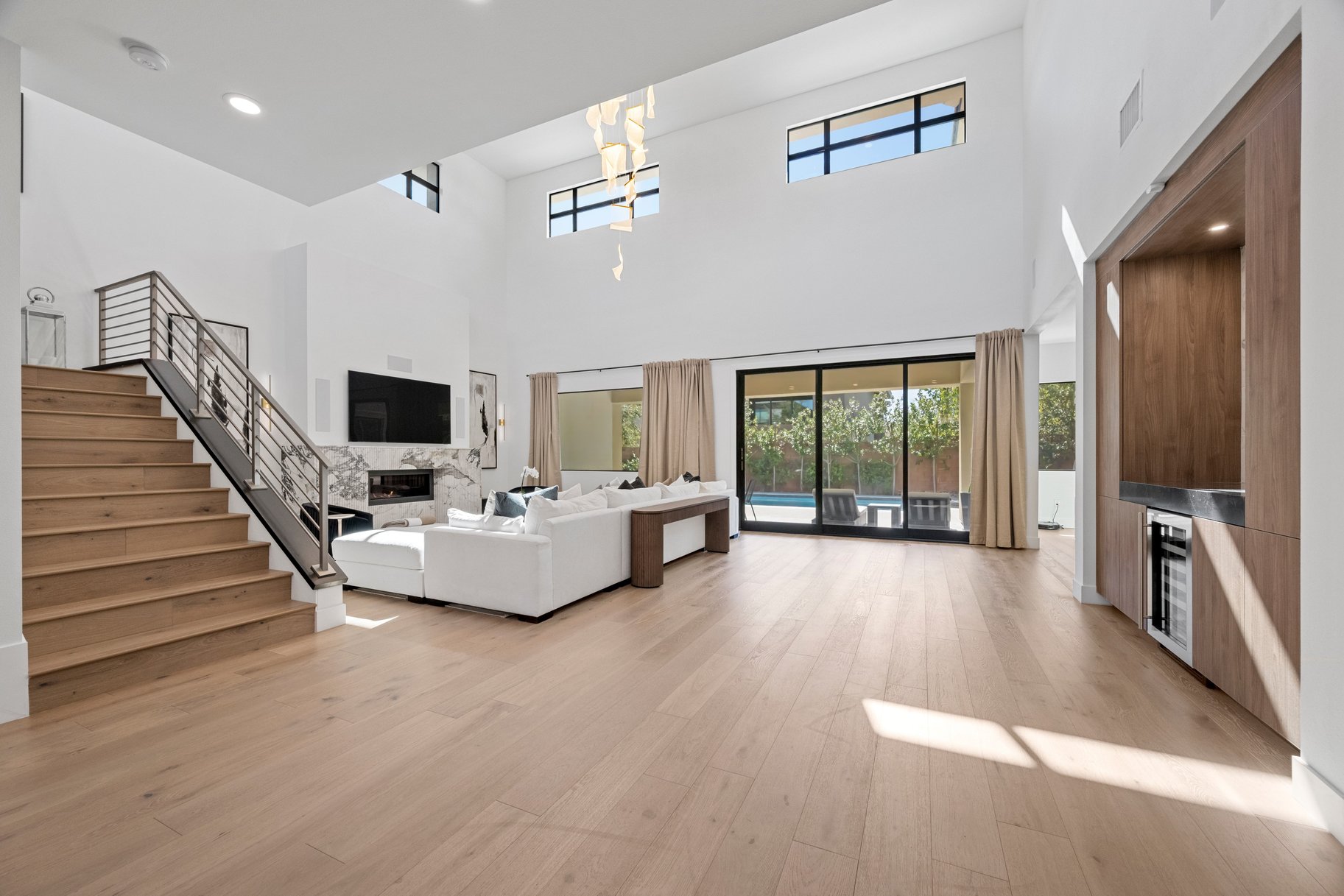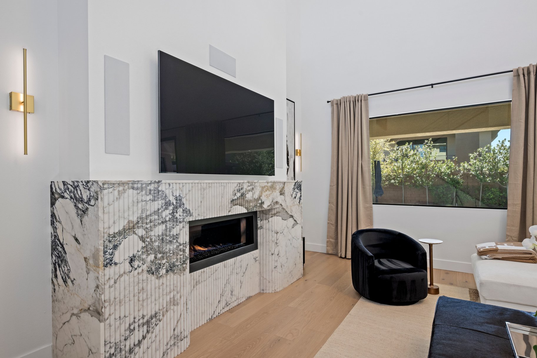 Modern luxury meets resort-style living in Sterling Ridge at The Ridges. With no expense spared, this exceptional indoor/outdoor remodel blends modern elegance with functional luxury. A private courtyard entry welcomes you into an open-concept floor plan highlighted by soaring ceilings, natural light, and a custom fluted linear fireplace. The gourmet kitchen is a true centerpiece, featuring rich custom cabinetry, exquisite stone, and a dramatic waterfall island. The home is appointed with wide-plank hardwood flooring and designer lighting throughout. The primary retreat offers a serene escape with flex space, custom walk-in closet, floating vanities, a freestanding soaking tub, and dual balconies. Two well-appointed guest suites are located on the first floor, offering privacy and space. The powder room makes a bold statement with oversized fluted tile walls and a custom vanity. The backyard is a true resort-style retreat, complete with pebble decking, a sparkling pool and spa, and a custom fire feature and cabana.