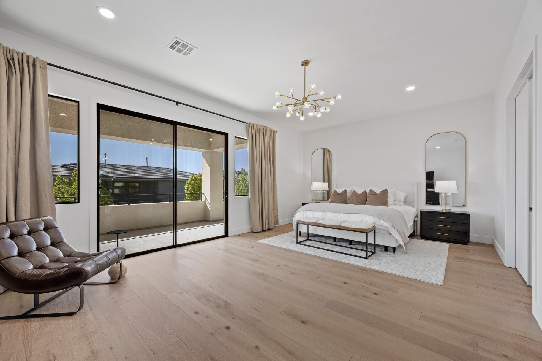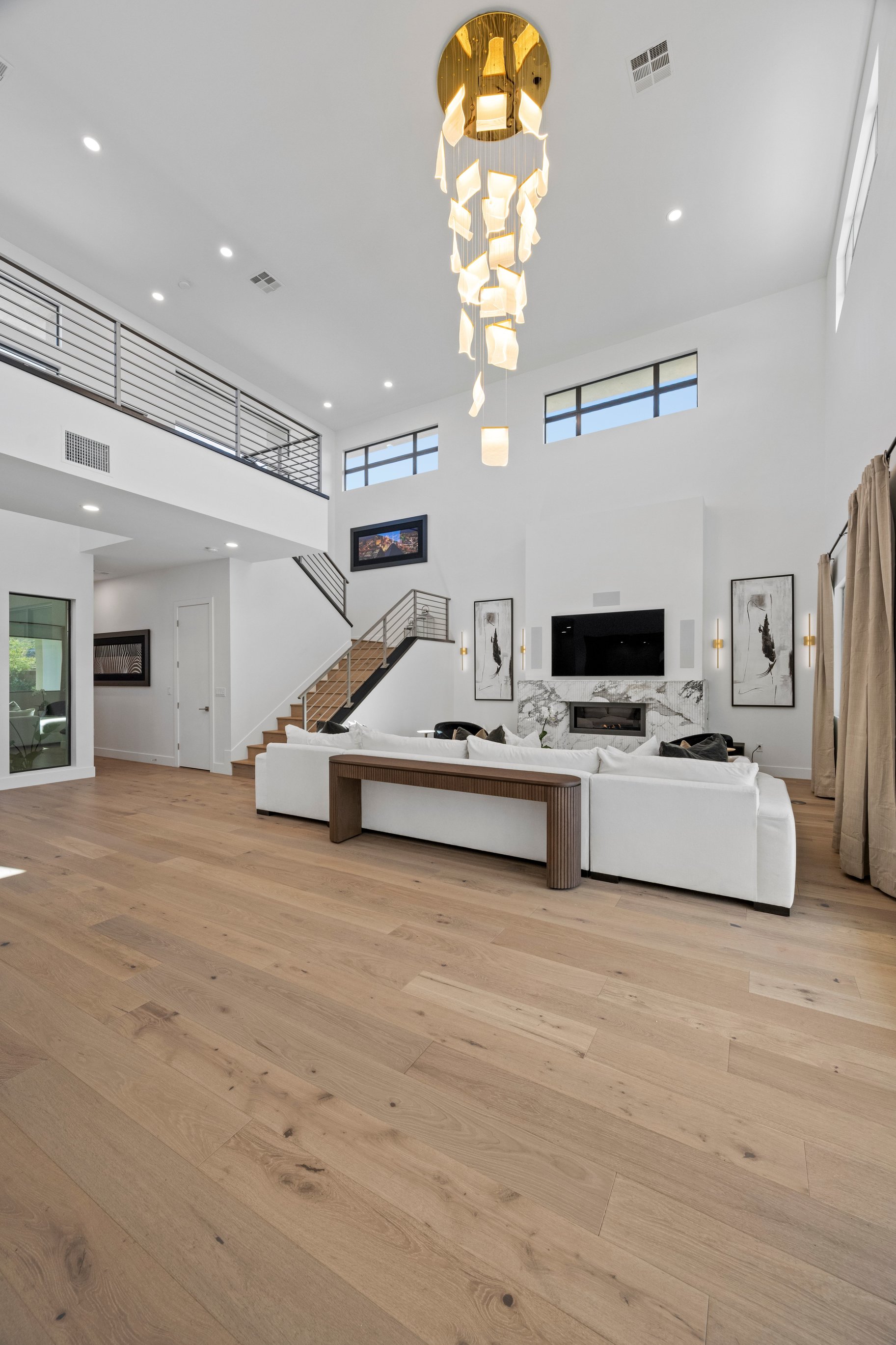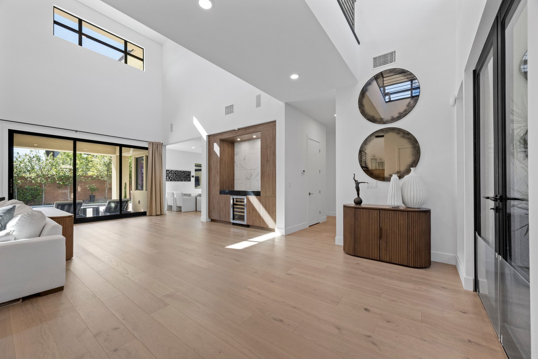 Modern luxury meets resort-style living in Sterling Ridge at The Ridges. With no expense spared, this exceptional indoor/outdoor remodel blends modern elegance with functional luxury. A private courtyard entry welcomes you into an open-concept floor plan highlighted by soaring ceilings, natural light, and a custom fluted linear fireplace. The gourmet kitchen is a true centerpiece, featuring rich custom cabinetry, exquisite stone, and a dramatic waterfall island. The home is appointed with wide-plank hardwood flooring and designer lighting throughout. The primary retreat offers a serene escape with flex space, custom walk-in closet, floating vanities, a freestanding soaking tub, and dual balconies. Two well-appointed guest suites are located on the first floor, offering privacy and space. The powder room makes a bold statement with oversized fluted tile walls and a custom vanity. The backyard is a true resort-style retreat, complete with pebble decking, a sparkling pool and spa, and a custom fire feature and cabana.