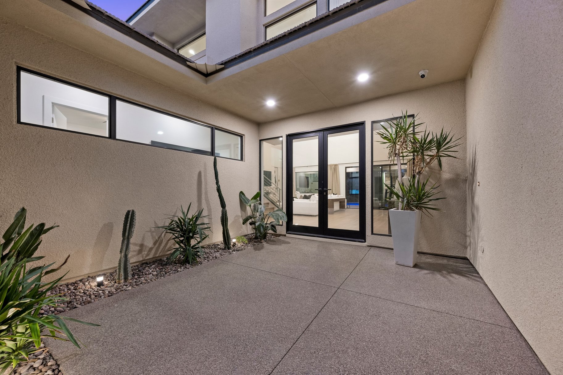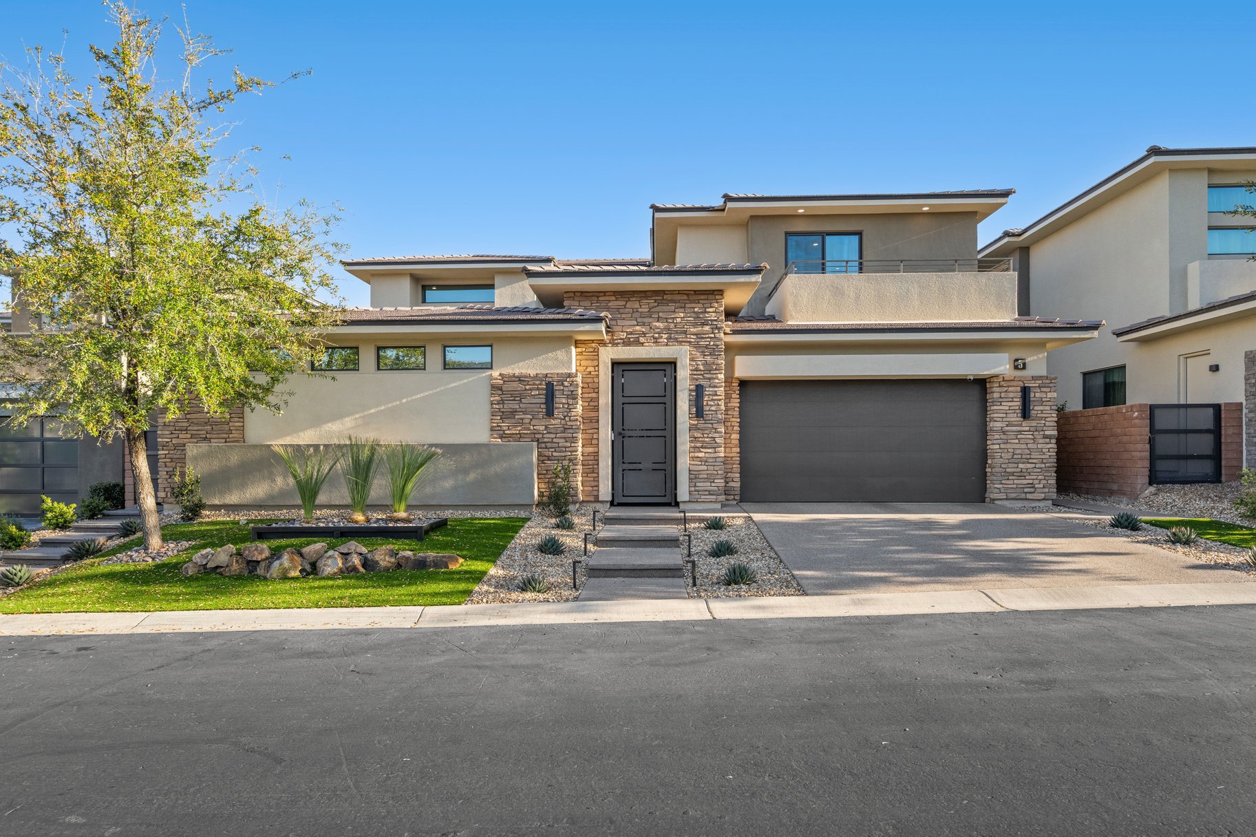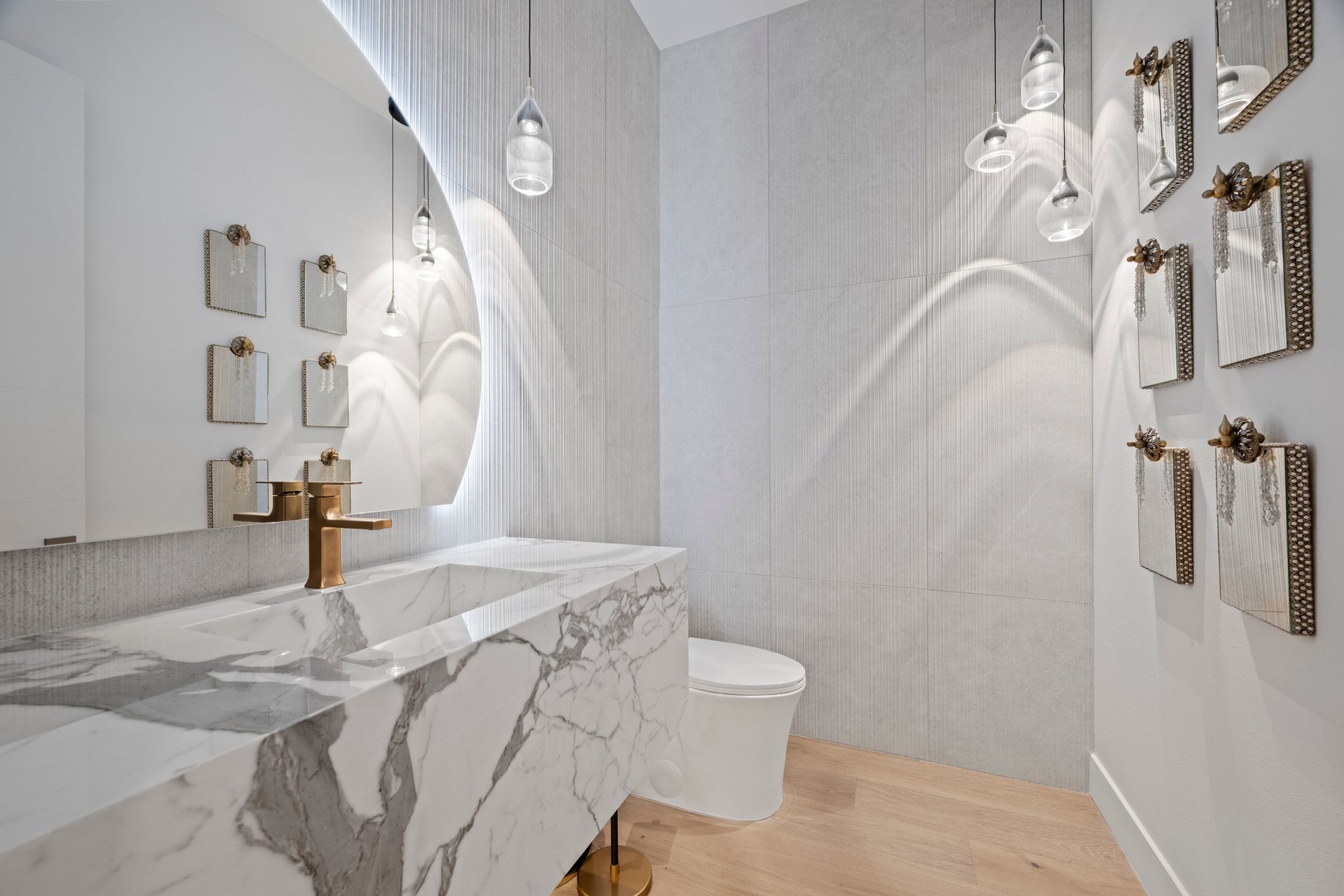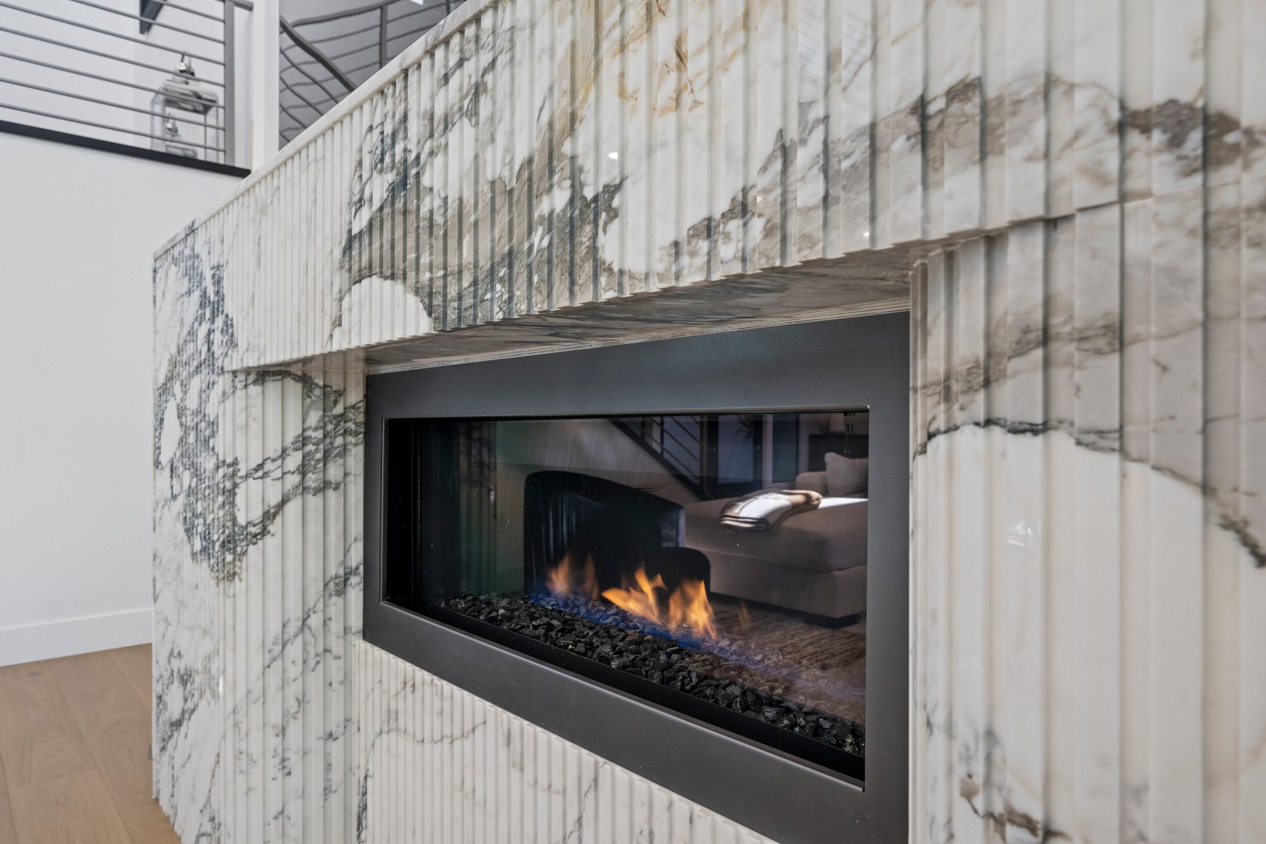Modern luxury meets resort-style living in Sterling Ridge at The Ridges. With no expense spared, this exceptional indoor/outdoor remodel blends modern elegance with functional luxury. A private courtyard entry welcomes you into an open-concept floor plan highlighted by soaring ceilings, natural light, and a custom fluted linear fireplace. The gourmet kitchen is a true centerpiece, featuring rich custom cabinetry, exquisite stone, and a dramatic waterfall island. The home is appointed with wide-plank hardwood flooring and designer lighting throughout. The primary retreat offers a serene escape with flex space, custom walk-in closet, floating vanities, a freestanding soaking tub, and dual balconies. Two well-appointed guest suites are located on the first floor, offering privacy and space. The powder room makes a bold statement with oversized fluted tile walls and a custom vanity. The backyard is a true resort-style retreat, complete with pebble decking, a sparkling pool and spa, and a custom fire feature and cabana.