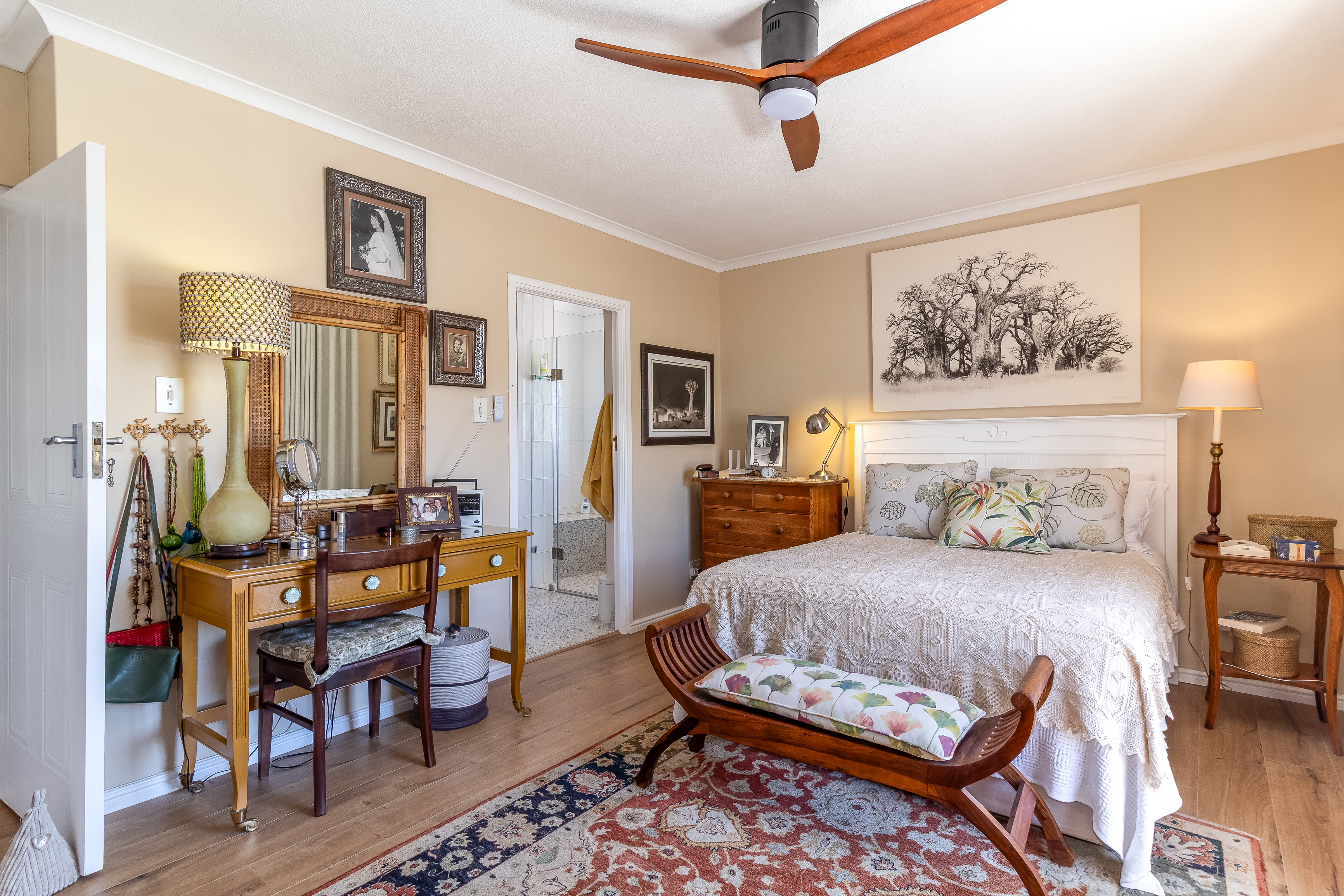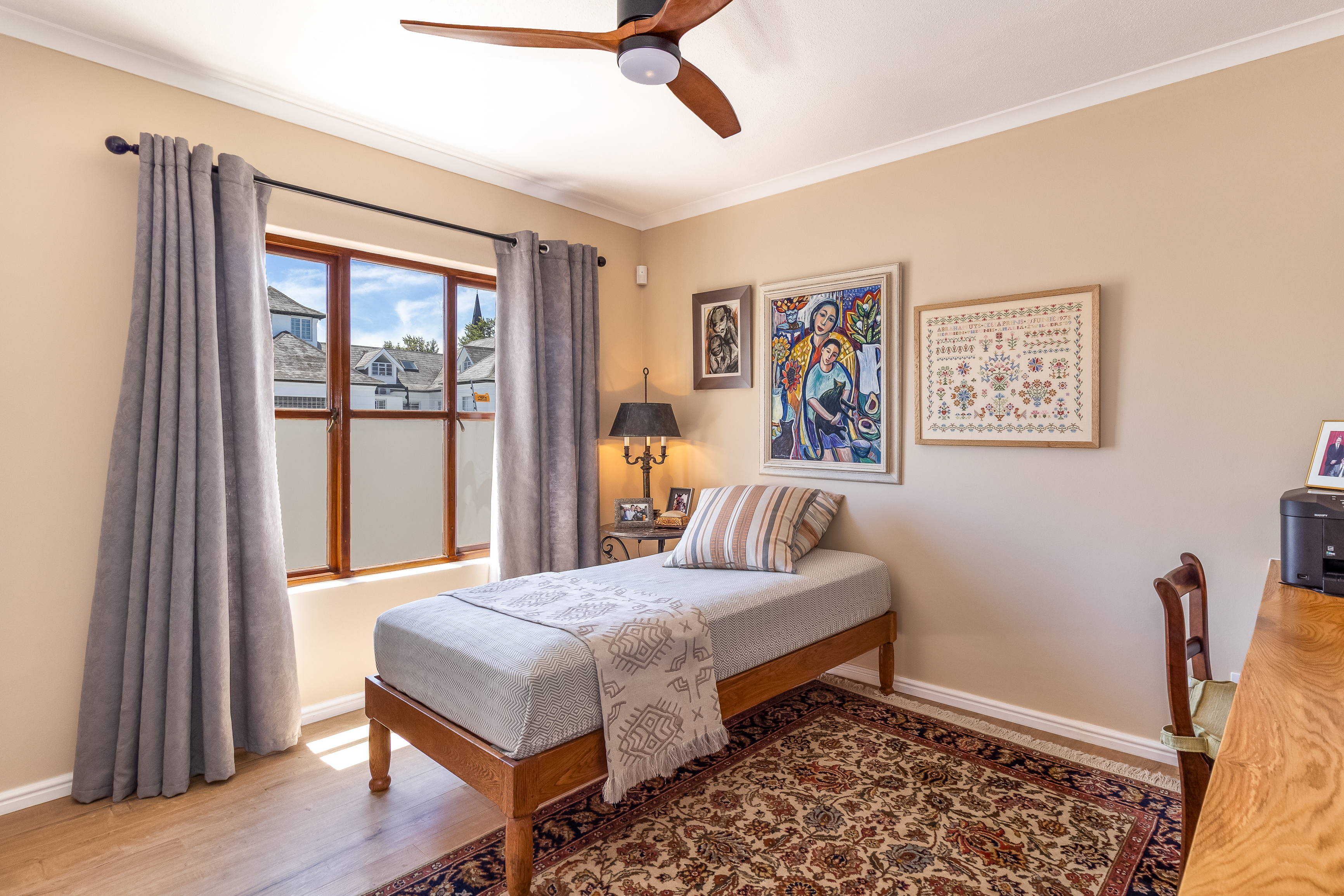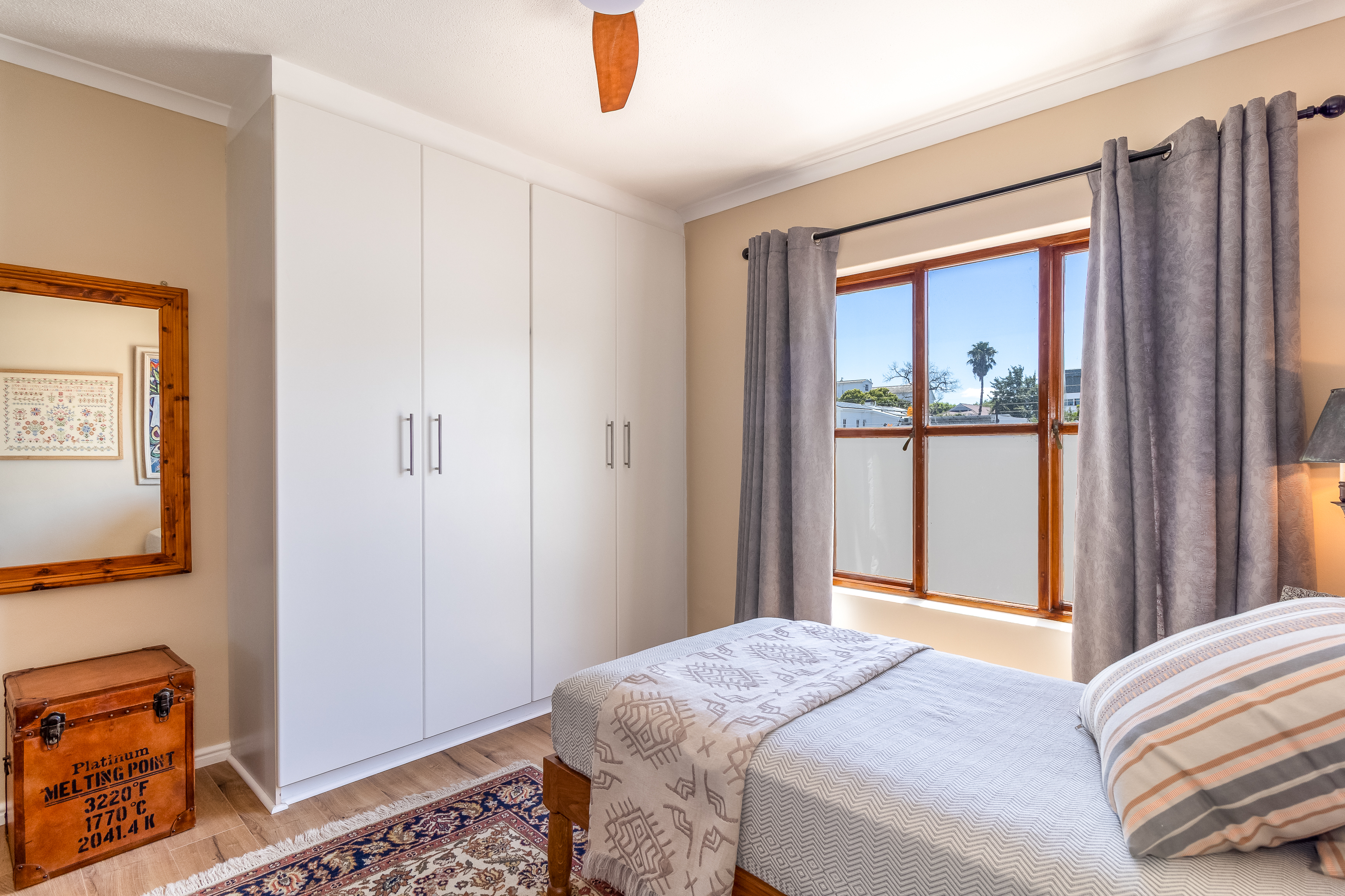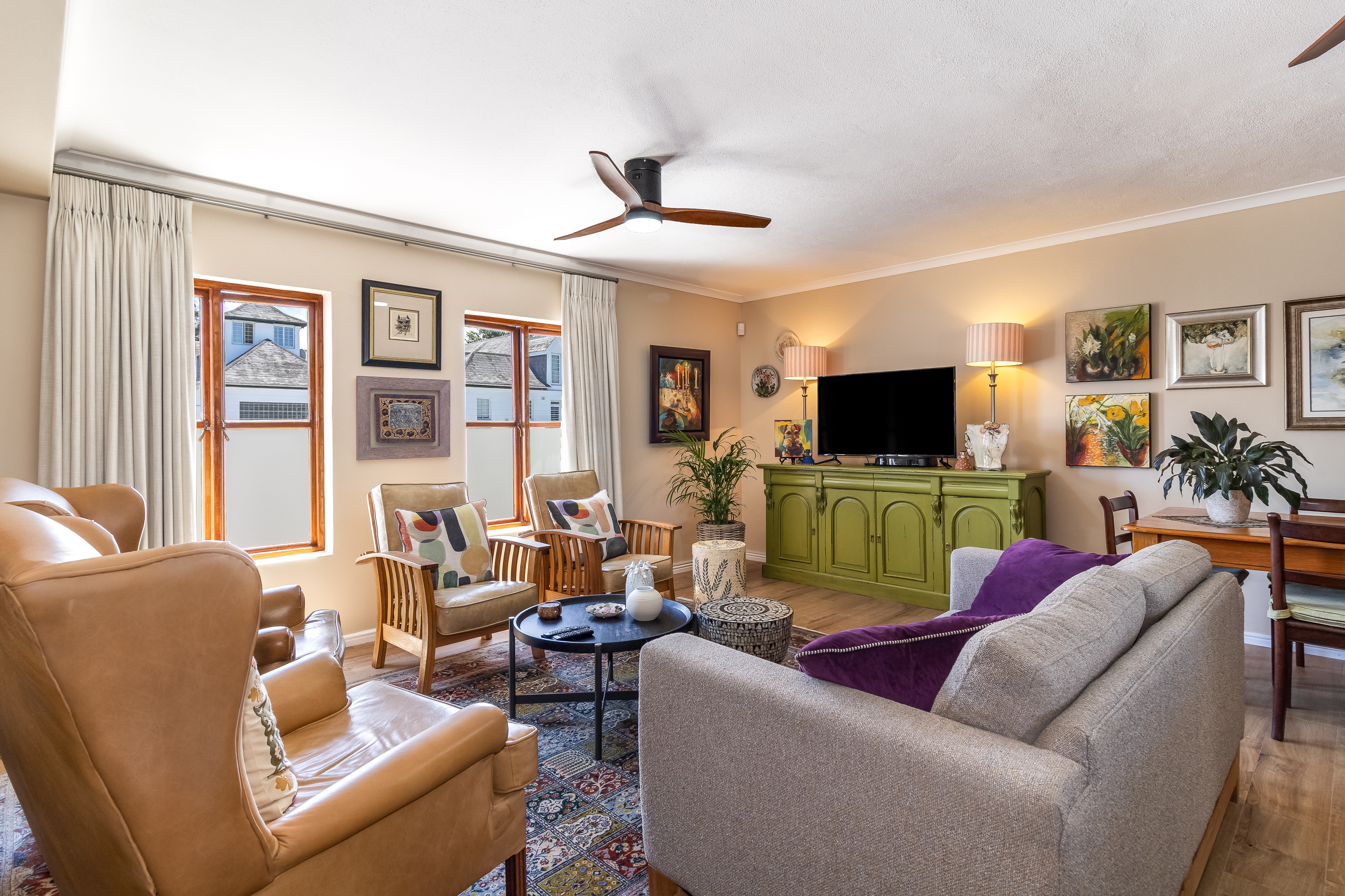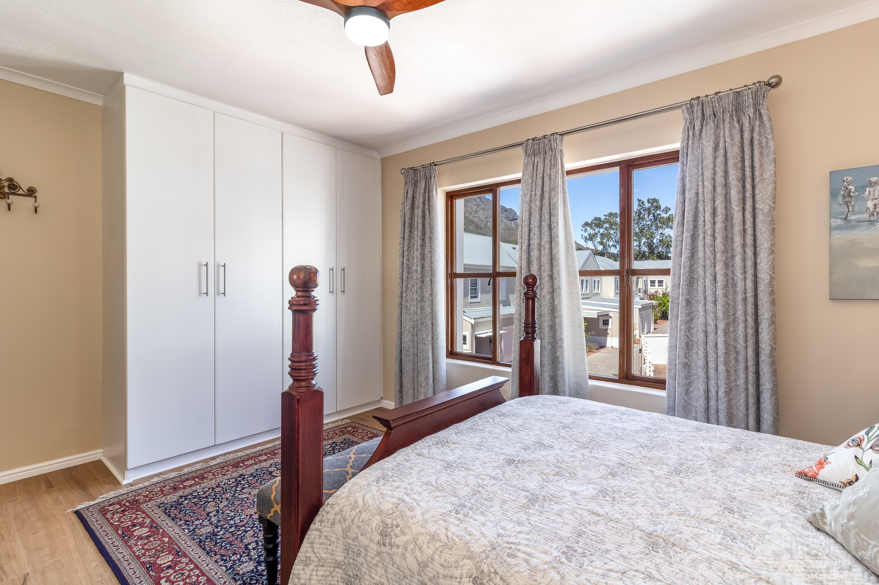 Located on the first floor, the apartment welcomes you into a light-filled living space where large windows frame charming town views with the iconic Stellenbosch mountain backdrop beyond. Original wooden flooring runs throughout, enhancing the sense of warmth and authenticity while blending effortlessly with contemporary, high-quality finishes to create a refined yet inviting atmosphere.