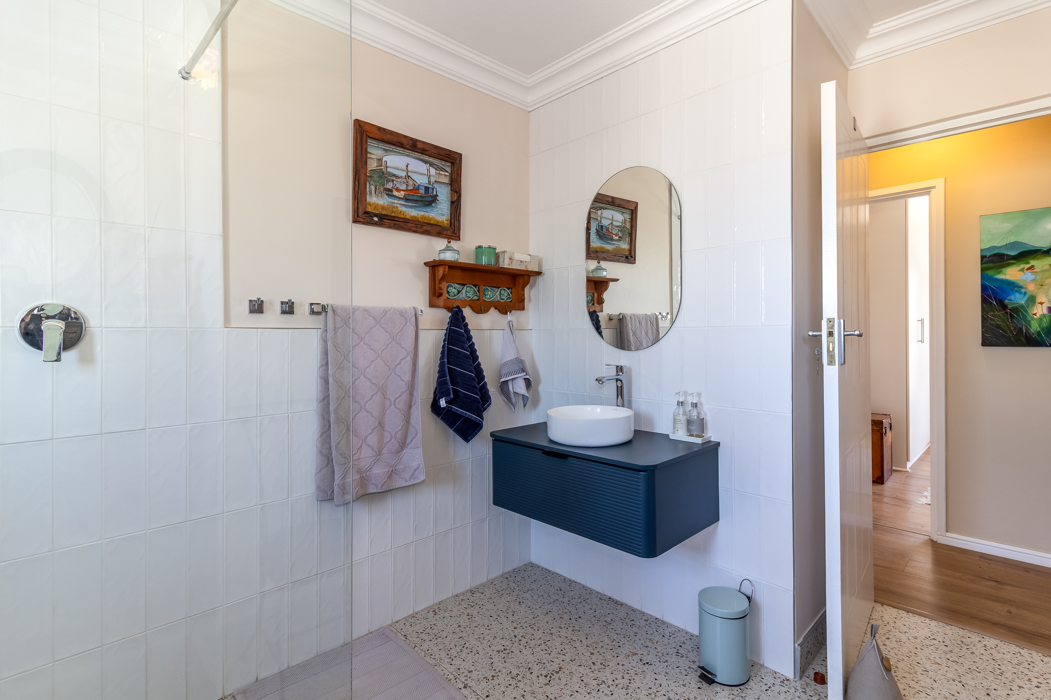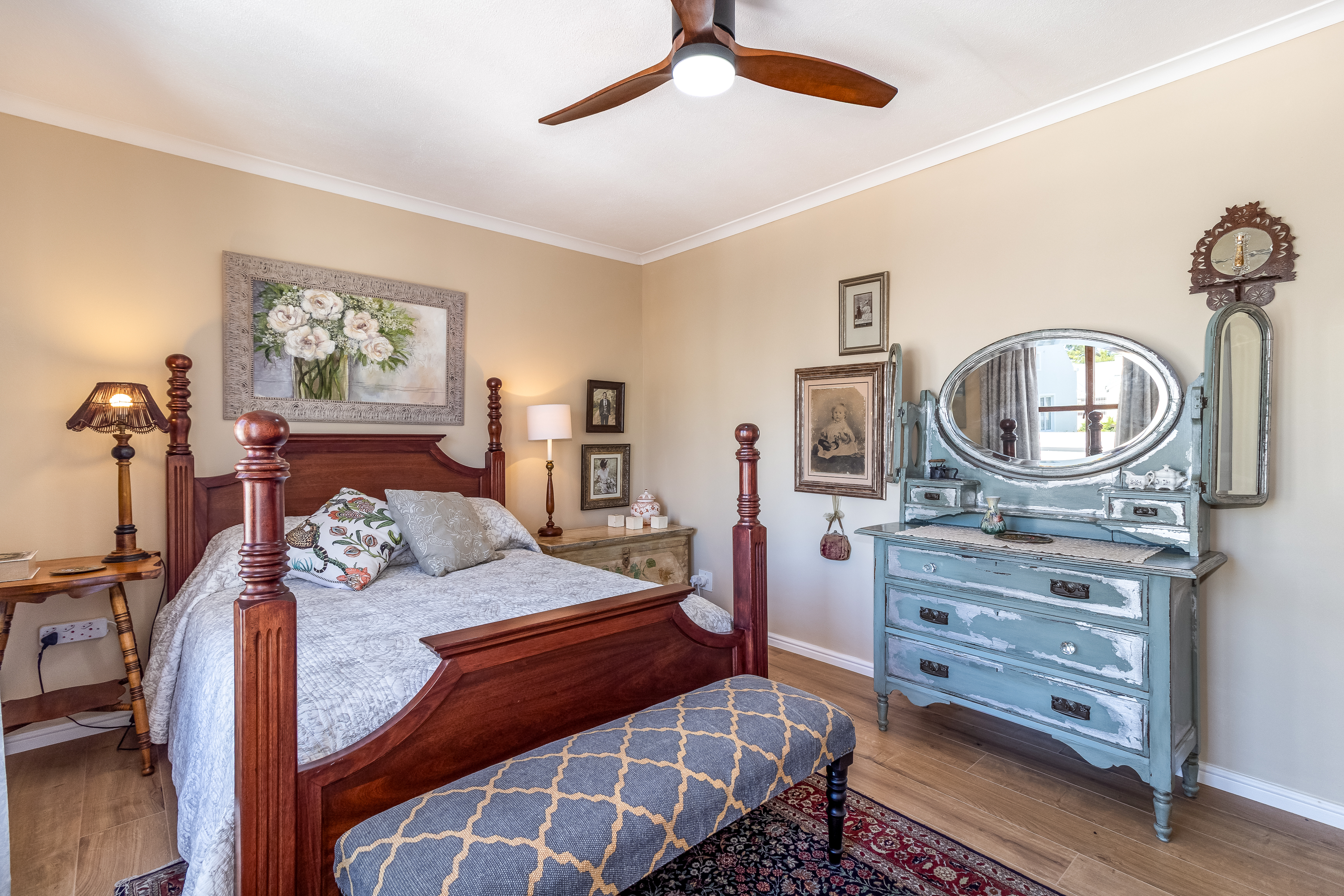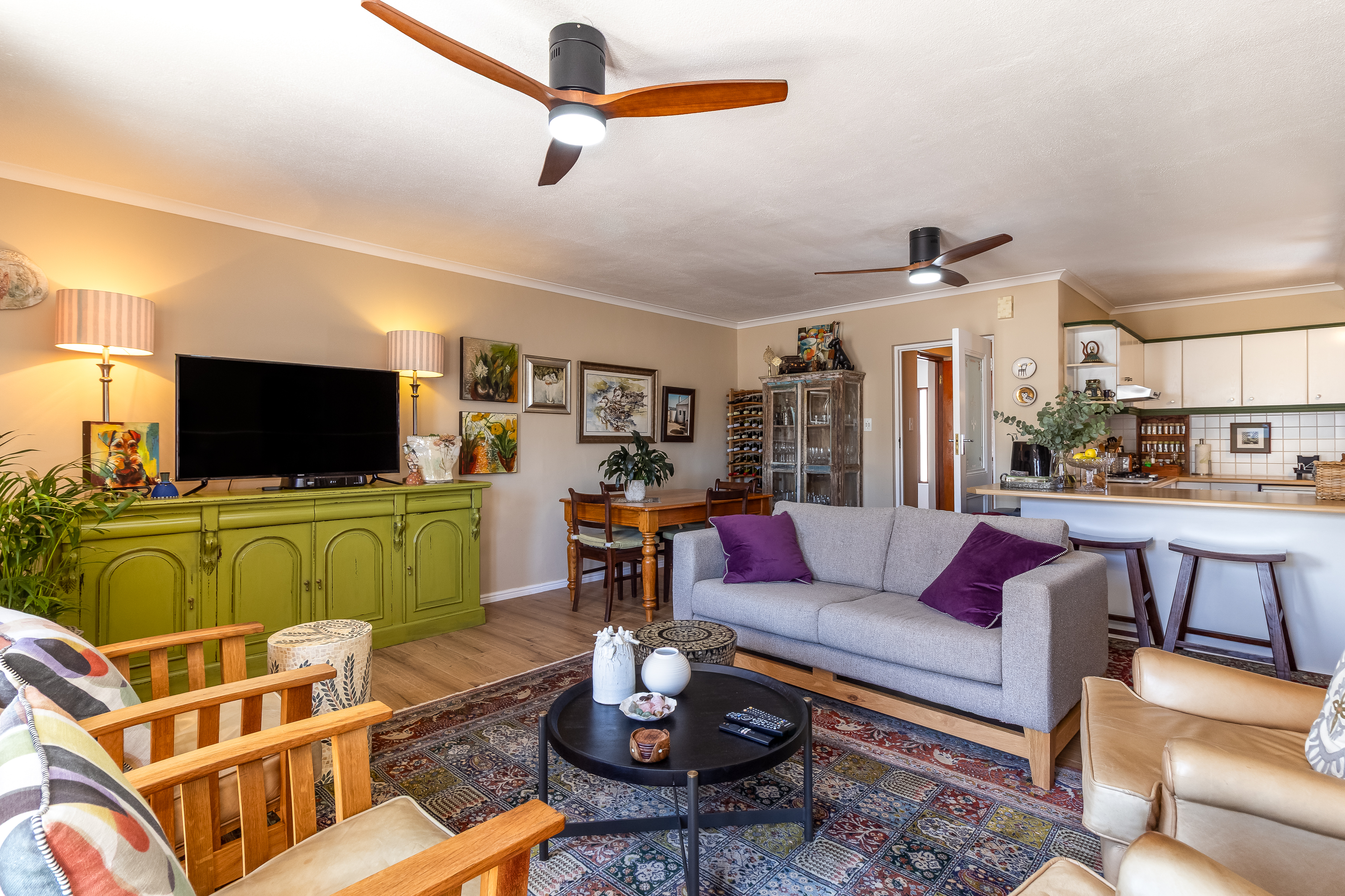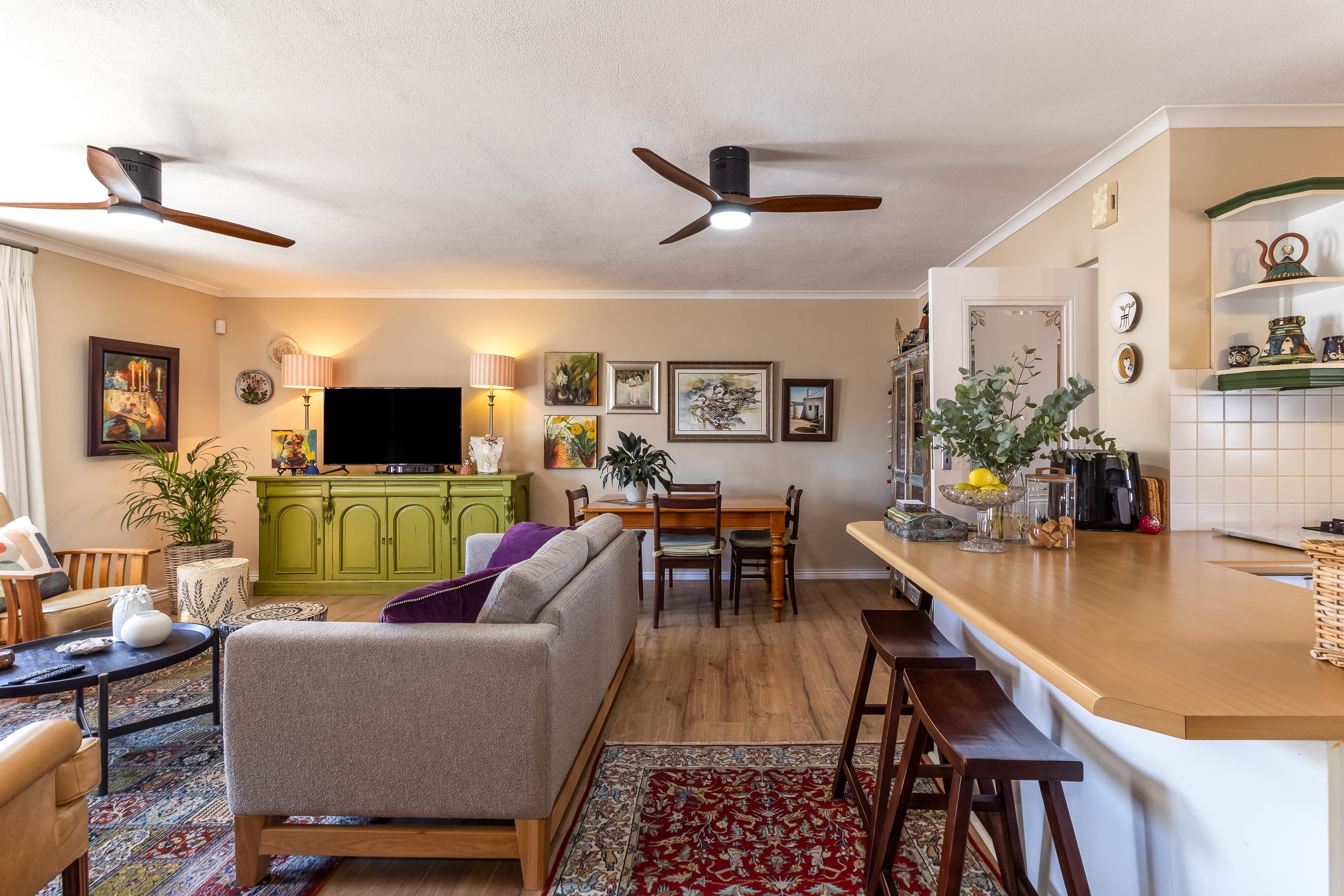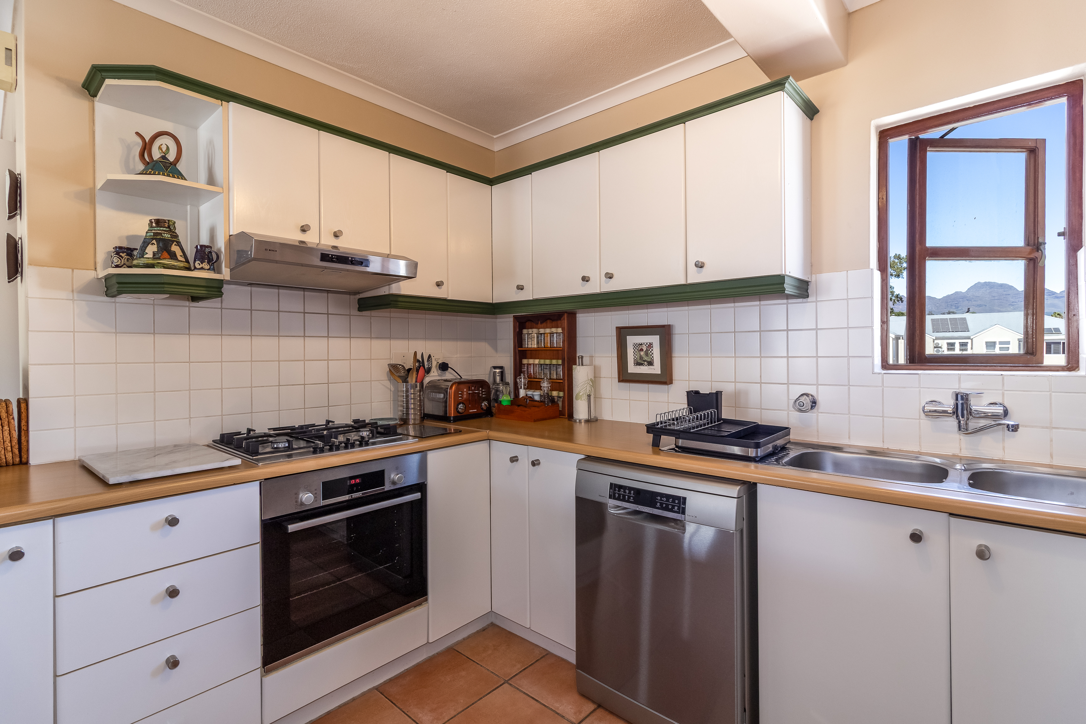 Located on the first floor, the apartment welcomes you into a light-filled living space where large windows frame charming town views with the iconic Stellenbosch mountain backdrop beyond. Original wooden flooring runs throughout, enhancing the sense of warmth and authenticity while blending effortlessly with contemporary, high-quality finishes to create a refined yet inviting atmosphere.