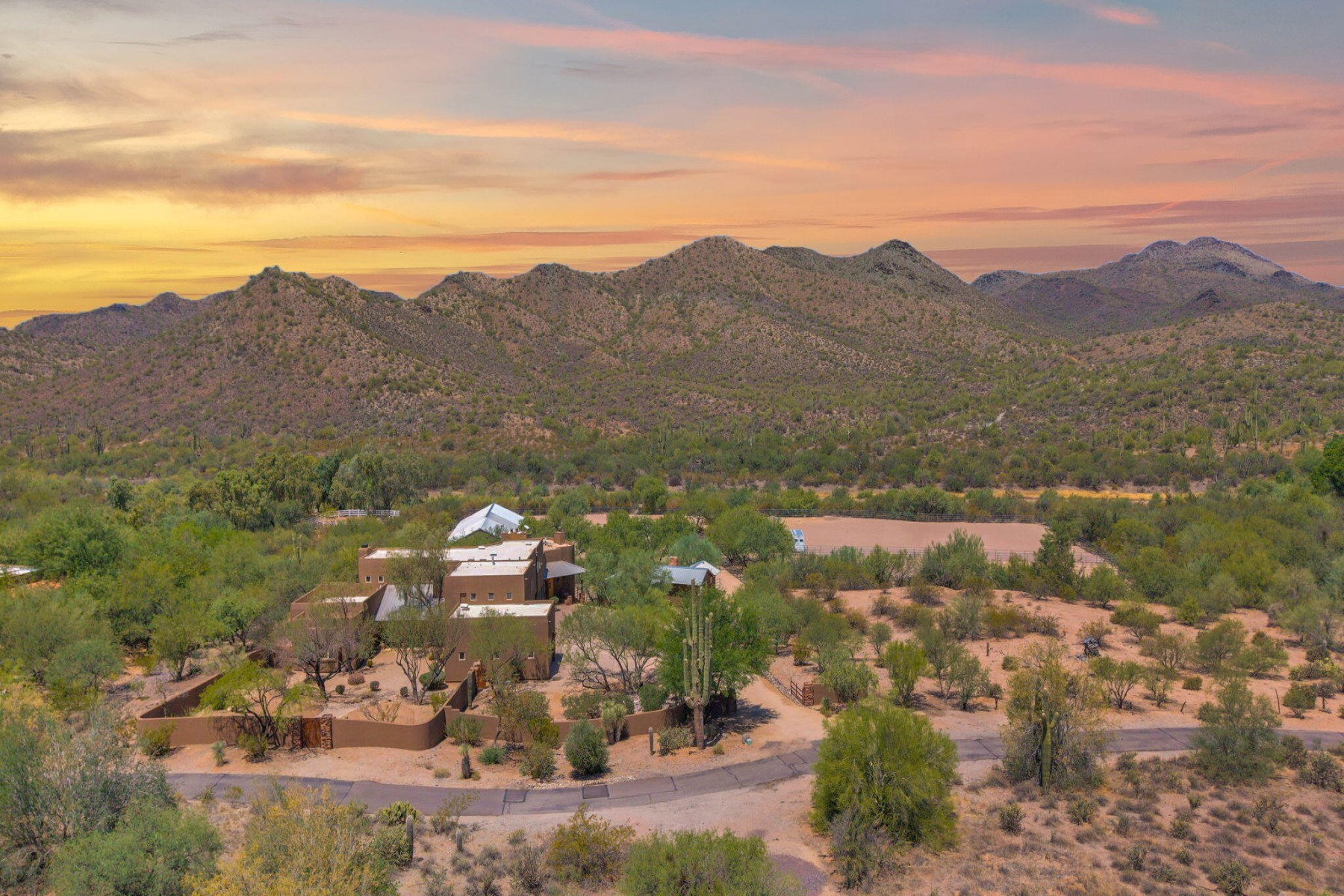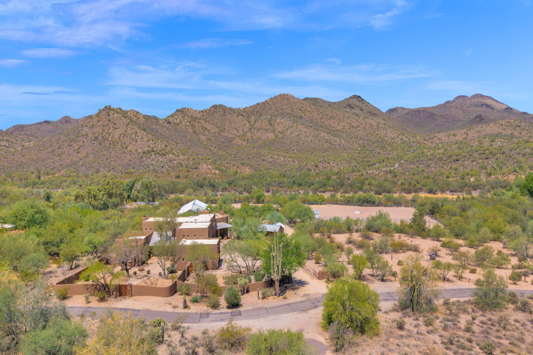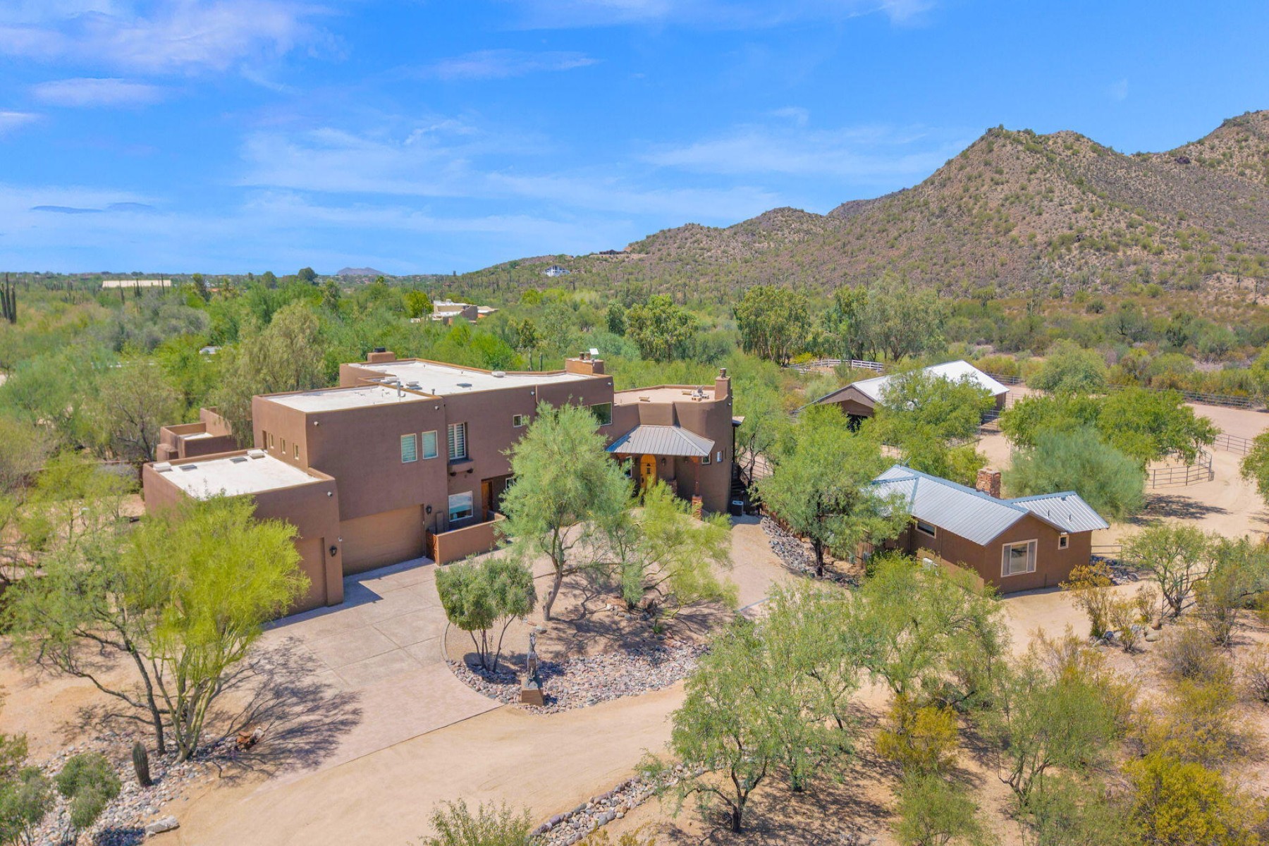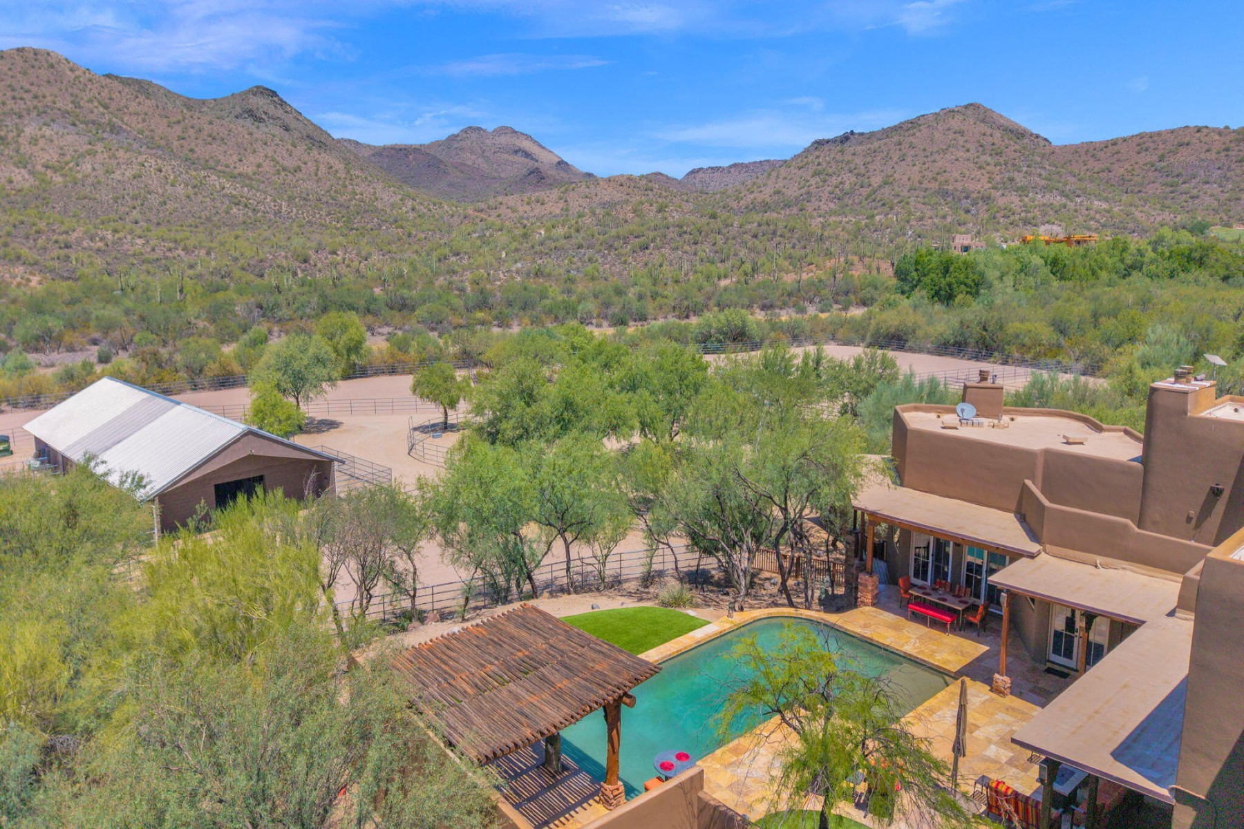 Cave Creek luxury estate with adjacent parcels offering rare opportunity for collector garage, second home, or family compound with direct trail access. Situated on nearly 10 acres, this Arizona property provides flexibility to create a custom car collector garage, guest residence, or multi-generational compound in one of Cave Creek's most desirable locations. Minutes from dining, galleries, and the town center, yet offering privacy, paved access, and city water. Set against a protected mountain backdrop, the home enjoys panoramic Sonoran Desert views and exceptional Arizona sunsets from expansive pool patios and nearly every window. The property borders open desert with direct access to thousands of acres of preserved trails within the Desert Foothills Land Trust Preserve and Cave Creek Regional Park, creating a rare blend of convenience, scenery, and open space.The gorgeous Southwest residence features hand-plastered walls, wood-beamed ceilings, chef's kitchen, guest suites, and a private primary retreat with steam shower, infrared sauna, and dual closets. Detached guesthouse with full kitchen and gym.Ideal for car collectors, luxury buyers seeking a compound property, or those desiring additional building opportunity with preserved desert access. No HOA.