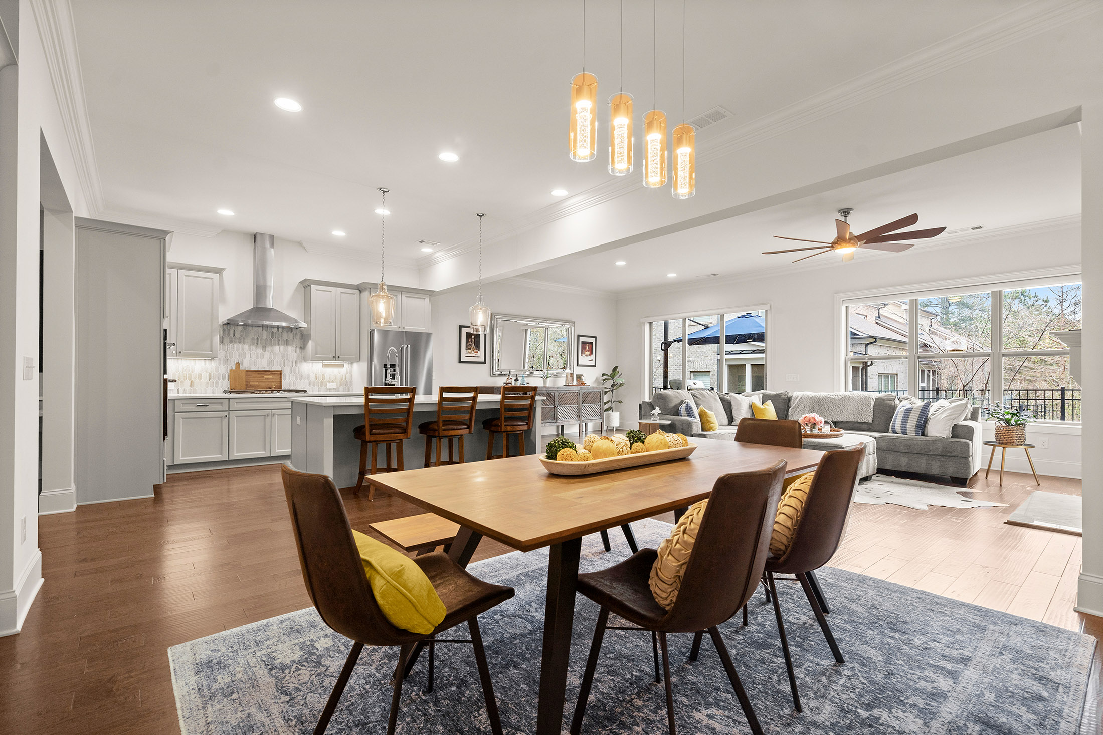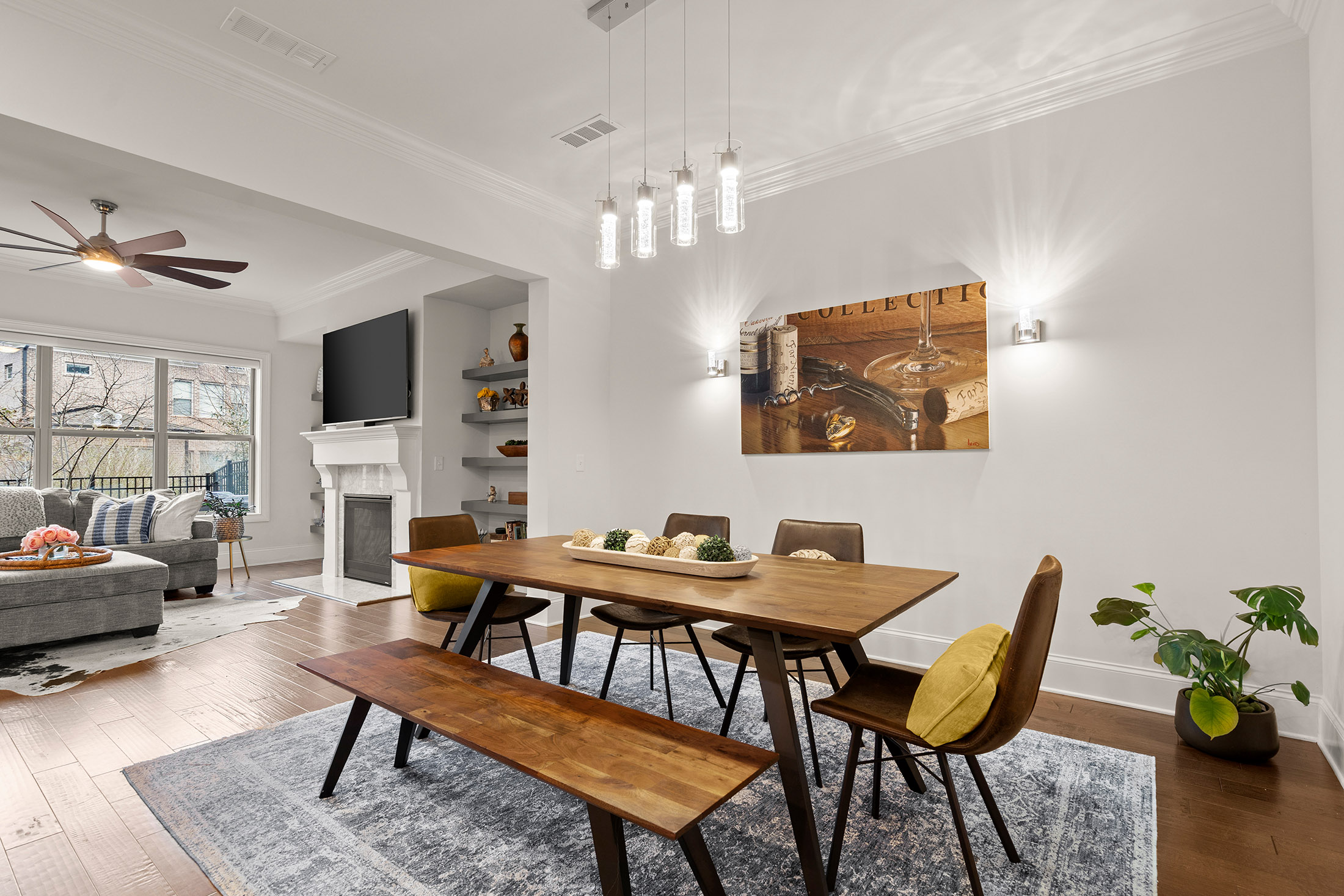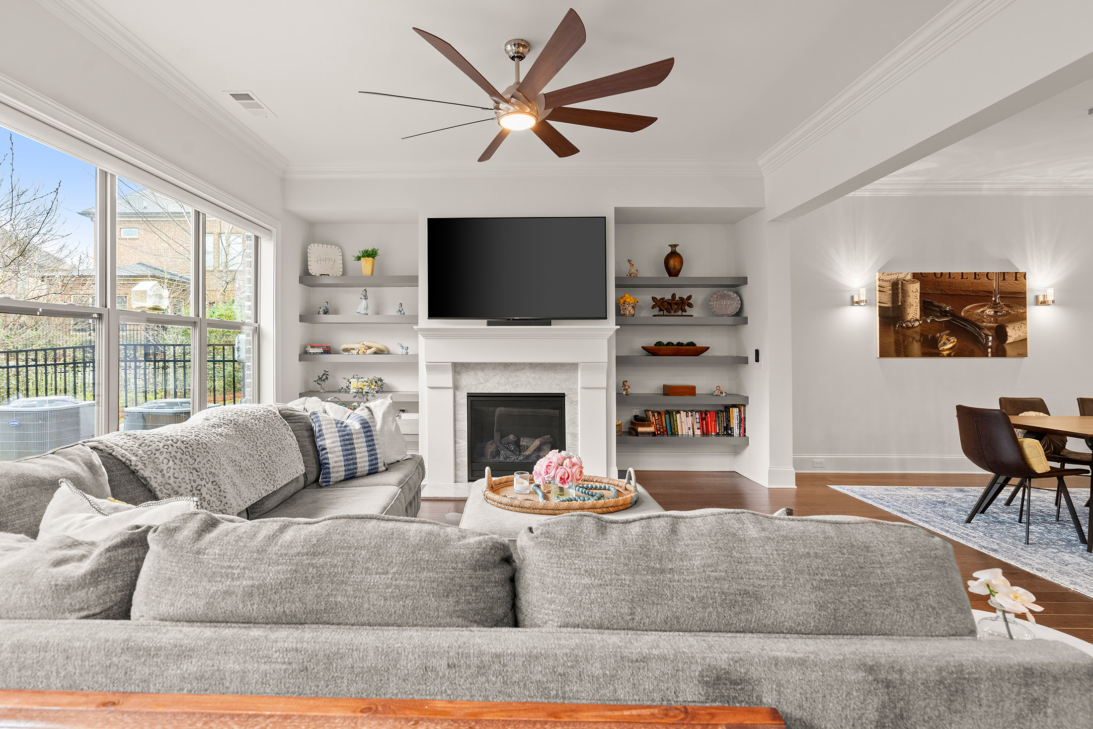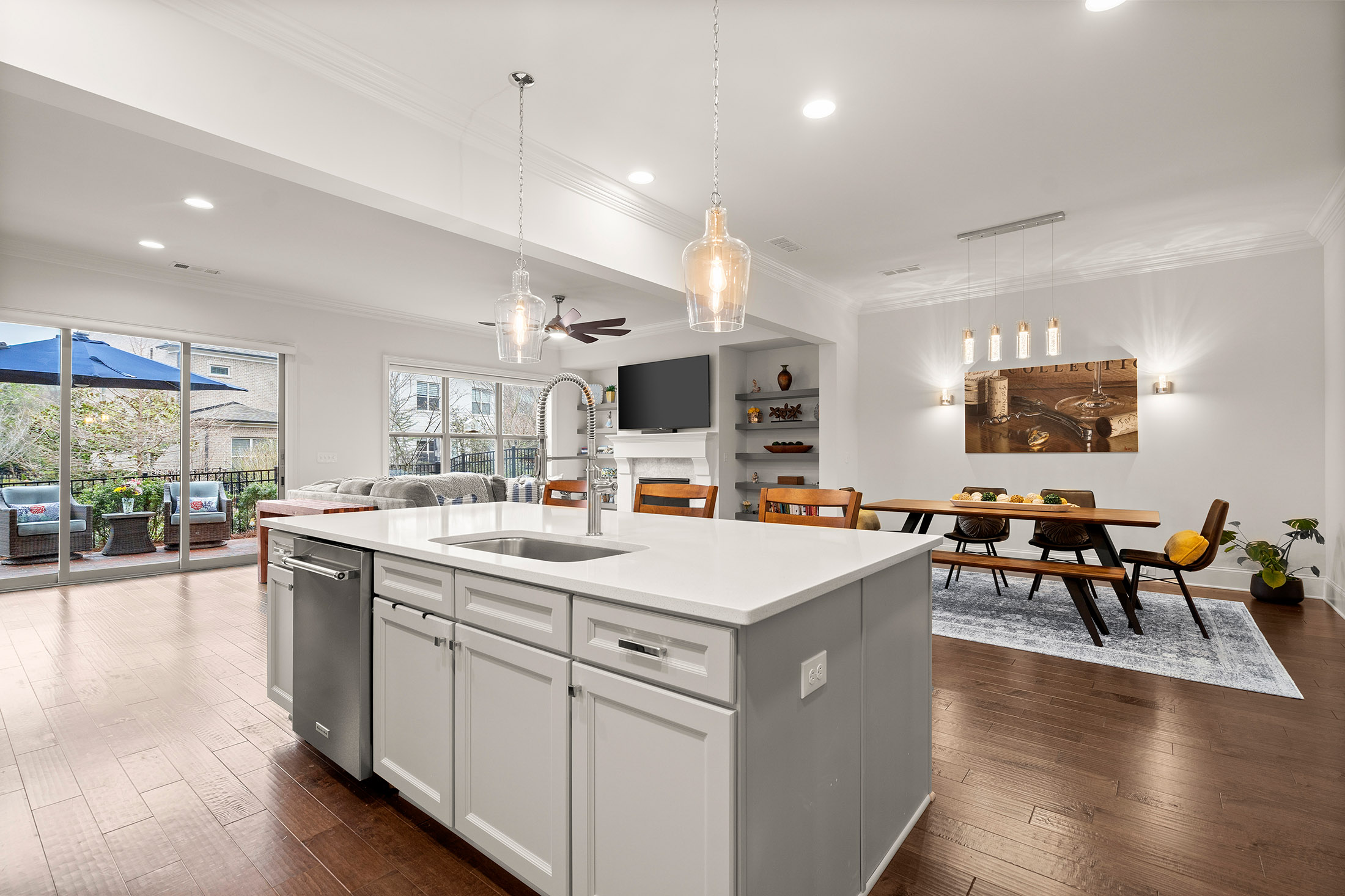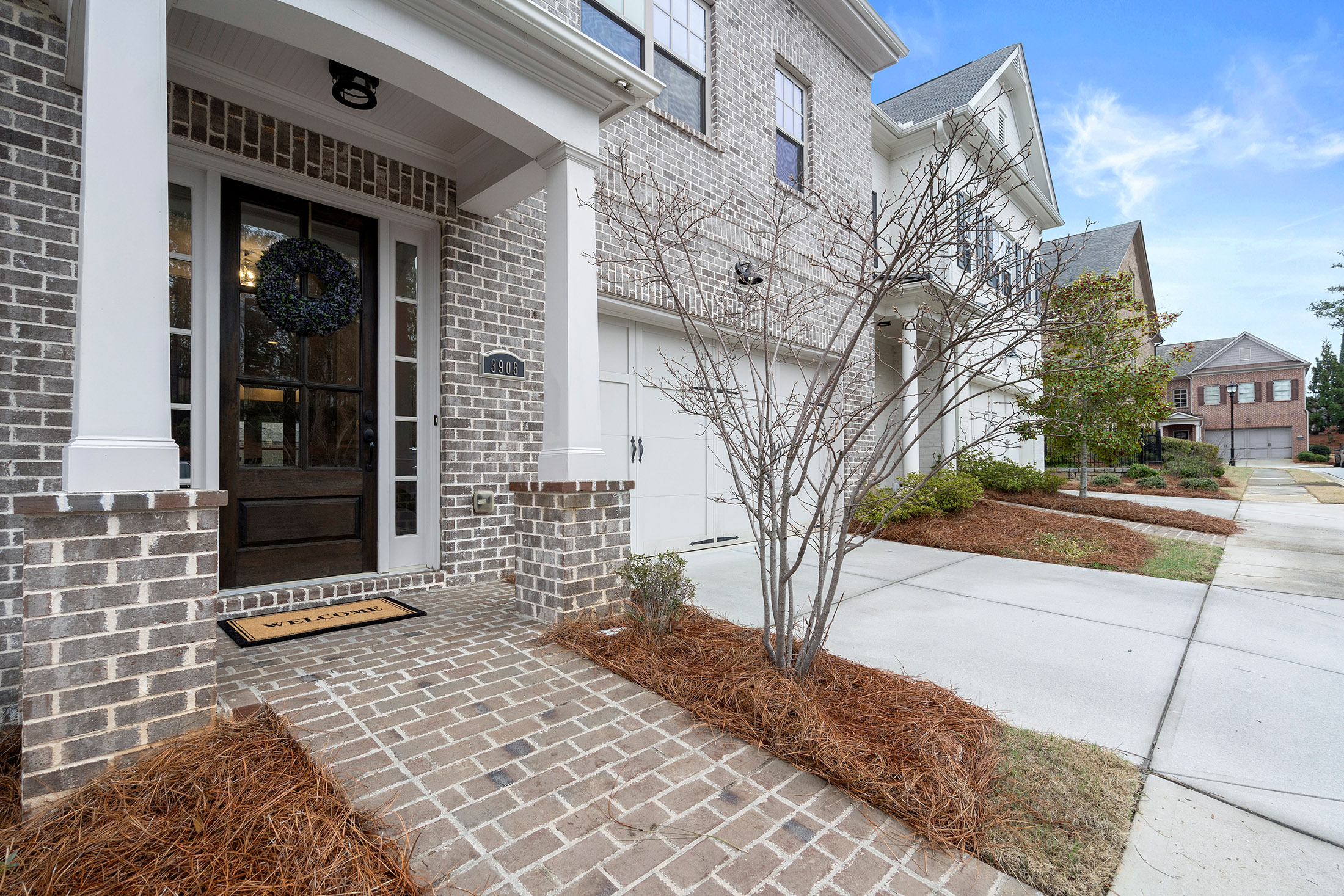 Enjoy refined living with minimal upkeep in this beautifully appointed townhome located in Duke Reserve, a private gated community known for its charming brick architecture. Situated in the heart of Peachtree Corners, the home offers easy access to The Forum, Peachtree Corners Town Center, highly rated schools, and major highways, making shopping, dining, and commuting effortless. Inside, soaring ten foot ceilings, rich hardwood floors, and abundant natural light create a bright and inviting atmosphere throughout the home. The chef’s kitchen is equipped with a full suite of high-end KitchenAid appliances and flows seamlessly into the main living space, ideal for both everyday living and entertaining. Thoughtfully designed upgrades include automated whole-home window treatments with full-width coverage for the three rear glass doors, the great room, and blackout shades in the primary suite. A newly installed high-efficiency whole-house attic fan, with dedicated controls on both the first and second floors, enhances comfort and energy efficiency. The home also features a true executive office with a devoted workspace, highlighted by a modern acoustic wood-slat accent wall that provides both sound dampening and sophisticated design. The garage is equally impressive, offering a professional-grade modular slatwall storage system designed for organized, high-capacity storage. Completing the appeal of this exceptional property, the HOA provides true low-maintenance living by covering the entire exterior of the home.