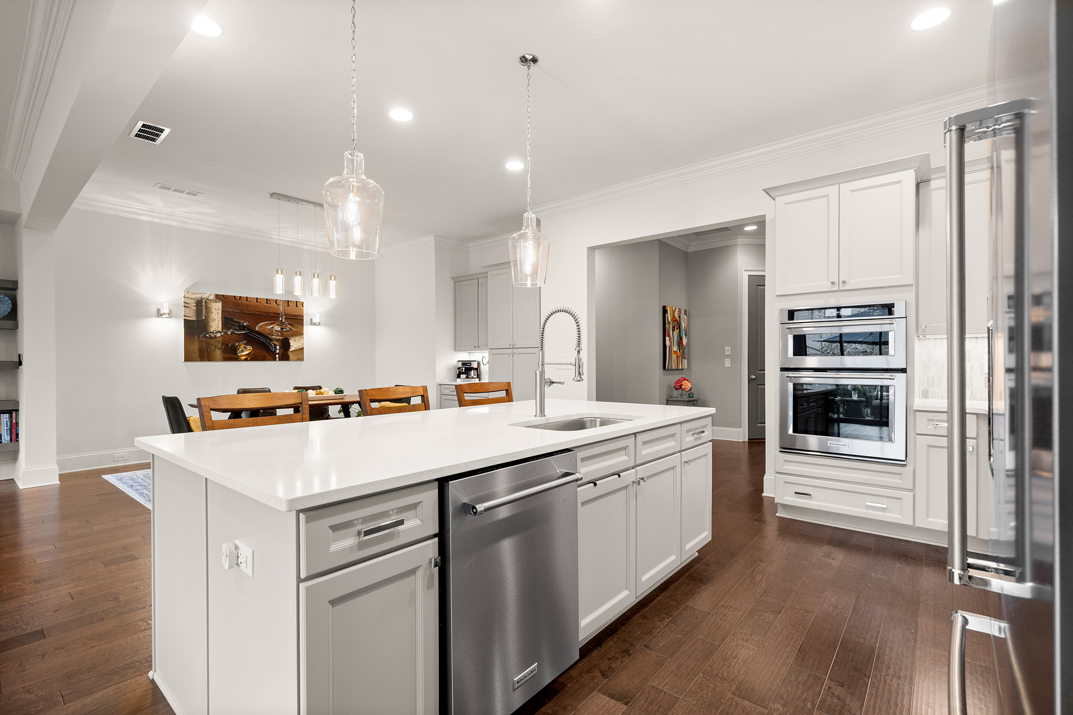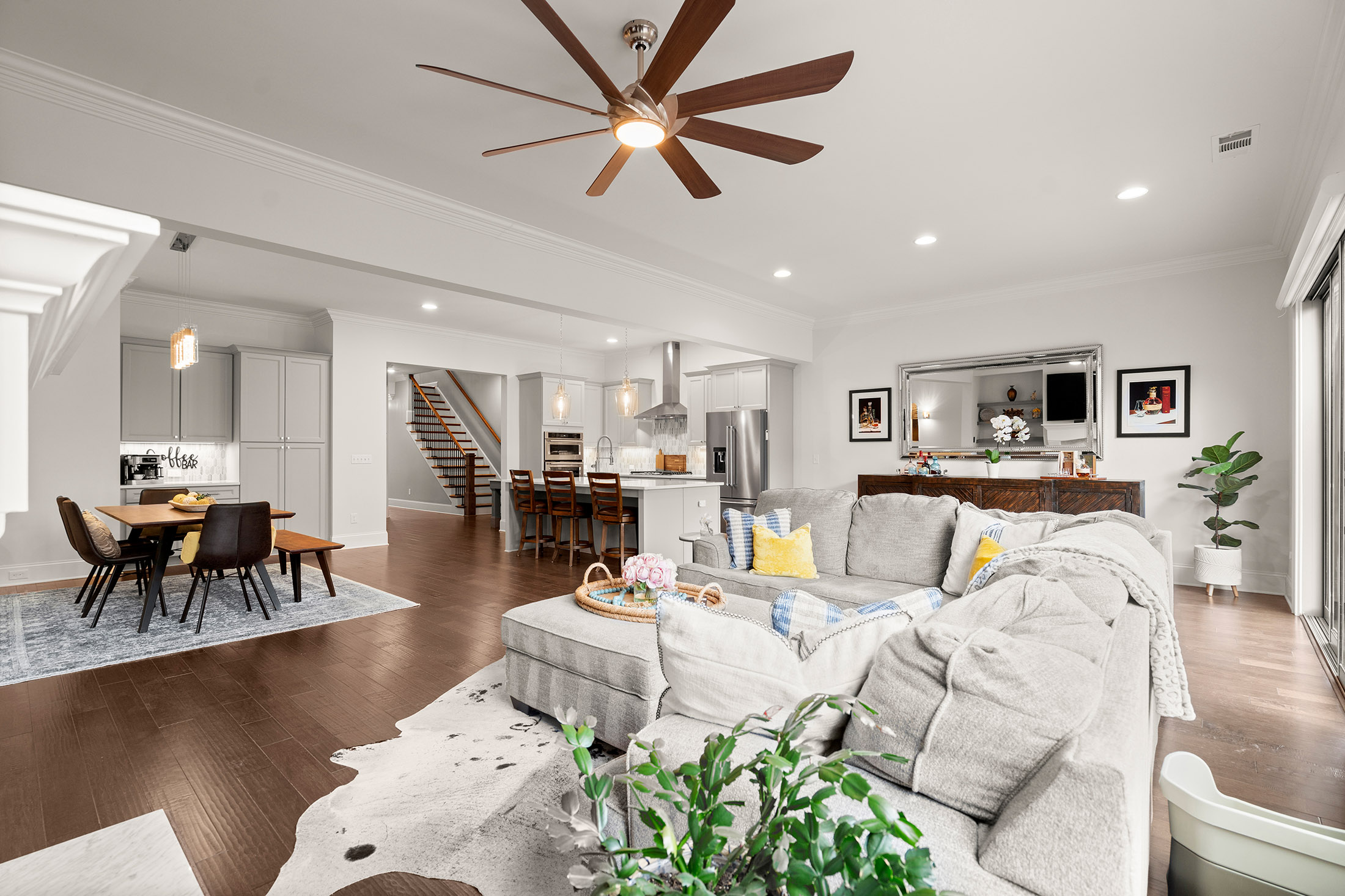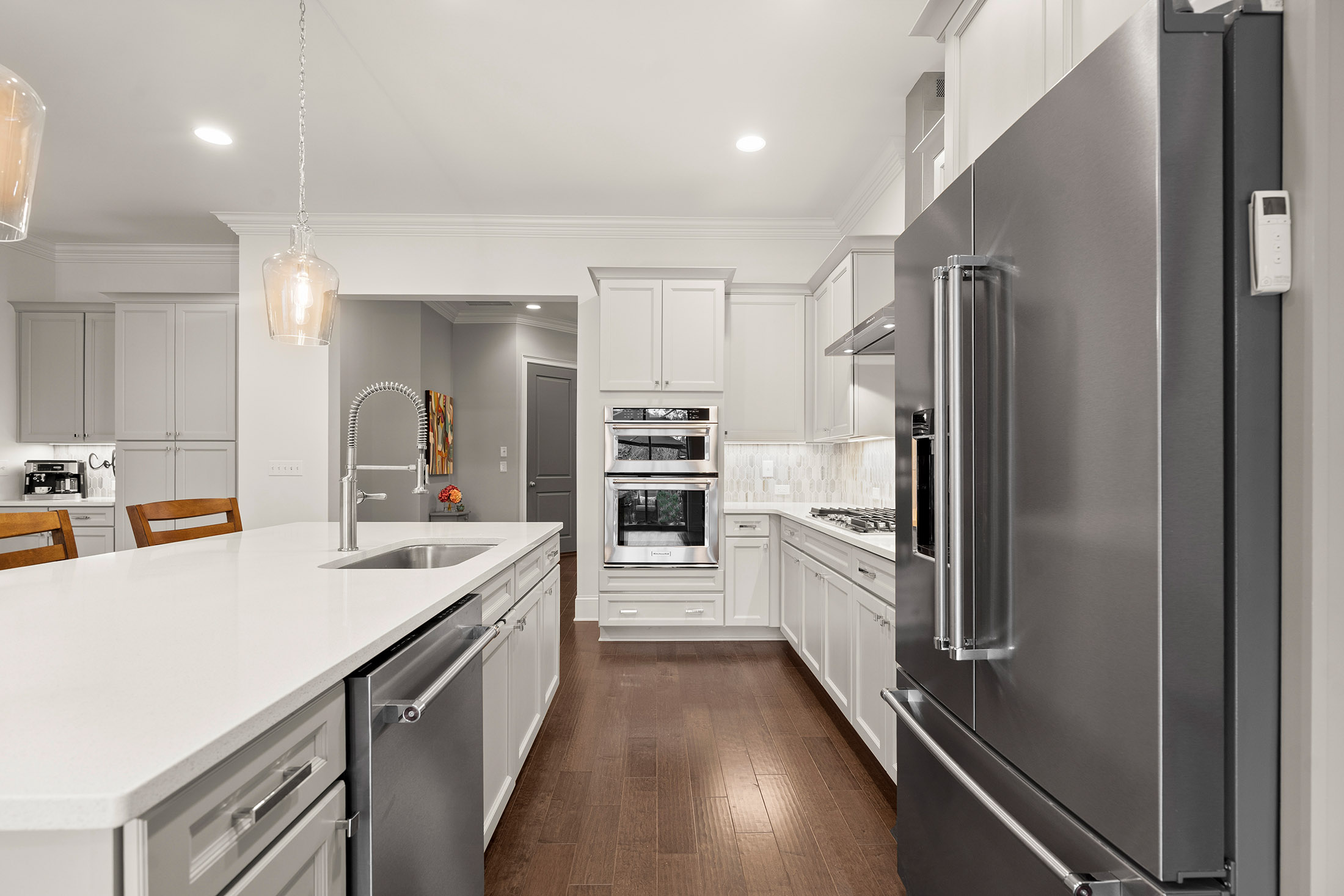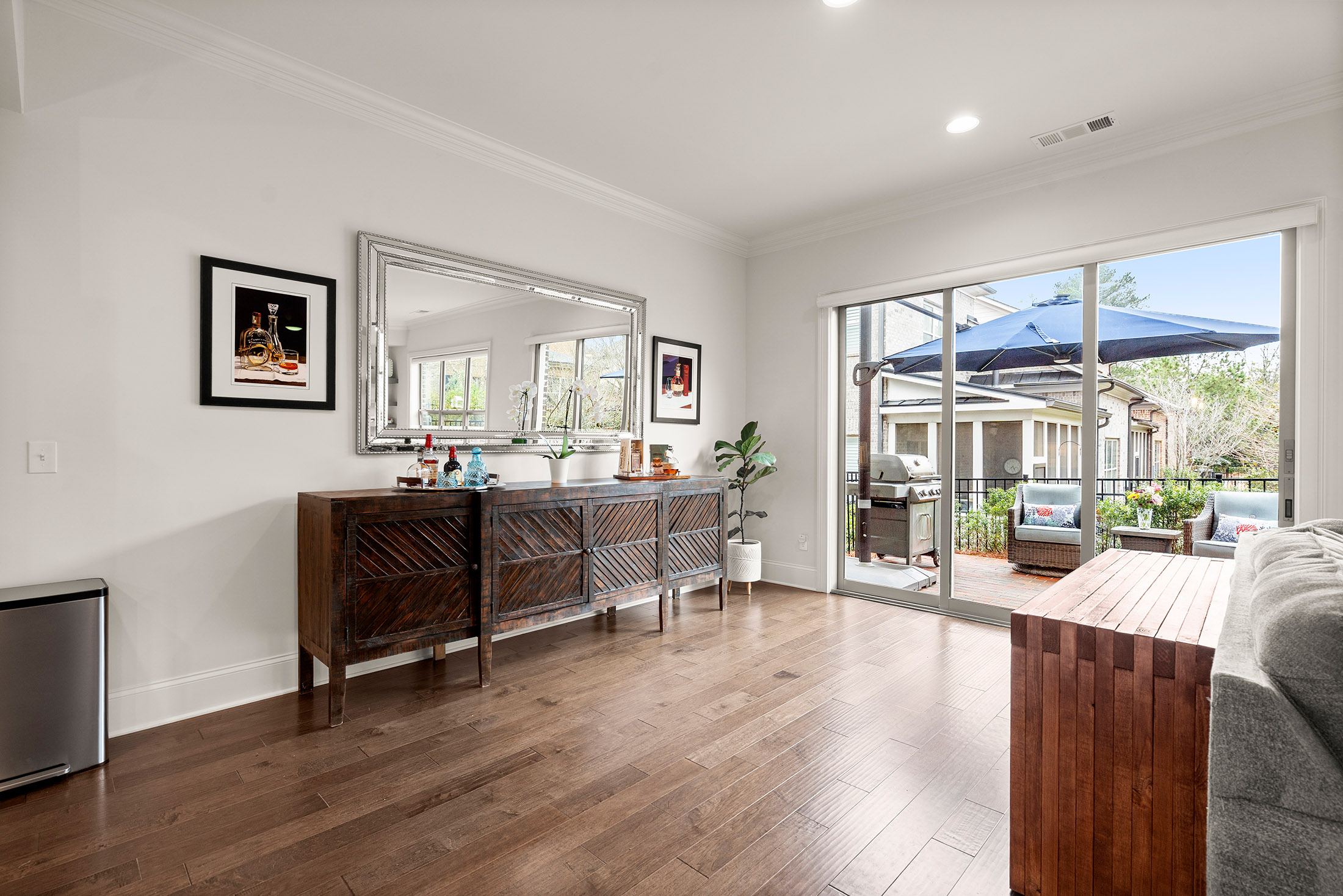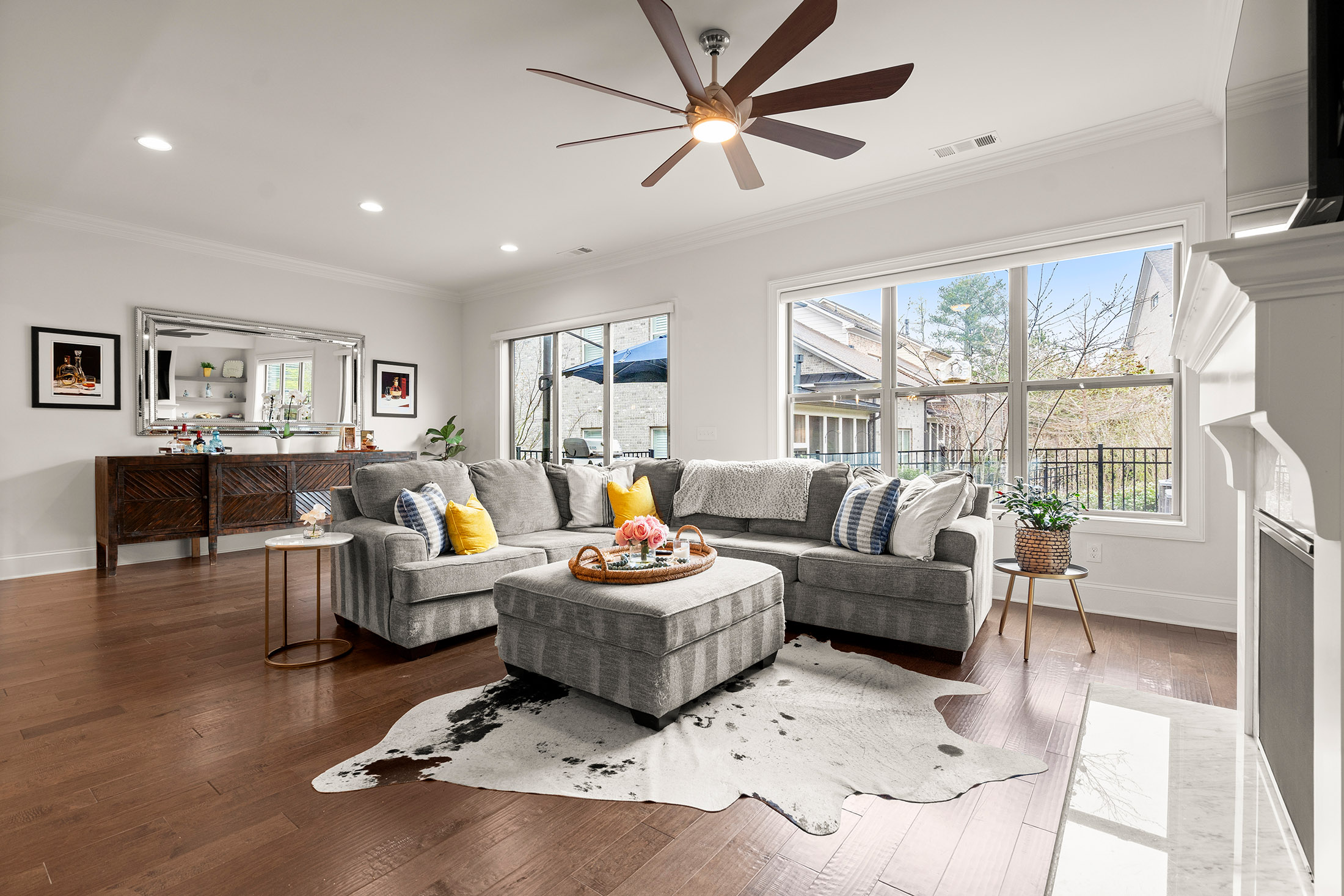 Enjoy refined living with minimal upkeep in this beautifully appointed townhome located in Duke Reserve, a private gated community known for its charming brick architecture. Situated in the heart of Peachtree Corners, the home offers easy access to The Forum, Peachtree Corners Town Center, highly rated schools, and major highways, making shopping, dining, and commuting effortless. Inside, soaring ten foot ceilings, rich hardwood floors, and abundant natural light create a bright and inviting atmosphere throughout the home. The chef’s kitchen is equipped with a full suite of high-end KitchenAid appliances and flows seamlessly into the main living space, ideal for both everyday living and entertaining. Thoughtfully designed upgrades include automated whole-home window treatments with full-width coverage for the three rear glass doors, the great room, and blackout shades in the primary suite. A newly installed high-efficiency whole-house attic fan, with dedicated controls on both the first and second floors, enhances comfort and energy efficiency. The home also features a true executive office with a devoted workspace, highlighted by a modern acoustic wood-slat accent wall that provides both sound dampening and sophisticated design. The garage is equally impressive, offering a professional-grade modular slatwall storage system designed for organized, high-capacity storage. Completing the appeal of this exceptional property, the HOA provides true low-maintenance living by covering the entire exterior of the home.