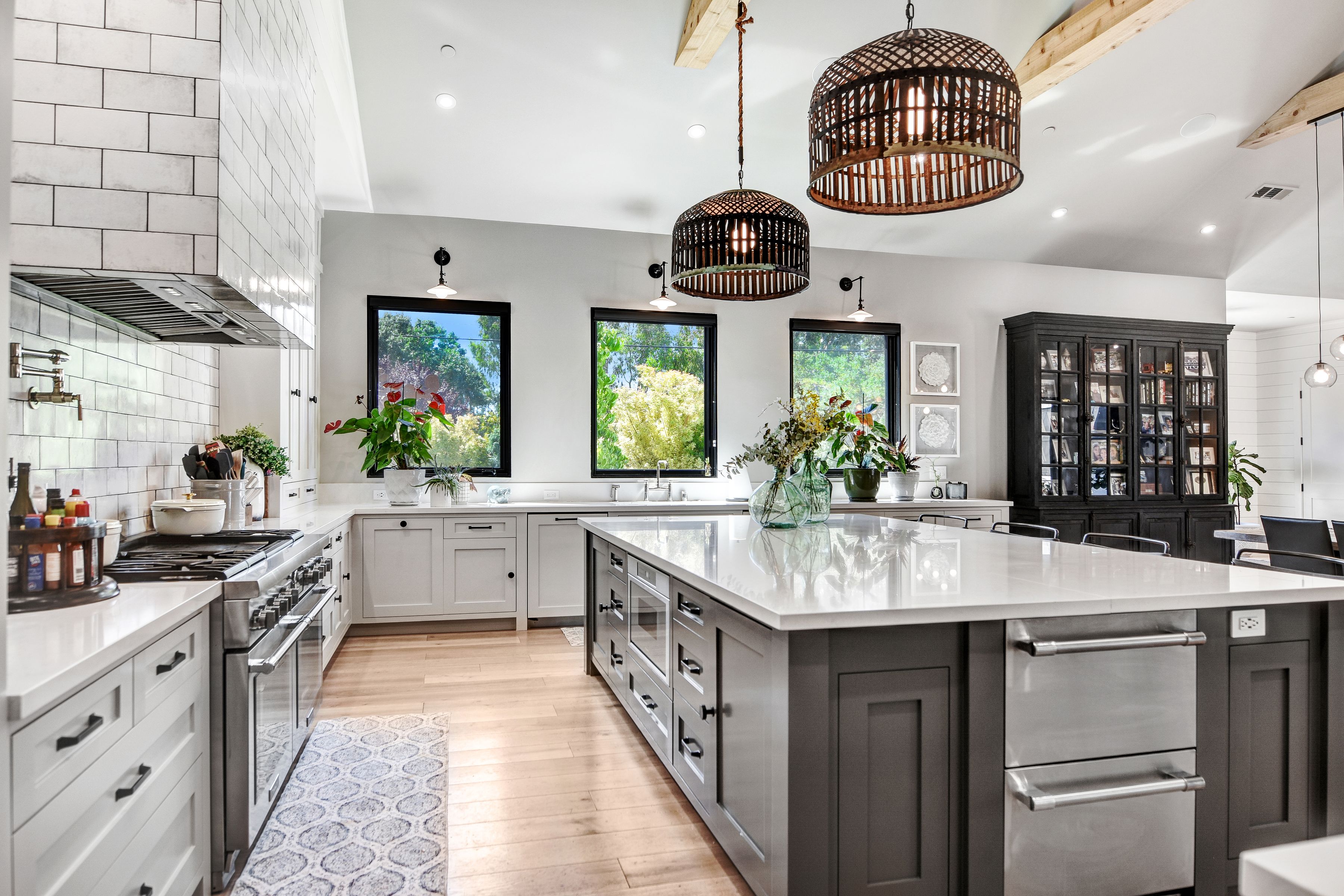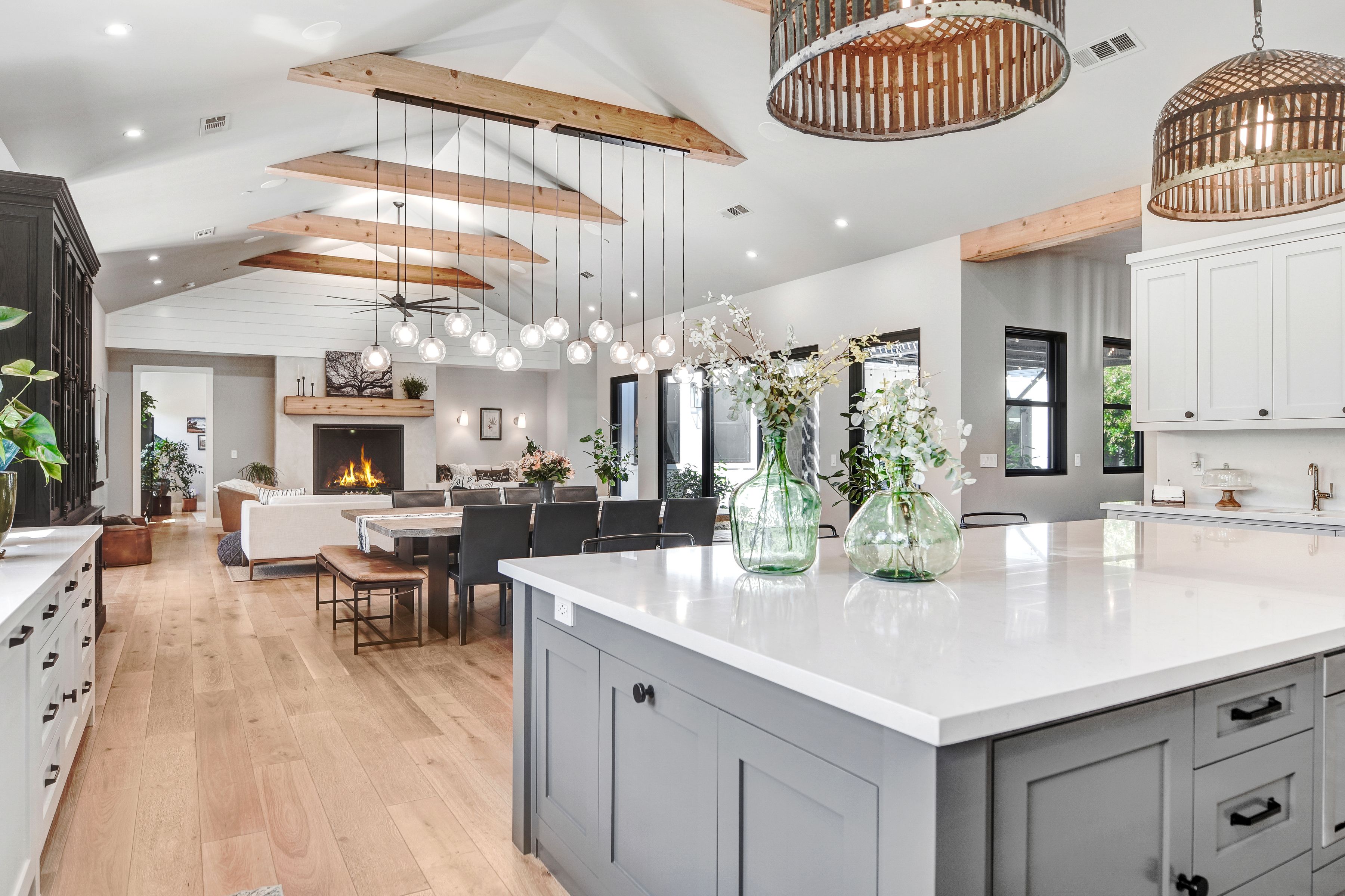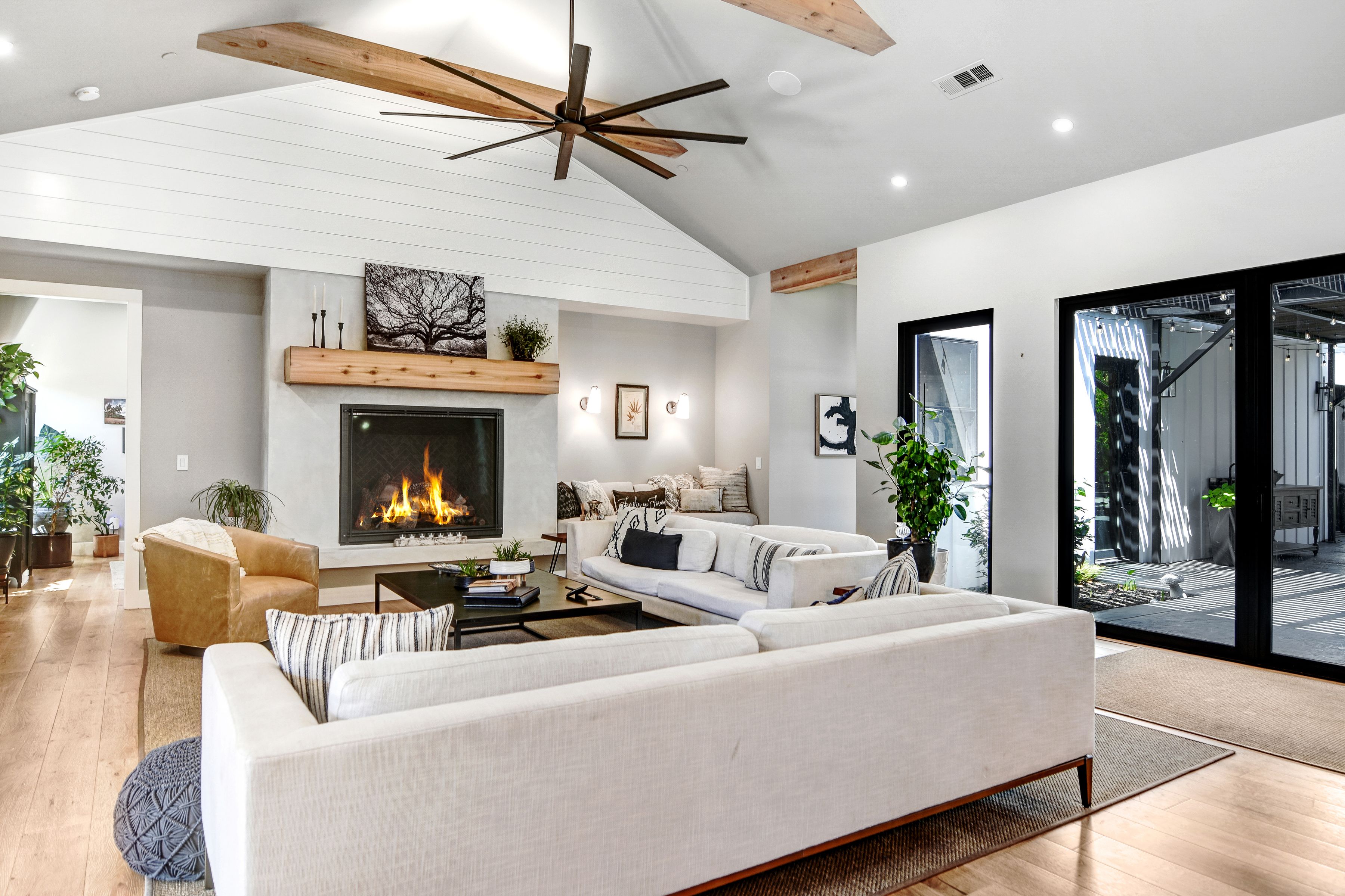 Modern Home & Pool, Detached ADU - all newer construction. Open Living, Kitchen & Dining Area flows to outdoor entertainment areas. Kitchen features custom painted cabinetry, Thermador appliances, 3' built in refrigerator, 2' built in freezer, quartz counters, clay fire sink and backsplash, dual dishwashers, 10' island with built in beverage refrigerator. 20' ceiling in great room with custom rough sawn beams & lighting. Custom features throughout, expansive primary suite/wing, guest wing, butlers pantry room, upstairs guest apartment adds a second great room, kitchen, hall bath, office and additional suite. Stunning Pool Party Area!