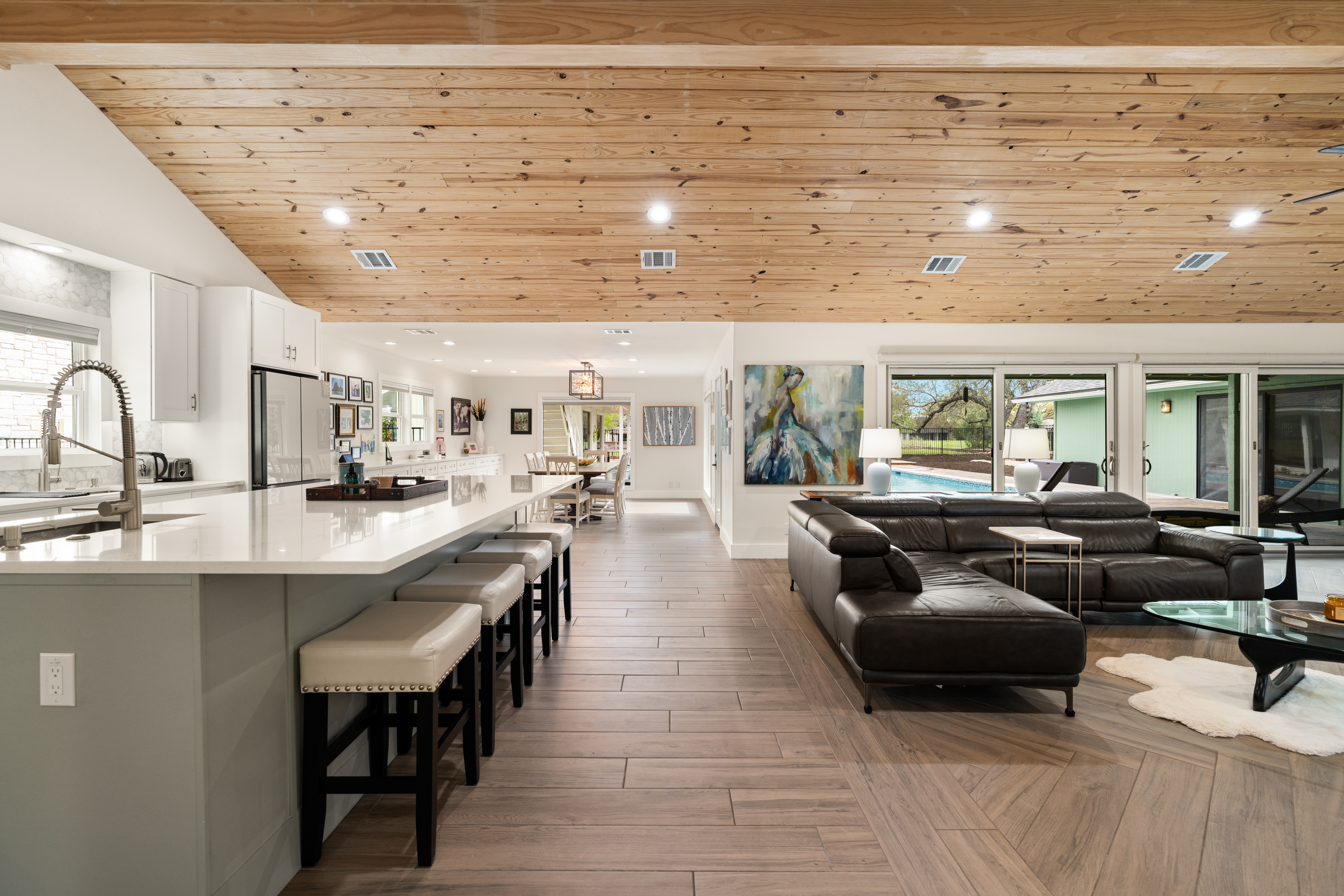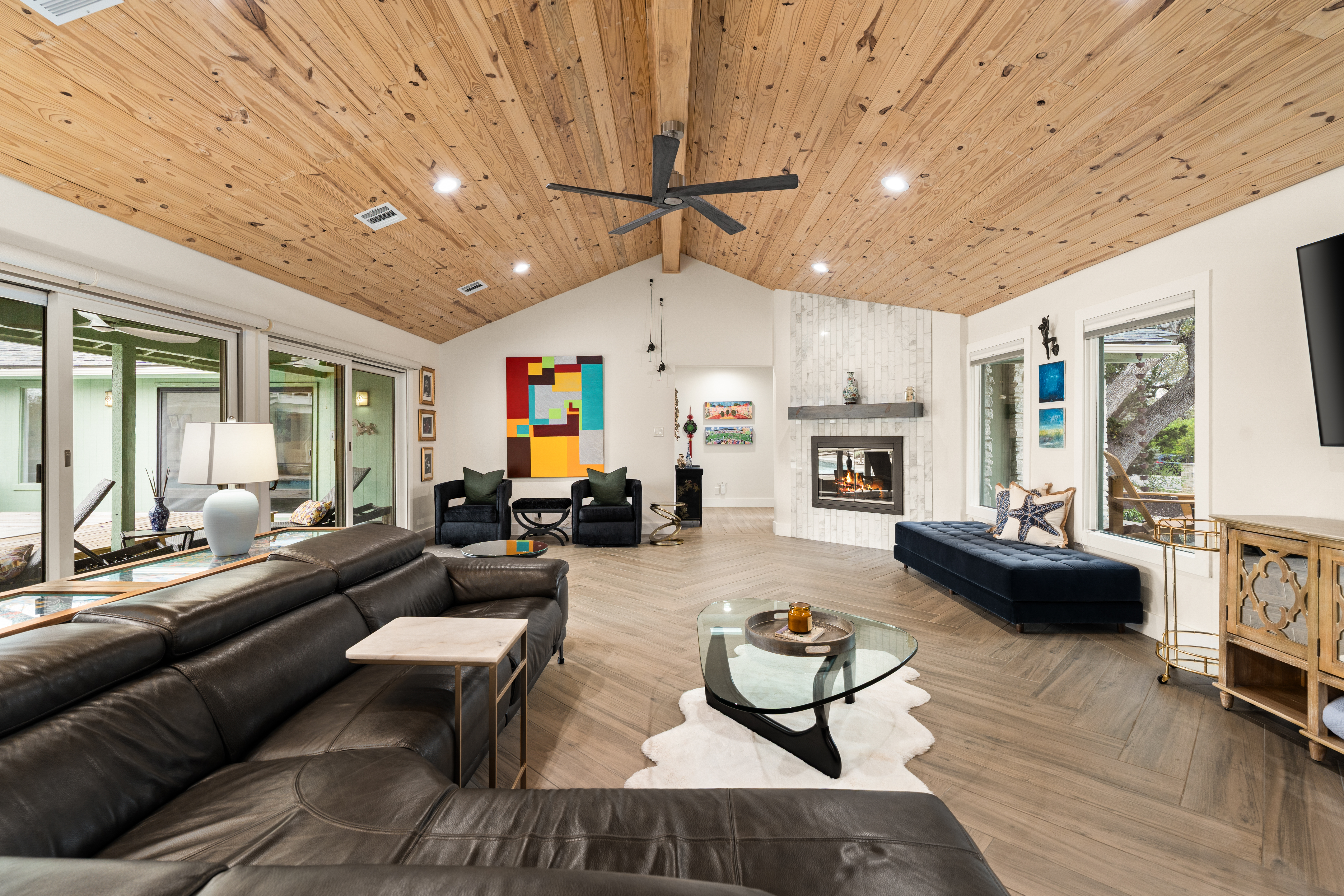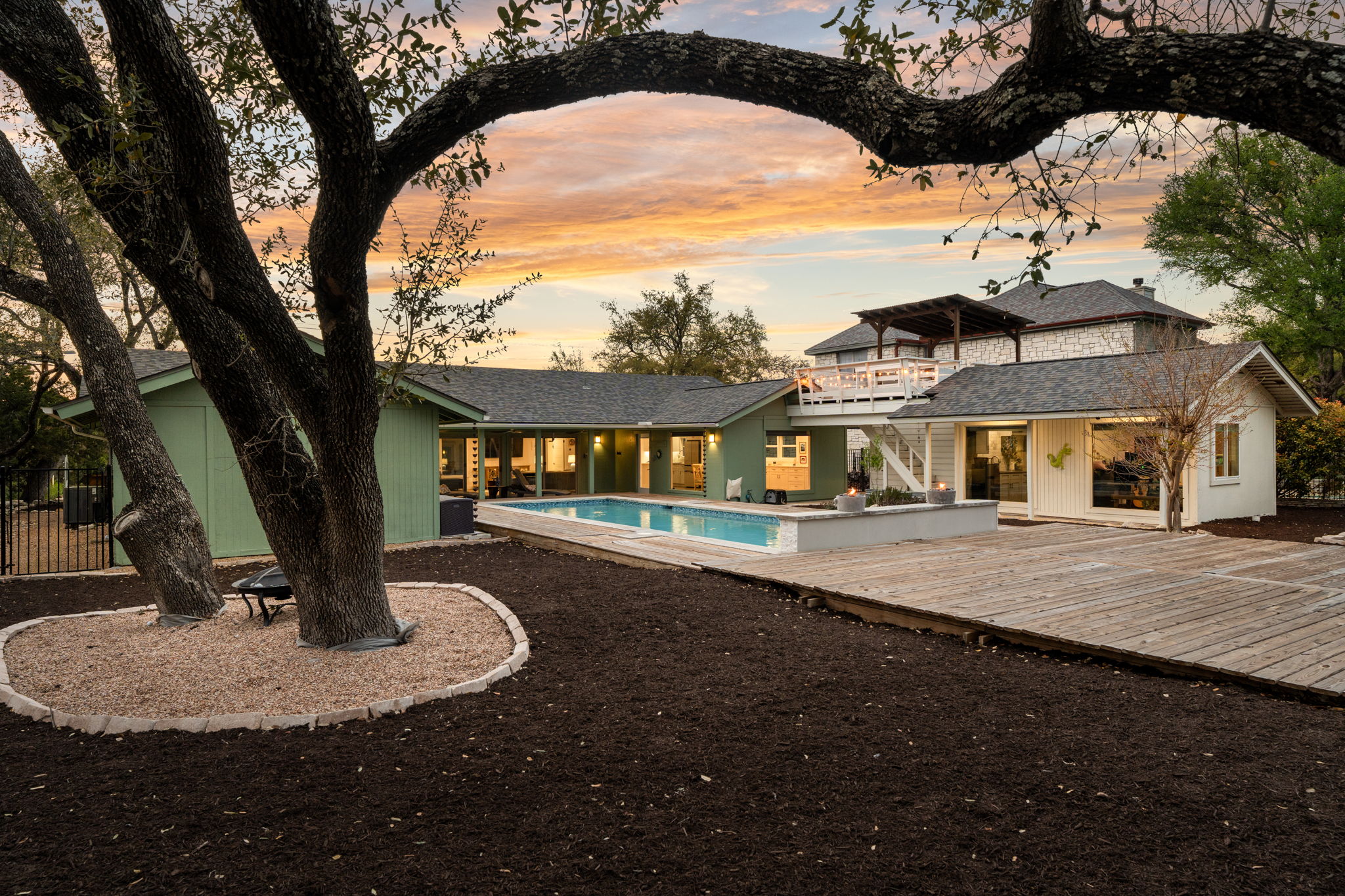 Welcome to 919 Biscayne Street, a stunningly reimagined single story home blending timeless Lakeway charm with modern luxury. Located in Lakeway and originally one of the community’s first 300 homes, this residence has been completely renovated with permits, from 2022 to 2025 while preserving its classic character. Ideally situated on the 16th hole of the Live Oak Golf Course and located within the award winning Lake Travis ISD, this property offers the perfect combination of location, lifestyle, and high end upgrades. A rare highlight is the fully independent cottage, adding an additional 337 square feet and complete with its own private entrance, kitchenette, full bathroom, laundry, dedicated HVAC, walk in closet, and a rooftop deck with sweeping golf course views. It is ideal for guests, multigenerational living, or income producing potential.The main home showcases an open concept design with vaulted wood ceilings, a designer kitchen featuring quartz countertops, custom cabinetry, premium Samsung appliances, and extensive system upgrades including a new roof (2024), HVAC, plumbing, electrical, tankless water heaters, windows, and smart home features. Step outside to your private retreat with a resort style saltwater pool, expansive wood deck, new landscaping, and architectural lighting, all backing directly to the golf course with a rare grandfathered retaining wall. This turnkey property delivers luxury, flexibility, and prime Lakeway golf course living all in one exceptional offering.