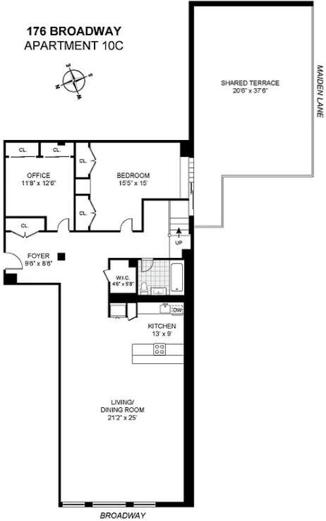<p> Thidz timeledzdz rrewar loft in the heart of FiDi offerdz slasdzic New York charm. Step onto original white oak floors in this nearly 1,600sqft loft co-op boasting 10 ft ceilings, and an 800sqft terrace facing Maiden Lane. Freshly painted and move-in ready, this turn-key unit features a renovated kitchen and bathroom. The unit's three large windows overlook Broadway, showcasing a new kitchen with quartz countertops and stainless-steel appliances. The space includes one full bathroom, a bedroom, and a spacious den/office currently utilized as a second bedroom. The walk-in closet is prepped for a second full bathroom. Situated on the 10th floor, this residence is bathed in natural light from multiple windows, complemented by an open floor plan. Take control of the centralized air conditioning system and enjoy ample storage with numerous closets and upper cabinets. Located at 176 Broadway, this green and pet-friendly building offers a part-time doorman and live-in super. Enjoy the convenience of a laundry room on every floor and find tranquility on the landscaped 3,500sqft rooftop deck. Explore the vibrant Financial District with high-end shopping, historical sites, and local food courts. Whole Foods is just 4 blocks away (Broadway & Wall Street). Manhattan transportation is a breeze with PATH, A, C, E, 1, 2, 3, 4, 5, J, Z, R, and W lines at Fulton Center, one block away, and three blocks to the WTC.</p>