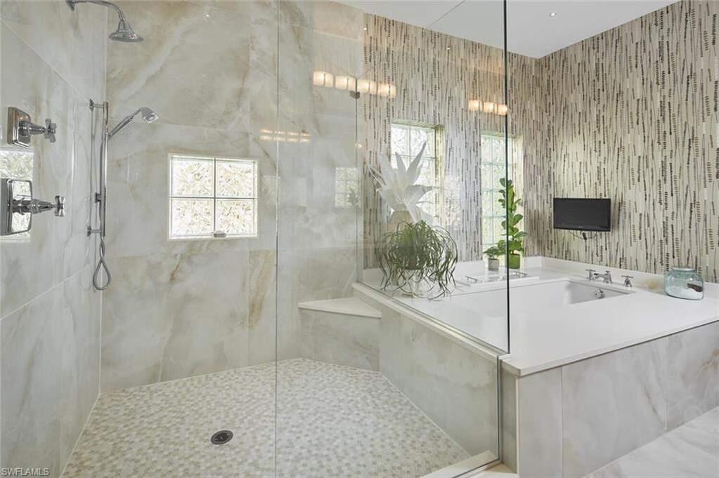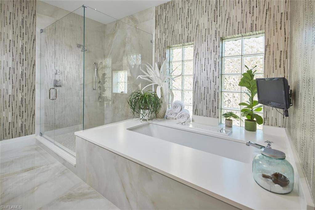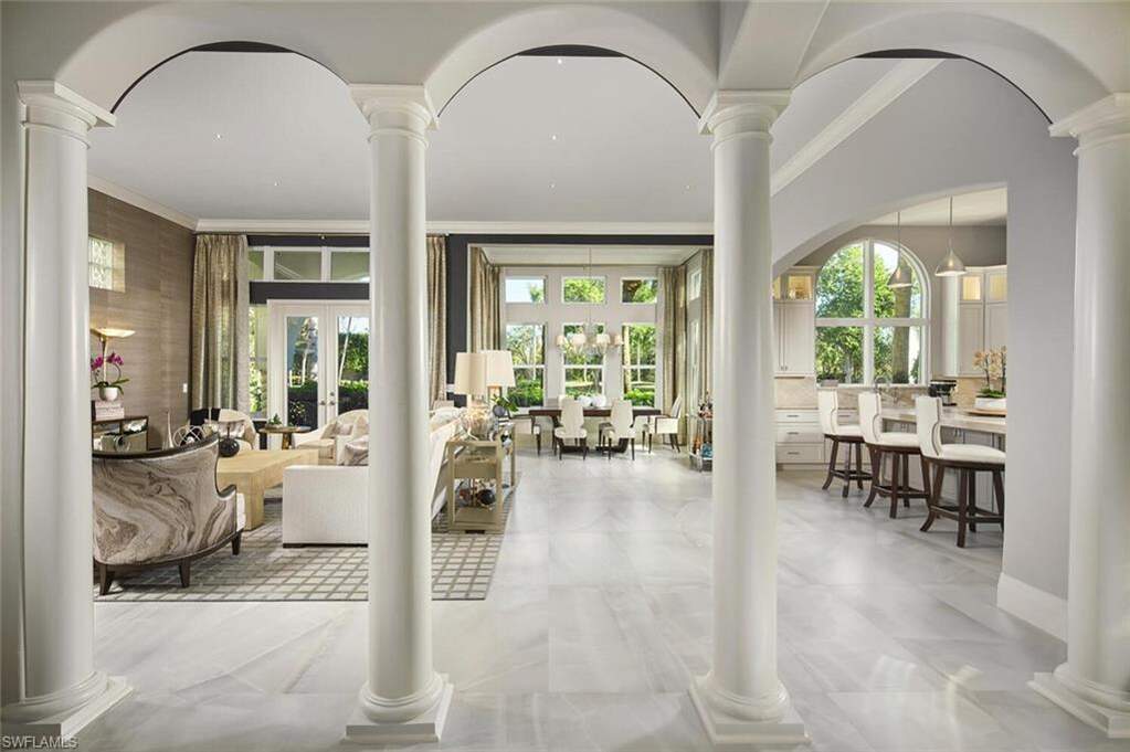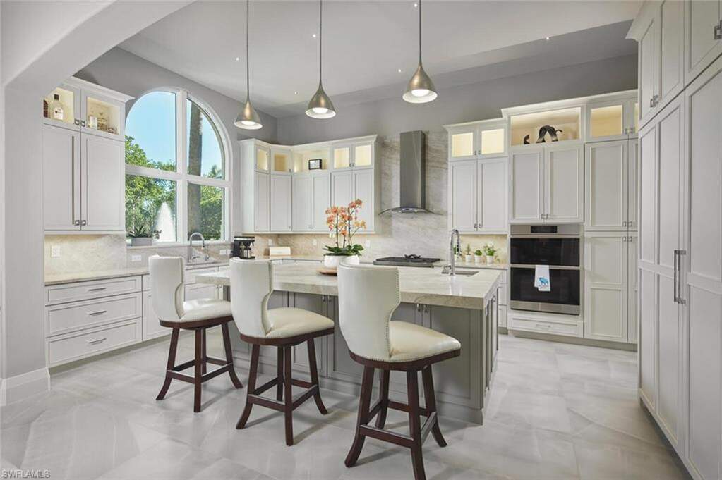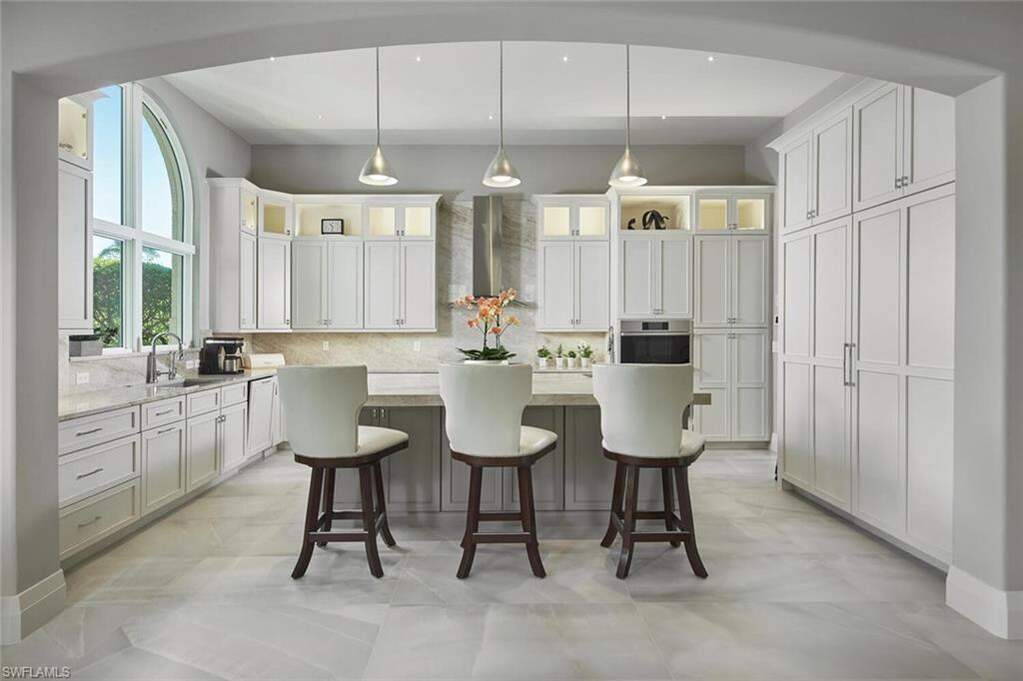 This exquisitely curated 4-bedroom, 4.5-bathroom completely remodeled home in the heart of The Colony offers a masterclass in coastal elegance and architectural sophistication. From the moment you enter, the home captivates with an airy, open-concept design defined by soaring 14'ceilings, floor-to-ceiling windows, and refined finishes that invite the lush Florida landscape inside. Designed for those who refuse to compromise on style or substance, this residence isn't just a home, it's a sanctuary where every designer detail has already been perfected.The grand living area serves as the centerpiece of the home, featuring designer wall treatments and a seamless flow into the dining space, perfect for hosting intimate dinners or large-scale gatherings. Natural light pours through expansive glass doors, highlighting the large scale tile flooring that runs throughout the main living areas. The dream kitchen is a culinary masterpiece, centered around a massive waterfall island and framed by a majestic arched entryway. High-end features include custom white shaker cabinetry with integrated lighting, premium stainless steel appliances and a professional-grade vent hood and a picturesque arched window overlooking the tropical grounds. The primary wing is a private retreat defined by understated elegance. Wake up to serene views through expansive windows, or step directly onto the master terrace to enjoy the morning breeze. The spa-like master bath is a sanctuary of its own, featuring dual floating vanities with sleek hardware, deep soaking tub and a massive frameless glass rain shower and bespoke wall coverings and striking fixtures. Step outside into your abundant private veranda. The outdoor space features a custom stone waterfall fountain that cascades into a heated spa and pool. Overlooking a serene lake with a central fountain, the primary terrace and patio areas provide the perfect backdrop for evening cocktails and sunset views. Exceptional Details include architectural arches and high ceilings that enhance the sense of volume. Lush tropical landscaping surrounding the property for maximum privacy, private elevator, new hurricane impact windows and doors and new roof in 2025. Why wait months for renovation when perfection is ready right now? This captivating estate is offered fully realized and move-in ready, allowing you to bypass the process and proceed straight to the lifestyle you've earned. Living at The Colony includes private membership to The Bay Club,formal and informal dining and events. Access to a PRIVATE BEACH PARK, a huge tennis program, canoeing/kayaking, sailing club, bocce &pickleball, the list goes on! Elective private golf options. The Colony is a quick jaunt to the airport and just a mile and a half to great dining and shopping.