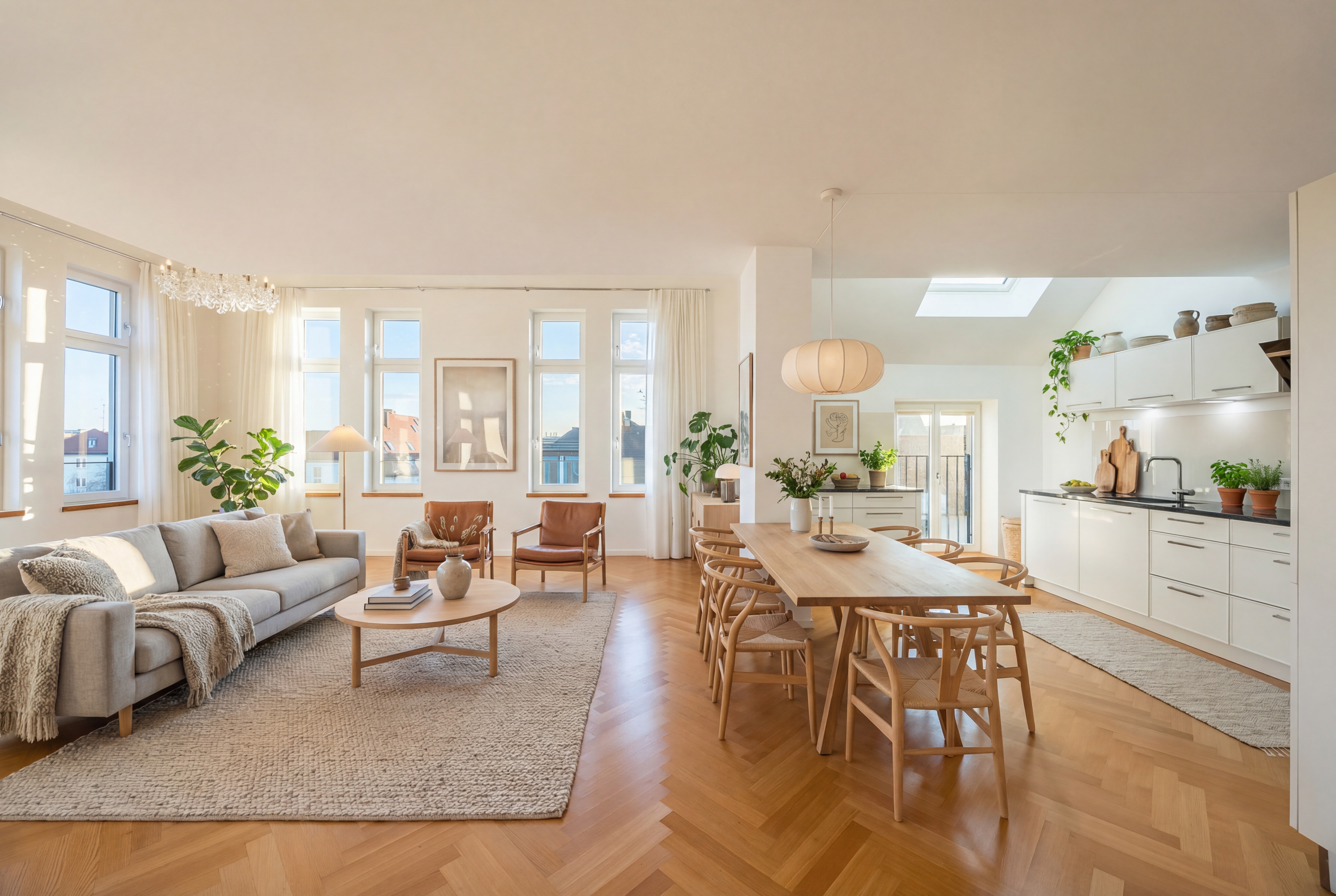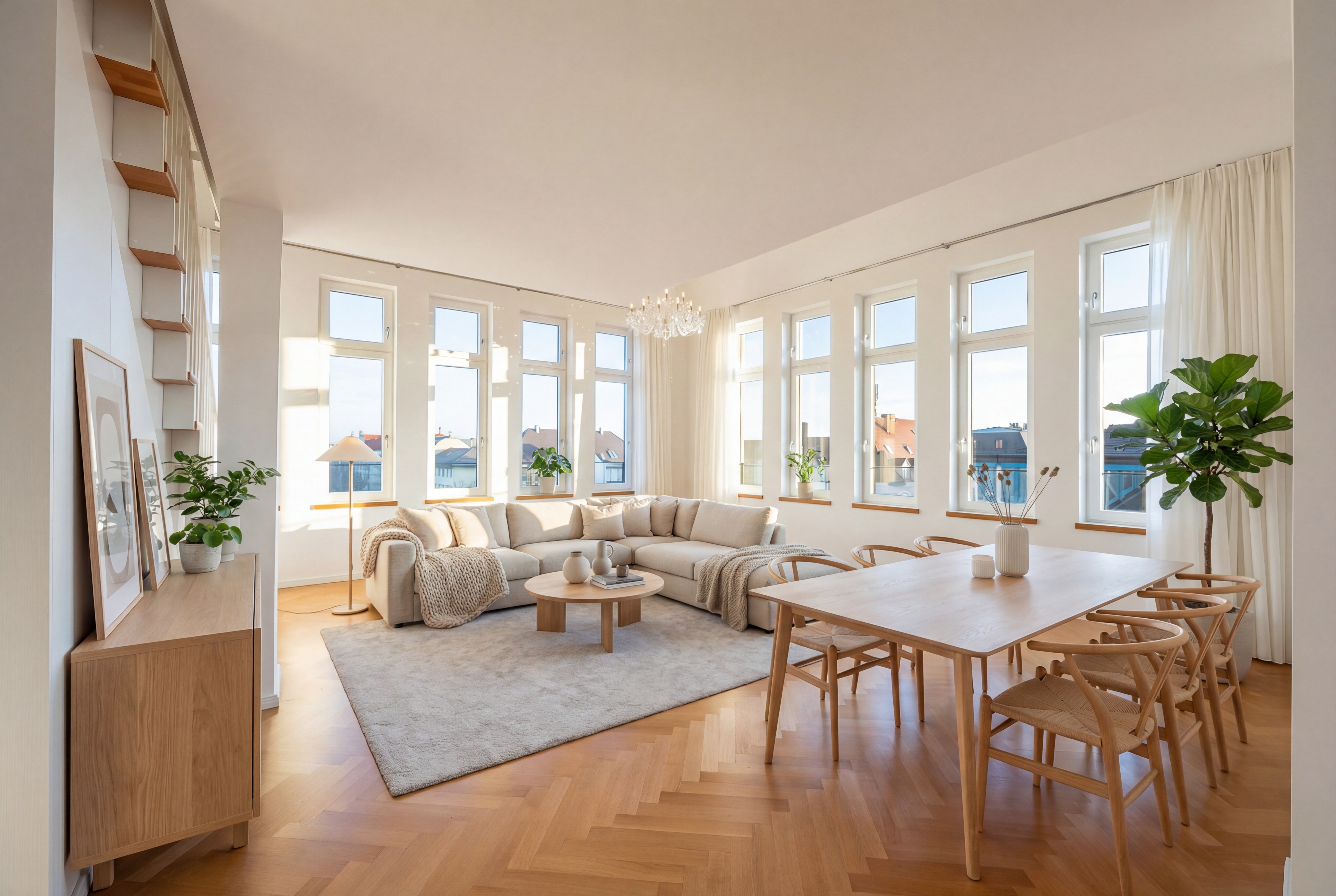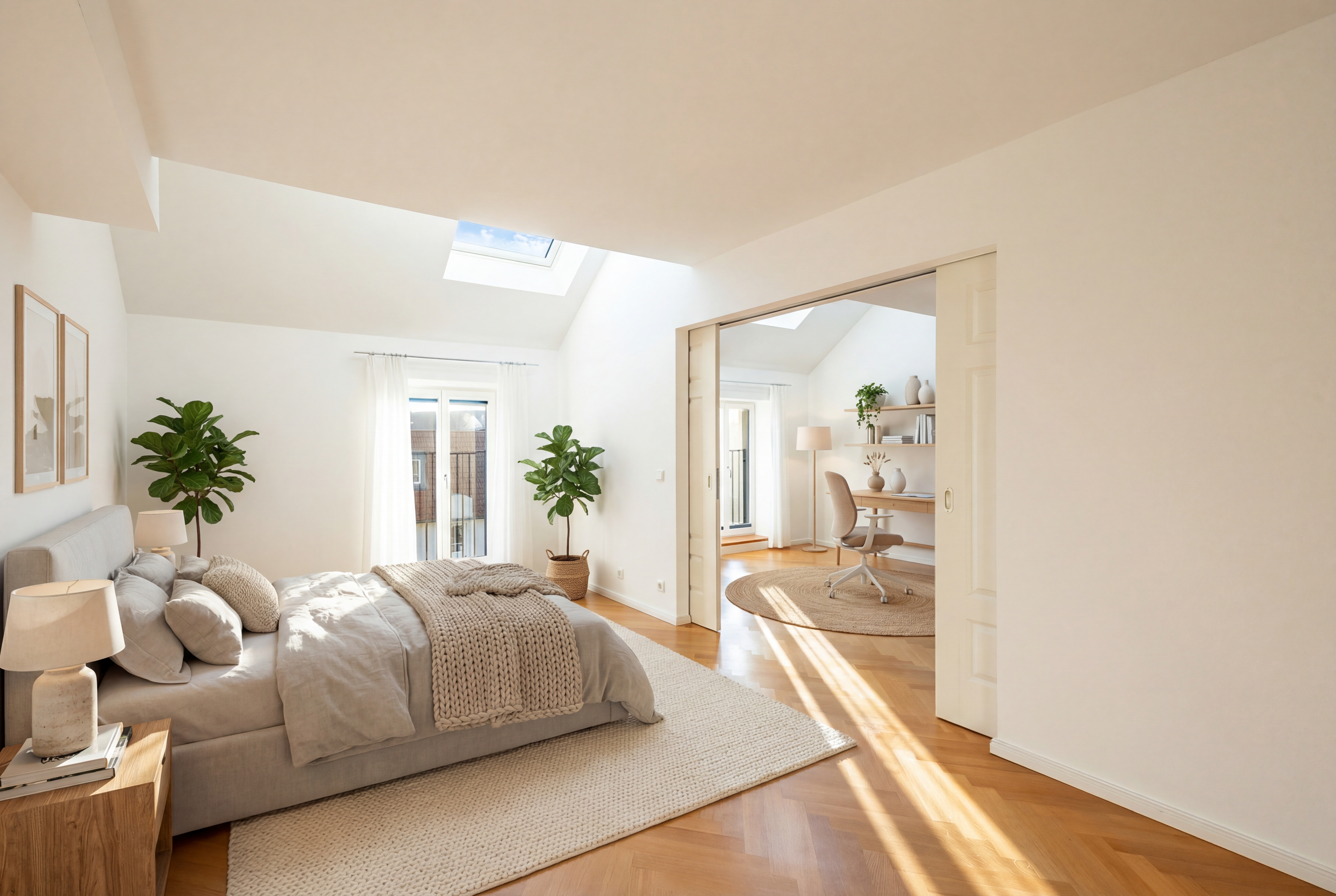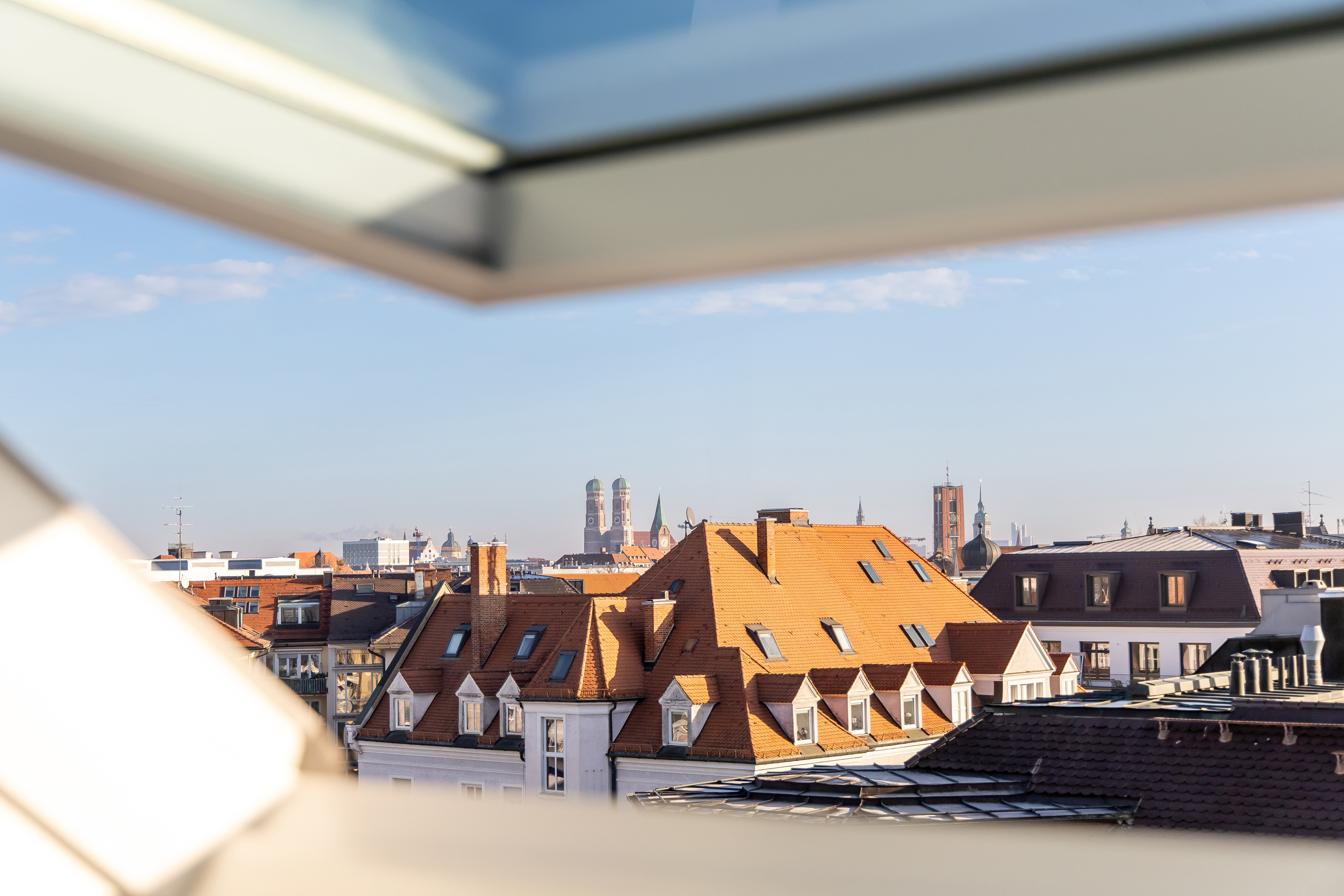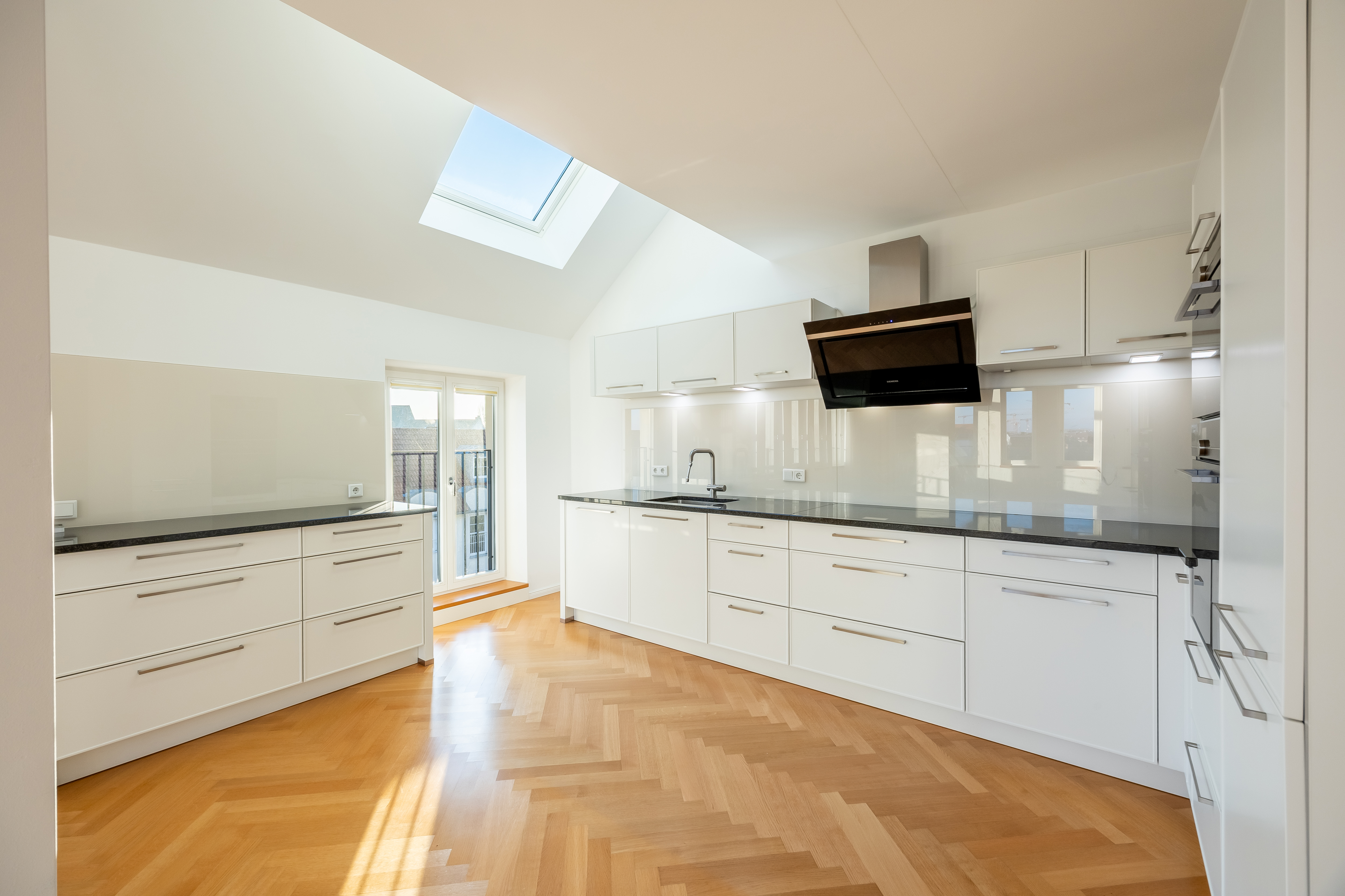 In the middle of it all and high above it all: this beautiful apartment is located on the top floor of a listed old building from 1891, which has a special presence thanks to its neo-renaissance façade and its location as a corner building. The light-filled rooms were created in their current form in 2018. The ideal and family-friendly floor plan is particularly noteworthy. The 4th floor accommodates living, dining, cooking, three bedrooms and two bathrooms. On the gallery floor, there is a flexibly usable gallery, two further rooms and a third bathroom. A highlight is the quiet roof terrace facing the inner courtyard, which offers a wide panoramic view and is a wonderful outdoor retreat in this urban environment.Features include herringbone parquet flooring with underfloor heating, a white branded fitted kitchen with Siemens appliances, white coffered doors, fitted wardrobes and a timeless, high-quality bathroom design. Large reclining windows allow an enormous amount of light into the rooms, even on cloudy days. The apartment is completed by its own parking space in the courtyard and a spacious cellar room. The result is a highly attractive home in the heart of Ludwigvorstadt, just a few steps from Kaiser-Ludwig-Platz and Theresienwiese.