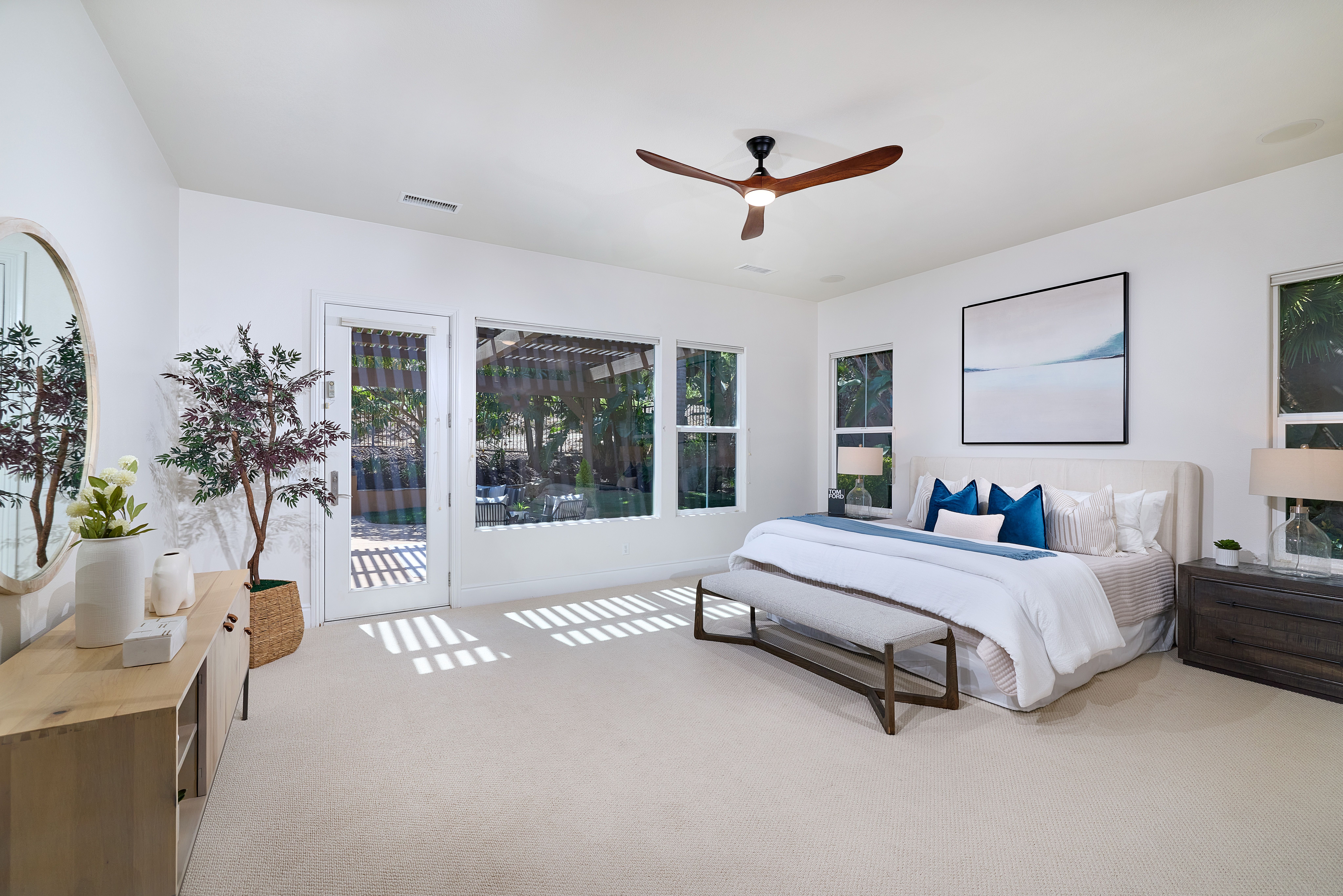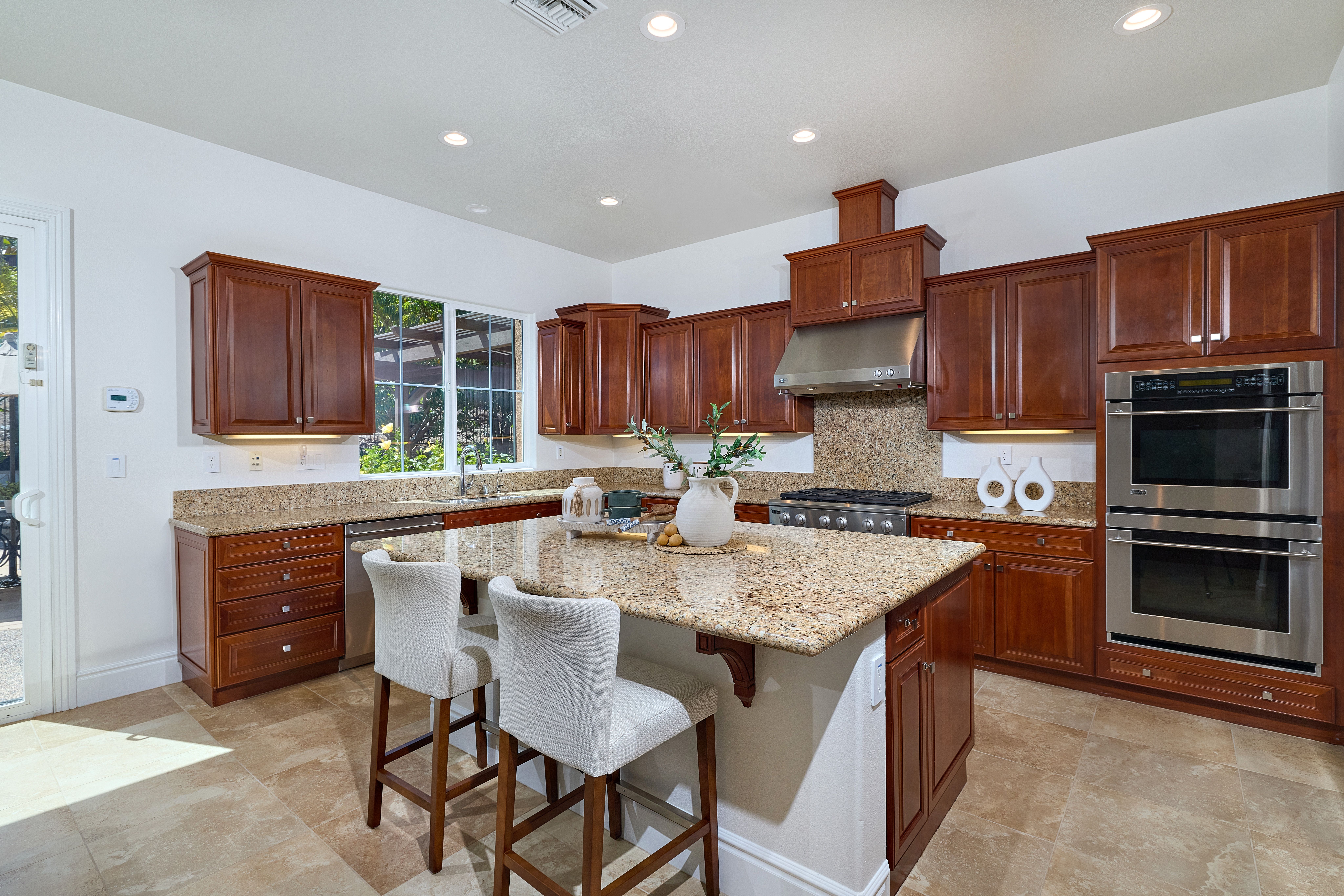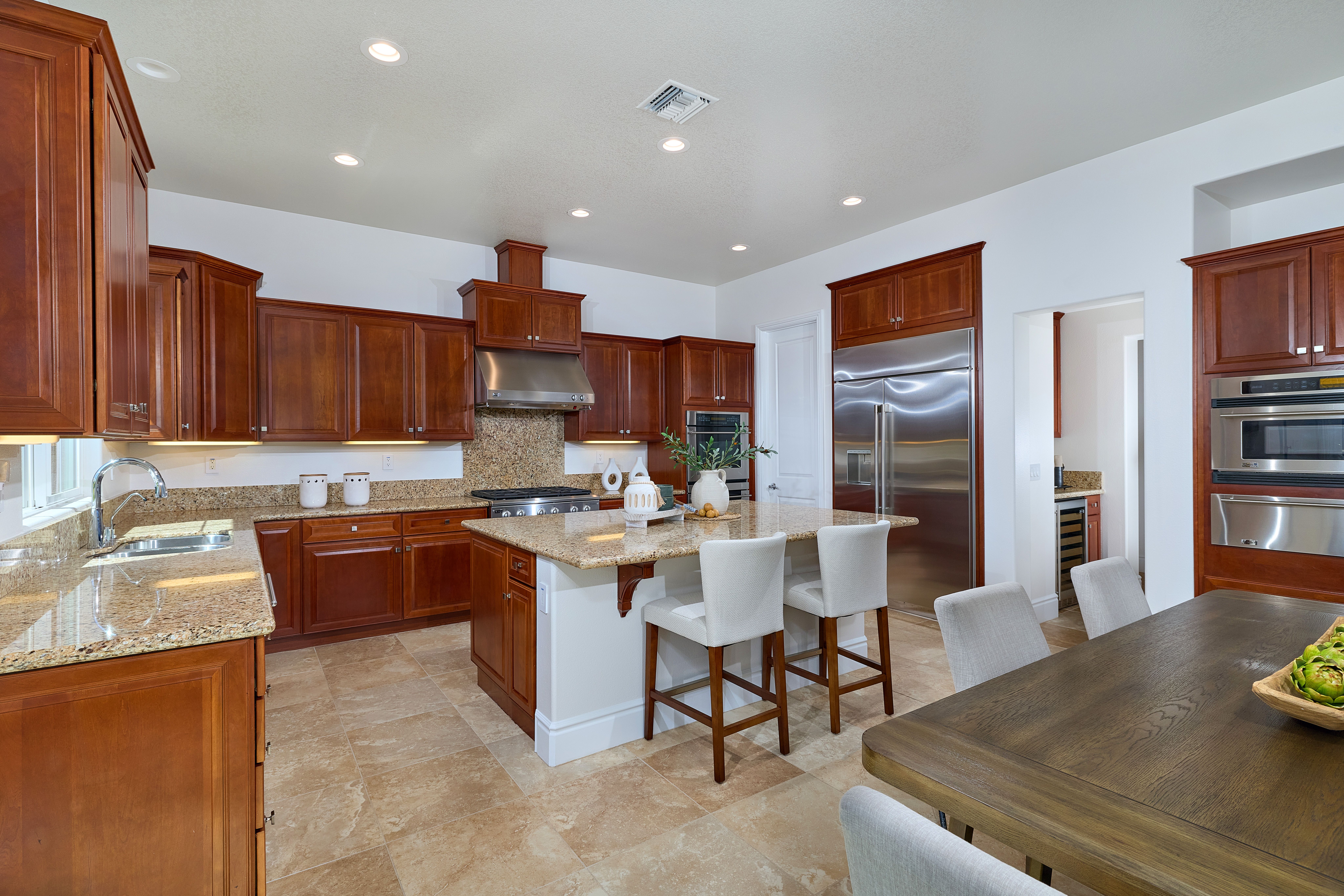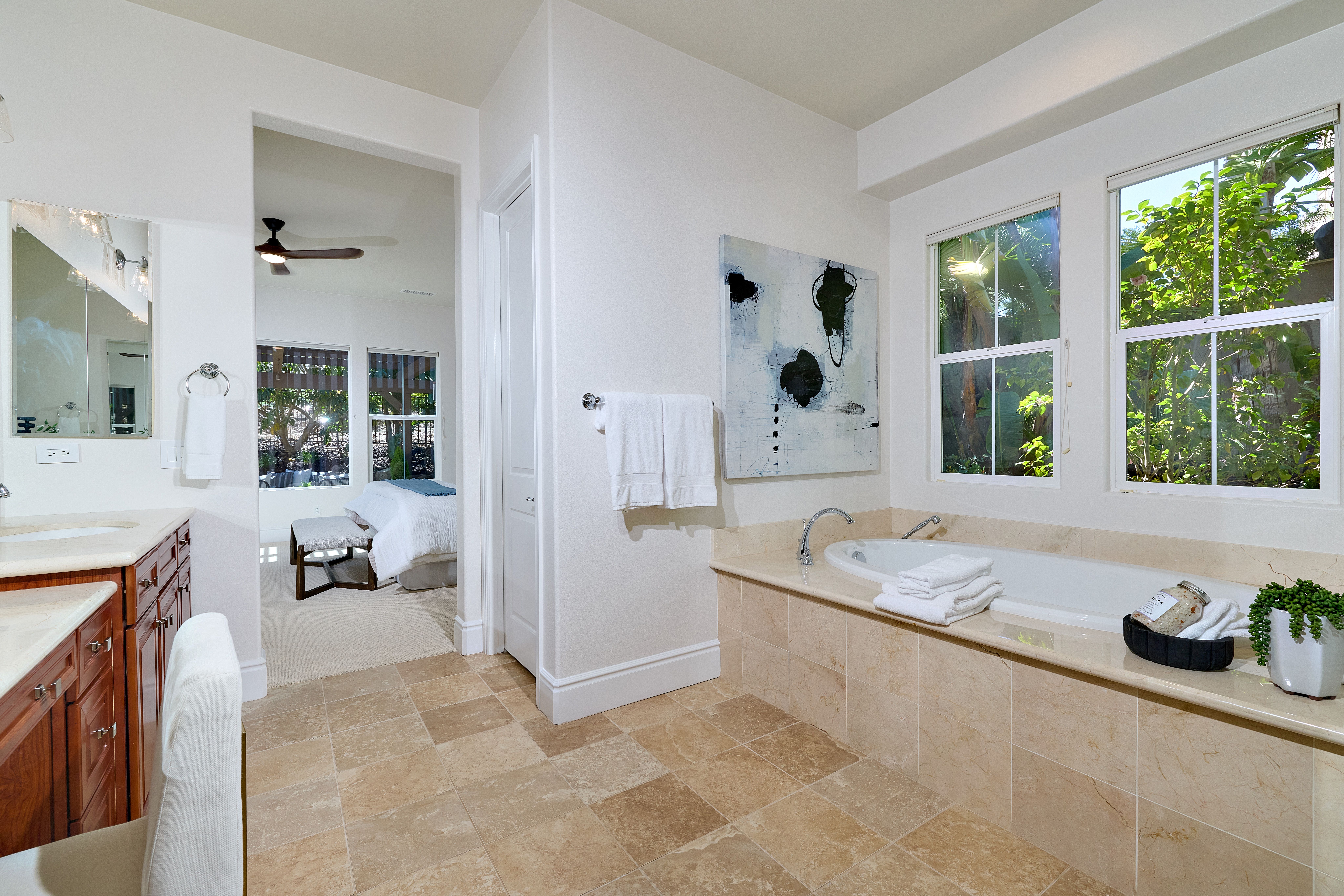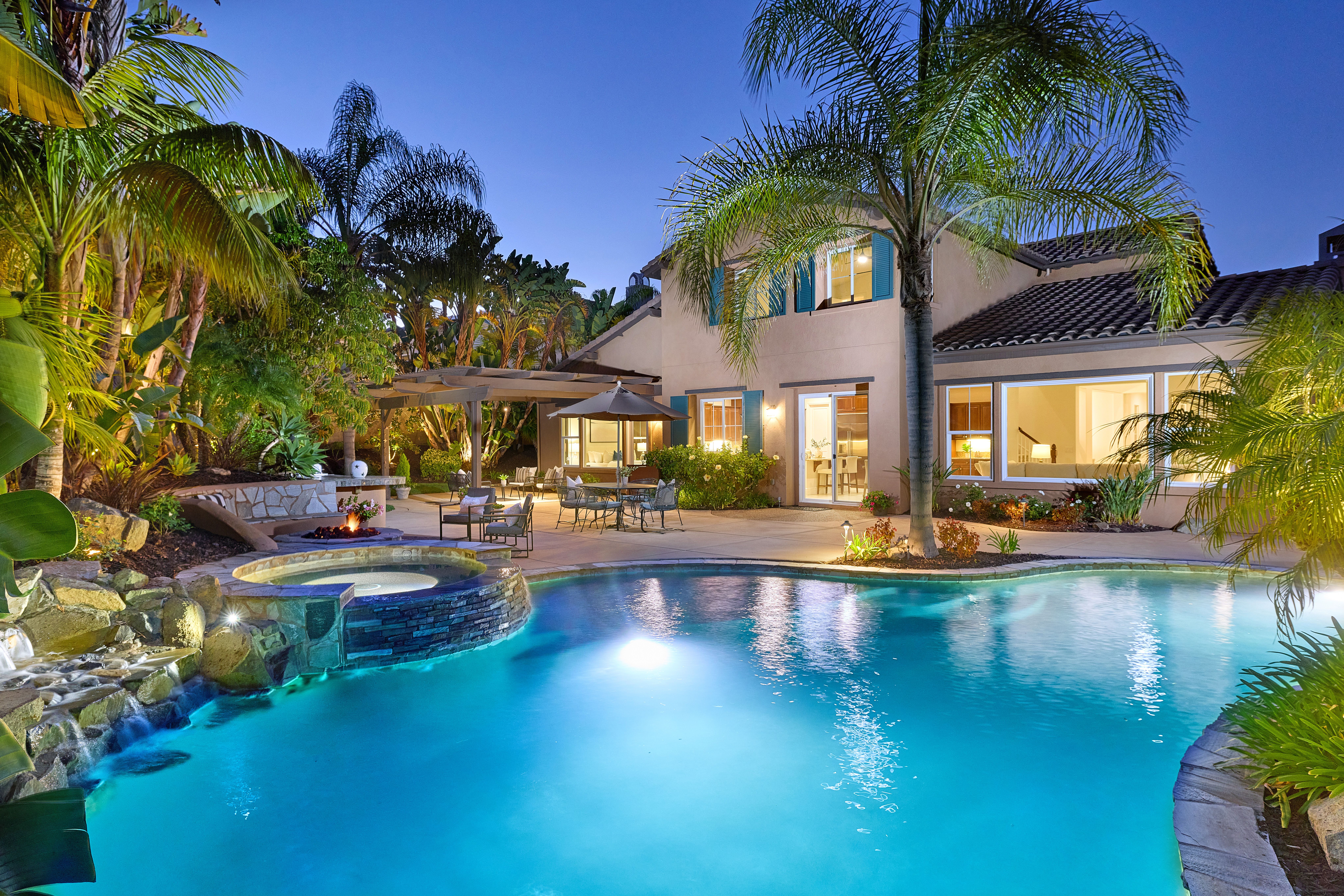 1st Floor Primary | View | Pool/Spa - Offered for the first time ever, this exceptional residence is a rare opportunity in the prestigious, gated La Costa Ridge community. Lovingly maintained by its original owner for 18 years, the home is ideally positioned at the end of a quiet cul-de-sac, offering privacy, tranquility, and an elevated sense of exclusivity. Set on an expansive 13,385 sq. ft. private lot, the property unfolds as a true tropical oasis. A stunning glass rear wall frames gorgeous mountain views to the east, seamlessly blending indoor and outdoor living while filling the home with natural light. Thoughtfully designed, the floor plan features four bedrooms plus a spacious loft/bonus room. The main level includes a luxurious primary suite along with a secondary ensuite bedroom—perfect for guests or multigenerational living. Freshly painted interiors and brand-new carpeting provide a crisp, move-in-ready feel. At the heart of the home, the chef’s kitchen is both functional and inviting, complete with a walk-in pantry, center prep island, and breakfast bar that opens to the main living spaces. Step outside to a resort-inspired backyard designed for both relaxation and entertaining. Enjoy the Pebble Tec pool and spa, built-in BBQ island with bar seating, and a cozy firepit—all surrounded by lush tropical landscaping. Additional highlights include custom wood-tone garage doors and a charming private entry courtyard accessed through an elegant iron gate. A rare offering combining location, lifestyle, and timeless appeal—this is Southern California living at its finest.