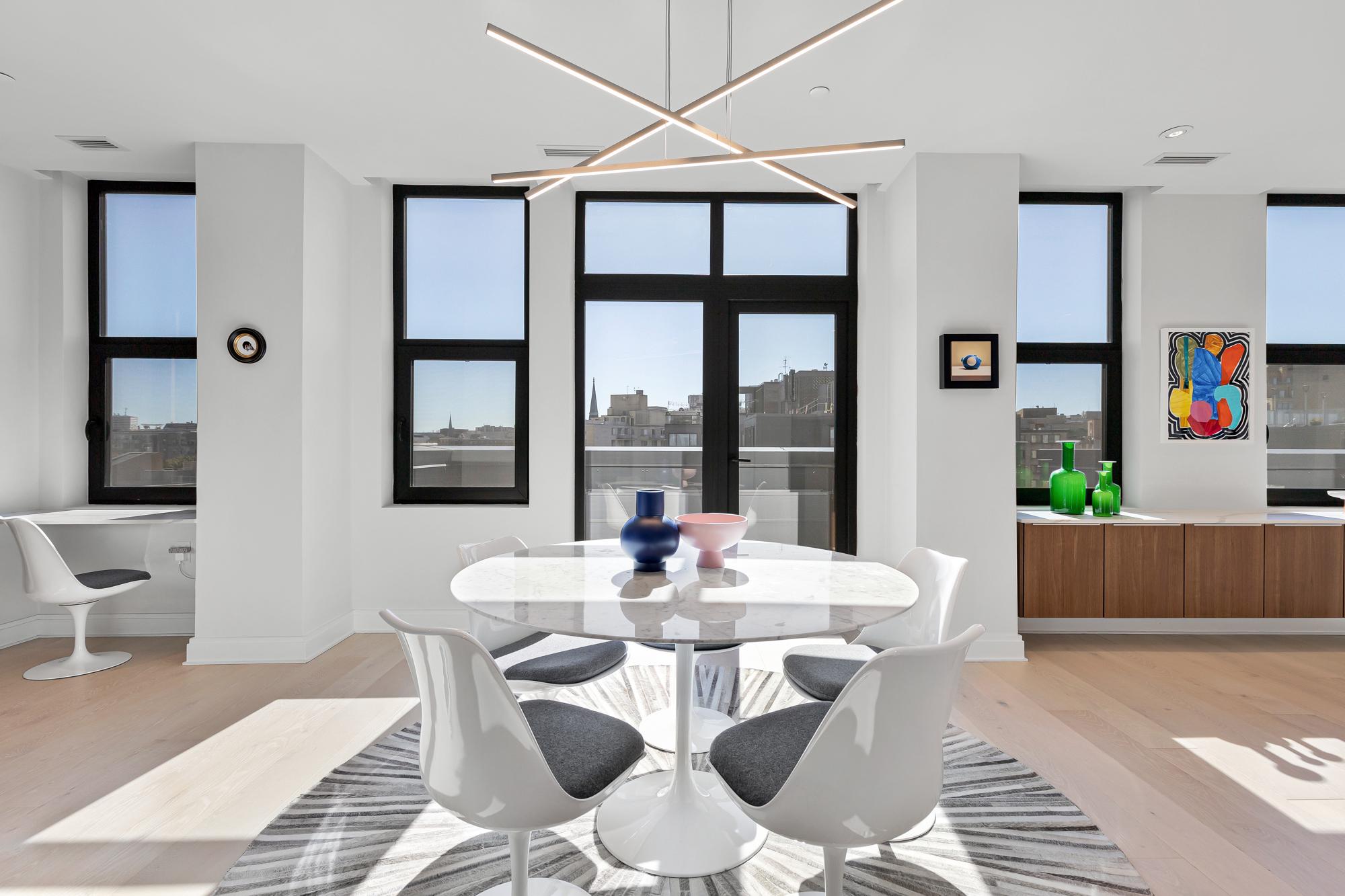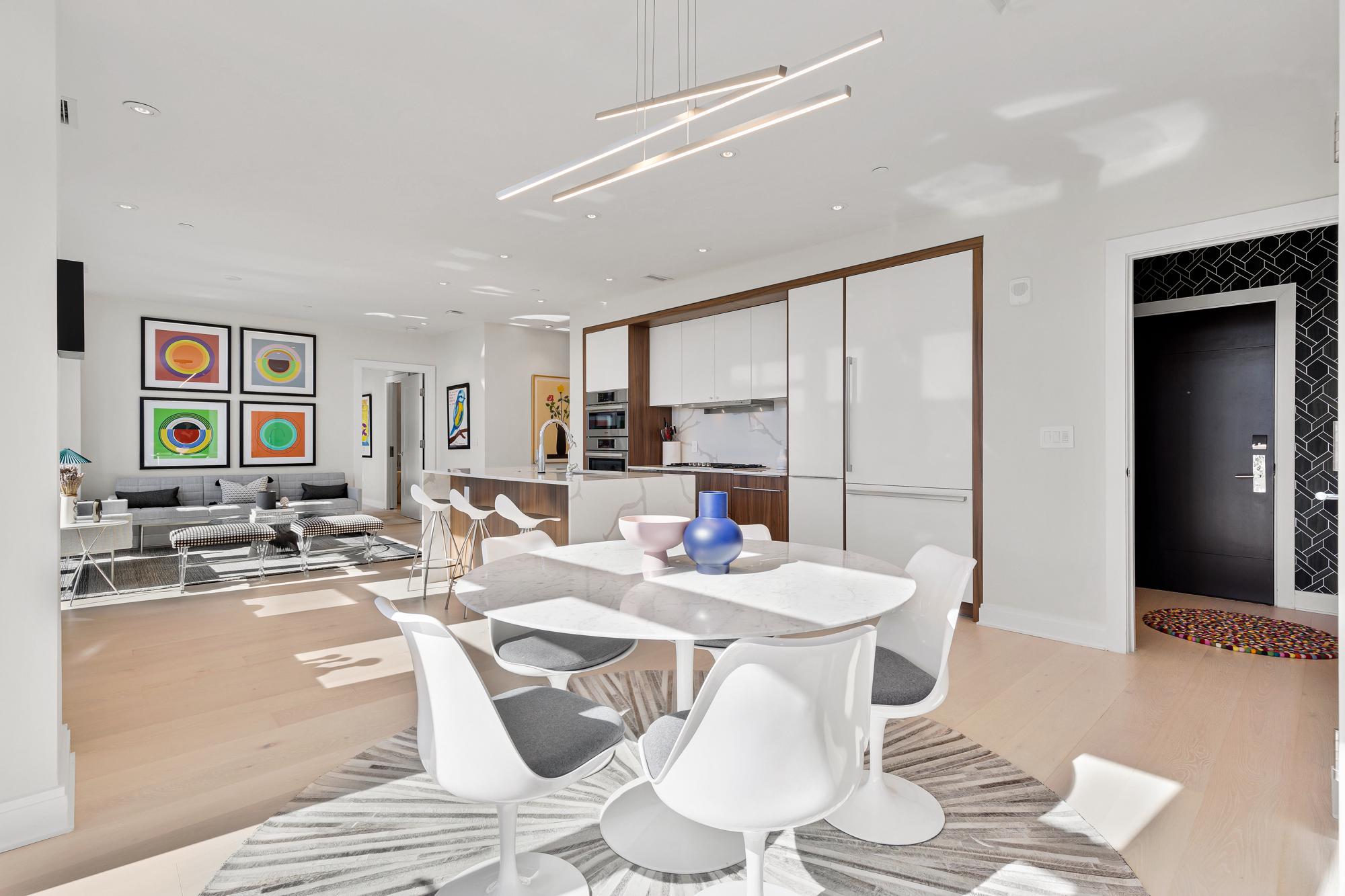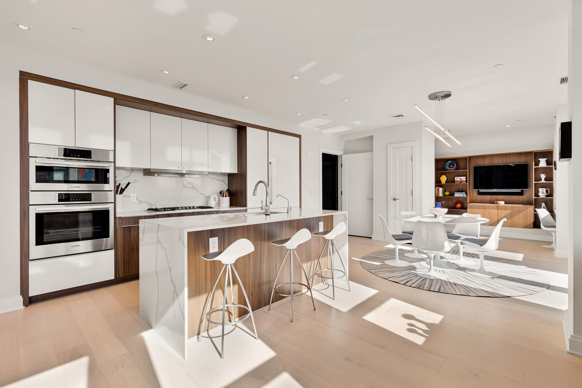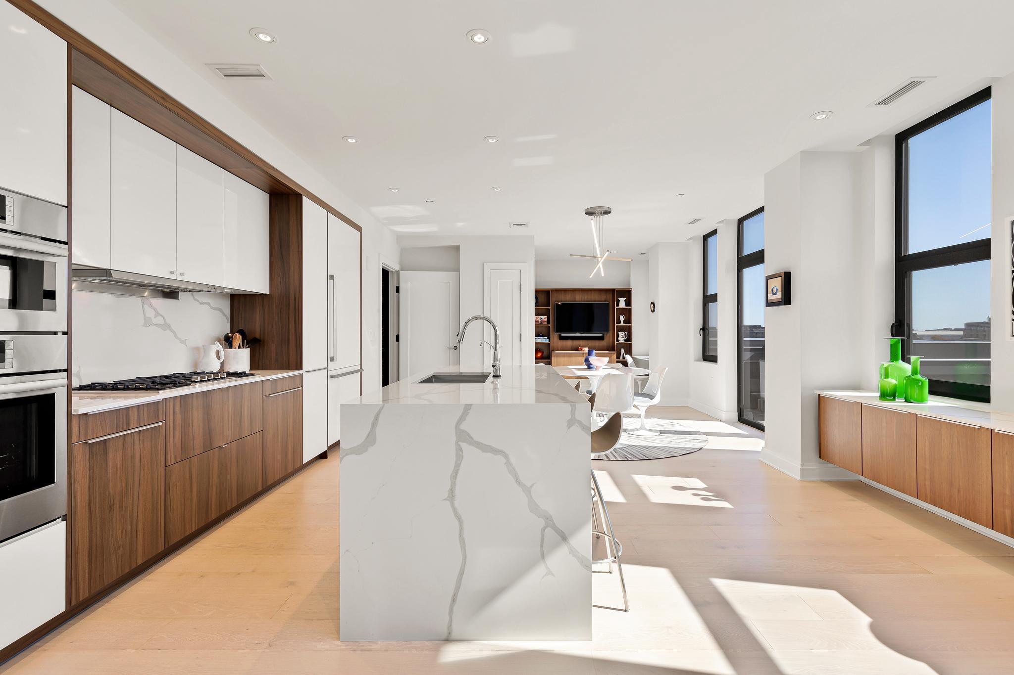 Your City. Your Skyline. Your Penthouse. Breathtaking sunlight in open floor plan on 2 full living levels with extensive outdoor space and outdoor kitchen. Perfect for entertaining and enjoying the summer!Perched above Logan Circle, this two-level penthouse at Elysium Logan Condominium offers a rare balance of design, light, and elevation. A private elevator opens directly into the residence, setting a tone of quiet exclusivity. Concierge service and a secured building equipped with the BUTTERFLY security system.The main level unfolds in natural light, with a wall of windows framing the city beyond. An open living and dining space flows effortlessly into a kitchen well appointed with custom Poggenpohl cabinetry, Thermador and Bosch appliances, reverse osmosis water infusion system and a sculptural waterfall island in Calcutta quartz. There is a separate office area with custom cabinetry and a coffee bar. Two private balconies extend the living experience.The primary suite is a study in calm and restraint, featuring dual oversized walk-in closets with closet organizers, blackout shades, and a spa-like bath finished with Waterworks fixtures and Porcelanosa tile. A second bedroom suite with private balcony can function as a flexible office and includes a built-in Murphy bed and custom cabinetry.Upstairs, a light-filled great room opens to a private rooftop terrace. Views stretch from the Washington Monument to the Washington National Cathedral, creating a striking backdrop for both quiet moments and elevated entertaining. An outdoor kitchen with a gas grill, sink and cooking area complete the setting.Exclusive Penthouse details include Lutron lighting, electronic shades, a full size laundry room, and private garage parking. Concierge service and a pet-friendly environment offer an easy lifestyle. All furnishings convey with sale. Exclusions are several rental pieces of art identified by tags. Deeded garage parking.