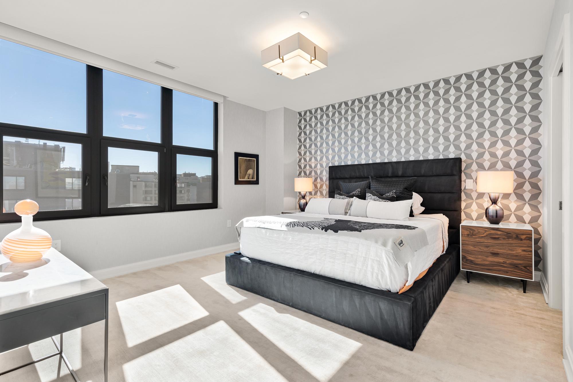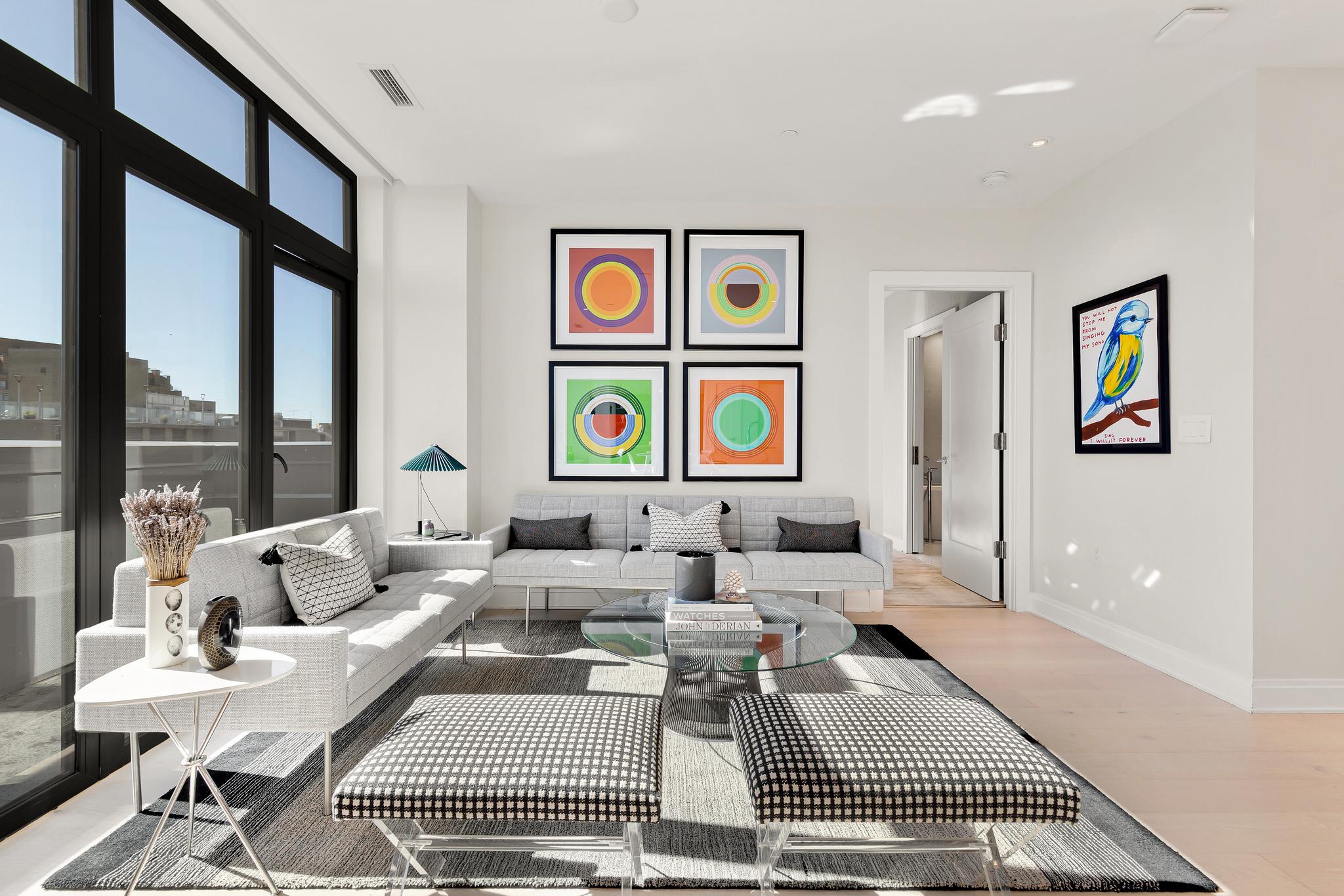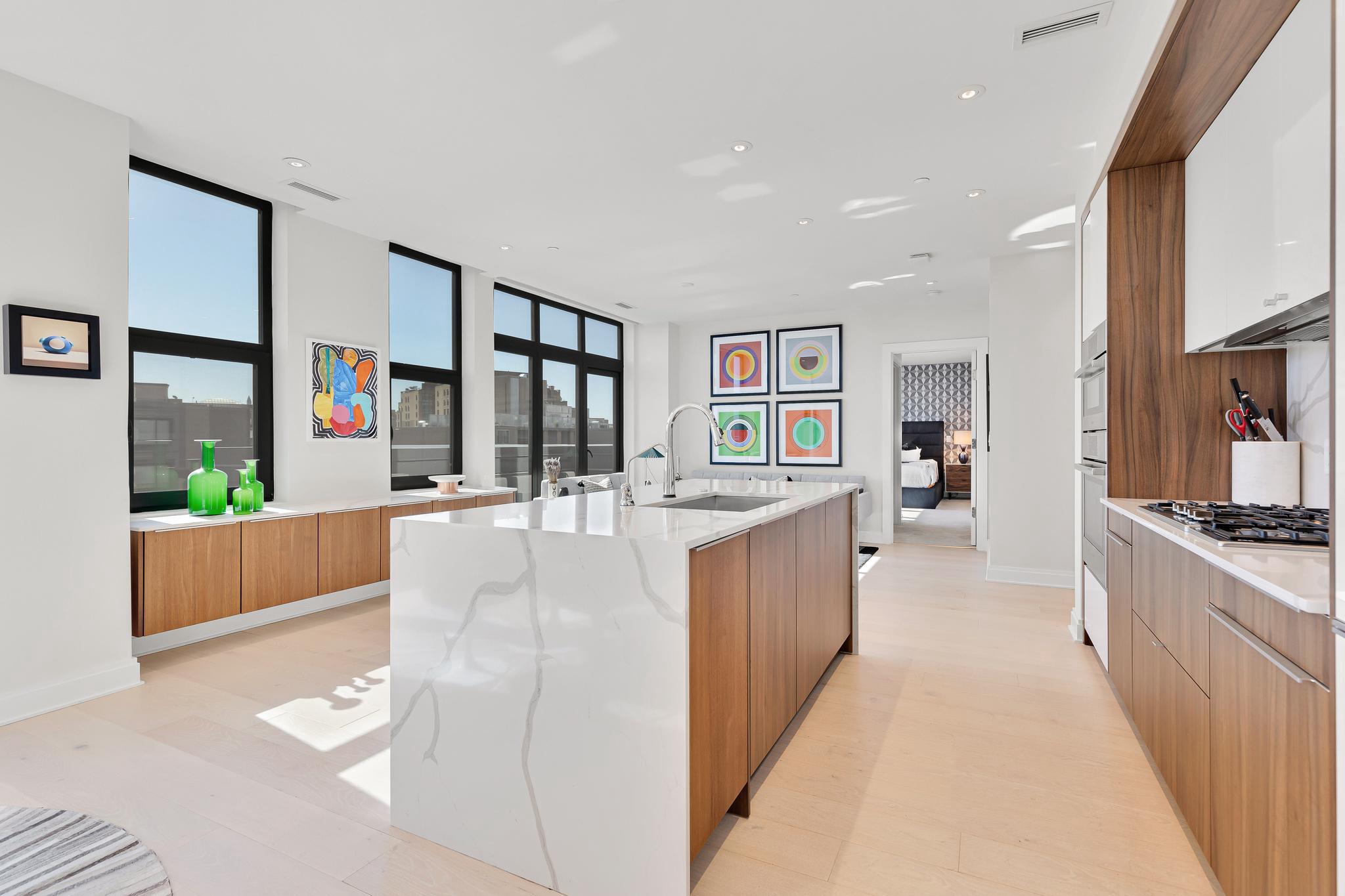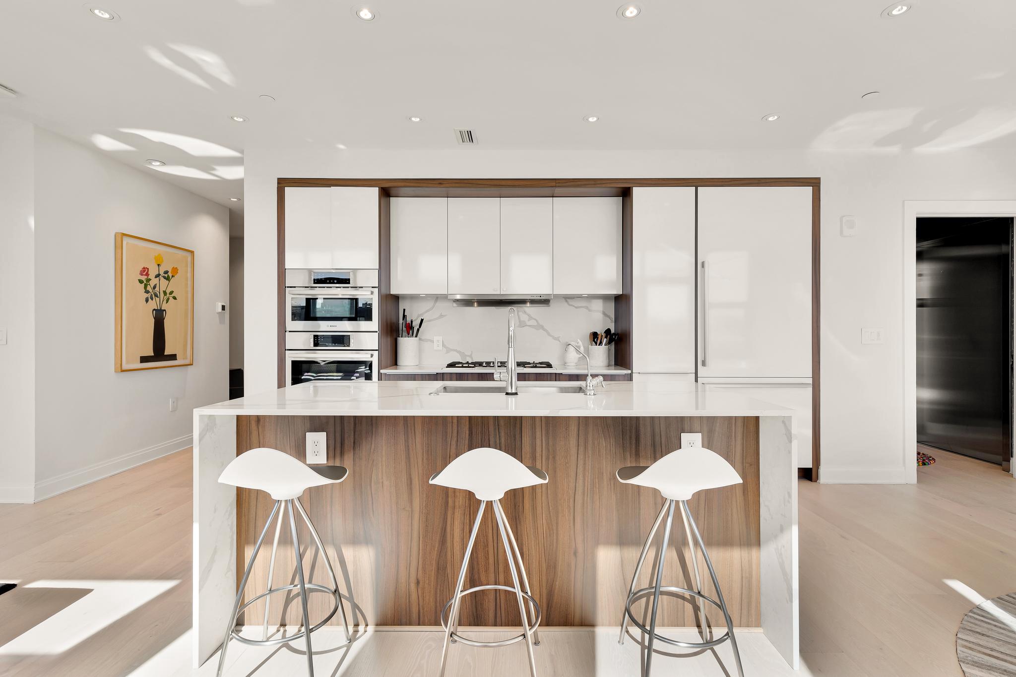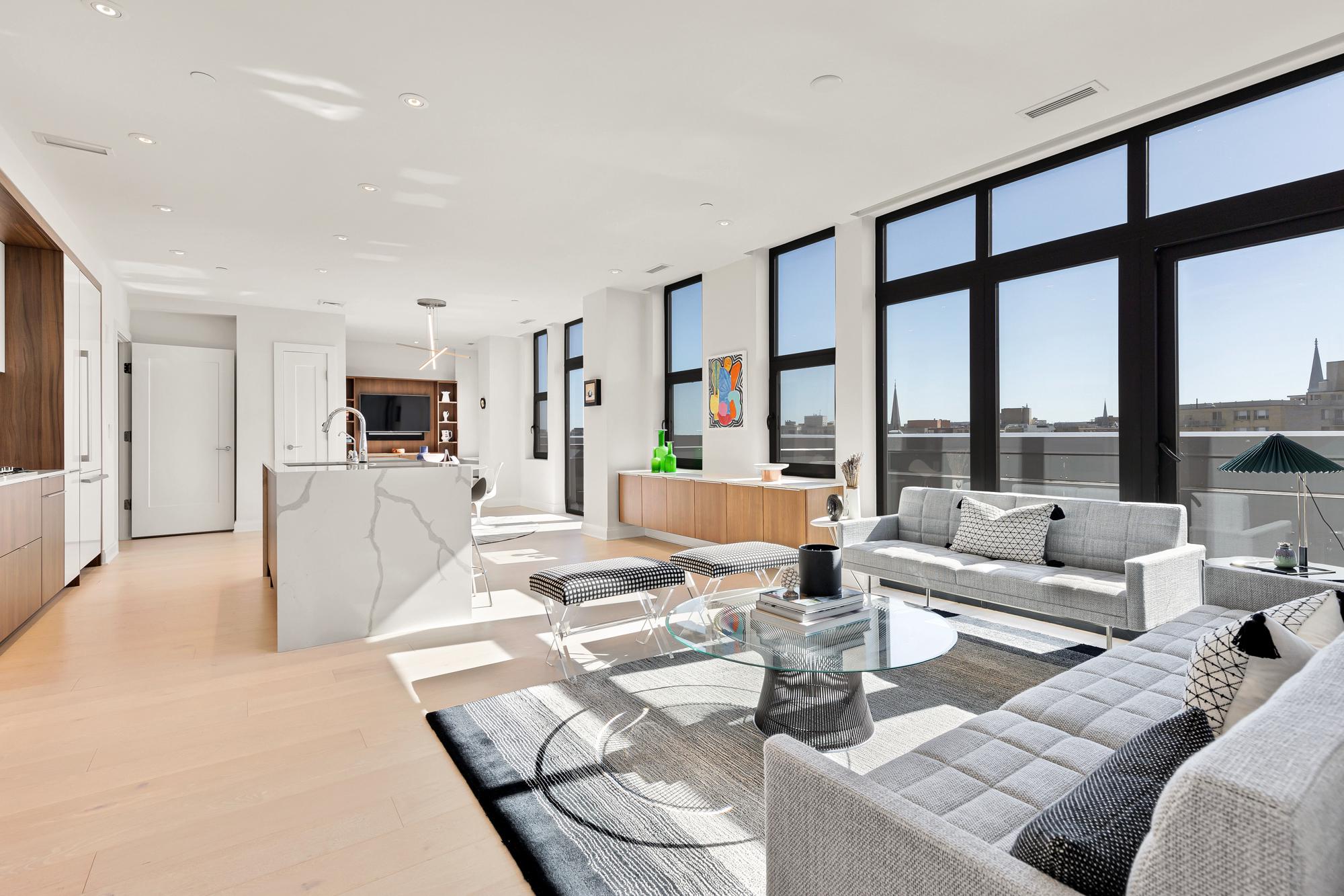 Your City. Your Skyline. Your Penthouse. Breathtaking sunlight in open floor plan on 2 full living levels with extensive outdoor space and outdoor kitchen. Perfect for entertaining and enjoying the summer!Perched above Logan Circle, this two-level penthouse at Elysium Logan Condominium offers a rare balance of design, light, and elevation. A private elevator opens directly into the residence, setting a tone of quiet exclusivity. Concierge service and a secured building equipped with the BUTTERFLY security system.The main level unfolds in natural light, with a wall of windows framing the city beyond. An open living and dining space flows effortlessly into a kitchen well appointed with custom Poggenpohl cabinetry, Thermador and Bosch appliances, reverse osmosis water infusion system and a sculptural waterfall island in Calcutta quartz. There is a separate office area with custom cabinetry and a coffee bar. Two private balconies extend the living experience.The primary suite is a study in calm and restraint, featuring dual oversized walk-in closets with closet organizers, blackout shades, and a spa-like bath finished with Waterworks fixtures and Porcelanosa tile. A second bedroom suite with private balcony can function as a flexible office and includes a built-in Murphy bed and custom cabinetry.Upstairs, a light-filled great room opens to a private rooftop terrace. Views stretch from the Washington Monument to the Washington National Cathedral, creating a striking backdrop for both quiet moments and elevated entertaining. An outdoor kitchen with a gas grill, sink and cooking area complete the setting.Exclusive Penthouse details include Lutron lighting, electronic shades, a full size laundry room, and private garage parking. Concierge service and a pet-friendly environment offer an easy lifestyle. All furnishings convey with sale. Exclusions are several rental pieces of art identified by tags. Deeded garage parking.