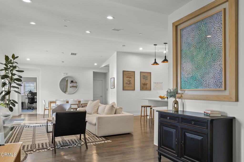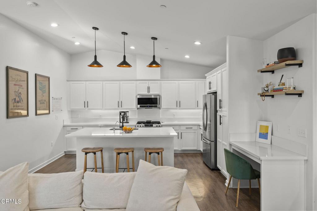 Welcome to this 3 Bedroom, like-new, END UNIT condo tucked within the historical district of Oxnard. Enter the home through your own private staircase corridor to an open-floorplan, one-level unit. Light flows throughout due to the vaulted ceilings and many windows. This unit features three sizeable bedrooms and two FULL bathrooms, as well as a private 2-car garage located below. The open concept kitchen, dining and living areas feature vaulted ceilings and flow into a private patio, perfect for enjoying the sunset. Kitchen features standard white cabinets and a large island with white quartz countertops as well as stainless steel appliances including range, microwave and dishwasher. Built-in desk near the kitchen area perfectly situated for working from home. Large main bedroom features a walk-in closet and an en-suite bathroom which includes dual vanity sinks, Delta branded fixtures and white sandstone quartz countertops. Additional standard features include high-quality Milgard windows and sliding glass doors used throughout, dedicated laundry room, recessed lighting in the kitchen, bathrooms and dining area, Smarthome technology throughout the home and vinyl plank flooring in the main living areas with carpeting in the bedrooms.
