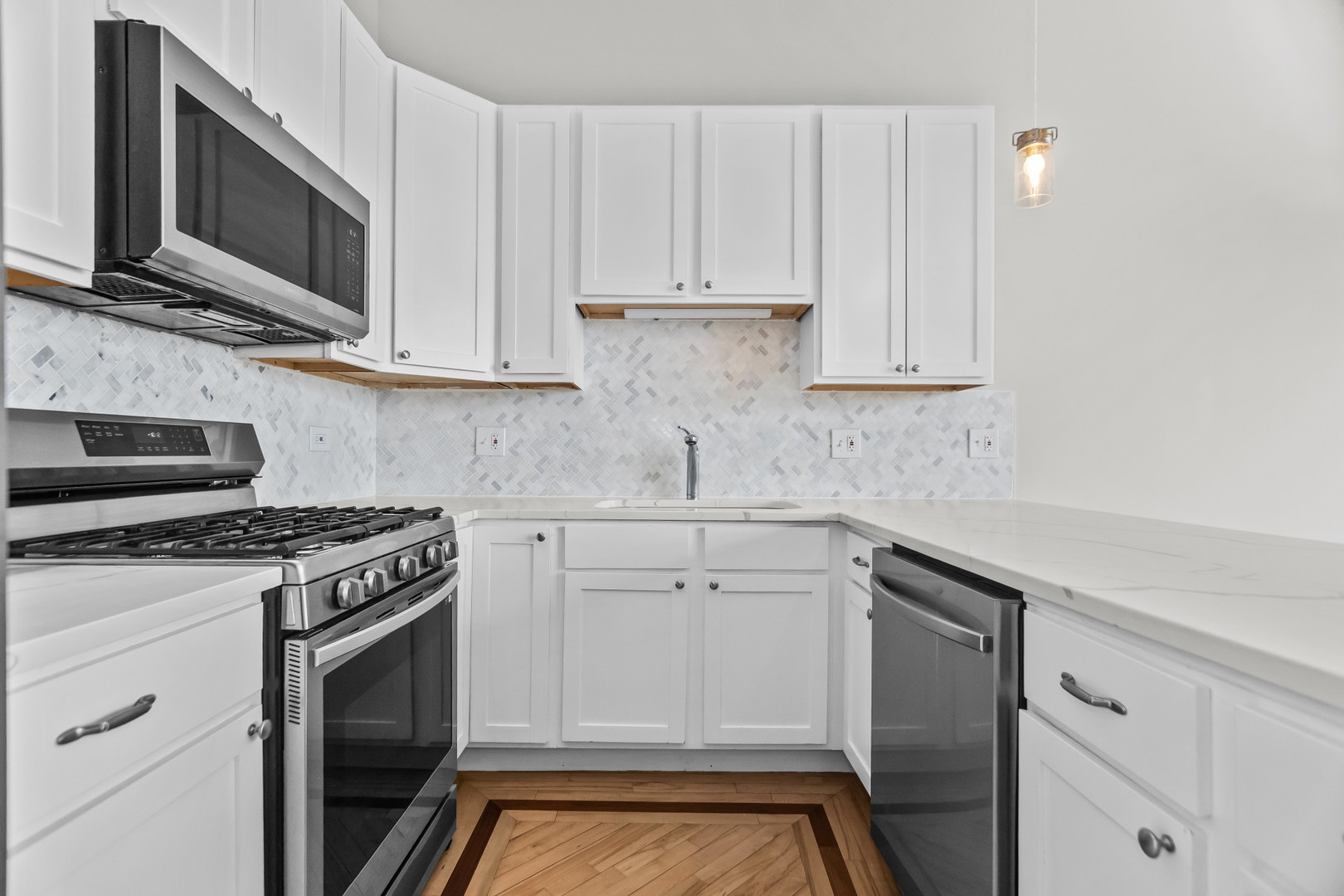 Top-floor 3-bedroom, 2-bath unit featuring newly renovated bathrooms. The spacious primary suite easily accommodates a king-sized bed with side tables and includes a walk-in closet, private balcony, and en-suite bathroom with soaking tub, separate walk-in shower, and dual vanities. The open-concept kitchen and living area boasts high ceilings and abundant natural light, complemented by a decorative fireplace, built-in shelving, and a second private balcony. Additional highlights include in-unit laundry, central air, and TWO tandem parking spaces included in the rent. Enjoy access to a private rear rooftop area exclusive to the unit, with furniture available for tenant use, as well as a shared front rooftop space. This home truly checks all the boxes. Please note: no pets permitted. Tenant responsible for gas, electric, and internet. No security deposit. $500 move in fee.