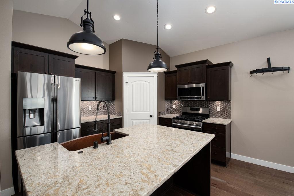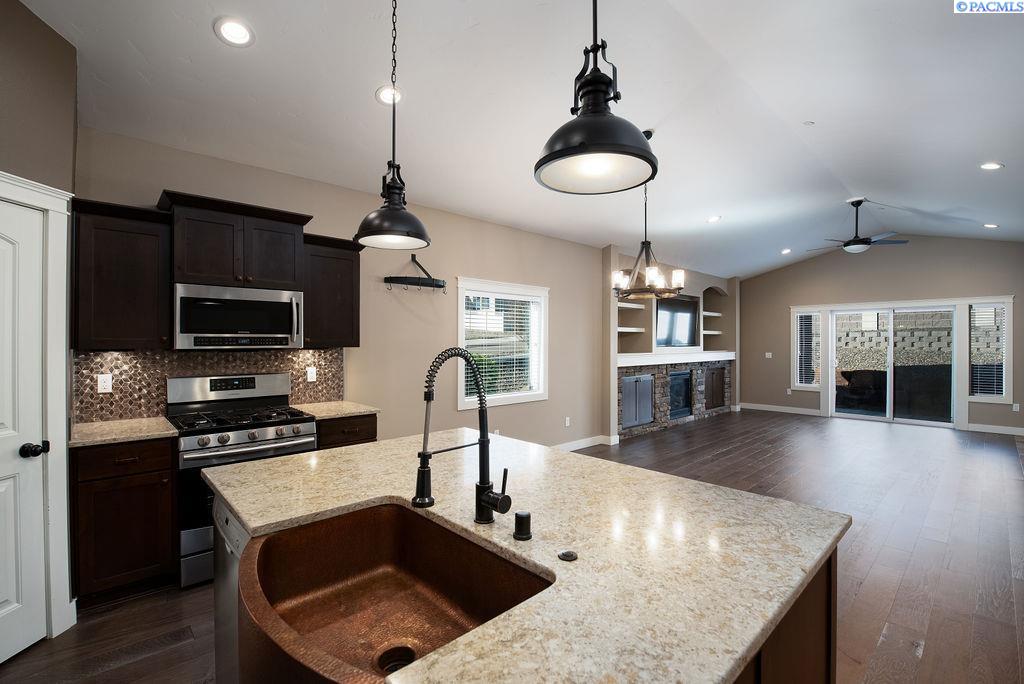 MLS# 291518 Welcome to your dream home! This beautiful Titan Model Home features the highly sought-after Makayla Ferrera floor plan, offering effortless single-level living in the heart of the Energy Star & Built Green certified West Vineyard community. Step inside to a bright, modern interior showcasing elegant hardwood flooring in the entry and main living spaces, tile in high-traffic areas, and plush carpet in the bedrooms for added comfort. The open-concept design creates a seamless flow between the living, dining, and kitchen areas, perfect for both everyday living and entertaining. The stunning kitchen is equipped with granite countertops, gas appliances, a pantry, a breakfast bar, custom lighting, and beautiful finishes that make it the true centerpiece of the home. The living room features a cozy gas fireplace with rock surround, built-ins, and a stylish custom tiled accent wall in the entry for an added designer touch. The spacious primary suite offers a luxurious retreat with a fully tiled bathroom and thoughtful upgrades throughout. Additional features include a tankless water heater, custom paint, and upgraded fixtures that enhance both efficiency and style. Outside, enjoy a low-maintenance yard, professional landscaping, and a 2-car garage. Nest Thermostat & Fire Suppression System. You'll have the benefits of a large yard without the upkeep, thanks to the huge community park just down the street. Located near Candy Mountain and Country Mercantile, this home offers easy access to scenic walking trails, local wineries, and the interstate, combining peaceful neighborhood living with unbeatable convenience.