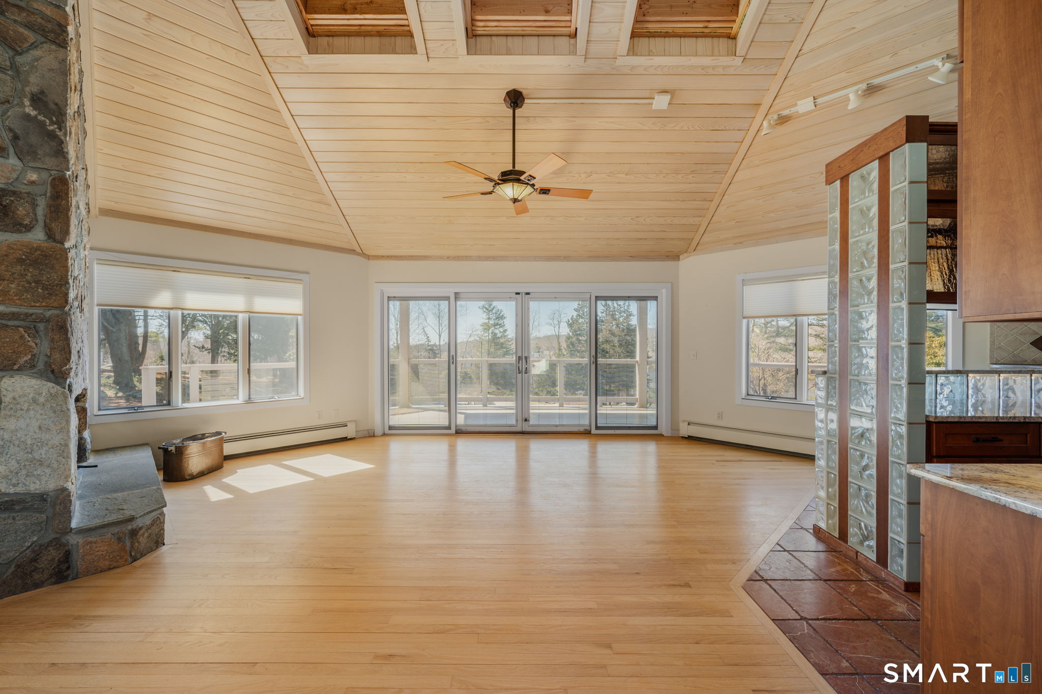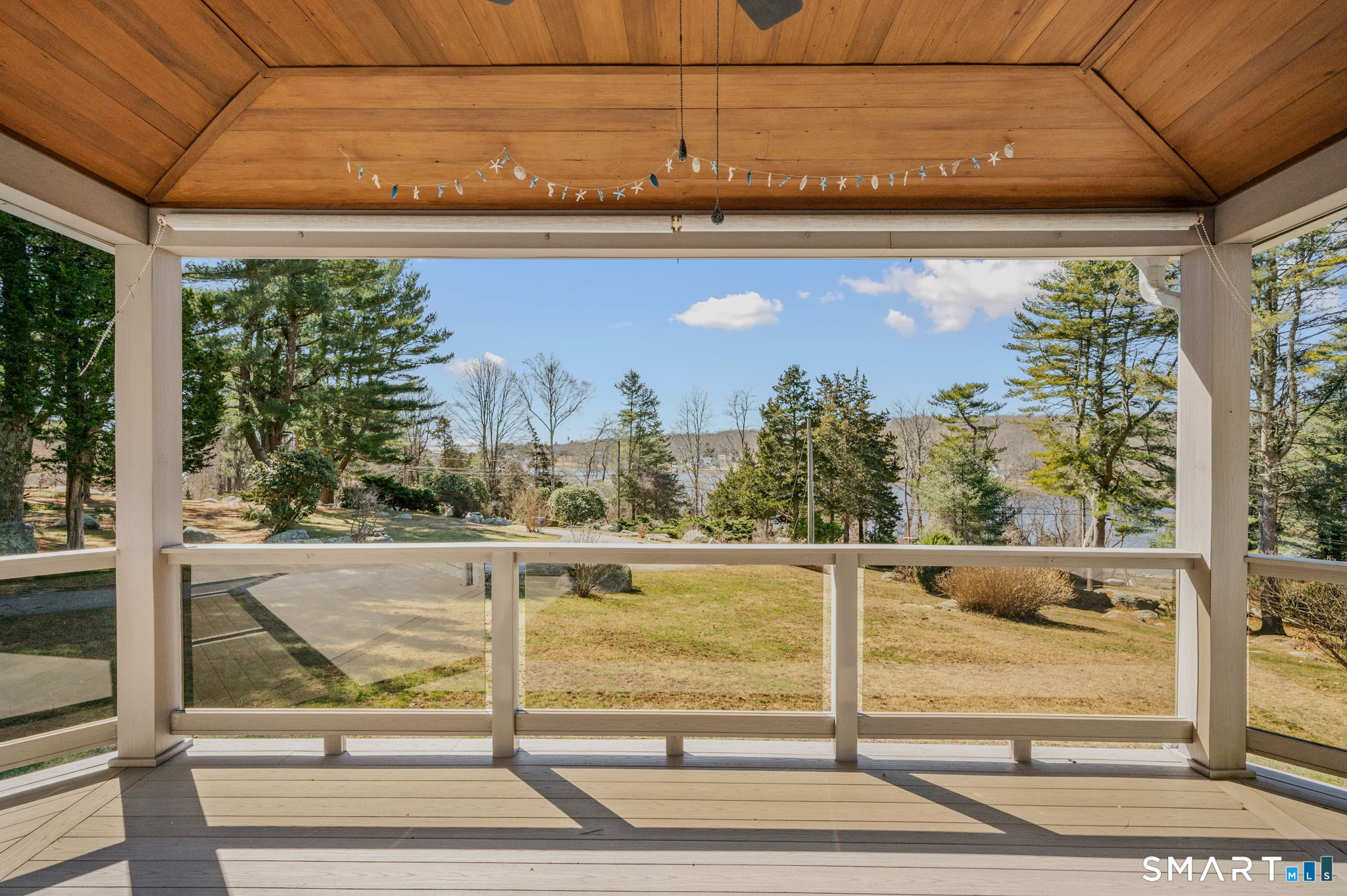 Custom designed one-owner Contemporary home positioned on a 2.29 acre professionally landscaped hilltop w/views & kayak access to coastal inlet Quiambaug Cove. Quiet setting includes stone walls, large garden shed, greenscapes and plenty of birdwatching & natural enjoyment. Home is structured around a floor-to-ceiling stone fireplace with wall of windows overlooking "Azek" covered front porch and cove below. Unique and well appointed kitchen w/cherry cabinetry, terracotta tile & breakfast bar. Living room/dining combination w/vaulted ceiling and brand new skylights. Hardwood flooring throughout. In addition to first-floor bedroom find two oversized bedrooms on 2nd floor, both with modern full baths and generous closet space. A separate updated laundry room w/lots of cabinetry and a folding station also present. Featured on the 3rd floor, via a spiral staircase, is a studio/office w/sweeping views as far as Fishers Island! Full basement, new roof (2025) and efficient "Buderus" heating & hot water system (2024). In addition to all that Stonington has to offer, enjoy vibrant downtown Mystic, Mystic Seaport and access to I-95 just minutes away. Bring your vision to this meticulously maintained home. This is an estate. Note square footage appears to be closer to 2,600 sf.