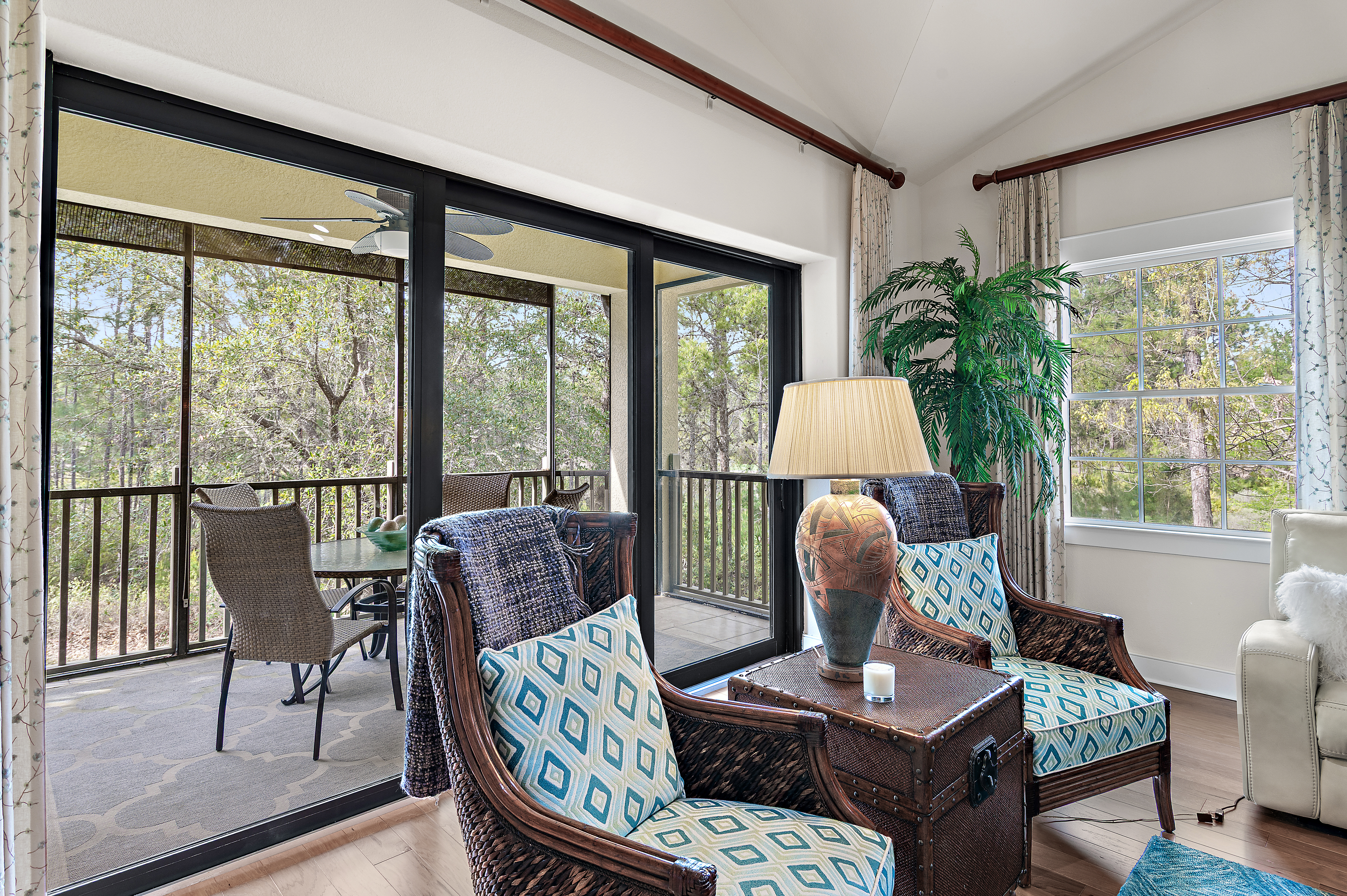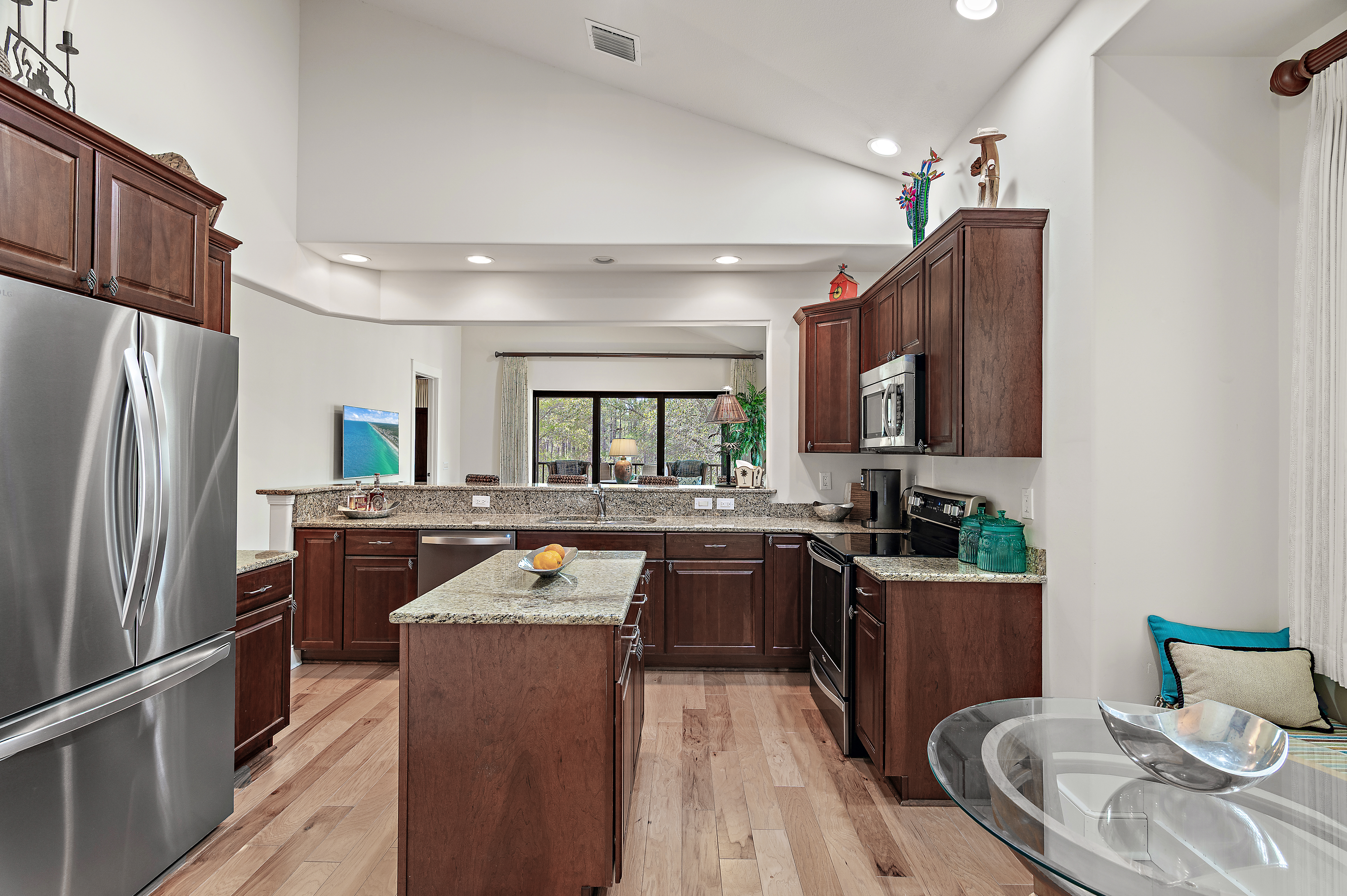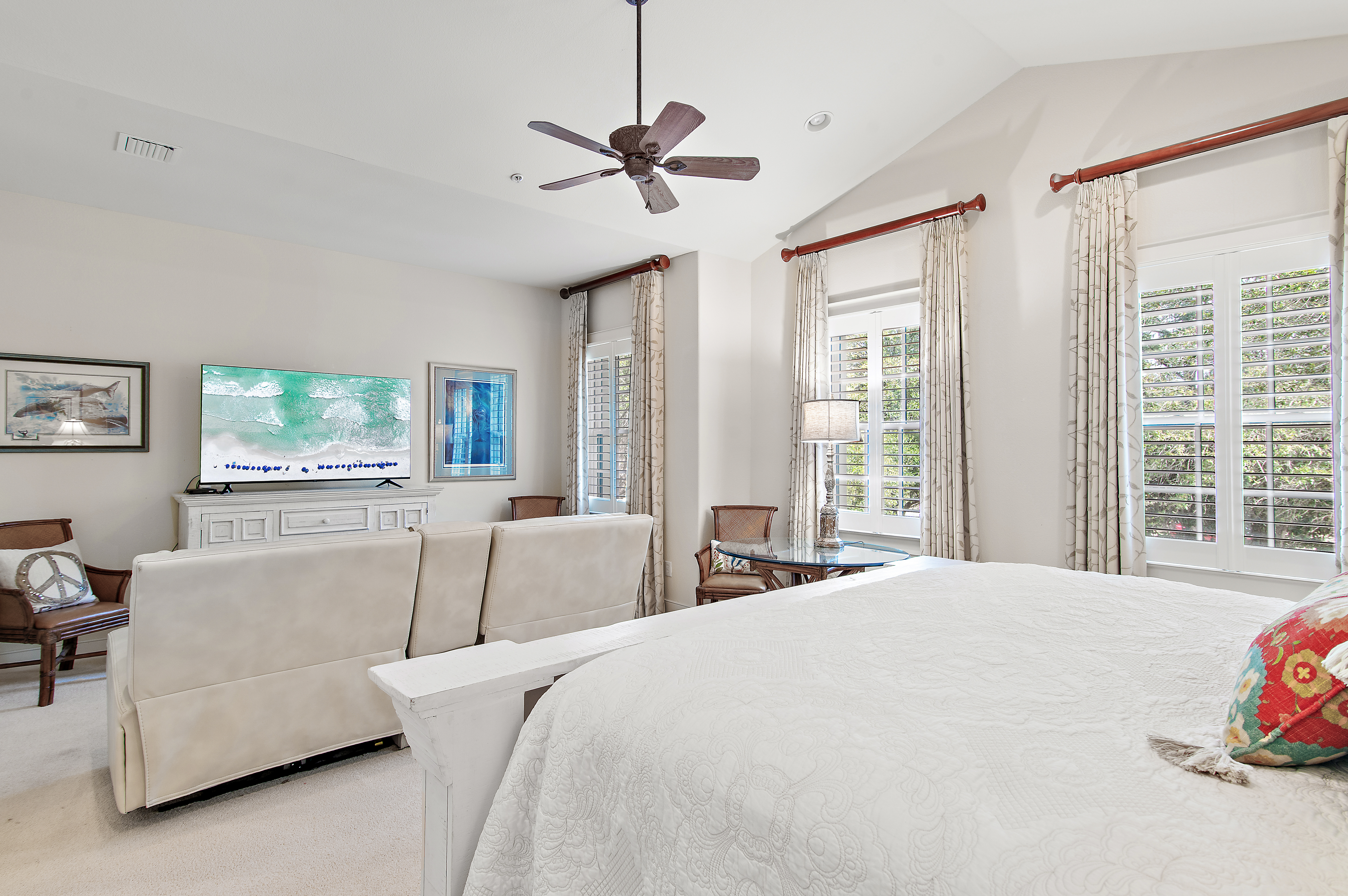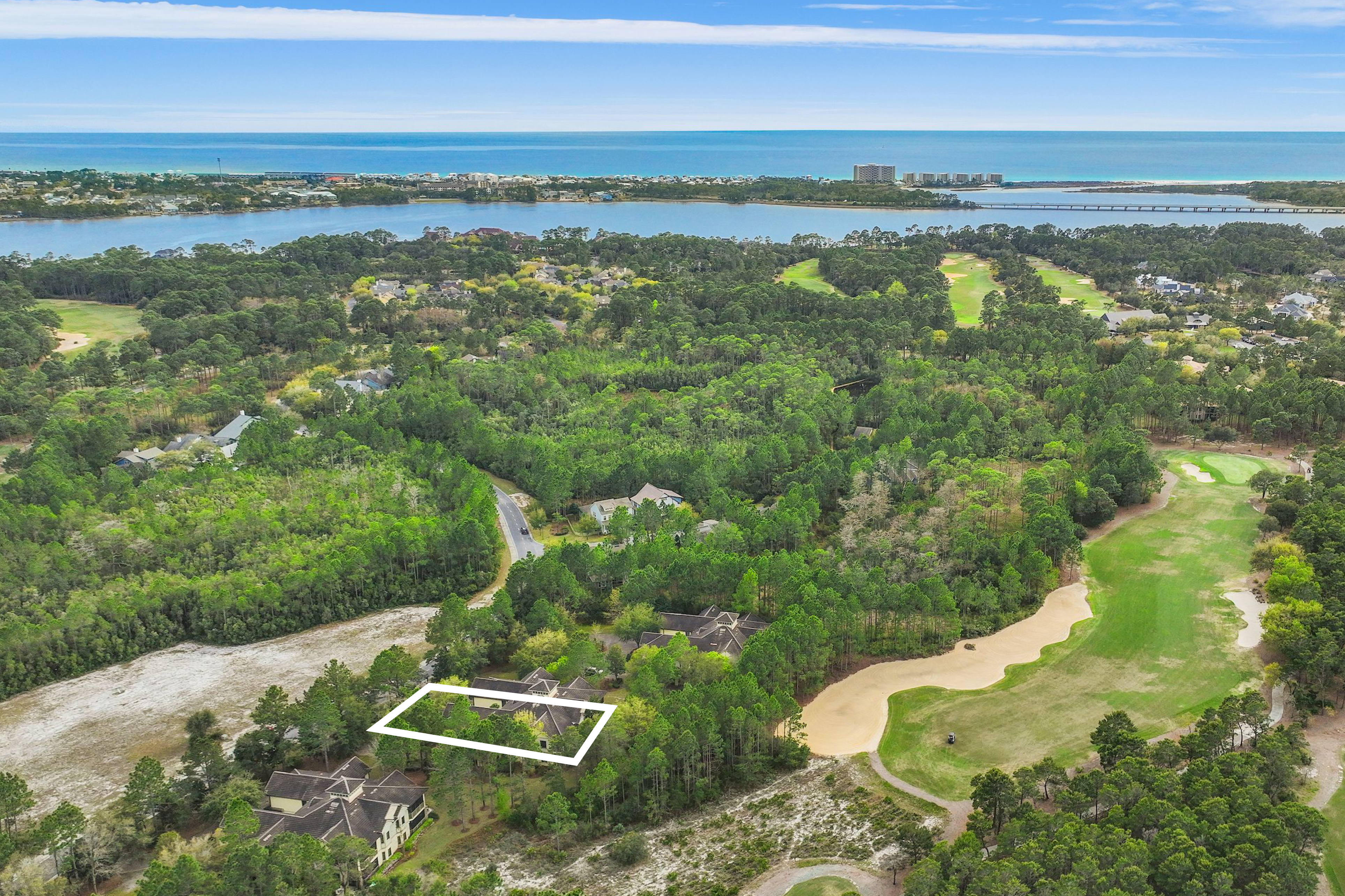 Perched at the top of Clubside II, this rare end-unit residence offers a sense of quiet elevation — where expansive interiors, filtered golf course views, and surrounding foliage create a setting that feels both private and effortlessly connected to the landscape. Positioned along the ninth tee of Greg Norman’s celebrated Shark’s Tooth Golf Course, the home captures a softer side of golf course living, with glimpses of manicured greens framed by natural privacy. Inside, soaring vaulted ceilings stretch beyond 12 feet, amplifying the scale of the open living spaces and allowing natural light to move freely throughout. Wide-plank hardwood floors anchor the main living area, while the kitchen is thoughtfully designed for both daily rhythm and hosting alike, featuring granite countertops, stainless steel appliances, custom cabinetry with integrated pull-out shelving, pantry, and a generous layout that flows seamlessly into the dining area and adjacent flex room, ideal as an office or media space. Telescoping sliding glass doors extend the living area outward to a screened porch, where custom shades and tranquil views create an inviting environment for morning coffee or relaxed evenings. This indoor-outdoor connection enhances the home’s livability, offering a peaceful vantage point above it all. The floor plan is designed for comfort and separation, with each bedroom functioning as its own private suite. Two serve as primary retreats, including one with dual closets — one walk-in — custom wood shelving, double vanities, a skylit tiled shower, jetted tub, and a private water closet. A second suite, set behind double doors, offers generous proportions with a sitting area, ensuite bath, and walk-in closet. The third bedroom is tucked away with its own private feel, ideal for guests. Additional features include a private elevator servicing the main living level, an oversized two-car garage, and abundant storage throughout. With all primary living spaces on one level, the residence offers the ease and comfort of a single-family home. Offered unfurnished with furnishings negotiable, the property also benefits from a fully paid special assessment for exterior improvements, presenting a compelling opportunity for immediate enjoyment or thoughtful personalization. Residents enjoy access to an exceptional collection of amenities centered around Lake Powell, the largest coastal dune lake in the country. From a lakeside pool and hot tub to a fitness center, fire pit, boathouse, private marina, and miles of walking and biking trails, the lifestyle here is both active and serene. Golf, tennis, and clubhouse access are available through membership, completing a well-rounded coastal experience defined by space, privacy, and ease. Just minutes from 30A, Rosemary and Alys Beach, shopping, dining, and the Gulf's white-sand beaches, this home offers the perfect combination of luxury, privacy, accessibility, and resort-style living.