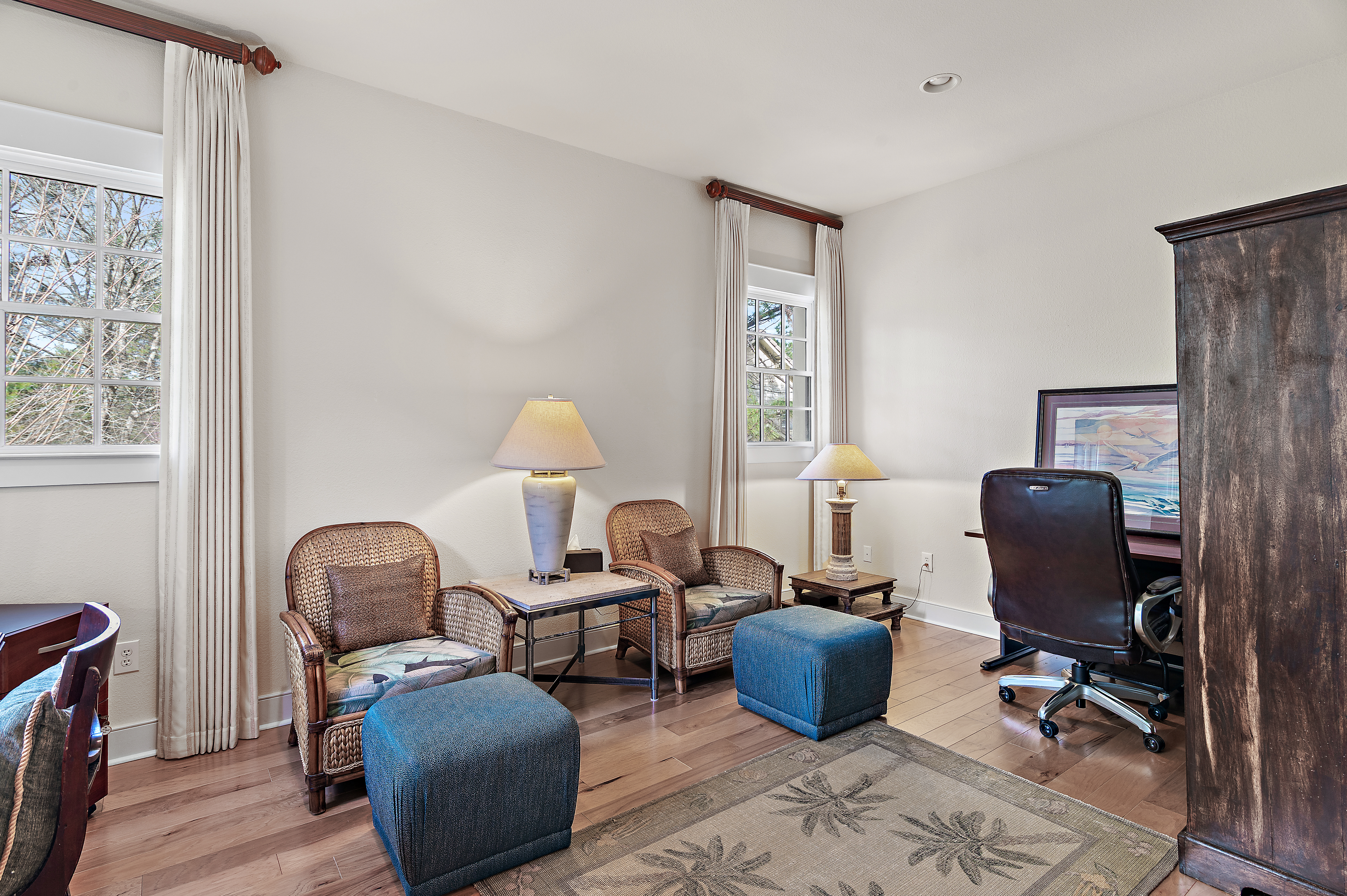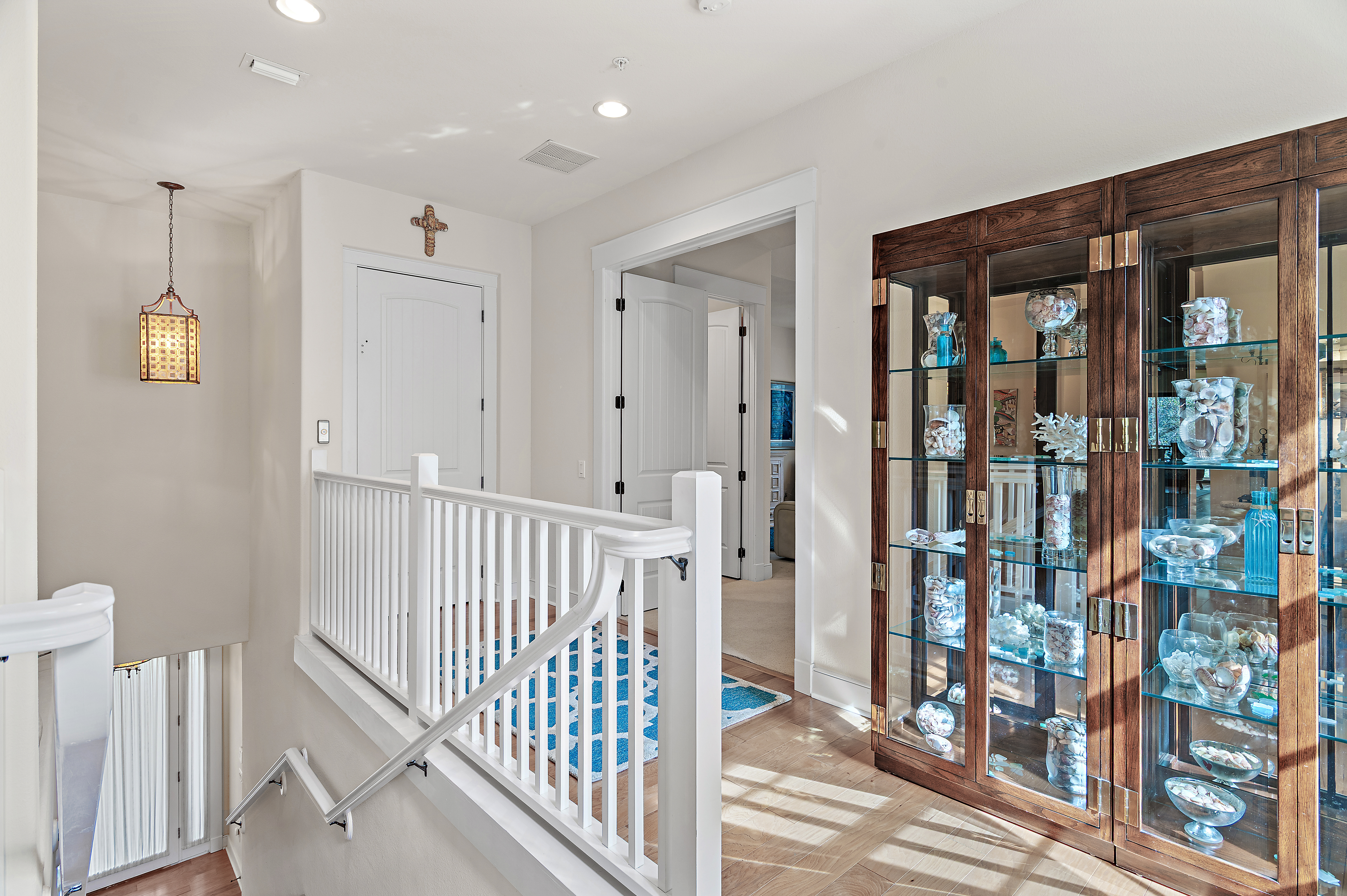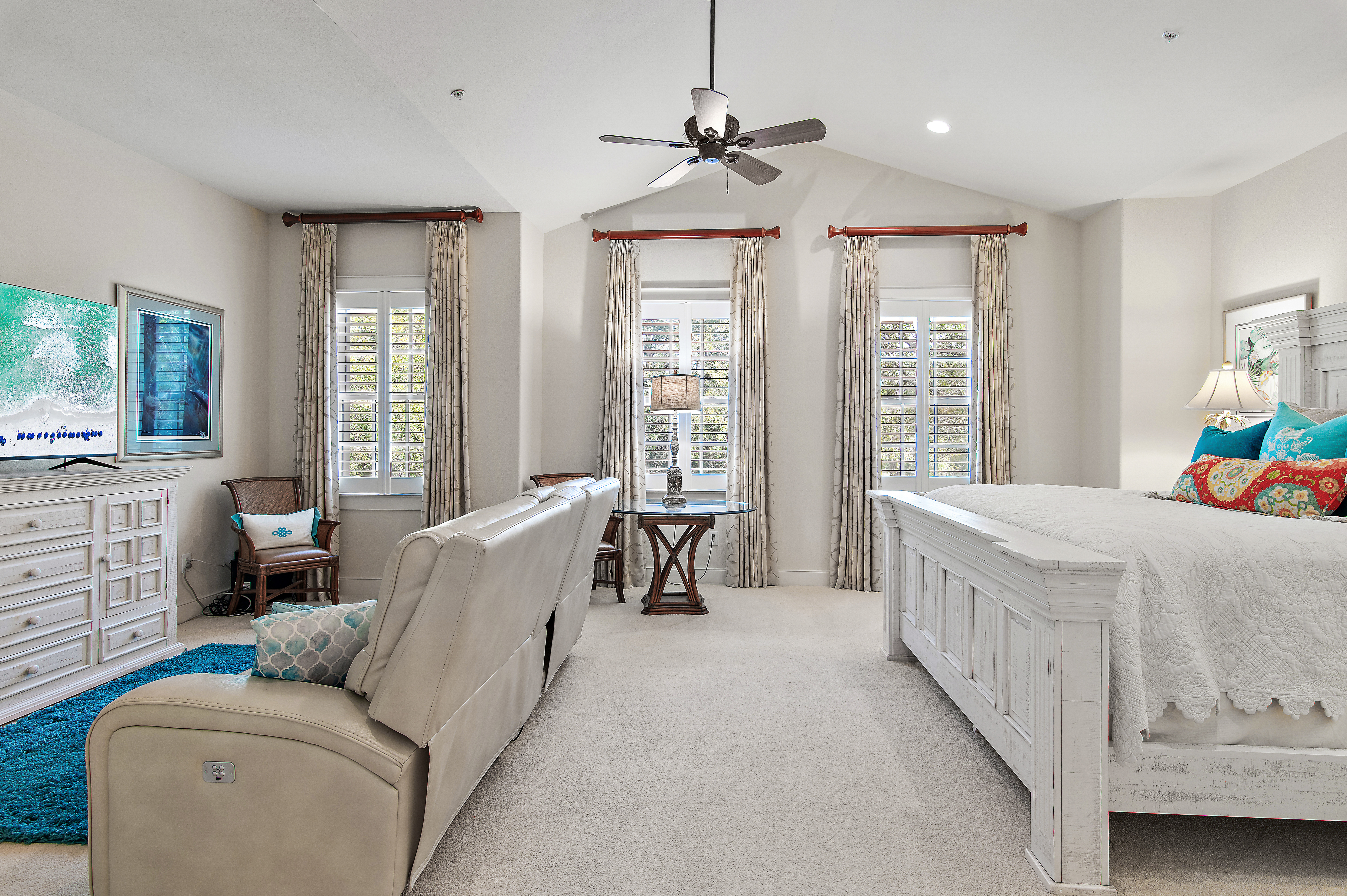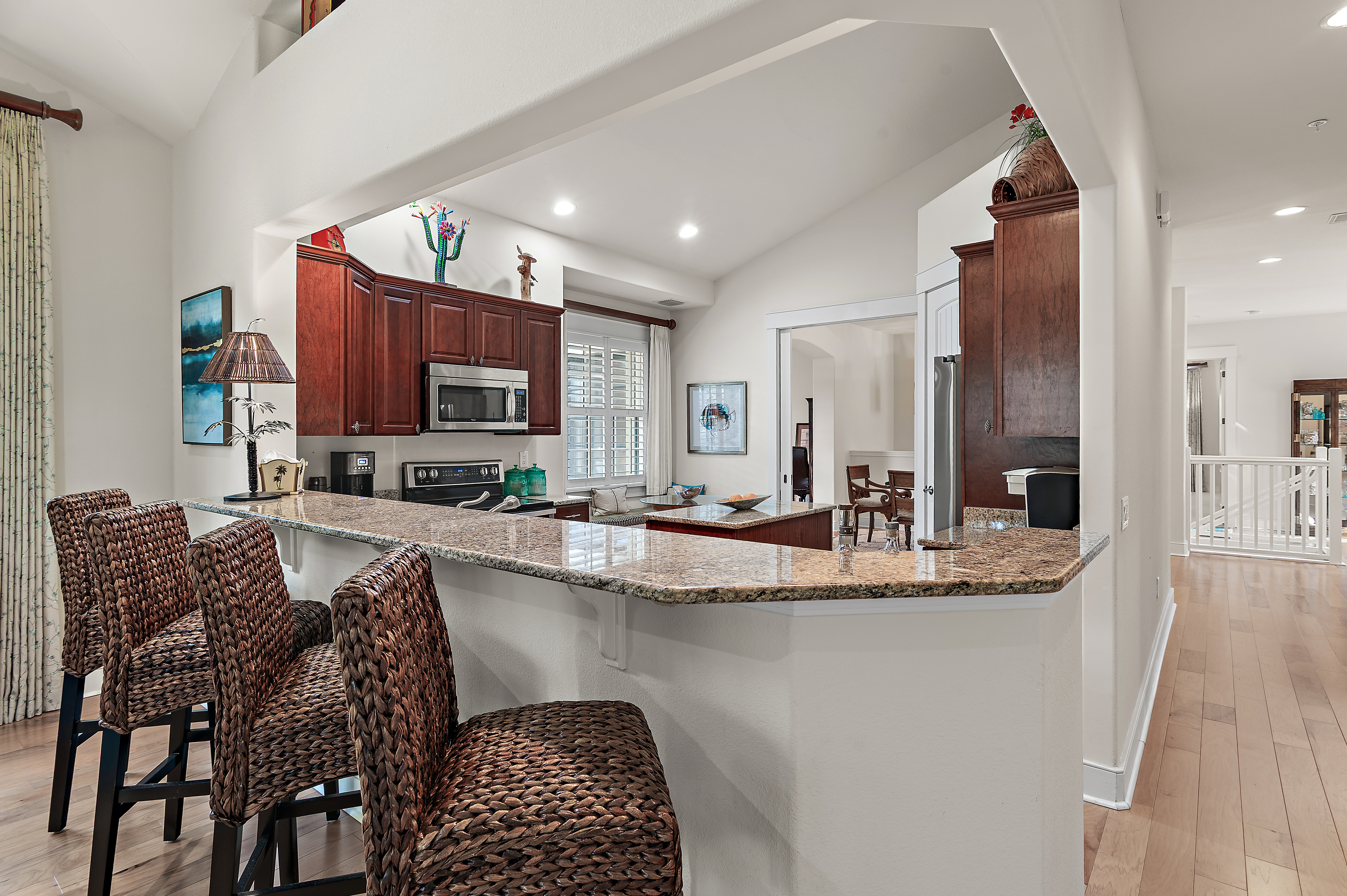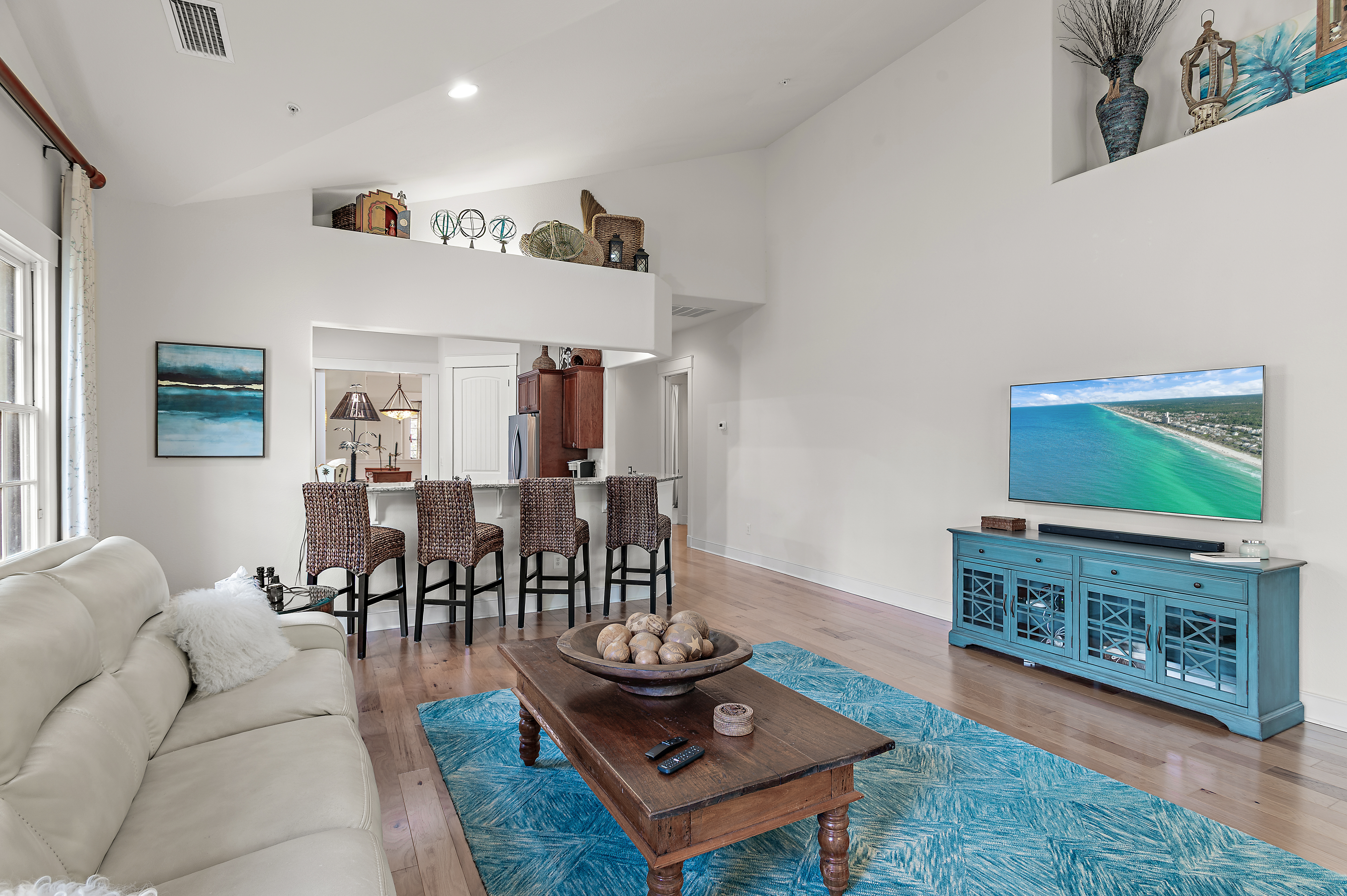 Perched at the top of Clubside II, this rare end-unit residence offers a sense of quiet elevation — where expansive interiors, filtered golf course views, and surrounding foliage create a setting that feels both private and effortlessly connected to the landscape. Positioned along the ninth tee of Greg Norman’s celebrated Shark’s Tooth Golf Course, the home captures a softer side of golf course living, with glimpses of manicured greens framed by natural privacy. Inside, soaring vaulted ceilings stretch beyond 12 feet, amplifying the scale of the open living spaces and allowing natural light to move freely throughout. Wide-plank hardwood floors anchor the main living area, while the kitchen is thoughtfully designed for both daily rhythm and hosting alike, featuring granite countertops, stainless steel appliances, custom cabinetry with integrated pull-out shelving, pantry, and a generous layout that flows seamlessly into the dining area and adjacent flex room, ideal as an office or media space. Telescoping sliding glass doors extend the living area outward to a screened porch, where custom shades and tranquil views create an inviting environment for morning coffee or relaxed evenings. This indoor-outdoor connection enhances the home’s livability, offering a peaceful vantage point above it all. The floor plan is designed for comfort and separation, with each bedroom functioning as its own private suite. Two serve as primary retreats, including one with dual closets — one walk-in — custom wood shelving, double vanities, a skylit tiled shower, jetted tub, and a private water closet. A second suite, set behind double doors, offers generous proportions with a sitting area, ensuite bath, and walk-in closet. The third bedroom is tucked away with its own private feel, ideal for guests. Additional features include a private elevator servicing the main living level, an oversized two-car garage, and abundant storage throughout. With all primary living spaces on one level, the residence offers the ease and comfort of a single-family home. Offered unfurnished with furnishings negotiable, the property also benefits from a fully paid special assessment for exterior improvements, presenting a compelling opportunity for immediate enjoyment or thoughtful personalization. Residents enjoy access to an exceptional collection of amenities centered around Lake Powell, the largest coastal dune lake in the country. From a lakeside pool and hot tub to a fitness center, fire pit, boathouse, private marina, and miles of walking and biking trails, the lifestyle here is both active and serene. Golf, tennis, and clubhouse access are available through membership, completing a well-rounded coastal experience defined by space, privacy, and ease. Just minutes from 30A, Rosemary and Alys Beach, shopping, dining, and the Gulf's white-sand beaches, this home offers the perfect combination of luxury, privacy, accessibility, and resort-style living.