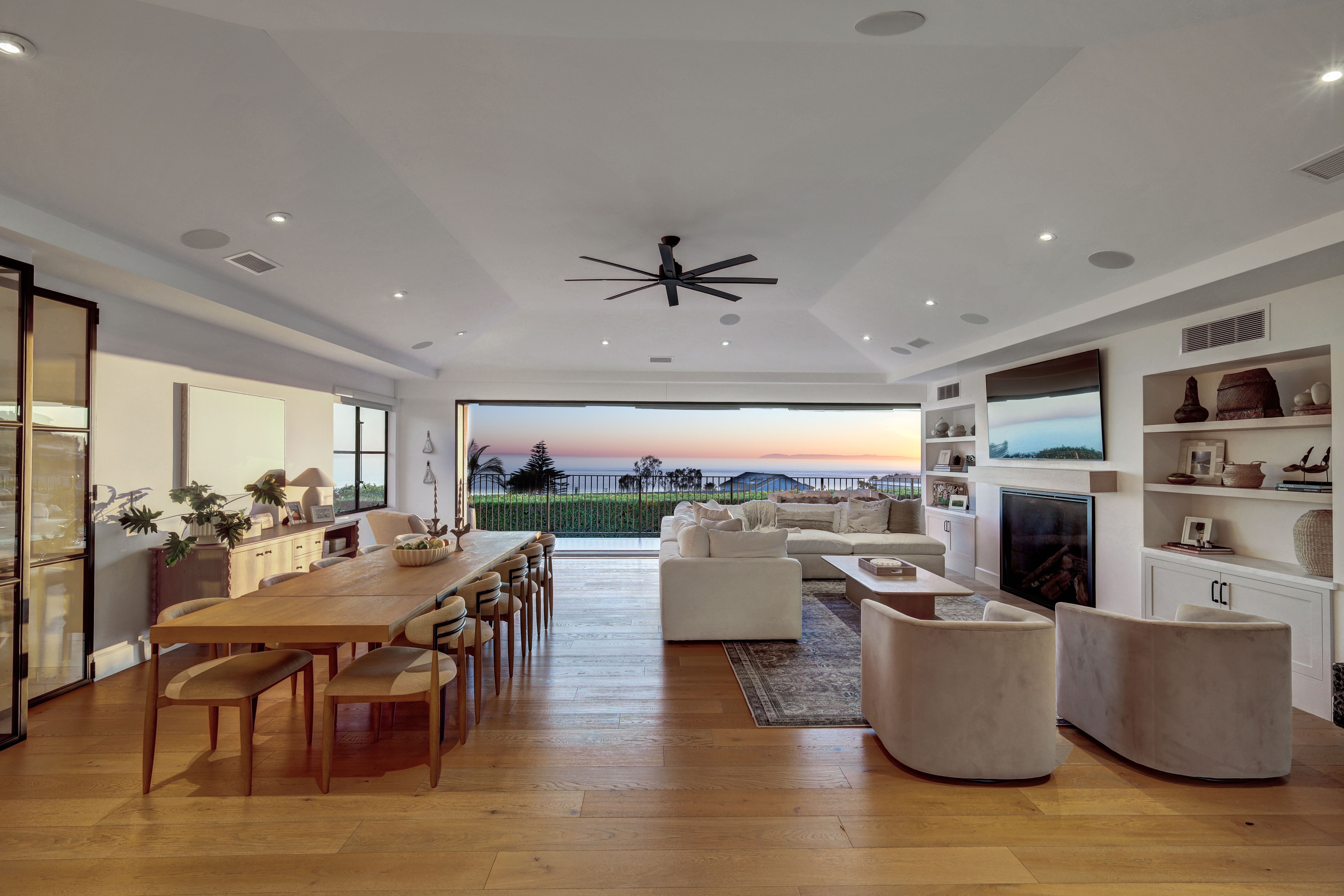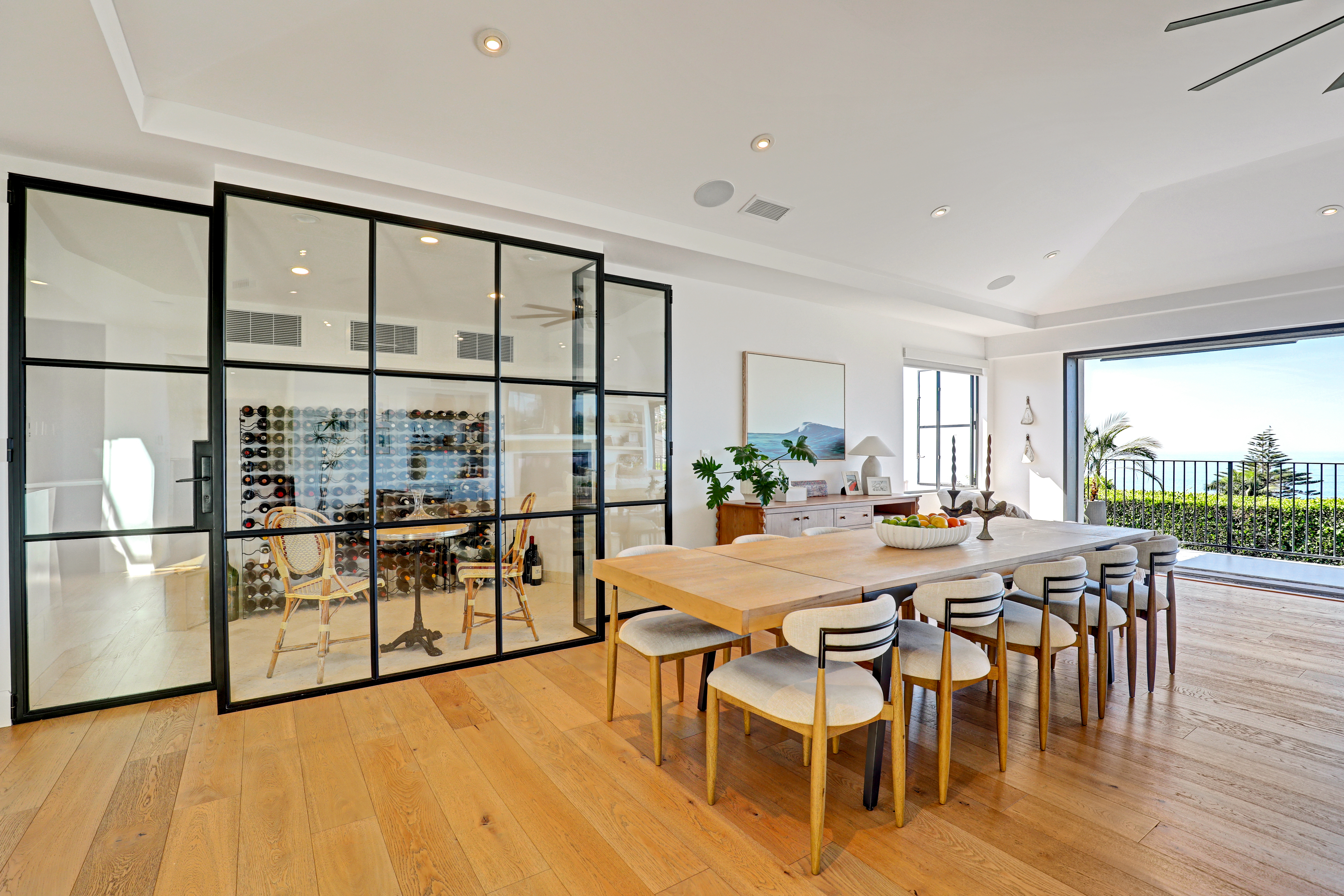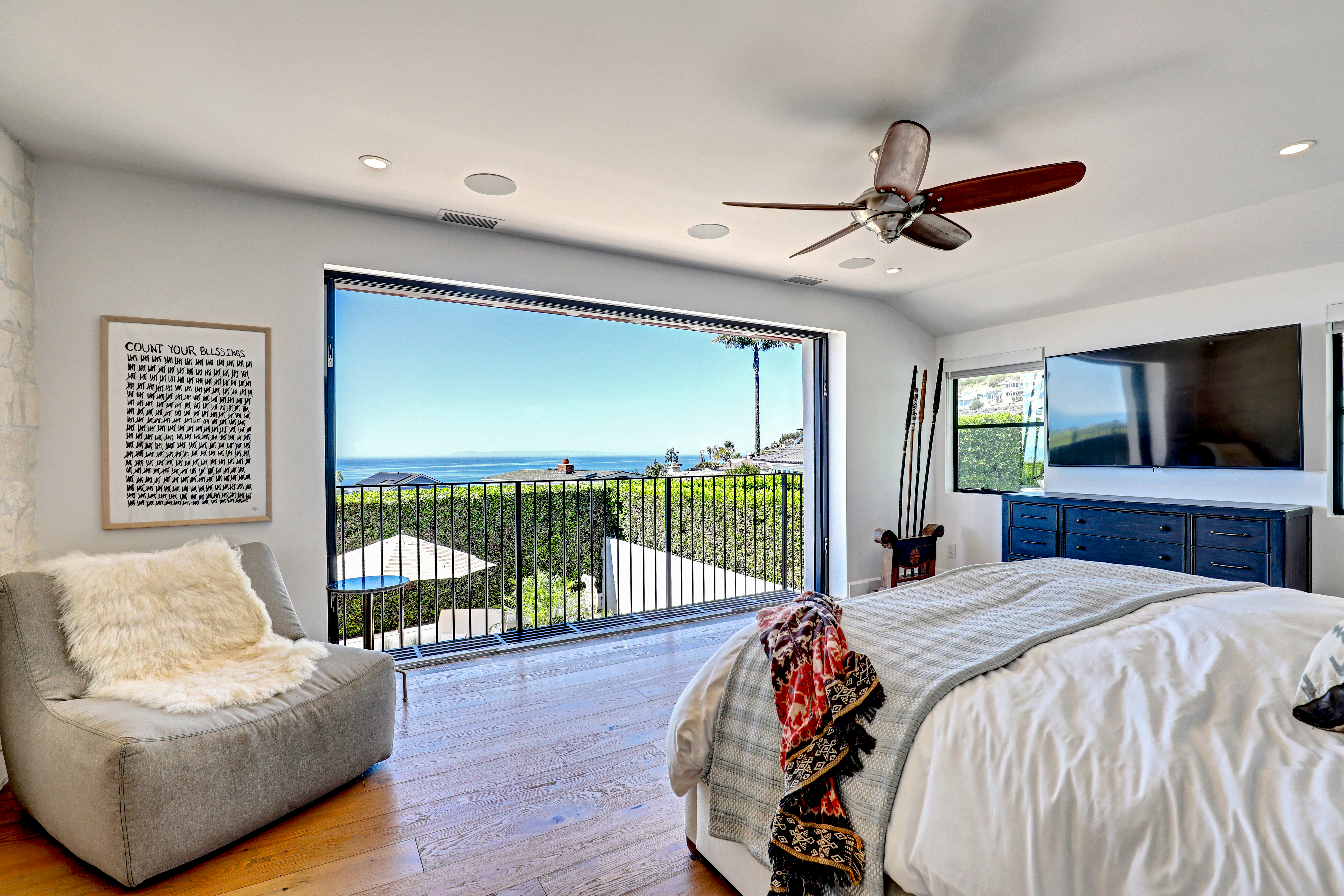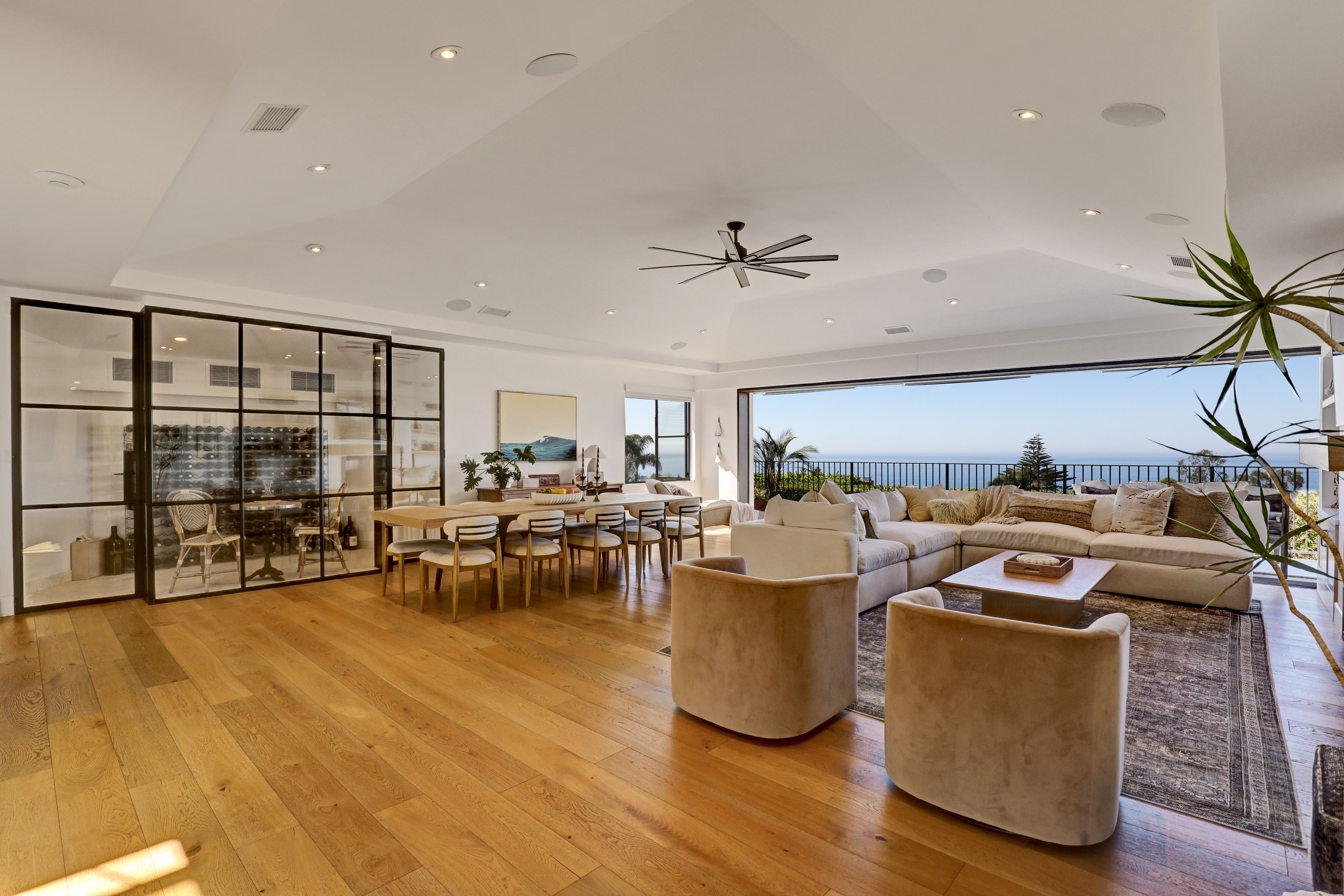 SUMMER RENTAL - 30 days minimum - Available June - September 2026. Nestled within the prestigious guard-gated community of Three Arch Bay, this contemporary masterpiece offers an exceptional summer vacation experience defined by luxury & design. Approximately 4,158 square feet, this 5-bed, 4.5-bath residence is thoughtfully designed with a reverse floor plan, allowing the home to live like a single story. The main living spaces—including the kitchen, living room, ocean-view deck, and front entertainment yard—are all located on the entry level. The open-concept living area is anchored by wide-plank white oak flooring & a retractable sliding glass wall that seamlessly blends indoor & outdoor living. Relax on the comfortable & cozy L-shaped sofa while enjoying sit-down panoramic views stretching across Catalina Island, San Clemente Island, & the iconic Dana Point Headlands. The chef’s kitchen is both functional & stunning—featuring a 10-burner gas range, double refrigerators, double dishwashers, dual sinks, & an oversized eat-up island. Elegant marble countertops, floating white oak shelving & custom cabinetry in white oak complete the space. Just off the kitchen & dining area, a temperature-controlled wine room sits behind a sleek custom glass wall, perfect for summertime entertainment. The entry-level primary suite is a private retreat, offering lay-down ocean views through a sliding glass wall. The suite includes a spacious walk-in closet with its own stackable laundry, as well as a luxurious ensuite bath with a large walk-in shower, a freestanding soaking tub, & a private enclosed water closet. An additional guest bedroom with ensuite & a stylish powder room complete the upper level—totaling two bedrooms, two ensuite baths, & a powder bath on the main floor. The floating staircase leads to the lower level, where a comfortable family TV & playroom opens directly to the backyard. Downstairs, you’ll find three additional generously sized bedrooms, including a fun bunk room with three beds, along with two full bathrooms & a separate full-sized laundry room. The backyard is designed for privacy & leisure, surrounded by lush green hedging & offering a variety of outdoor amenities including cornhole, ping pong, & a comfortable seating area. As an added bonus, the rental includes a golf cart for easy access to the private beach & community amenities, allowing you to fully enjoy the coastal lifestyle that makes Three Arch Bay so sought after.