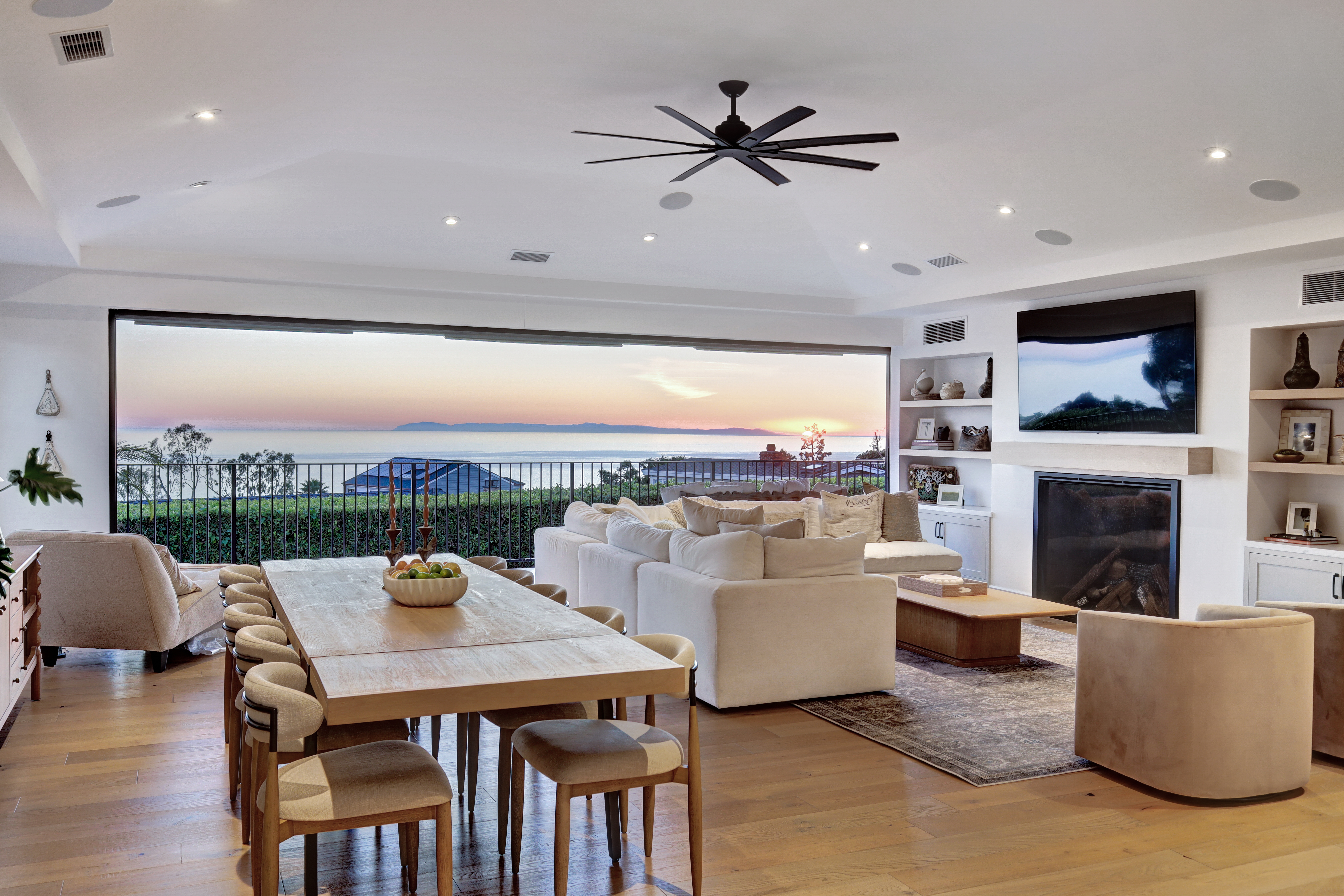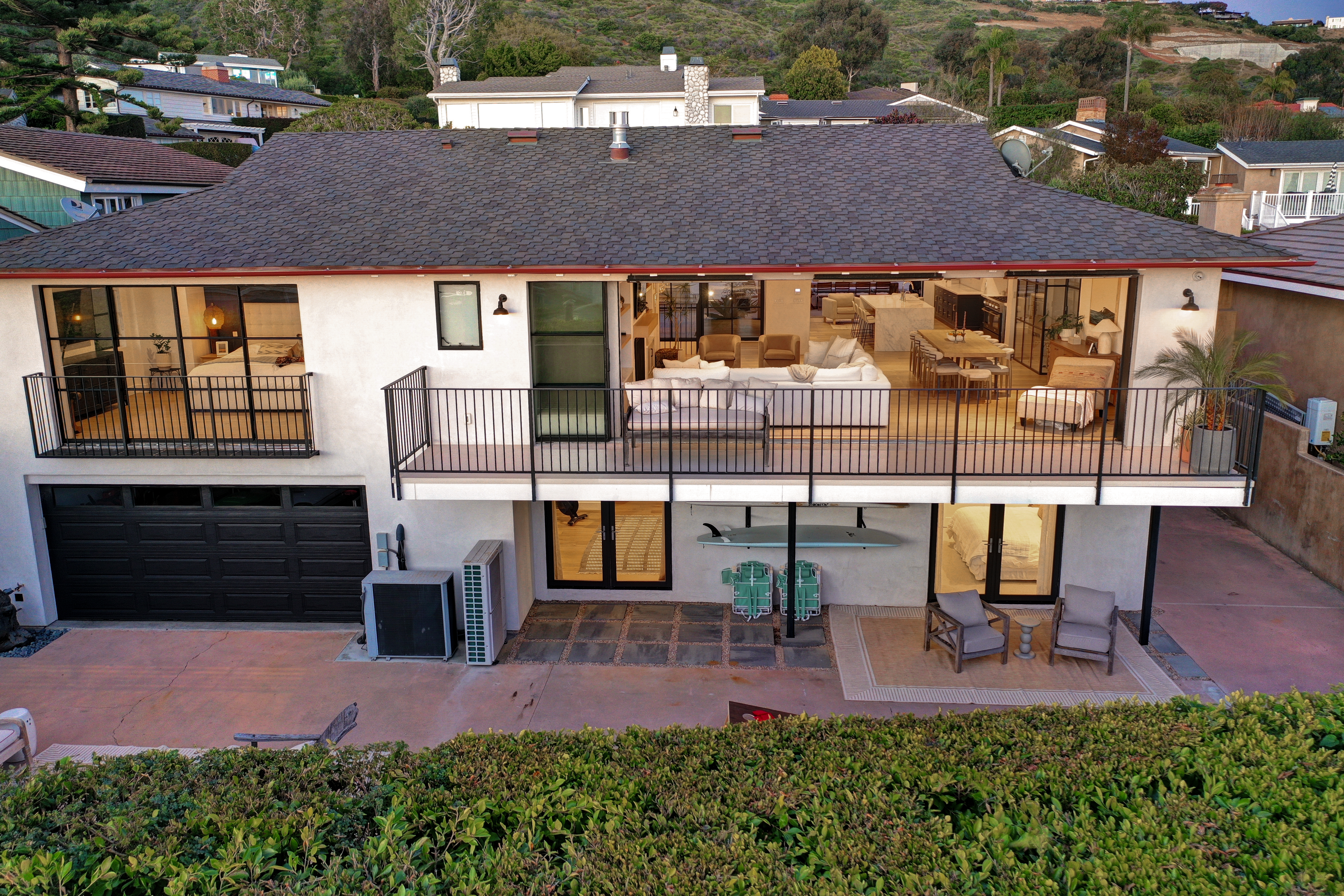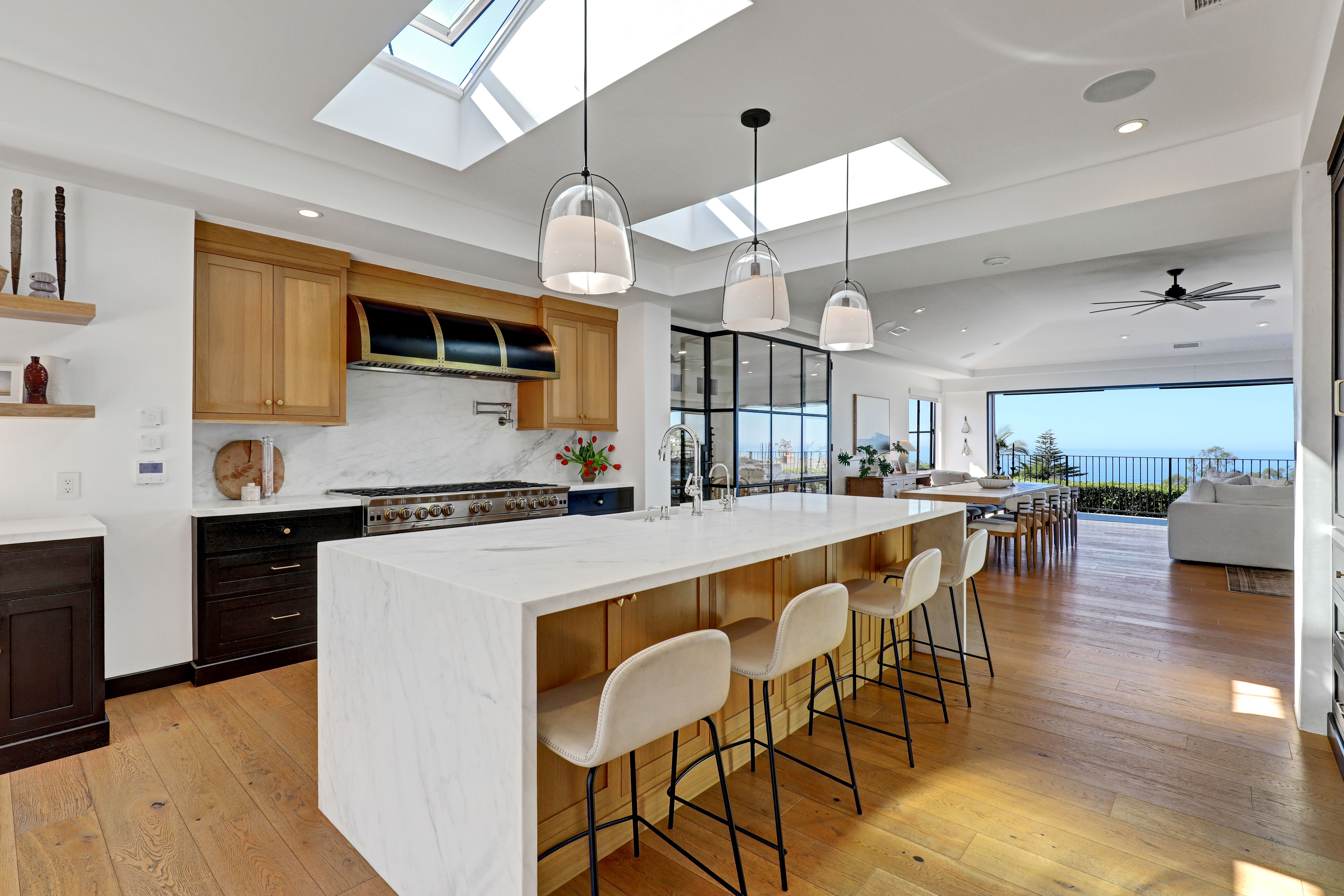 SUMMER RENTAL - 30 days minimum - Available June - September 2026. Nestled within the prestigious guard-gated community of Three Arch Bay, this contemporary masterpiece offers an exceptional summer vacation experience defined by luxury & design. Approximately 4,158 square feet, this 5-bed, 4.5-bath residence is thoughtfully designed with a reverse floor plan, allowing the home to live like a single story. The main living spaces—including the kitchen, living room, ocean-view deck, and front entertainment yard—are all located on the entry level. The open-concept living area is anchored by wide-plank white oak flooring & a retractable sliding glass wall that seamlessly blends indoor & outdoor living. Relax on the comfortable & cozy L-shaped sofa while enjoying sit-down panoramic views stretching across Catalina Island, San Clemente Island, & the iconic Dana Point Headlands. The chef’s kitchen is both functional & stunning—featuring a 10-burner gas range, double refrigerators, double dishwashers, dual sinks, & an oversized eat-up island. Elegant marble countertops, floating white oak shelving & custom cabinetry in white oak complete the space. Just off the kitchen & dining area, a temperature-controlled wine room sits behind a sleek custom glass wall, perfect for summertime entertainment. The entry-level primary suite is a private retreat, offering lay-down ocean views through a sliding glass wall. The suite includes a spacious walk-in closet with its own stackable laundry, as well as a luxurious ensuite bath with a large walk-in shower, a freestanding soaking tub, & a private enclosed water closet. An additional guest bedroom with ensuite & a stylish powder room complete the upper level—totaling two bedrooms, two ensuite baths, & a powder bath on the main floor. The floating staircase leads to the lower level, where a comfortable family TV & playroom opens directly to the backyard. Downstairs, you’ll find three additional generously sized bedrooms, including a fun bunk room with three beds, along with two full bathrooms & a separate full-sized laundry room. The backyard is designed for privacy & leisure, surrounded by lush green hedging & offering a variety of outdoor amenities including cornhole, ping pong, & a comfortable seating area. As an added bonus, the rental includes a golf cart for easy access to the private beach & community amenities, allowing you to fully enjoy the coastal lifestyle that makes Three Arch Bay so sought after.