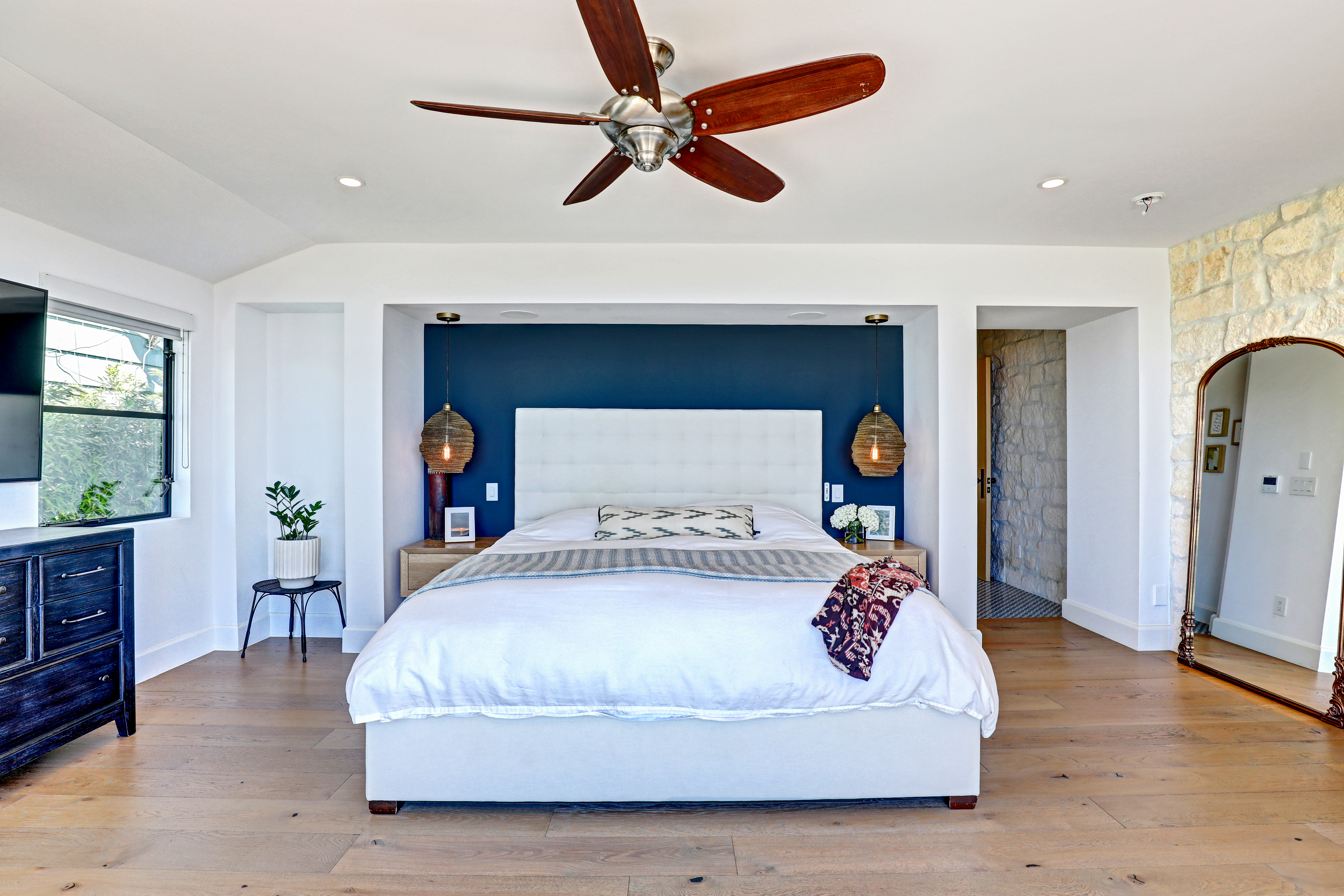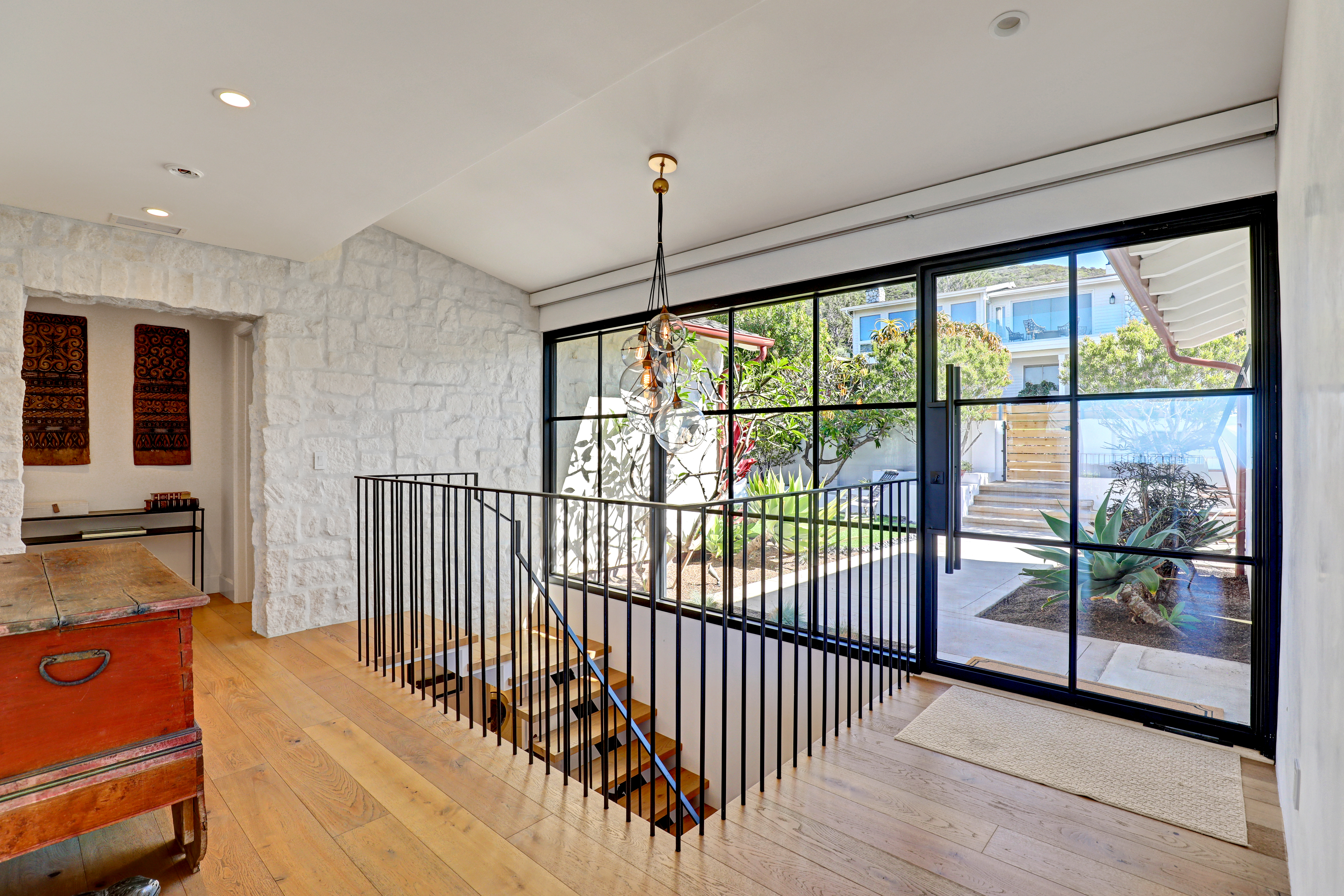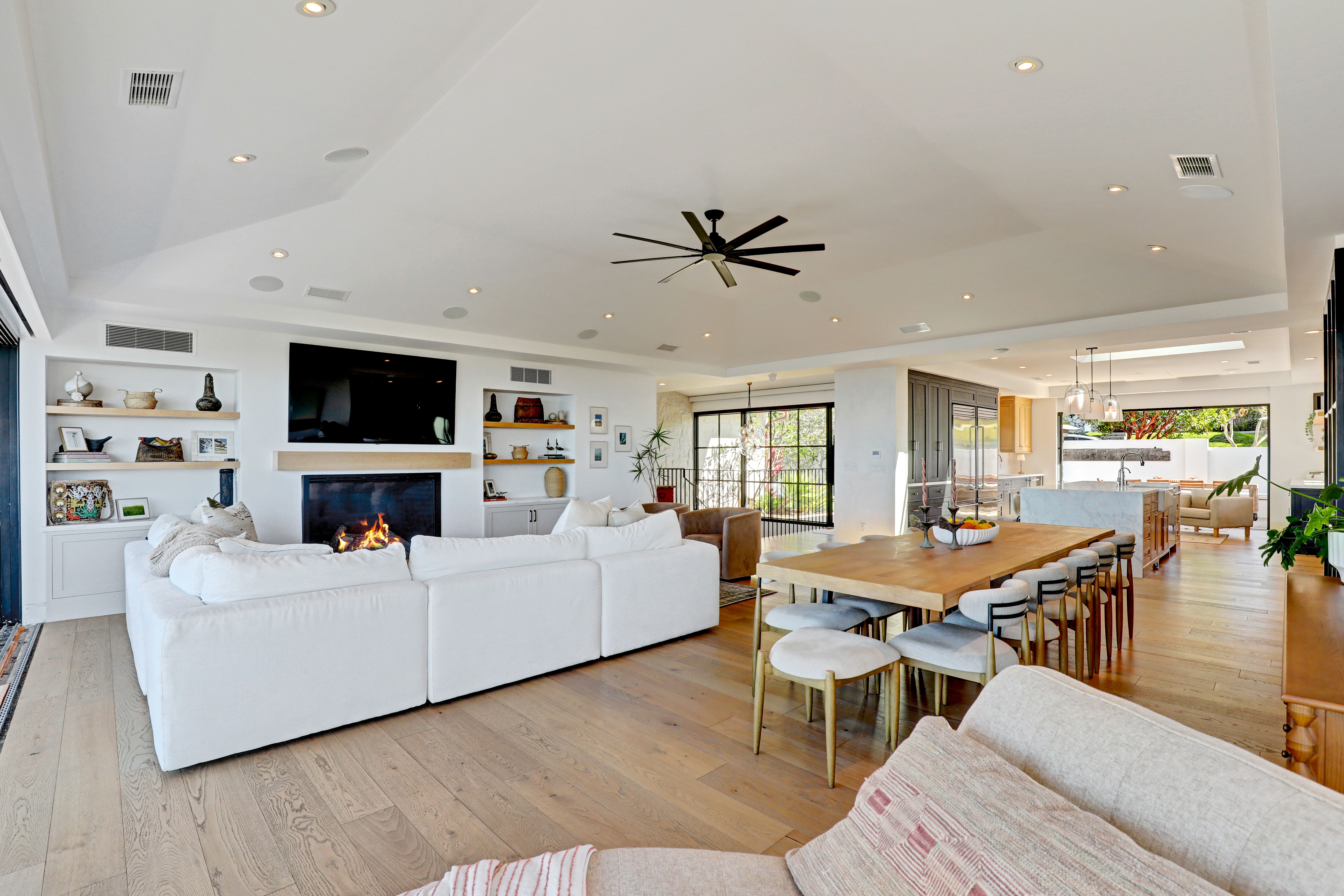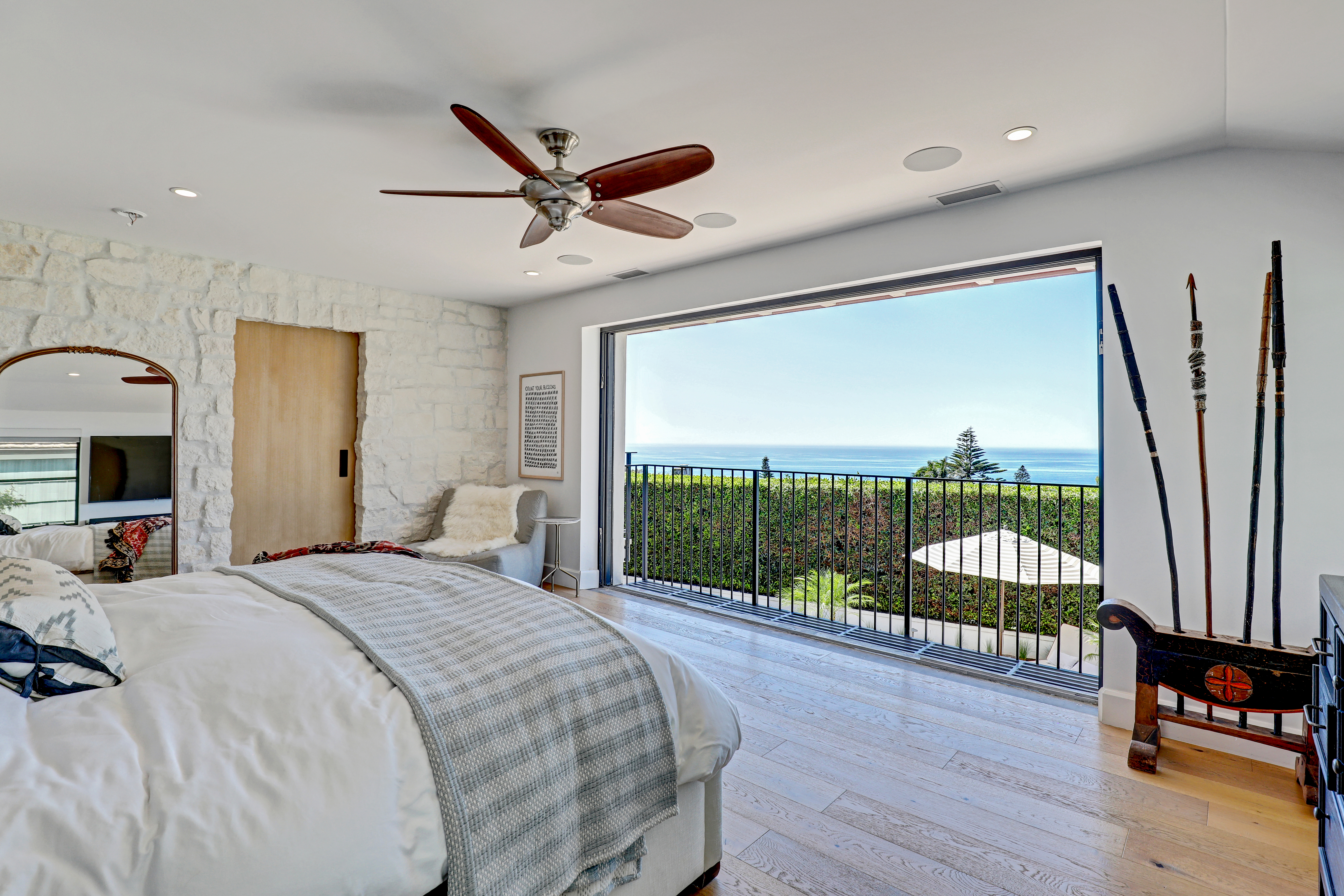 SUMMER RENTAL - 30 days minimum - Available June - September 2026. Nestled within the prestigious guard-gated community of Three Arch Bay, this contemporary masterpiece offers an exceptional summer vacation experience defined by luxury & design. Approximately 4,158 square feet, this 5-bed, 4.5-bath residence is thoughtfully designed with a reverse floor plan, allowing the home to live like a single story. The main living spaces—including the kitchen, living room, ocean-view deck, and front entertainment yard—are all located on the entry level. The open-concept living area is anchored by wide-plank white oak flooring & a retractable sliding glass wall that seamlessly blends indoor & outdoor living. Relax on the comfortable & cozy L-shaped sofa while enjoying sit-down panoramic views stretching across Catalina Island, San Clemente Island, & the iconic Dana Point Headlands. The chef’s kitchen is both functional & stunning—featuring a 10-burner gas range, double refrigerators, double dishwashers, dual sinks, & an oversized eat-up island. Elegant marble countertops, floating white oak shelving & custom cabinetry in white oak complete the space. Just off the kitchen & dining area, a temperature-controlled wine room sits behind a sleek custom glass wall, perfect for summertime entertainment. The entry-level primary suite is a private retreat, offering lay-down ocean views through a sliding glass wall. The suite includes a spacious walk-in closet with its own stackable laundry, as well as a luxurious ensuite bath with a large walk-in shower, a freestanding soaking tub, & a private enclosed water closet. An additional guest bedroom with ensuite & a stylish powder room complete the upper level—totaling two bedrooms, two ensuite baths, & a powder bath on the main floor. The floating staircase leads to the lower level, where a comfortable family TV & playroom opens directly to the backyard. Downstairs, you’ll find three additional generously sized bedrooms, including a fun bunk room with three beds, along with two full bathrooms & a separate full-sized laundry room. The backyard is designed for privacy & leisure, surrounded by lush green hedging & offering a variety of outdoor amenities including cornhole, ping pong, & a comfortable seating area. As an added bonus, the rental includes a golf cart for easy access to the private beach & community amenities, allowing you to fully enjoy the coastal lifestyle that makes Three Arch Bay so sought after.
