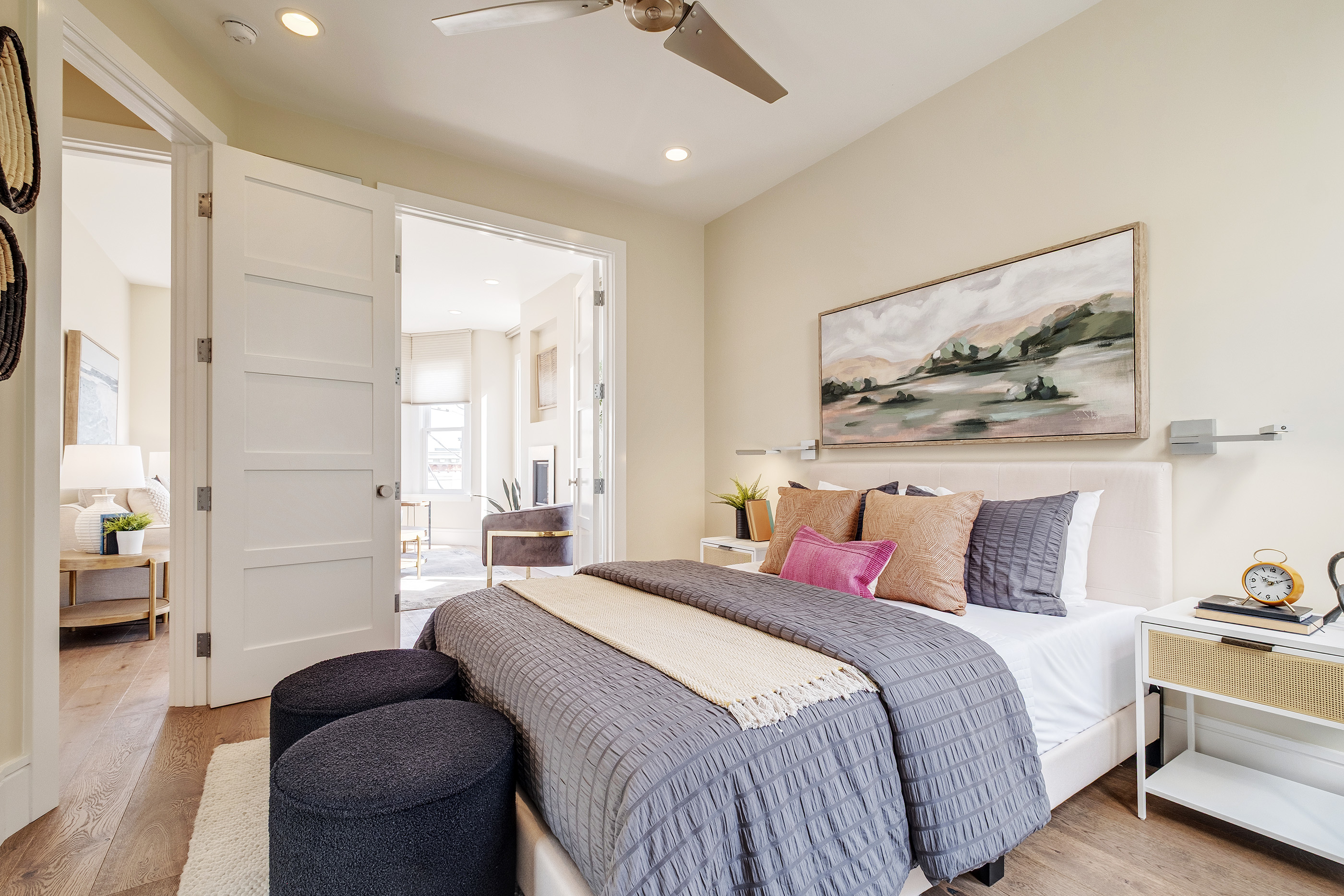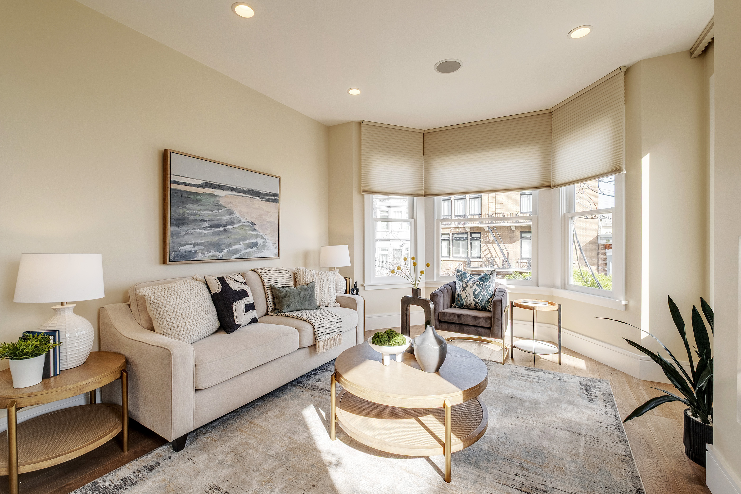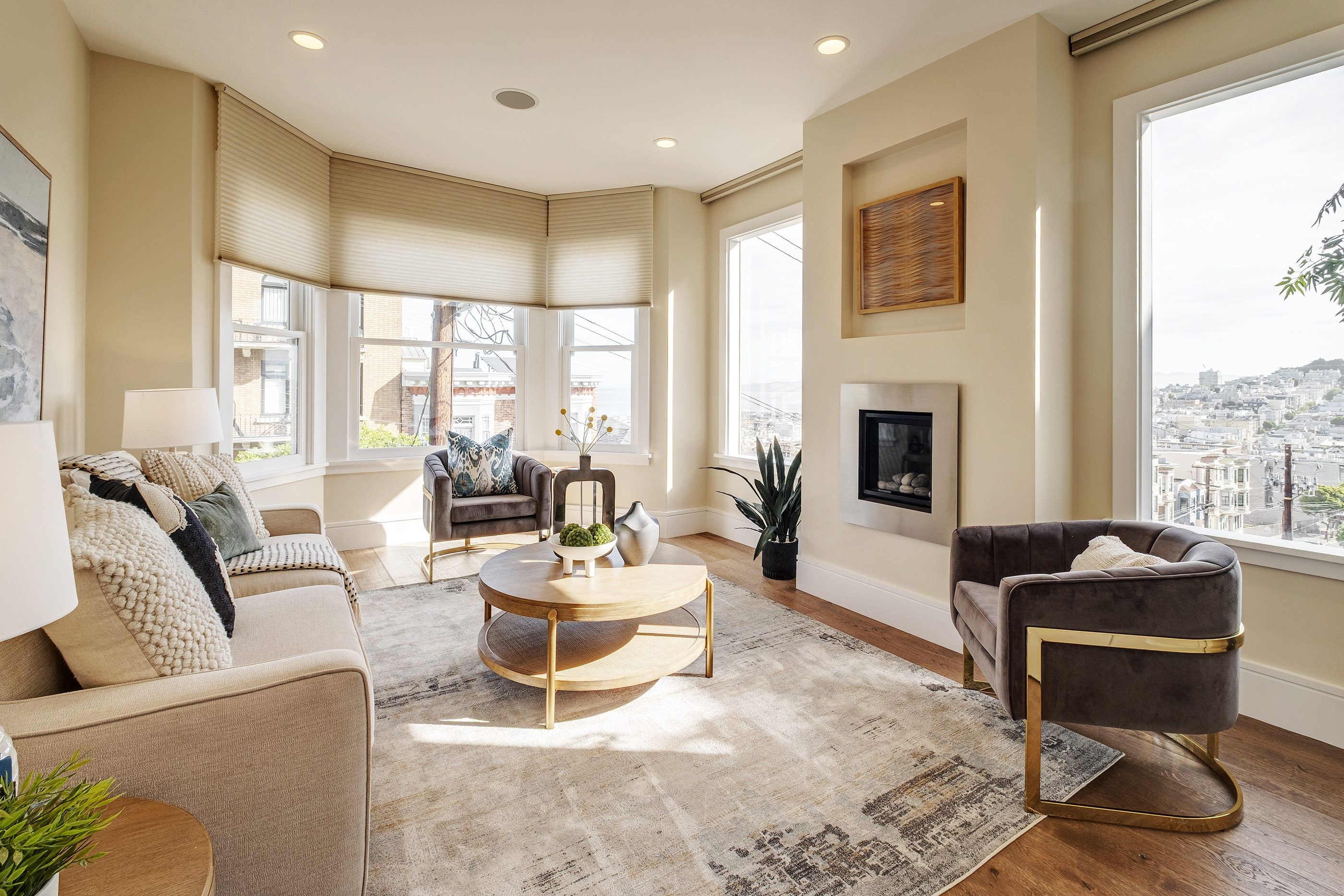 Set atop a boutique four unit building on a quiet Russian Hill block, this down to the studs remodeled top floor 2 bedroom, 1.5 bath condo offers 9+ foot ceilings, windows on three sides, abundant natural light, and sweeping Bay and Coit Tower views. The flexible and efficient layout features wide plank wood floors, huge barn-style door, a contemporary bath with walk in shower and towel warmer, and an additional powder room.
