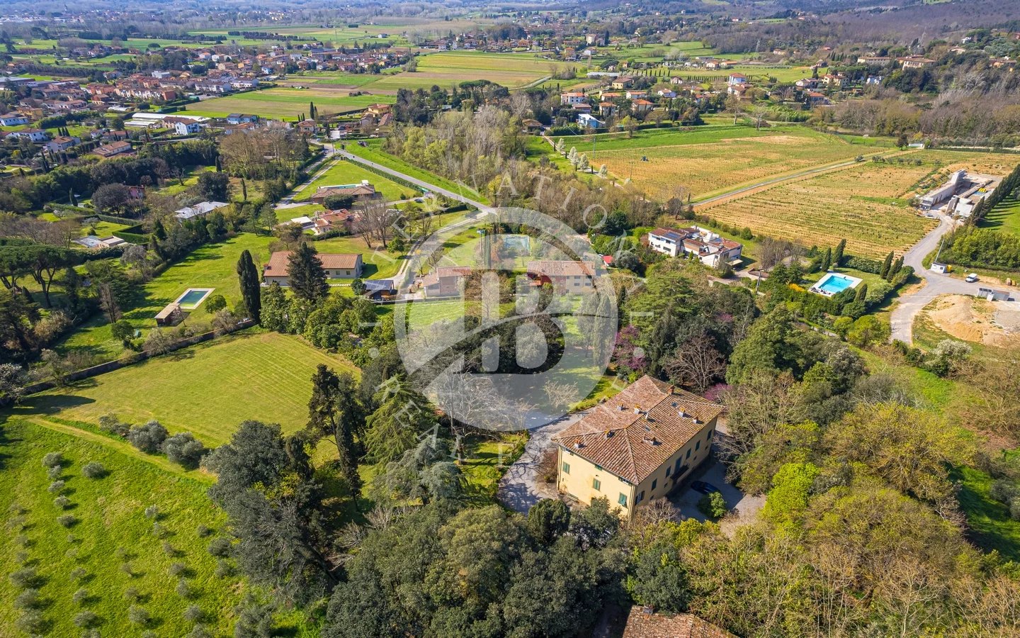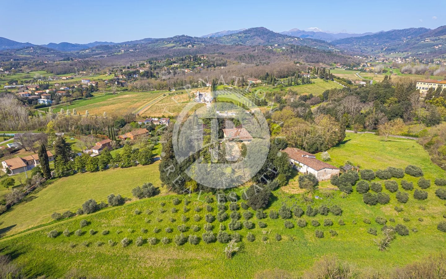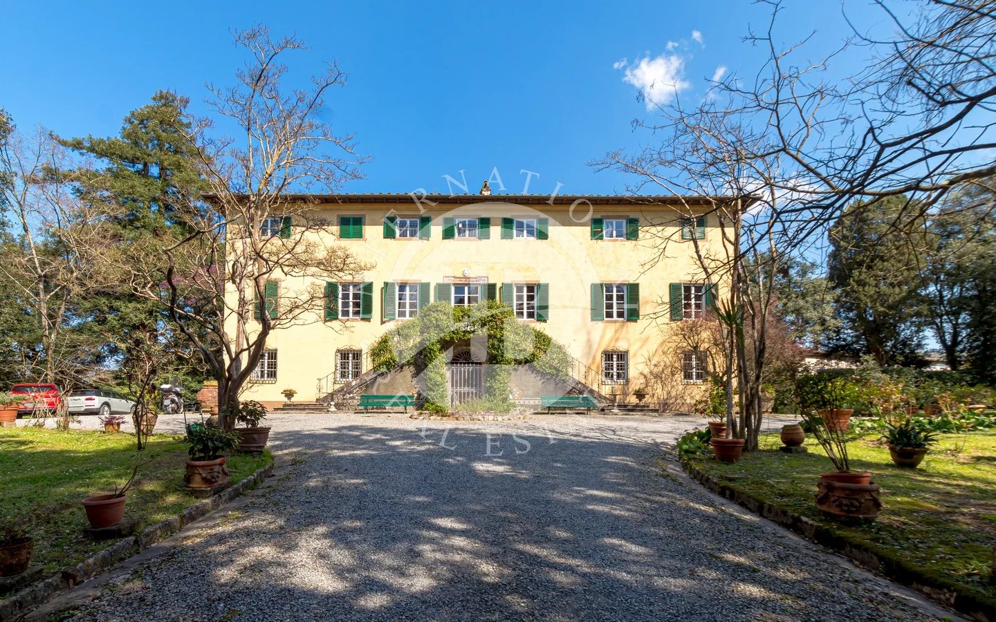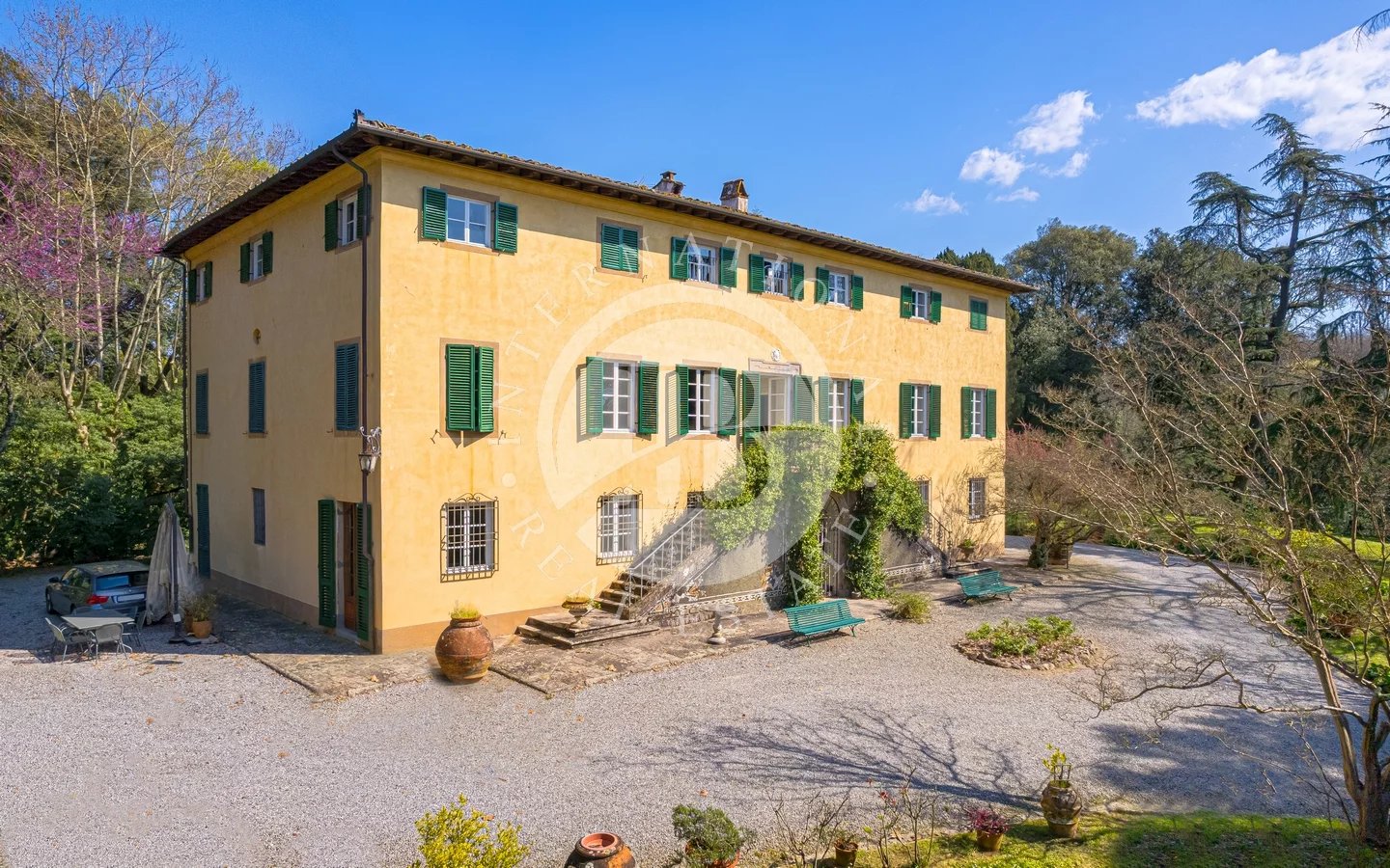 Situated in a privileged panoramic position on the first hills surrounding Lucca's historic center, this prestigious property is a superb example of Lucchese historical architecture. The main residence spans 900 sqm across three levels, all conveniently connected by an internal lift. The property underwent a meticulous restoration in the 1990s, which preserved the original materials and period details, such as the elegant frescoes in the main reception hall and numerous stone fireplaces.The villa stands out for its functional layout: the piano nobile, accessible via an external double staircase, hosts grand reception rooms and an initial sleeping area; the ground and second floors complete the residence with additional living rooms, eat-in kitchens, and several bedrooms.The estate is further enriched by various outbuildings offering significant development potential. These include a large barn and two smaller structures—all currently in need of renovation—providing flexible space for customization. The property is immersed in a 4-hectare park featuring centuries-old trees and a productive olive grove with 220 trees, ensuring maximum privacy and an atmosphere of absolute tranquility just a short distance from the city walls.Lucca is internationally renowned for its imposing Renaissance walls, which remain entirely intact and have been transformed into a striking elevated urban park encircling the entire historic center. Within the walls, the city preserves its untouched medieval fabric, characterized by numerous towers and iconic squares, most notably Piazza dell'Anfiteatro, built upon the ancient remains of a Roman structure and retaining its unique elliptical shape.5 km from Lucca30 km from Pisa Airport38 km from Forte dei Marmi84 km from Florence
