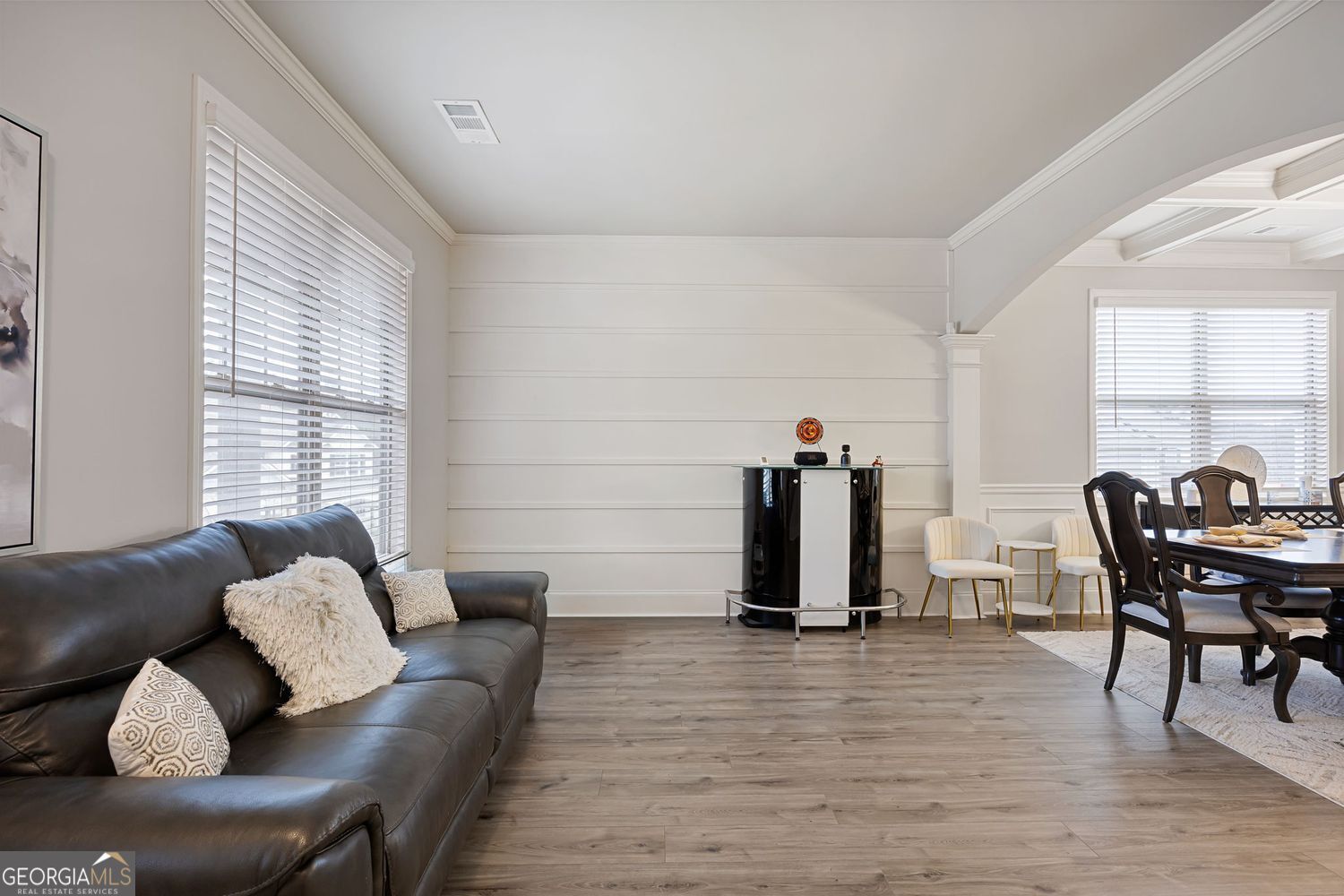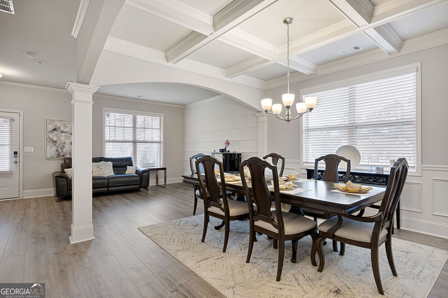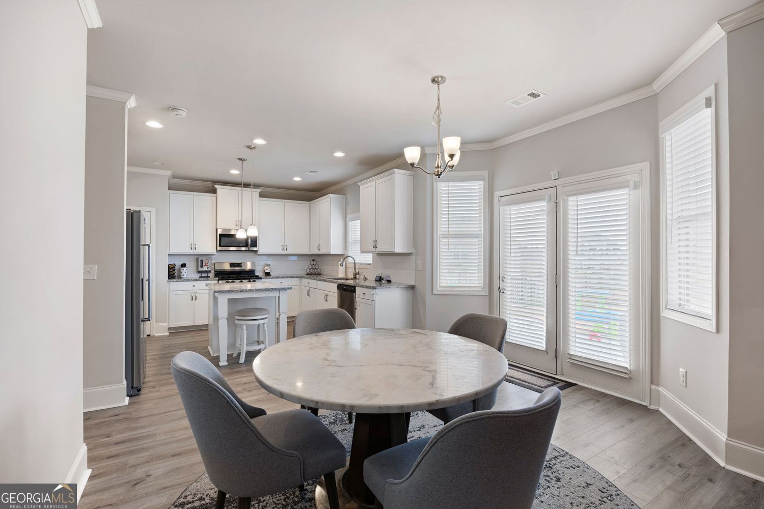 This Beautiful Herrington floorplan home with its Stacked Stone and Baton Board exterior and welcoming covered front porch is just a start of what this exquisite home has to offer. Step inside to a beautifully appointed main level where the living room with its accent wall flows seamlessly into a formal dining room adorned with a coffered ceiling, wainscoting, crown molding and beautiful archways - creating an ideal setting for both intimate gatherings and upscale entertaining,. The kitchen features crisp white cabinetry, pendant lighting over the island which has additional seating, stainless appliances including a new KitchenAid refrigerator, gas cooking, granite countertops, recessed lighting, pantry, all opening effortlessly onto the breakfast area and inviting family room. The family room exudes warmth and style with a striking stone gas fireplace and raised hearth, and a custom accent wall - perfect for relaxing evenings at home. Upstairs, retreat to the expansive primary suite complete with a tray ceiling, spacious sitting area, and a spa inspired bath offering a soaking tub, large tiled shower, double vanities and a custom walk-in closet. Three additional secondary bedrooms, a large bathroom with double vanities, and a loft area provide flexibility for guests, work or play. Upgrades, including new luxury vinyl plank flooring, stylish accent walls enhance the home's modern appeal. Step outside to enjoy a spacious fenced in backyard with an extended patio - ideal for outdoor entertaining or quiet relaxation. Located in Great Sky, a highly sought after community, residents enjoy resort like amenities including three pools, basketball, tennis and pickleball courts, playground, clubhouse and walking trails - delivering a lifestyle of comfort, convenience and leisure.