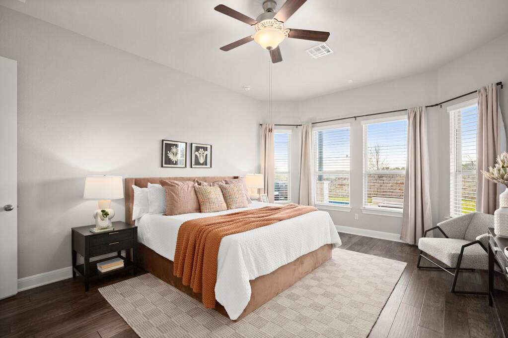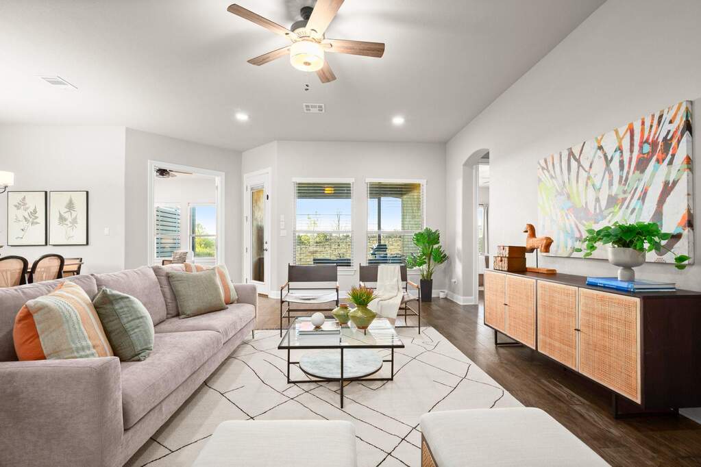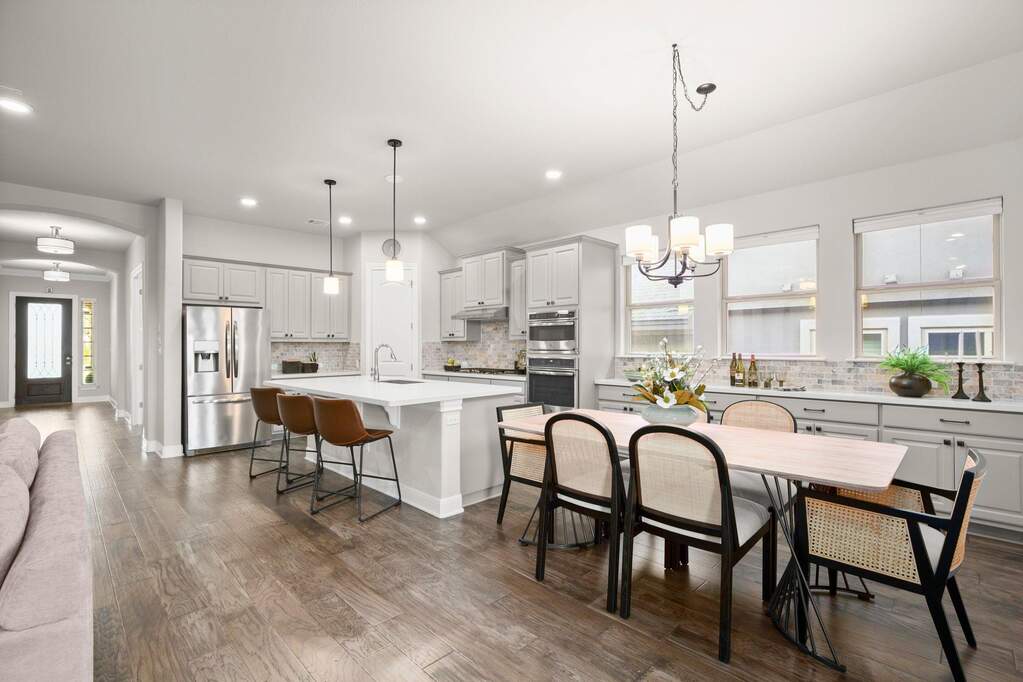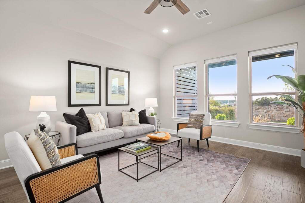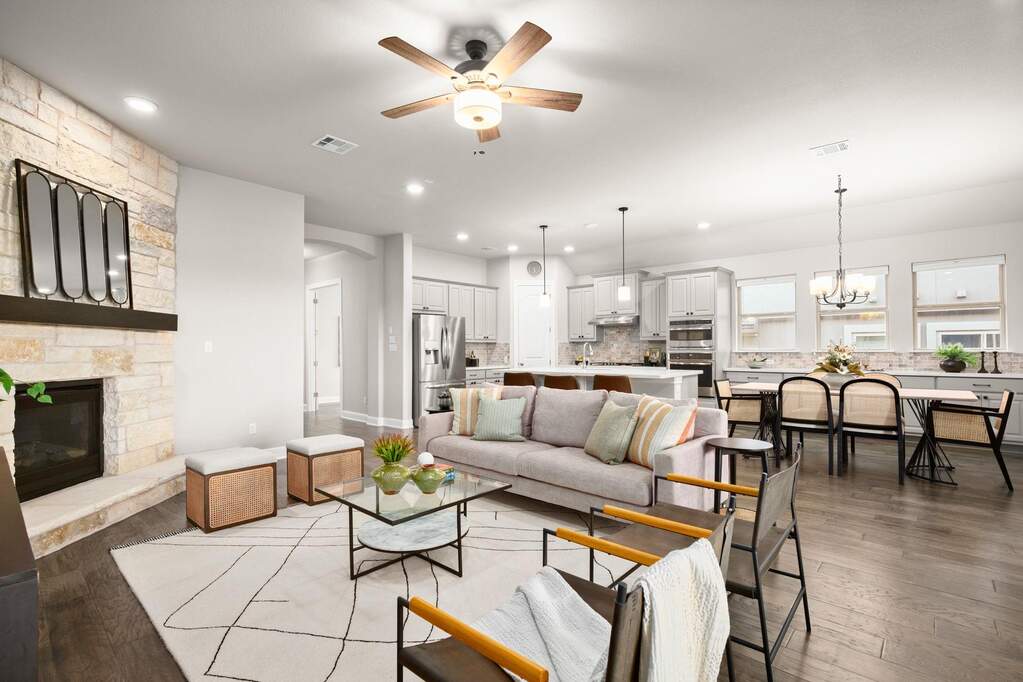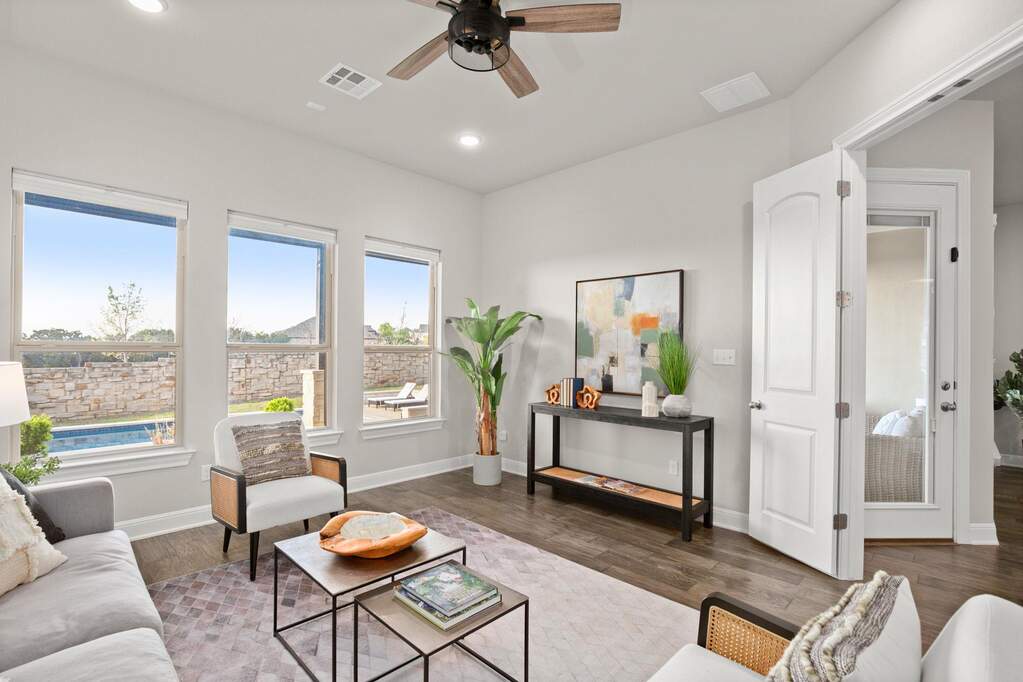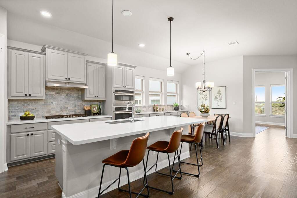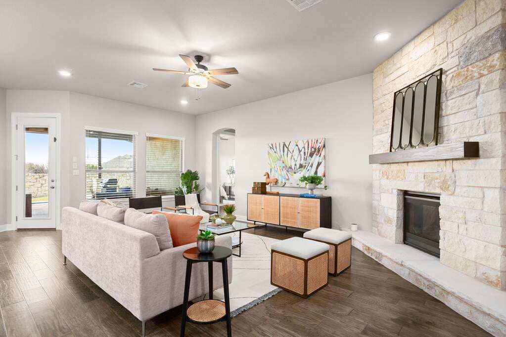 Welcome to this beautifully appointed single-story home located on a quiet cul-de-sac in the highly sought-after Travisso community, where Hill Country views and a private backyard oasis set the stage for exceptional living. Thoughtfully designed for both comfort and functionality, the open-concept layout is ideal for everyday living and effortless entertaining. The gourmet kitchen showcases a large quartz island with a breakfast bar and flows seamlessly into the dining area and family room, anchored by a custom stone fireplace. A dedicated home office provides the perfect remote-work setup, while a spacious flex room offers versatility as a second office, media room, game room, or guest retreat. The luxurious primary suite serves as a peaceful escape, featuring expansive windows and tranquil views. Step outside to an expanded covered patio overlooking a sparkling pool, with the special treat of breathtaking sunset views-an inviting outdoor retreat perfect for dining, relaxing, and enjoying the scenic Hill Country backdrop. Additional highlights include a three-car garage with epoxy flooring and custom storage, along with enhanced insulation throughout the home for improved energy efficiency and year-round comfort. Residents of Travisso enjoy resort-style amenities, including the Palazzo and Forum clubhouses, resort pools and splash pads, a fitness center, tennis and pickleball courts, playgrounds, soccer field, basketball courts, beach volleyball, and miles of hike-and-bike trails. The community also offers easy access to Crystal Falls Golf Club, an 18-hole municipal golf course. With a vibrant community calendar, convenient access to H-E-B, Costco, Lake Travis, and Northwest Austin's tech corridor, and zoning to highly rated Leander ISD schools, this home offers an unmatched blend of luxury, convenience, and lifestyle.