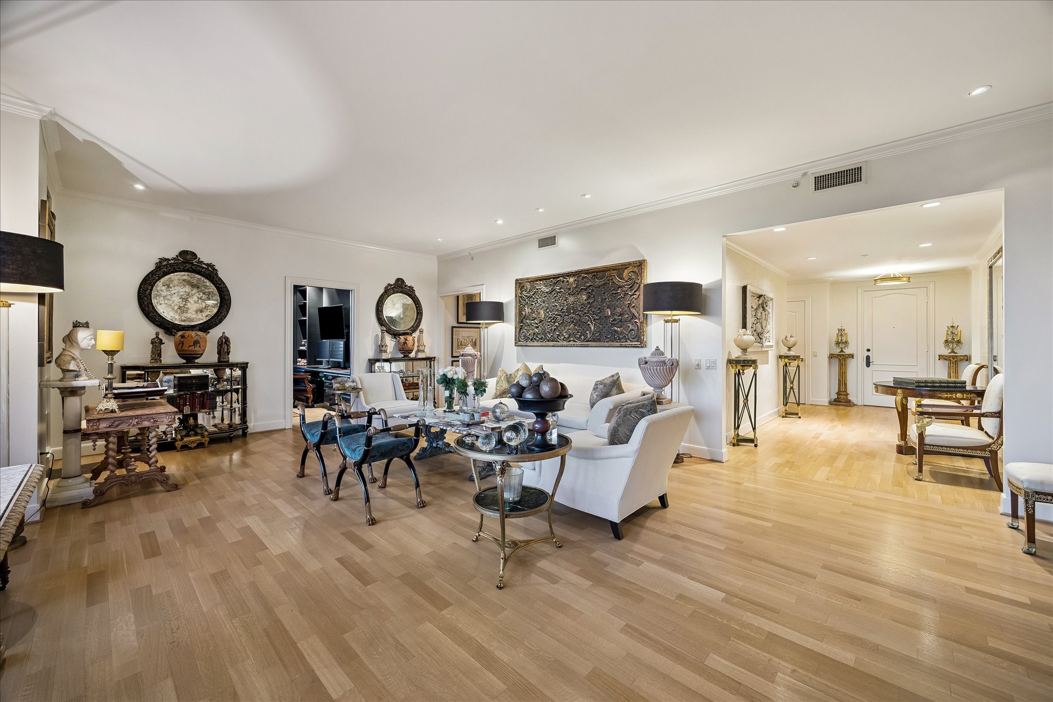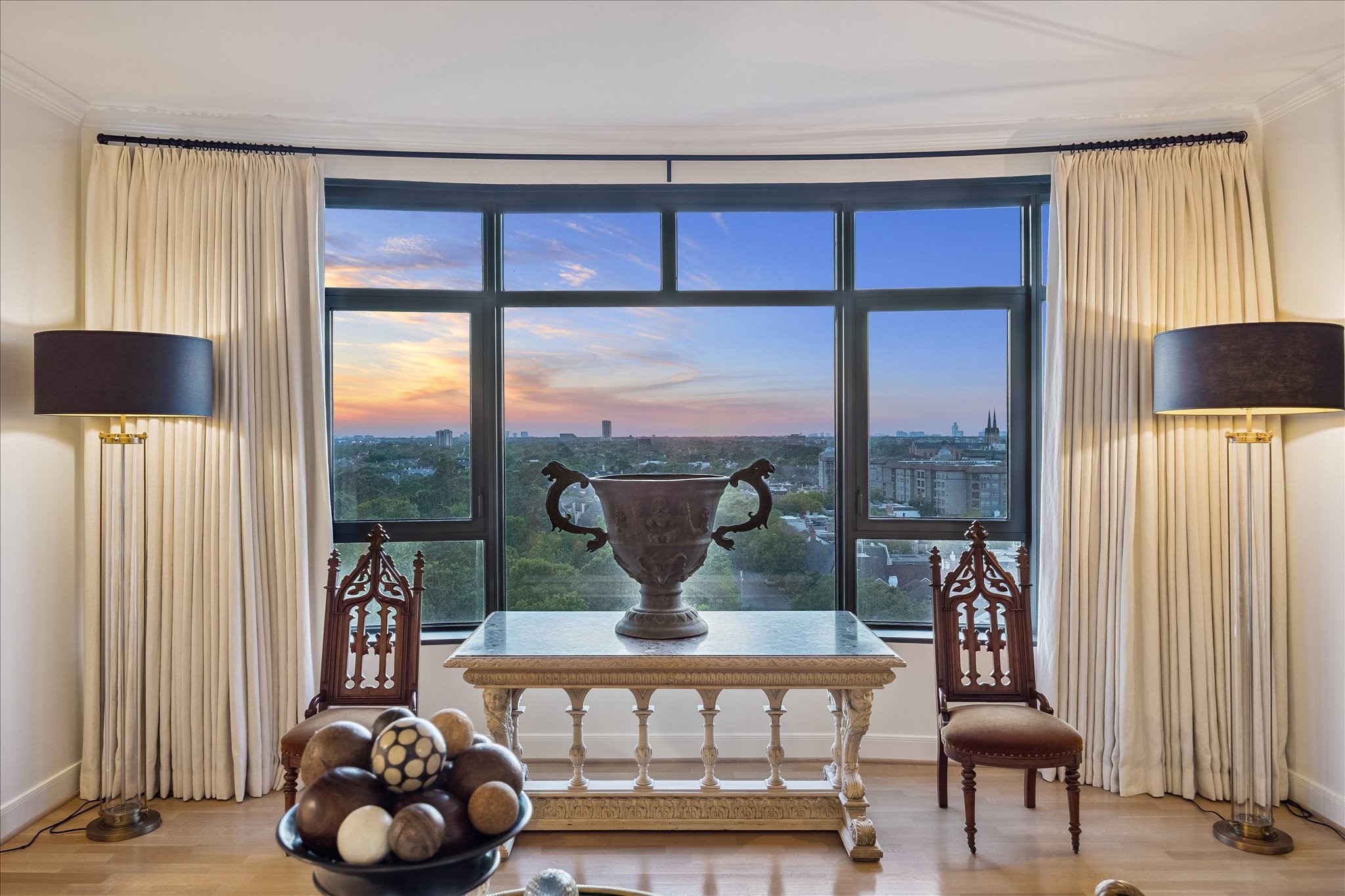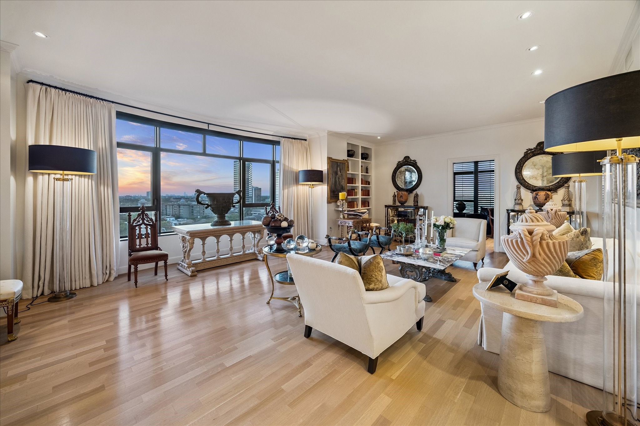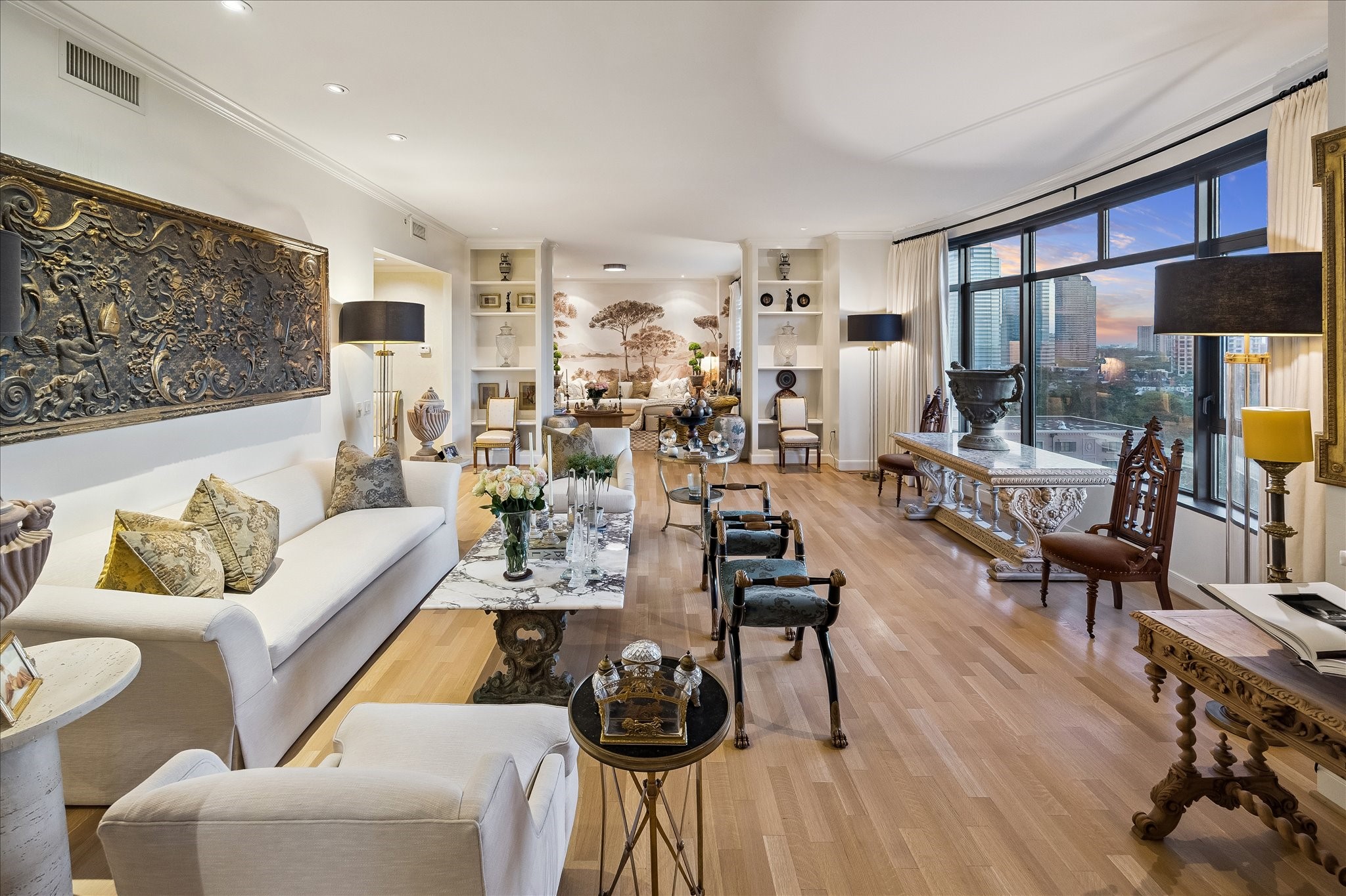 Chic 10th floor residence offering elegant and timeless European flare.Fully renovated with Segreto plaster accents,hardwoods,custom draperies,designer fixtures & lighting.Stunning Island kitchen with La Cornue induction range w/double ovens,Sub Zero,exquisite Viola Carrera slab marble,Chambord farmhouse sink & custom cabinetry w/abundant storage.Dining area w/private balcony access.Formal entry,expansive living room w/built-in shelving,den w/designer landscape mural,balcony access,custom shutters & library w/built-in desk,shelving & cabinetry.Luxurious primary suite w/sitting area,island walk-in closet,renovated primary bathroom w/natural white Onyx counters,freestanding tub & separate shower.Beautifully manicured grounds, fitness center,pool, tennis,dog park,private walking tralls,party rooms all within walking distance to shopping & dining at Uptown Park. Full service staff - 24 hour guarded entry, doorman, valet, porter & concierge. Panoramic Northwest sunset views.