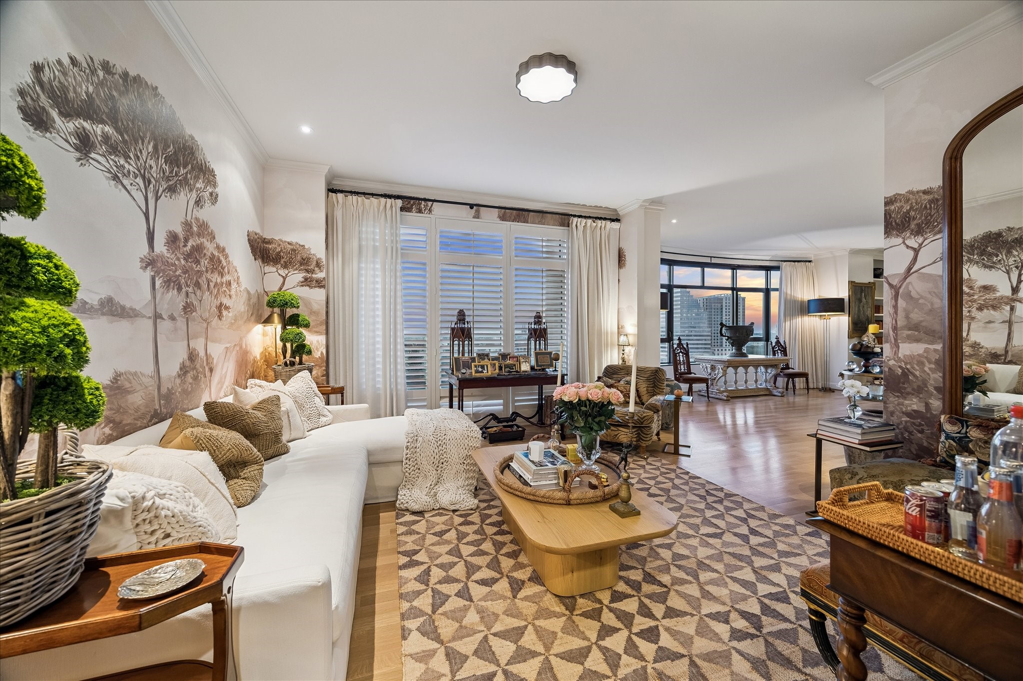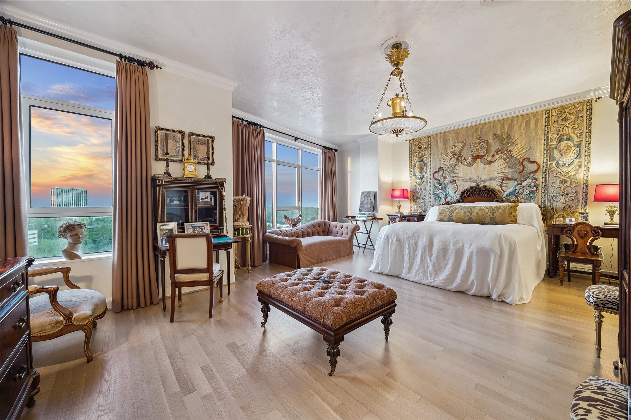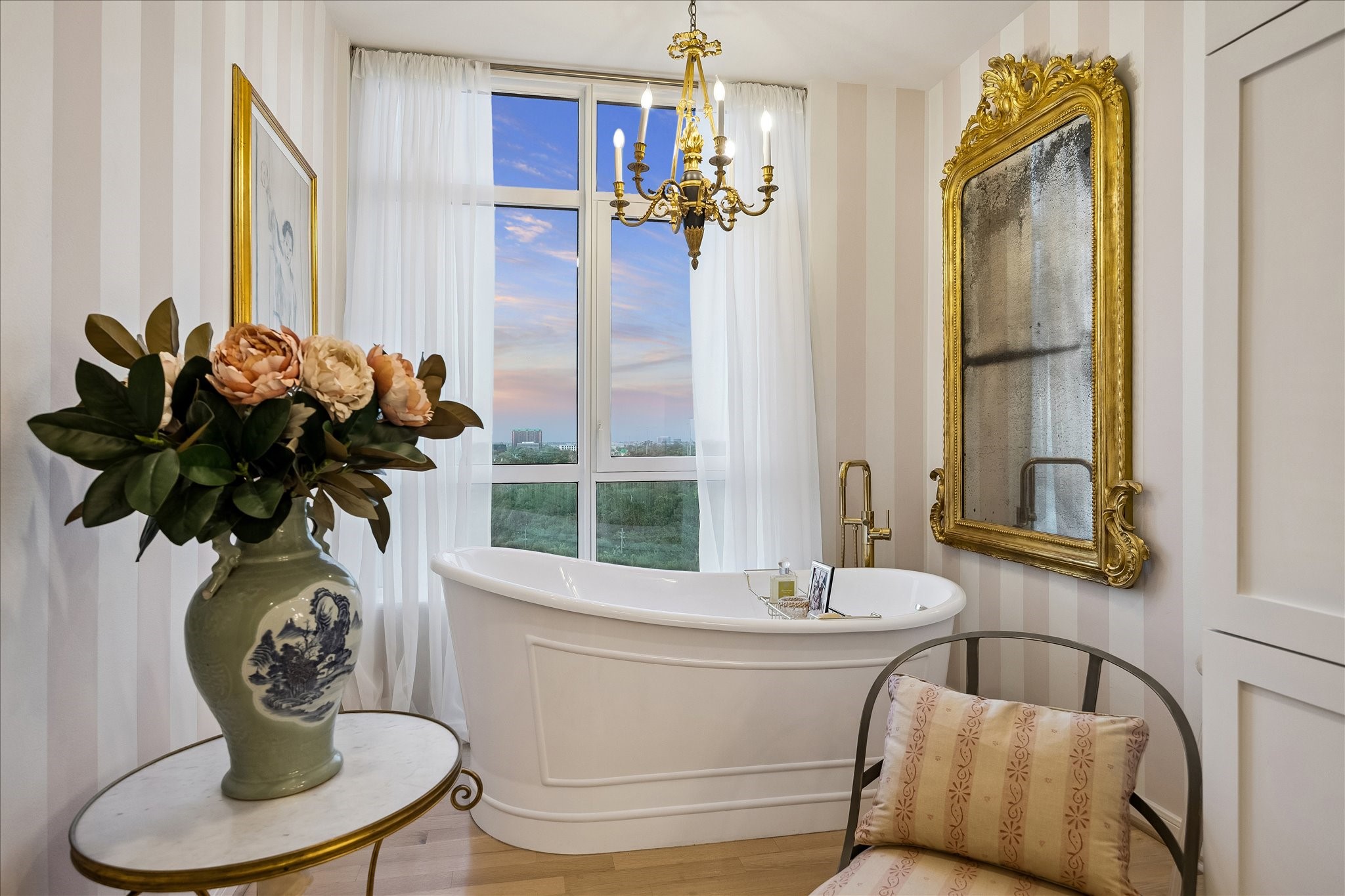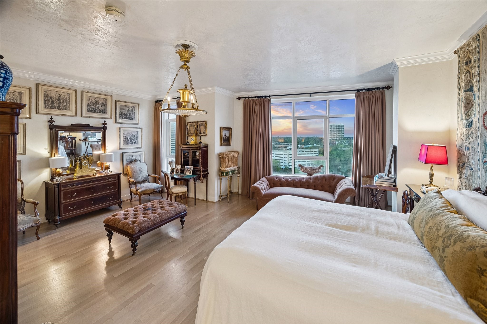 Chic 10th floor residence offering elegant and timeless European flare.Fully renovated with Segreto plaster accents,hardwoods,custom draperies,designer fixtures & lighting.Stunning Island kitchen with La Cornue induction range w/double ovens,Sub Zero,exquisite Viola Carrera slab marble,Chambord farmhouse sink & custom cabinetry w/abundant storage.Dining area w/private balcony access.Formal entry,expansive living room w/built-in shelving,den w/designer landscape mural,balcony access,custom shutters & library w/built-in desk,shelving & cabinetry.Luxurious primary suite w/sitting area,island walk-in closet,renovated primary bathroom w/natural white Onyx counters,freestanding tub & separate shower.Beautifully manicured grounds, fitness center,pool, tennis,dog park,private walking tralls,party rooms all within walking distance to shopping & dining at Uptown Park. Full service staff - 24 hour guarded entry, doorman, valet, porter & concierge. Panoramic Northwest sunset views.