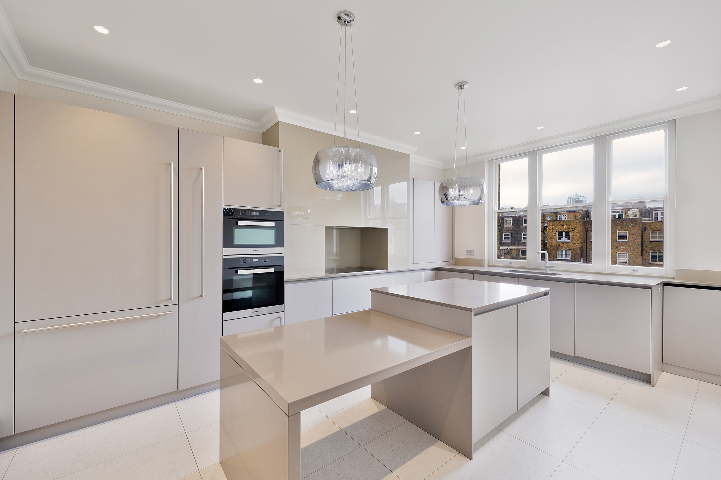 The apartment unfolds around a series of generous reception rooms. A vast double reception of around 36 ft flows means there are dedicated living and dining rooms, while a separate study offers privacy for work or quiet reading. The kitchen is arranged around an island with a breakfast bar and fitted with Miele appliances. A separate utility room adds to the practical layout.