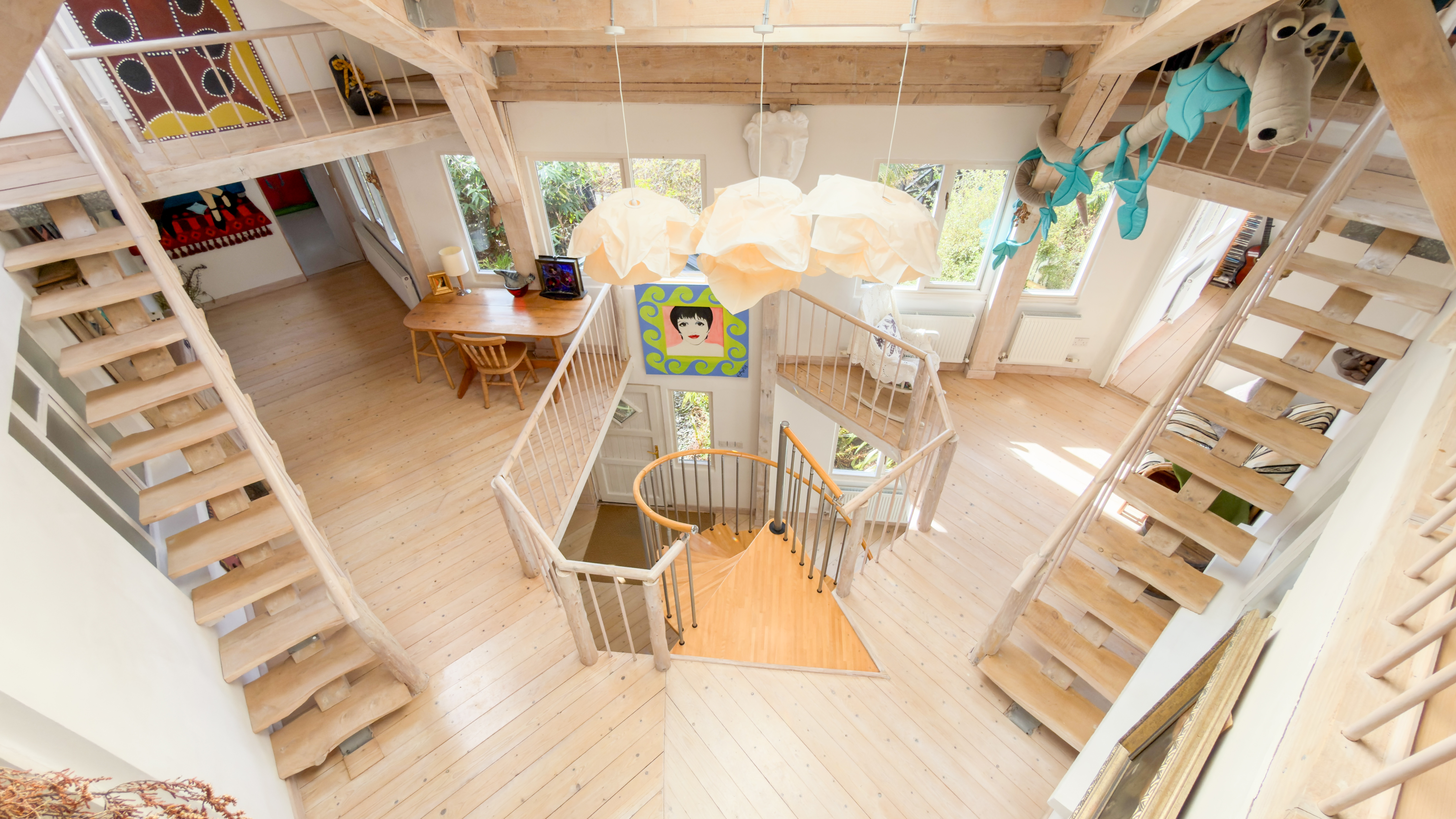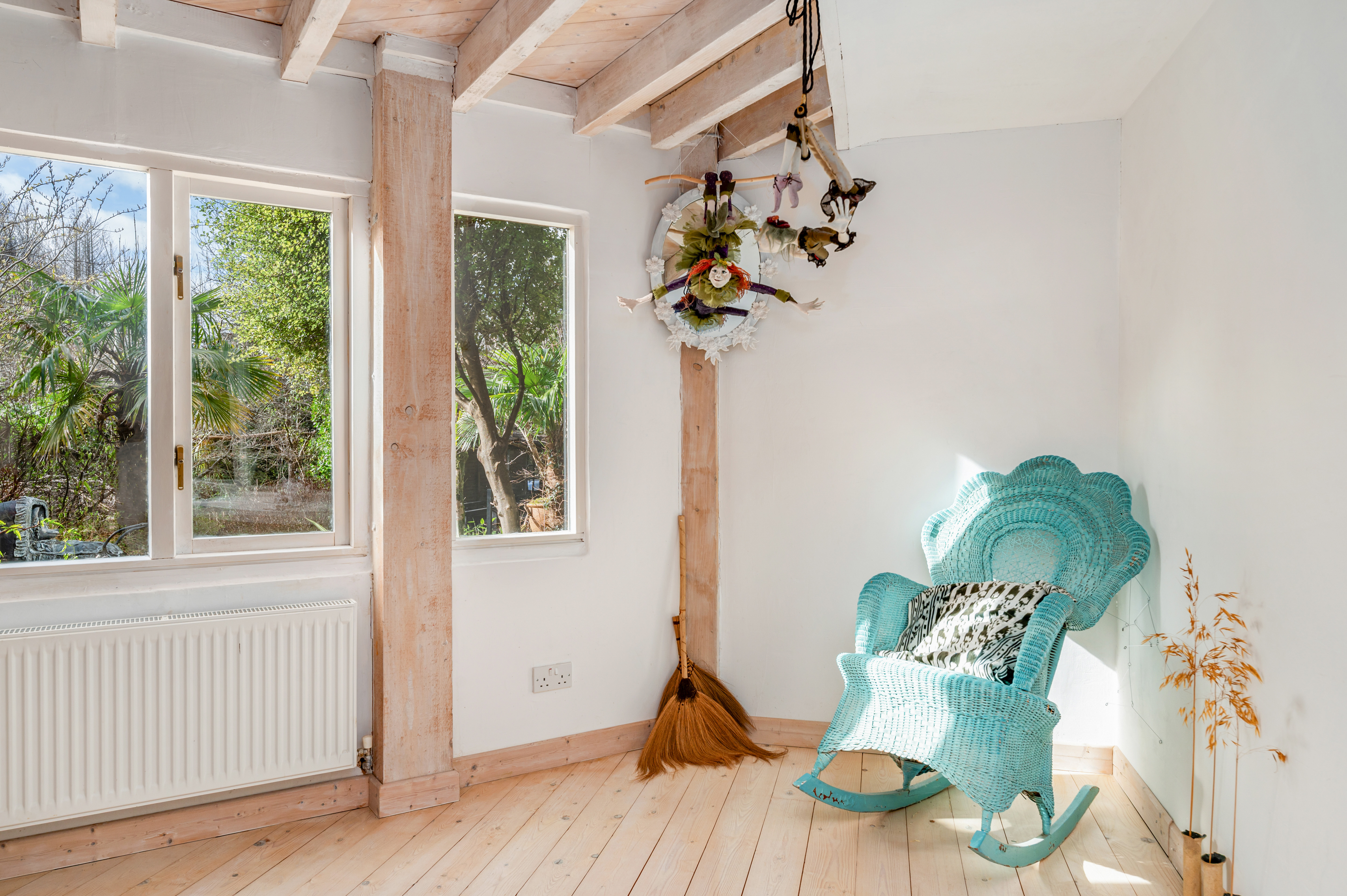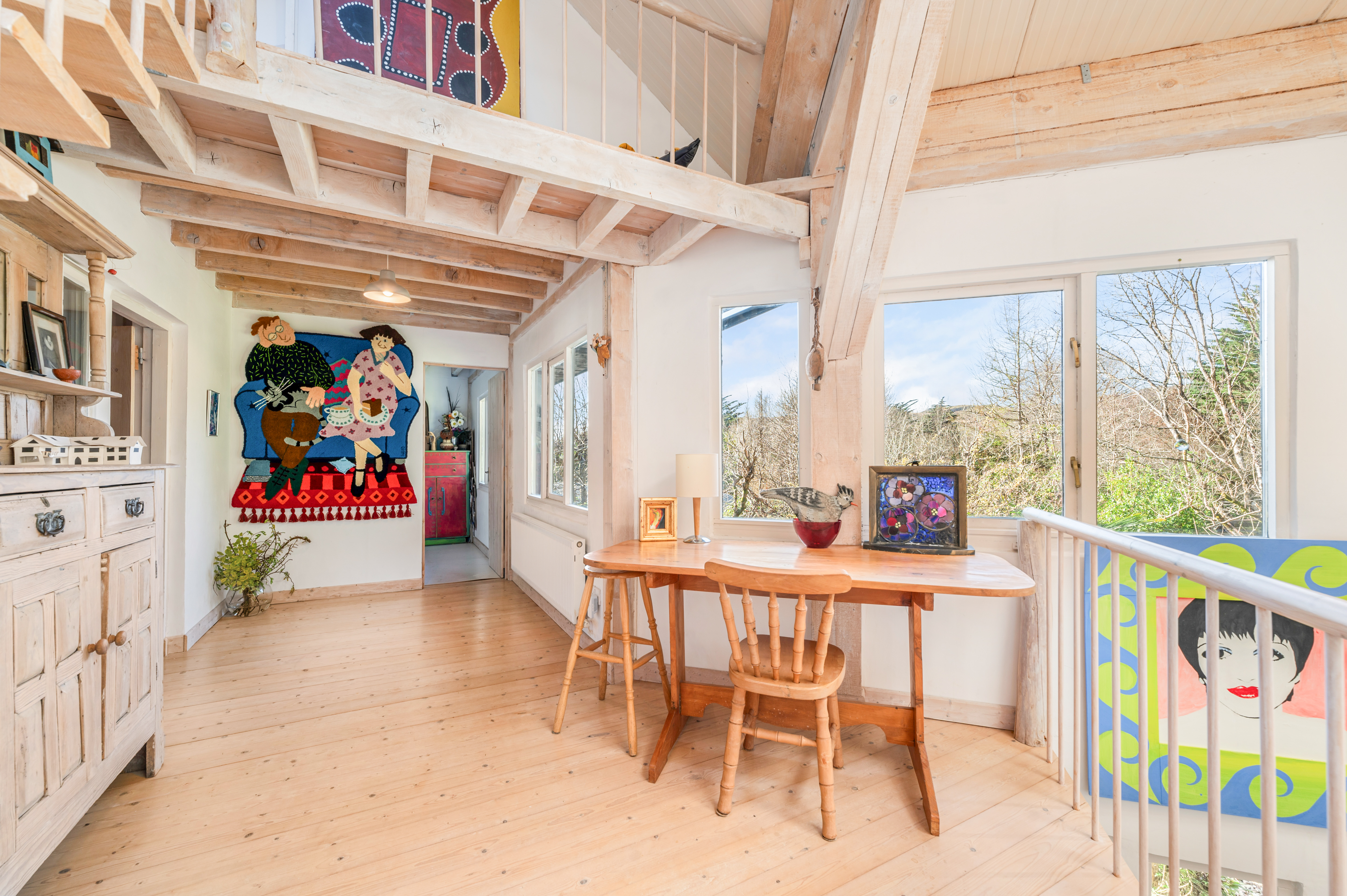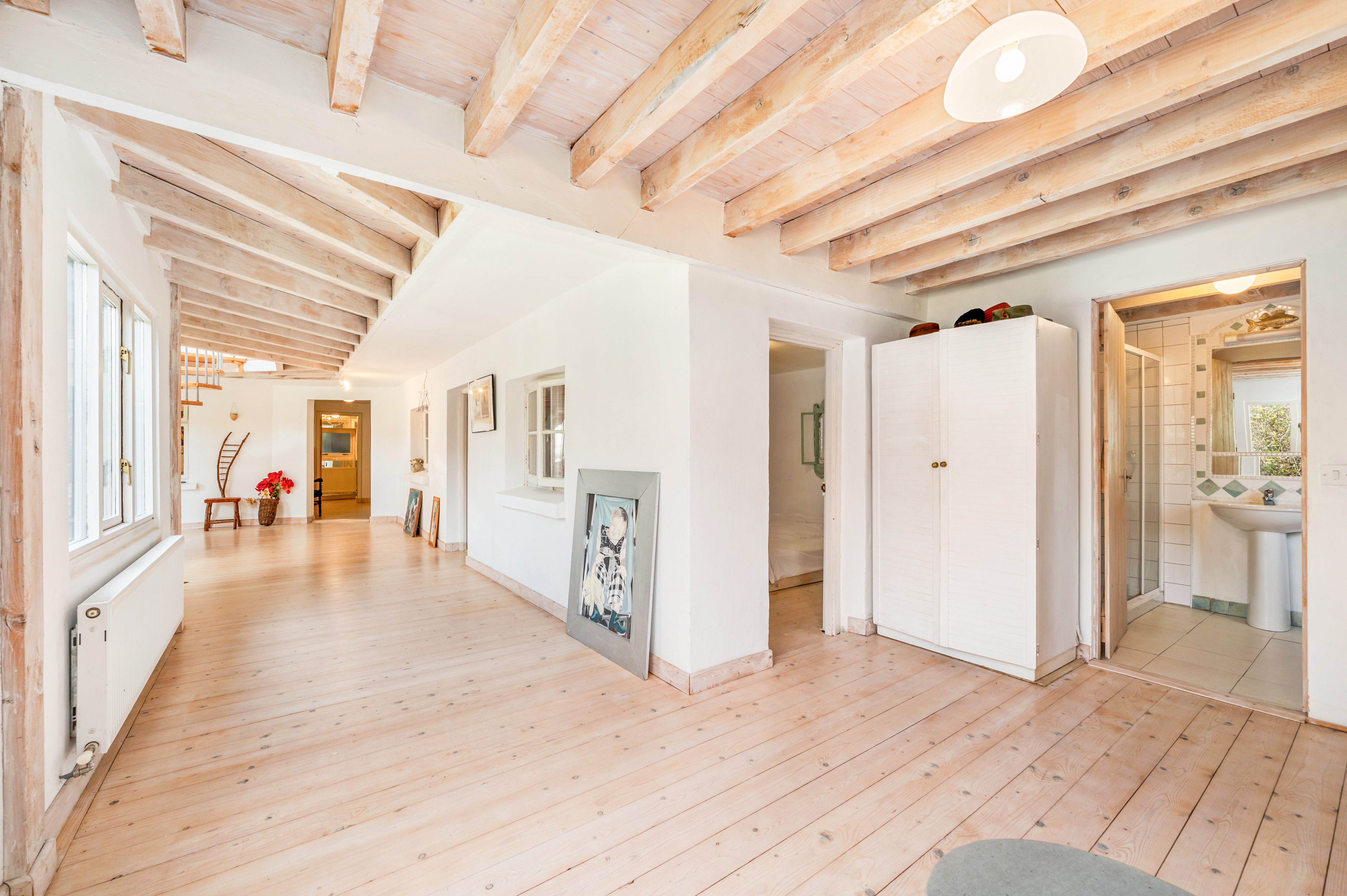 The second floor continues the theme of space and light, with three further bedrooms, a bathroom, a storeroom, and a large adaptable open area that could be used as a studio, reading space, or additional living accommodation.