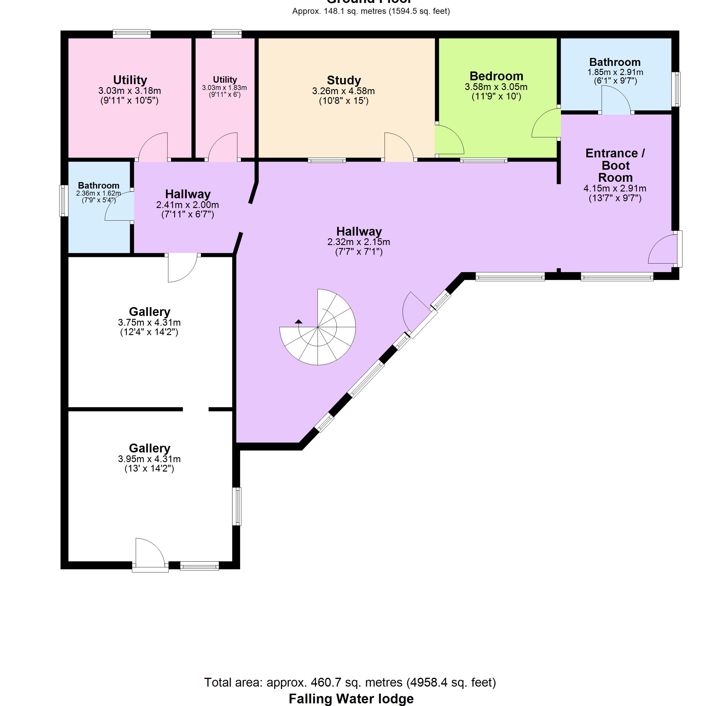 Extending to approximately 460.7 sq. m. (4,958 sq. ft.), the lodge is a substantial three-storey family home thoughtfully designed to follow the natural slope of the land. The result is a residence that integrates seamlessly into its surroundings, with access available from both ground and first floor levels. At the heart of the home lies a striking central atrium, complete with a feature staircase that rises through the house, filling the interior with light and enhancing the sense of space and connection between floors.