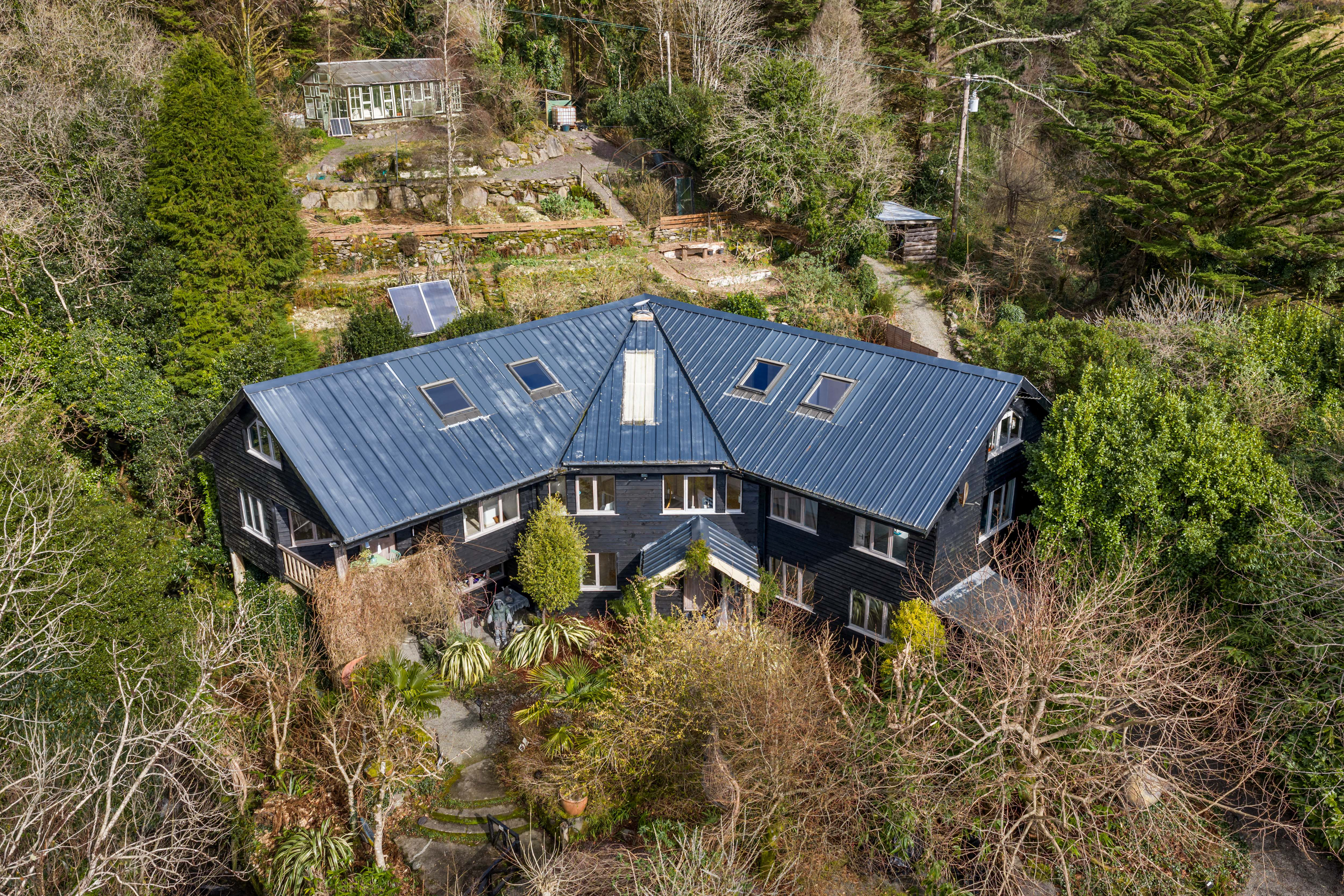 The grounds are nothing short of extraordinary. The 2.5 acres of natural woodland, interwoven with streams and walking trails, rise above the house to create a private and enchanting landscape. Mature trees, specimen planting, and carefully designed pathways provide ever-changing interest, while the waterfall and stream form a captivating natural focal point. To the rear, a sunny rock garden and a large, terraced kitchen garden further enhance the outdoor offering.