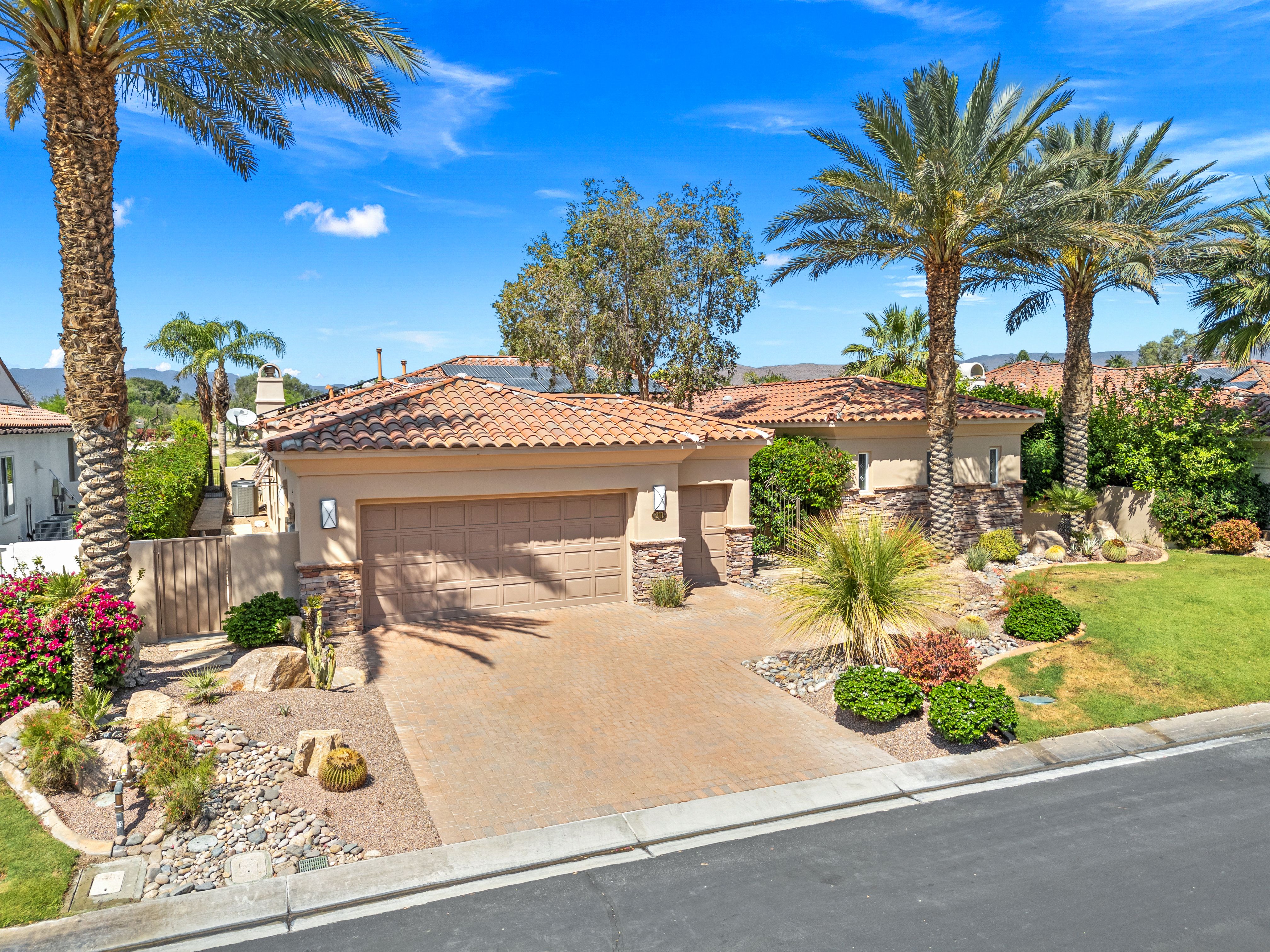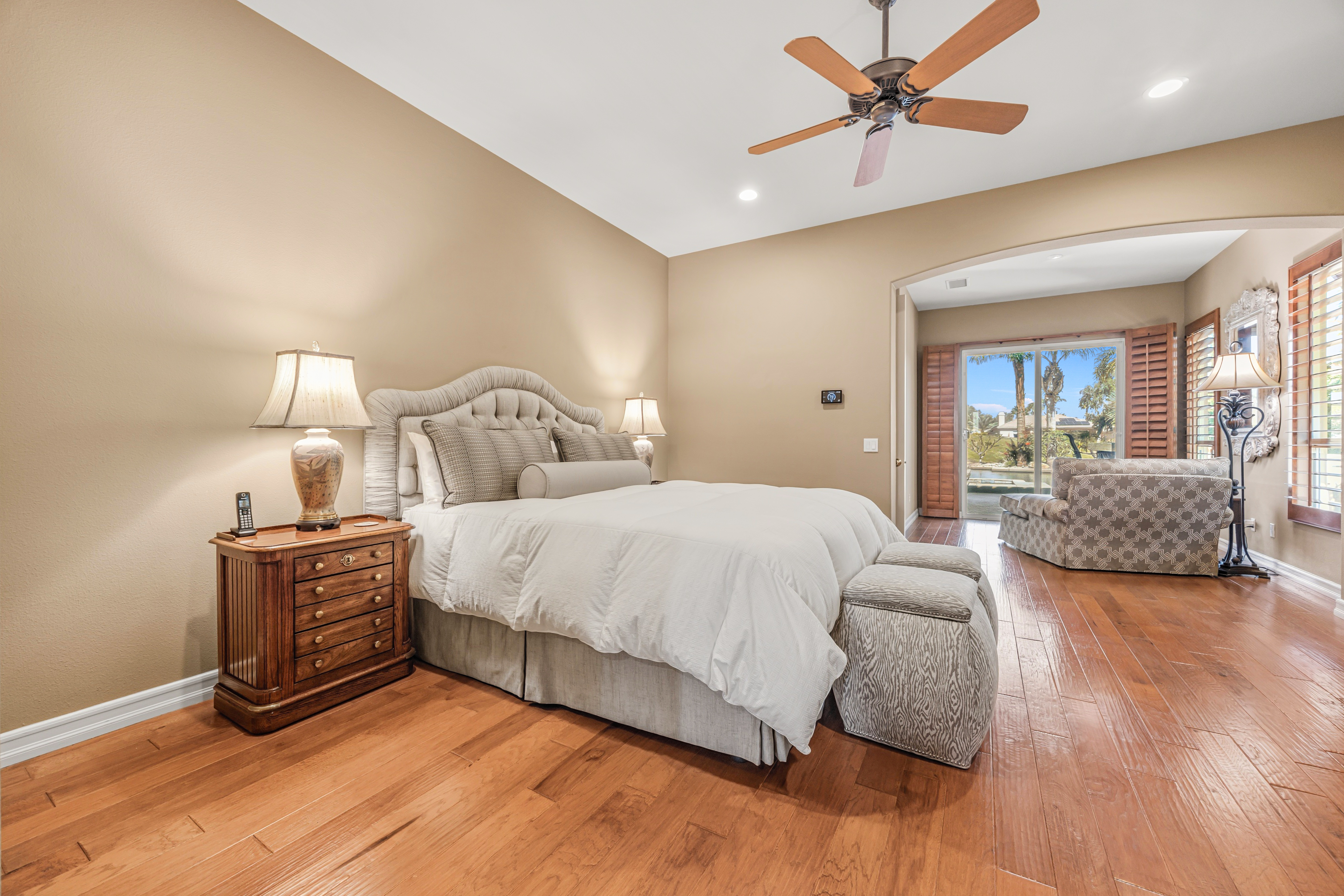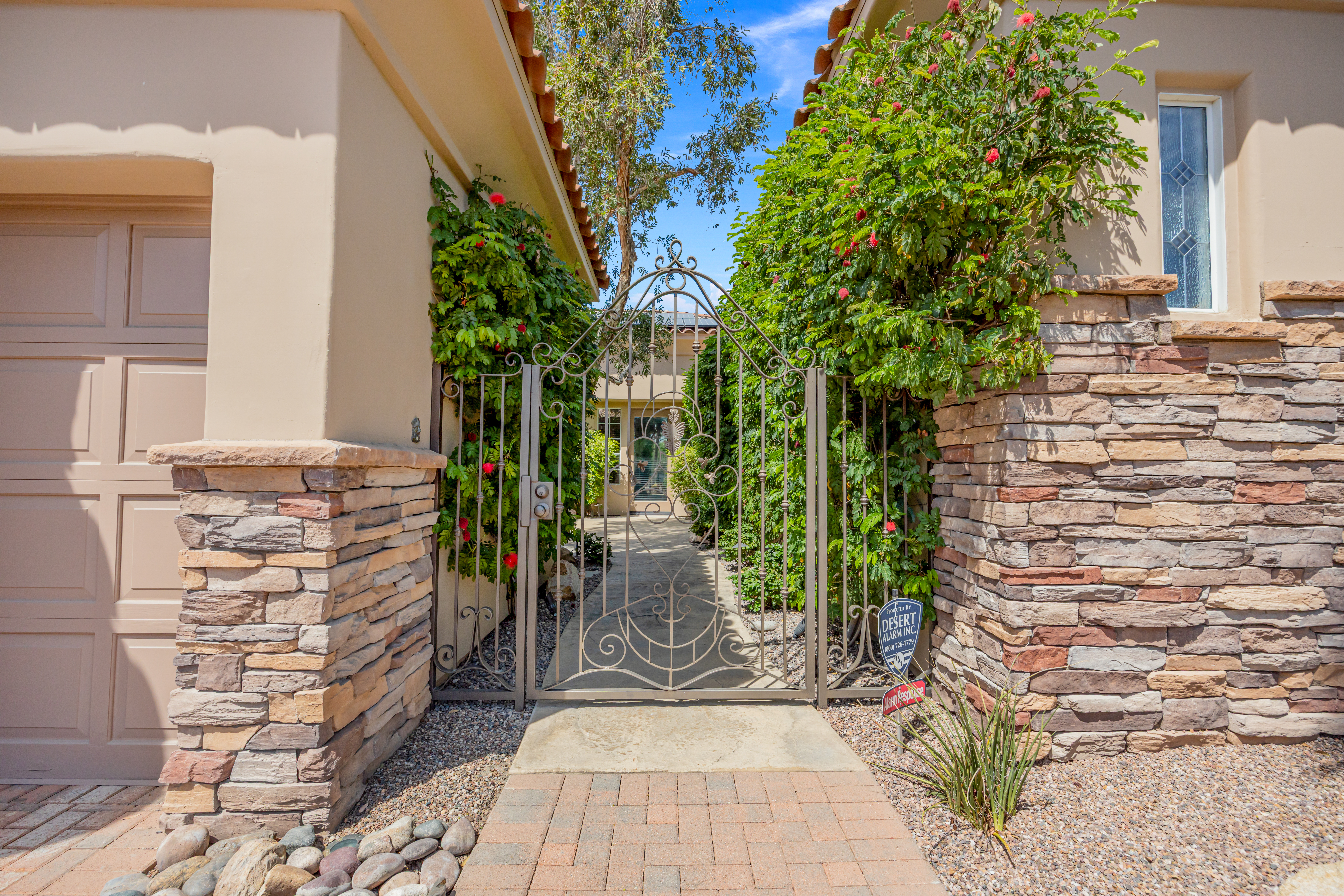 Experience elevated desert living in the exclusive Legacy enclave of Mission Hills Country Club. This beautifully spacious 2,886 square foot home offers an exceptional 3-bedroom, 4-bathroom floor plan with all bedrooms ensuite, a generous great room, wet bar with wine refrigerator, and a stylish powder room for guests--blending privacy with effortless entertaining. A private gated courtyard entry is accented by a brick driveway and walkway leading to an iron gate, creating a striking and welcoming first impression. Inside, rich hickory wood flooring flows throughout, adding warmth and sophistication across the living and dining spaces. The great room is a true showpiece, featuring a fireplace flanked by custom built-ins, while custom window coverings and shutters throughout the home provide elegance, privacy, and light control. The kitchen is thoughtfully appointed with stainless steel appliances, including recently replaced double ovens and dishwasher--ideal for both everyday living and entertaining with ease. Adjacent living spaces flow seamlessly, enhancing the home's open yet defined layout. Designed with privacy in mind, the primary suite is thoughtfully separated from the guest bedrooms, creating a true retreat. It features a private sitting area, direct access to the pool and spa, dual walk-in closets with custom built-ins, and a luxurious bath complete with dual vanities, a soaking tub, and a walk-in shower. One of the guest suites is enhanced with custom office built-ins, offering the perfect flex space for remote work or a private study. Step outside to your own private resort--featuring a recently renovated pool and spa, extended covered patio, and built-in BBQ, all surrounded by lush, mature landscaping. Serene mountain and greenbelt views create a peaceful backdrop for relaxing or entertaining under the desert sky. This home is as efficient as it is beautiful, showcasing an expanded owned solar system (approximately 51 panels) and a tankless water heater for modern, energy-conscious living. The epoxy-finished garage, complete with a split system for climate control, along with a two-car garage plus golf cart garage, adds both comfort and functionality. HOA dues include Social and Fitness Membership, offering access to resort-style amenities and enhancing the full-service desert lifestyle. Offered furnished per inventory, this residence presents a seamless move-in opportunity. A rare opportunity to own a meticulously maintained and upgraded home.