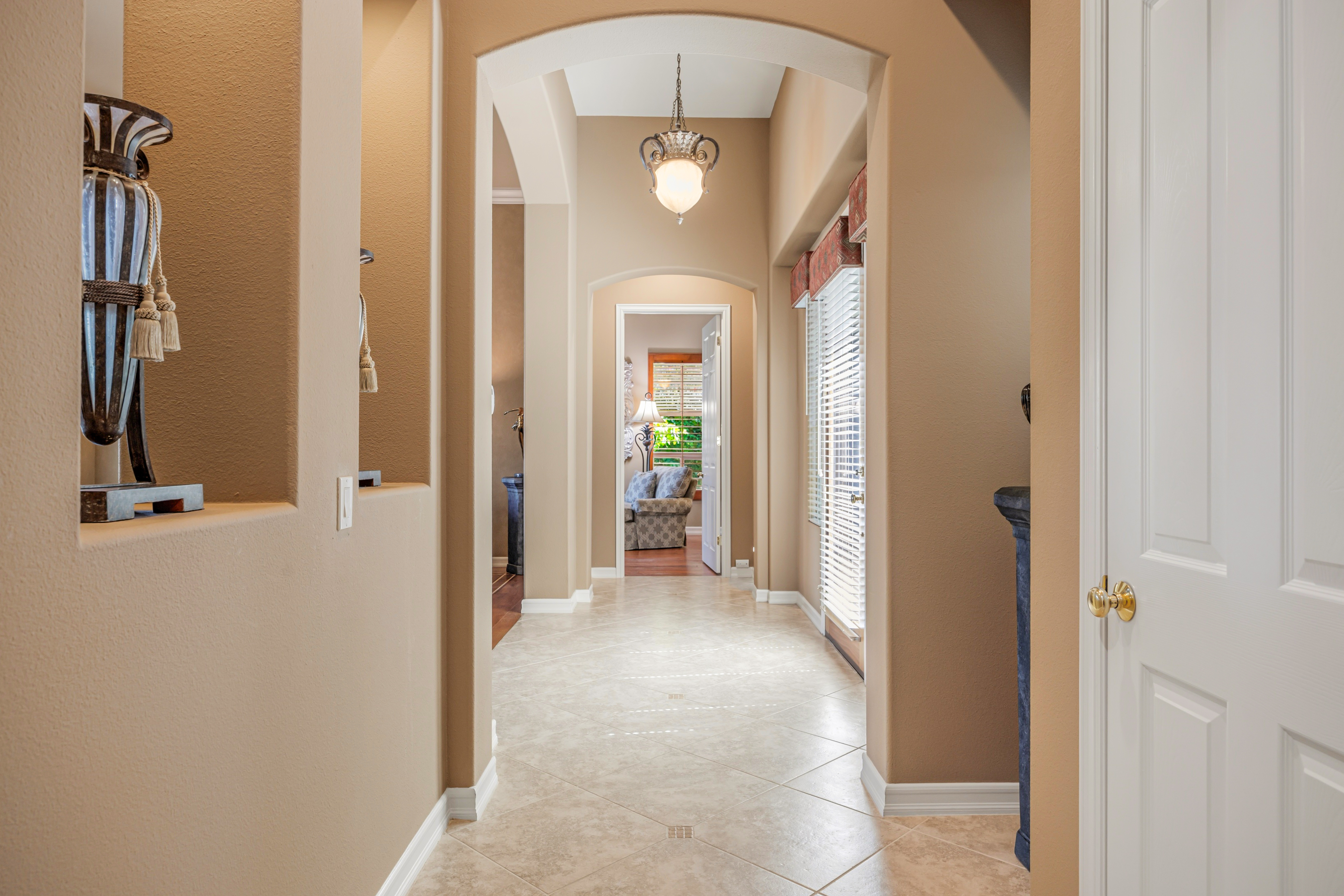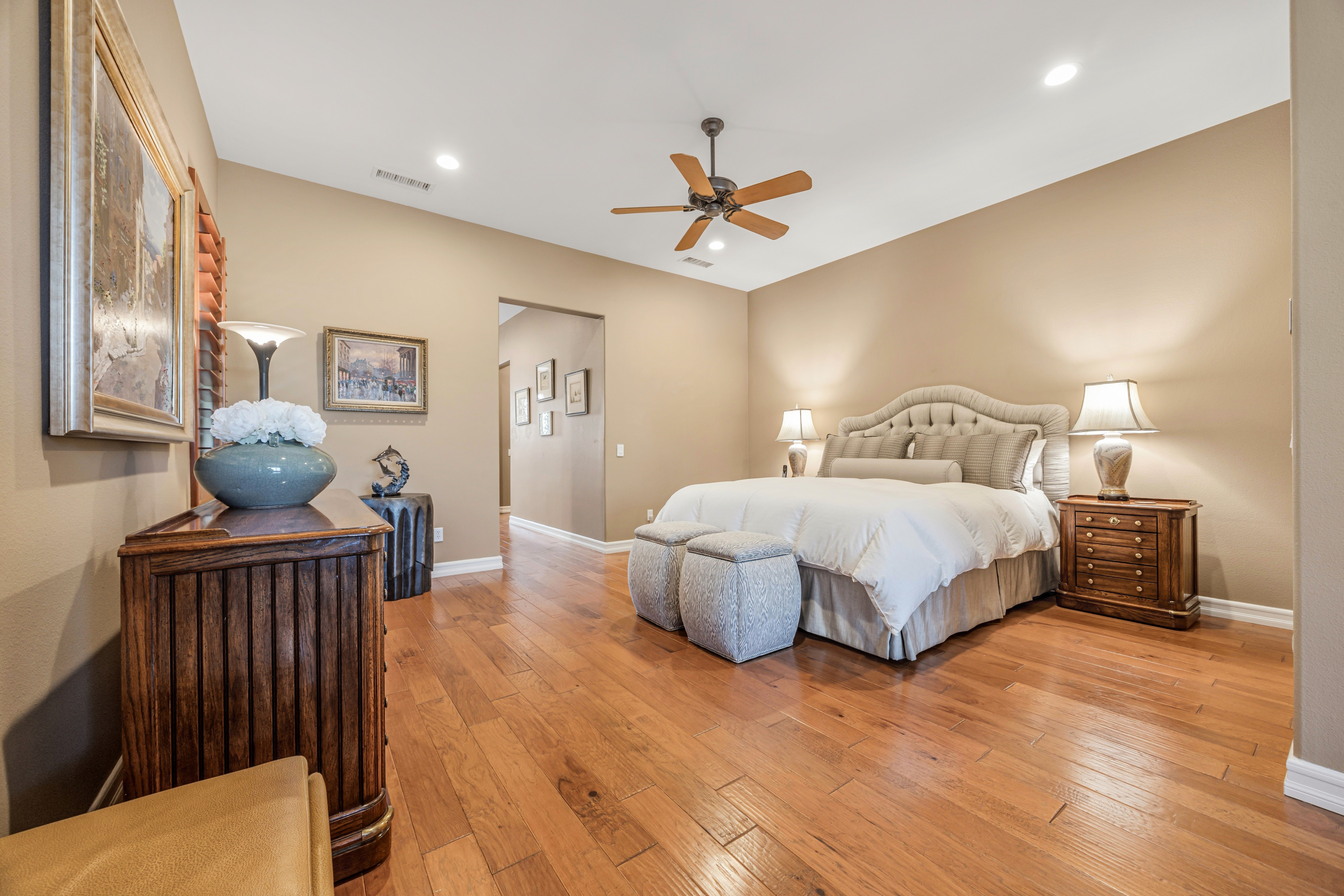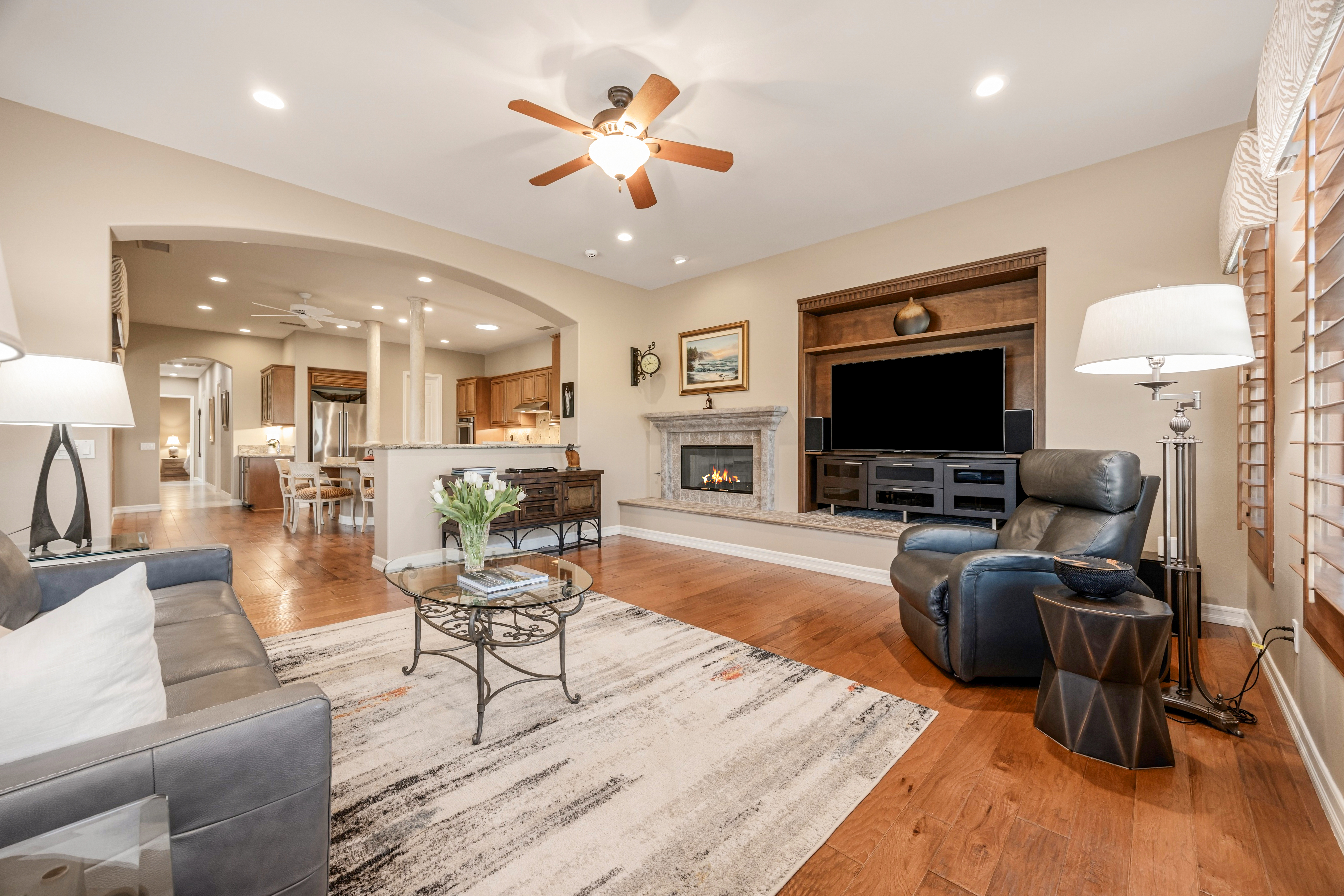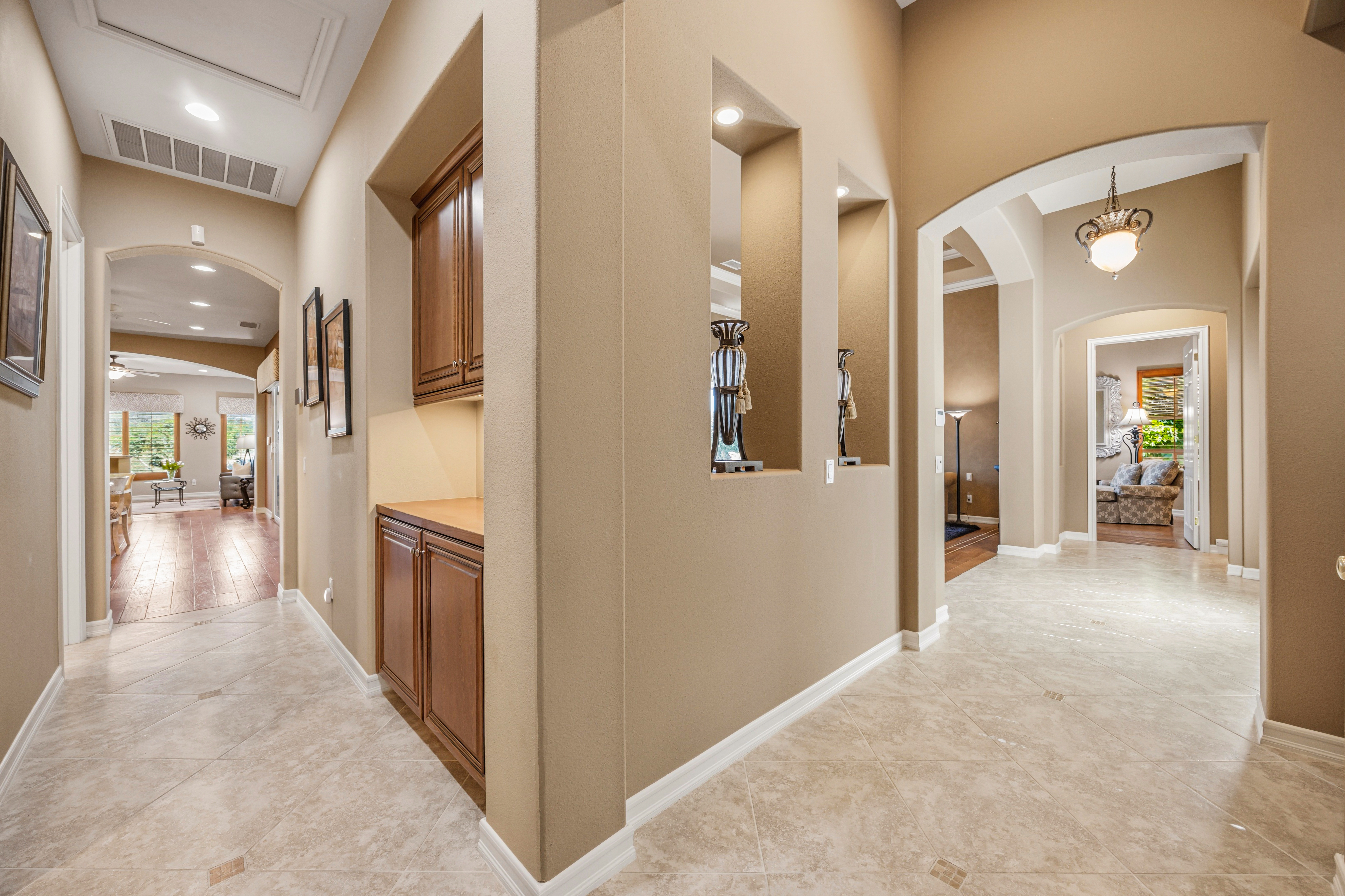 Experience elevated desert living in the exclusive Legacy enclave of Mission Hills Country Club. This beautifully spacious 2,886 square foot home offers an exceptional 3-bedroom, 4-bathroom floor plan with all bedrooms ensuite, a generous great room, wet bar with wine refrigerator, and a stylish powder room for guests--blending privacy with effortless entertaining. A private gated courtyard entry is accented by a brick driveway and walkway leading to an iron gate, creating a striking and welcoming first impression. Inside, rich hickory wood flooring flows throughout, adding warmth and sophistication across the living and dining spaces. The great room is a true showpiece, featuring a fireplace flanked by custom built-ins, while custom window coverings and shutters throughout the home provide elegance, privacy, and light control. The kitchen is thoughtfully appointed with stainless steel appliances, including recently replaced double ovens and dishwasher--ideal for both everyday living and entertaining with ease. Adjacent living spaces flow seamlessly, enhancing the home's open yet defined layout. Designed with privacy in mind, the primary suite is thoughtfully separated from the guest bedrooms, creating a true retreat. It features a private sitting area, direct access to the pool and spa, dual walk-in closets with custom built-ins, and a luxurious bath complete with dual vanities, a soaking tub, and a walk-in shower. One of the guest suites is enhanced with custom office built-ins, offering the perfect flex space for remote work or a private study. Step outside to your own private resort--featuring a recently renovated pool and spa, extended covered patio, and built-in BBQ, all surrounded by lush, mature landscaping. Serene mountain and greenbelt views create a peaceful backdrop for relaxing or entertaining under the desert sky. This home is as efficient as it is beautiful, showcasing an expanded owned solar system (approximately 51 panels) and a tankless water heater for modern, energy-conscious living. The epoxy-finished garage, complete with a split system for climate control, along with a two-car garage plus golf cart garage, adds both comfort and functionality. HOA dues include Social and Fitness Membership, offering access to resort-style amenities and enhancing the full-service desert lifestyle. Offered furnished per inventory, this residence presents a seamless move-in opportunity. A rare opportunity to own a meticulously maintained and upgraded home.